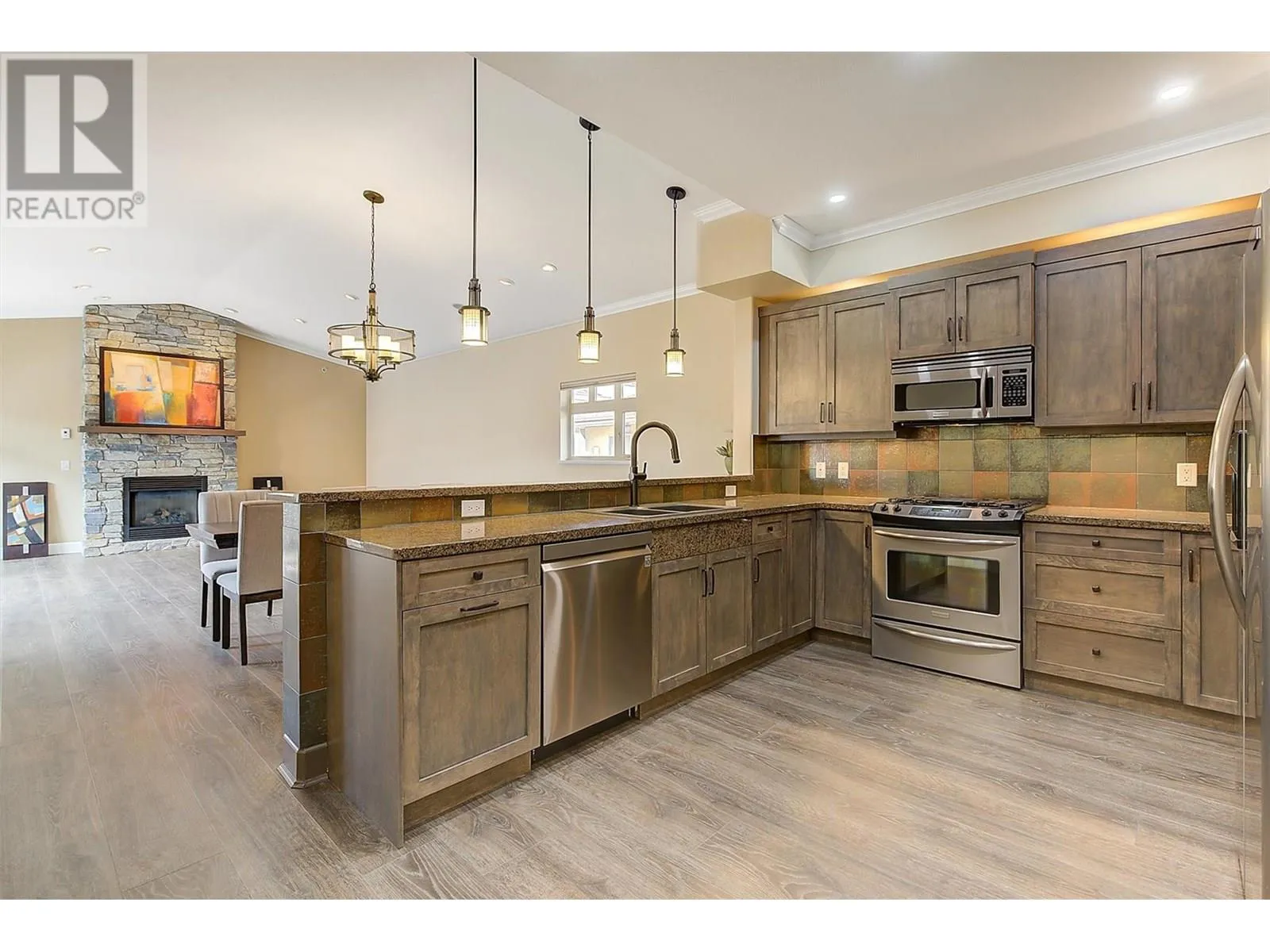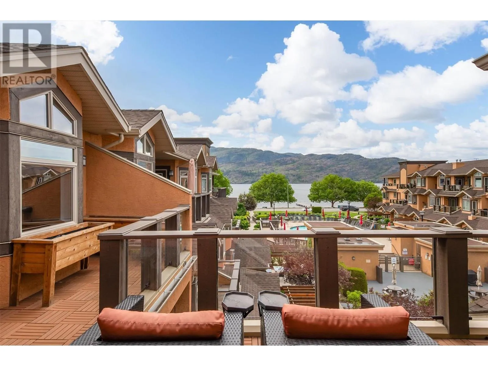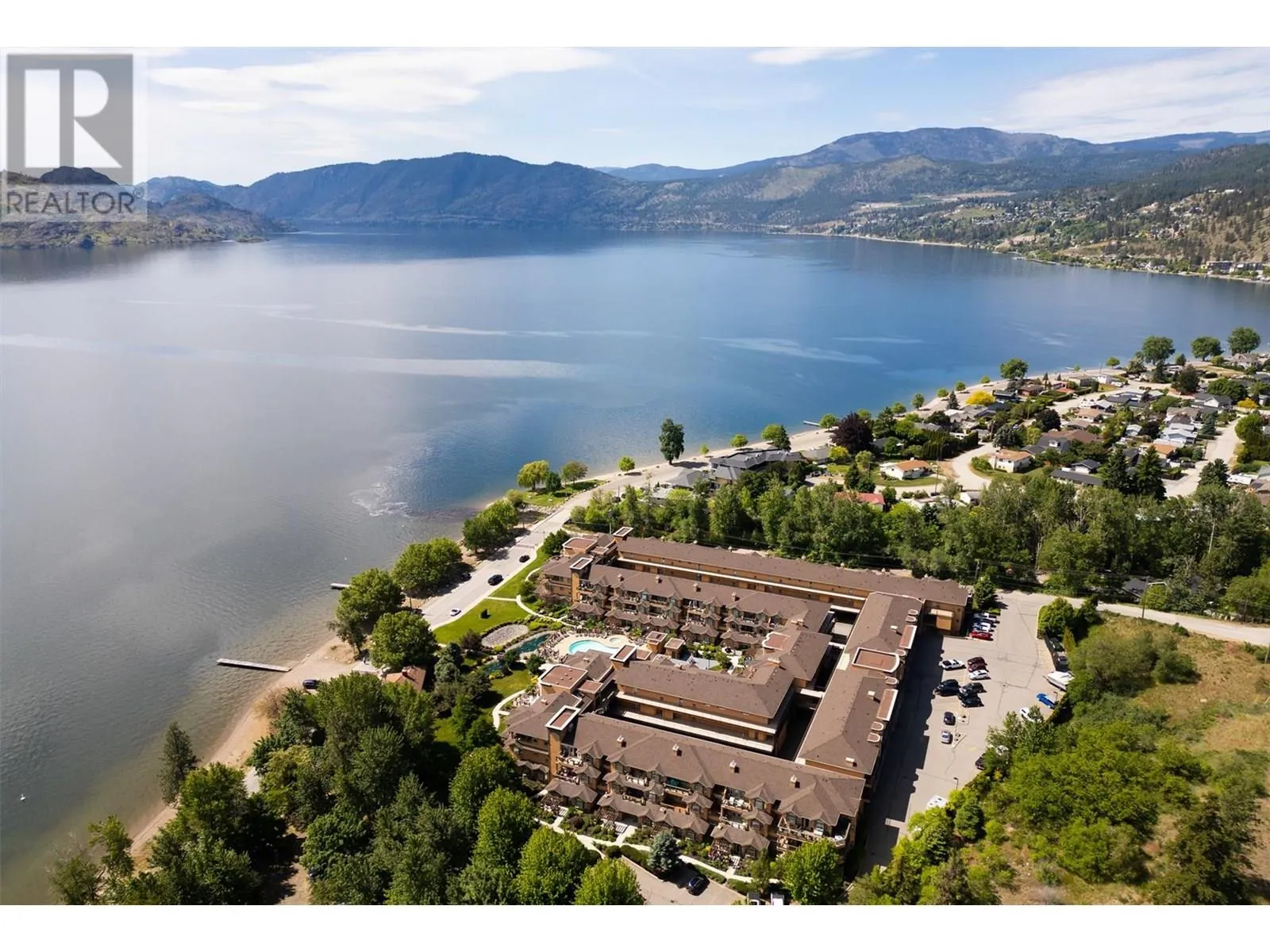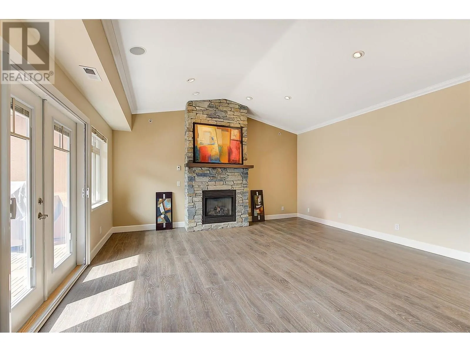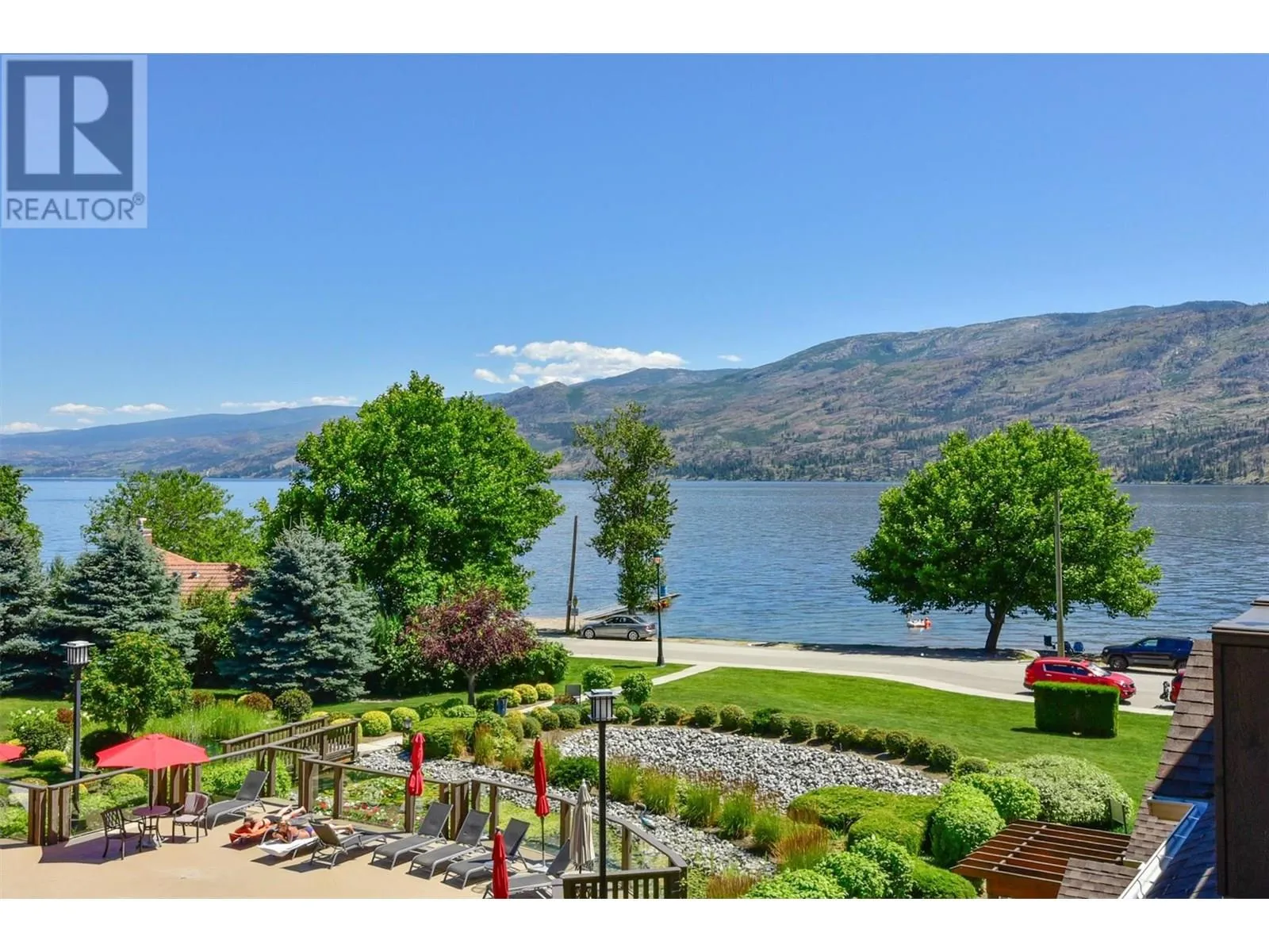 Experience the pinnacle of lakeside luxury in this fully renovated top-floor penthouse at Lakeshore Gardens. Spanning 1,748 square feet, this 3-bedroom, 2-bath retreat offers sweeping views of the lake, pool, and gardens from an oversized double-deck balcony. Inside, vaulted ceilings and high-end finishes create an ambiance of elegance and comfort. The gourmet kitchen is a chefâs dream, outfitted with granite countertops, custom soft-close cabinetry, pull-out drawers, and a premium gas range. In the living room, a striking floor-to-ceiling gas fireplace serves as the centrepiece, while stylish vinyl-coated laminate flooring, luxe tile in the bathrooms, and plush carpeting in the bedrooms add warmth throughout. The primary suite is a private haven with a walk-in closet and spa-like ensuite featuring quartz countertops, a deep soaker tub, and a rainfall shower. A brand-new heat pump, installed in December 2024, ensures optimal climate control year-round. Residents enjoy resort-style amenities including a heated pool, year-round hot tub, full-service gym, secure kayak and bike storage, boat launch, social hall, private storage unit, and two guest suites. Just steps from the shores of Okanagan Lake, this move-in-ready penthouse blends tranquil views with upscale livingâan opportunity not to be missed. Schedule your private viewing today and step into your new lakeside lifestyle. (id:27476)