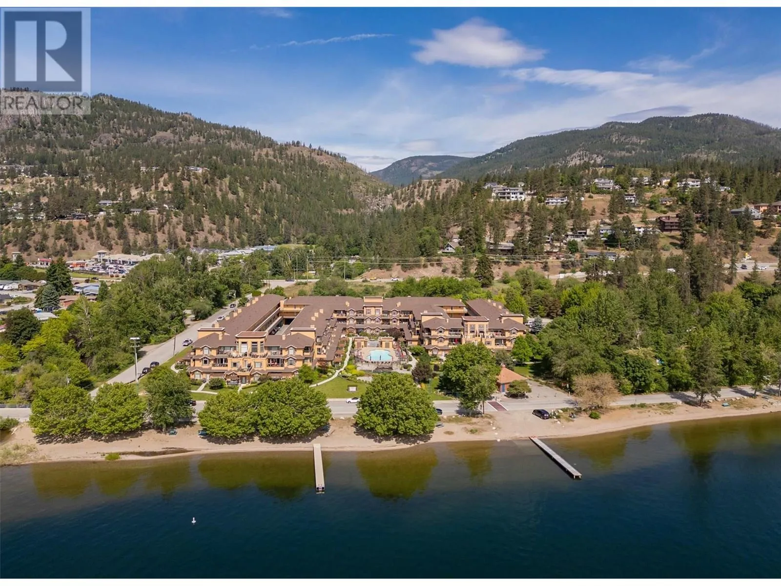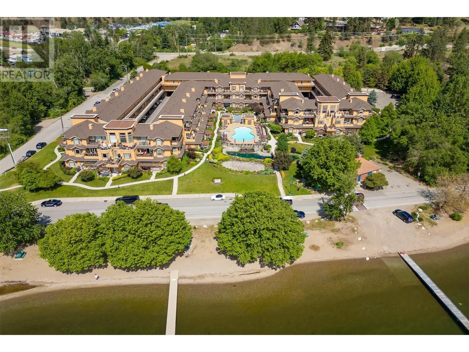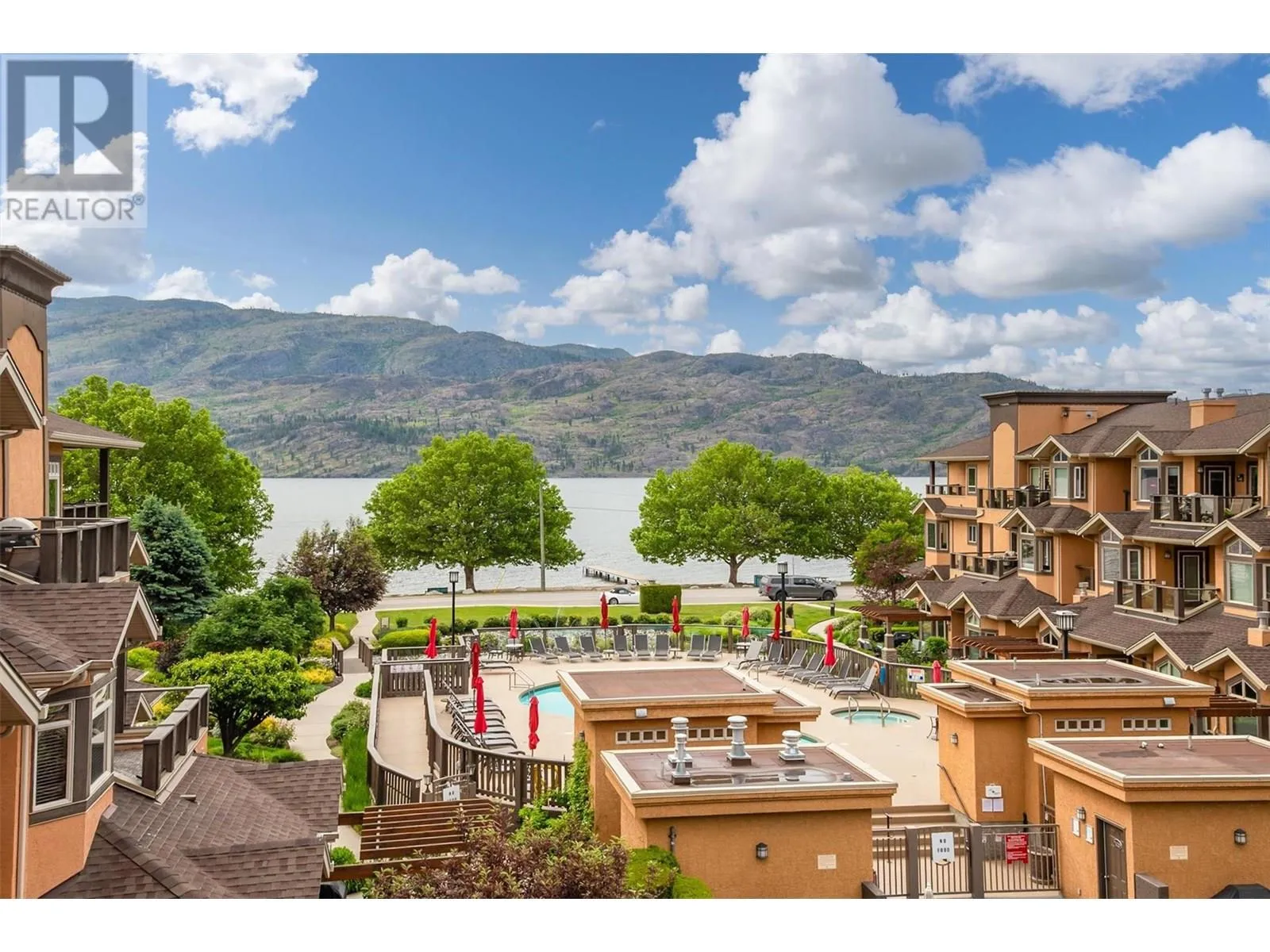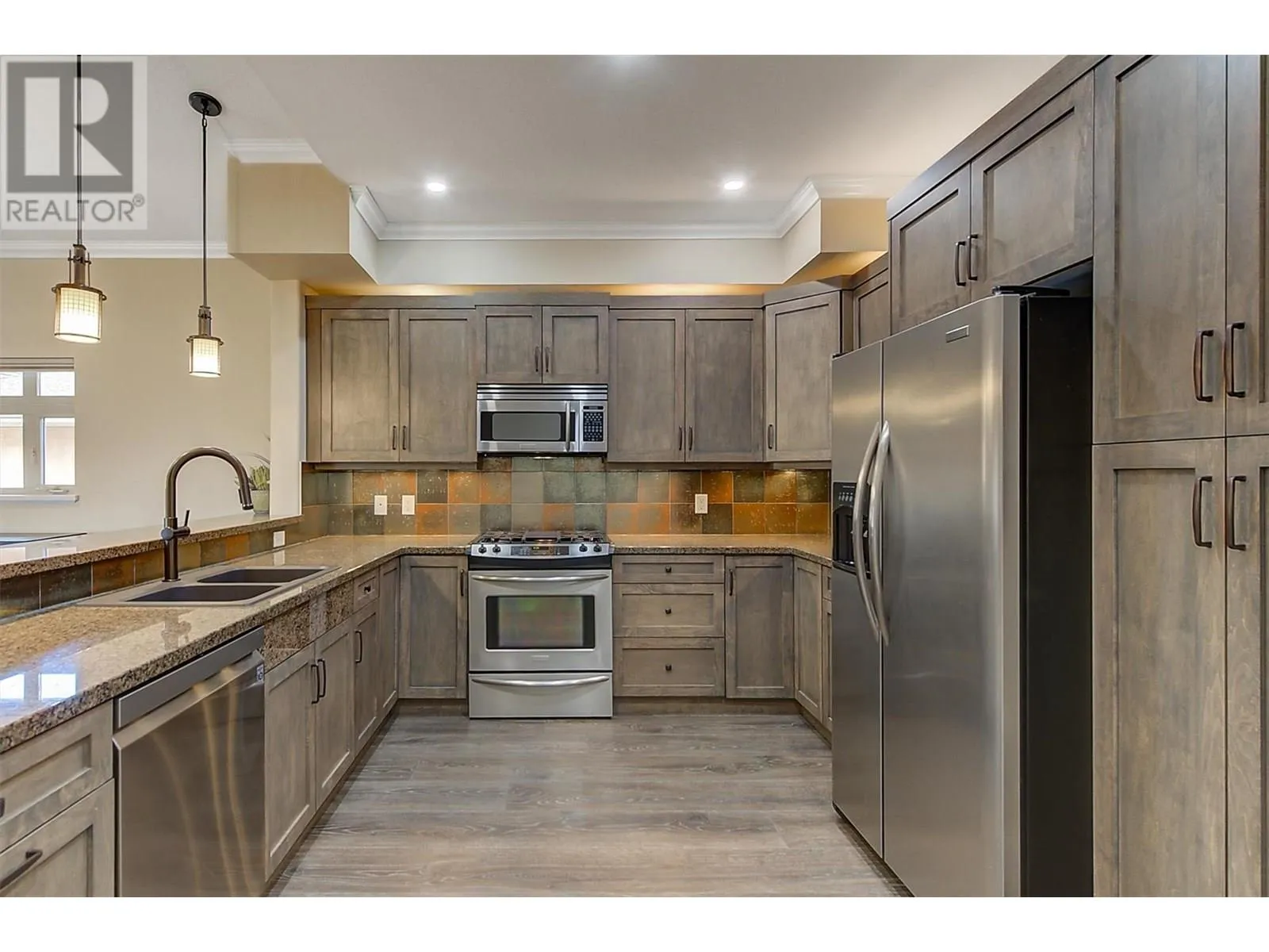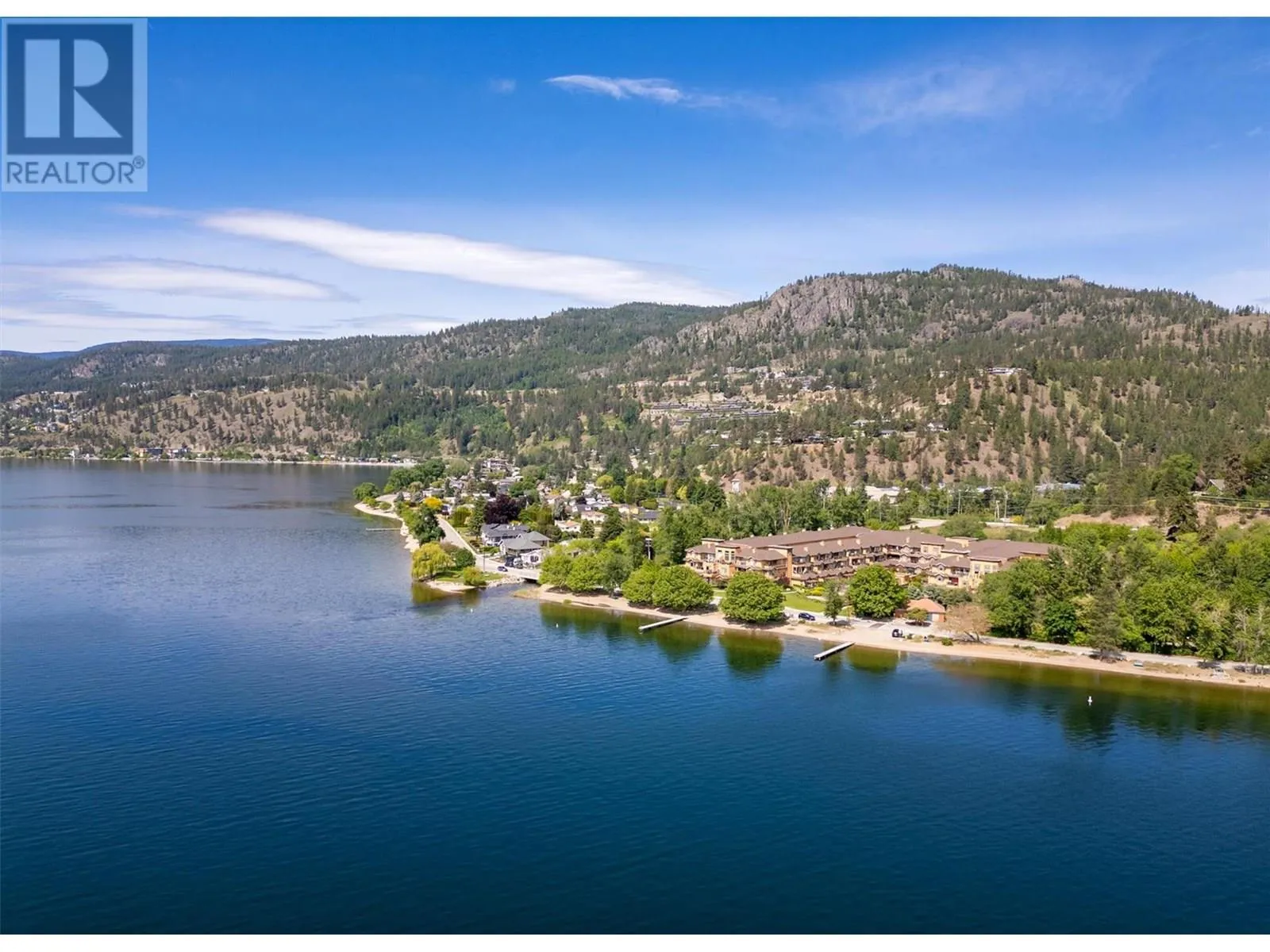 Experience the pinnacle of lakeside luxury in this fully renovated top-floor penthouse at Lakeshore Gardens. Spanning 1,748 square feet, this 3-bedroom, 2-bath retreat offers sweeping views of the lake, pool, and gardens from an oversized double-deck balcony. Inside, vaulted ceilings and high-end finishes create an ambiance of elegance and comfort. The gourmet kitchen is a chefâs dream, outfitted with granite countertops, custom soft-close cabinetry, pull-out drawers, and a premium gas range. In the living room, a striking floor-to-ceiling gas fireplace serves as the centrepiece, while stylish vinyl-coated laminate flooring, luxe tile in the bathrooms, and plush carpeting in the bedrooms add warmth throughout. The primary suite is a private haven with a walk-in closet and spa-like ensuite featuring quartz countertops, a deep soaker tub, and a rainfall shower. A brand-new heat pump, installed in December 2024, ensures optimal climate control year-round. Residents enjoy resort-style amenities including a heated pool, year-round hot tub, full-service gym, secure kayak and bike storage, boat launch, social hall, private storage unit, and two guest suites. Just steps from the shores of Okanagan Lake, this move-in-ready penthouse blends tranquil views with upscale livingâan opportunity not to be missed. Schedule your private viewing today and step into your new lakeside lifestyle. (id:27476)
