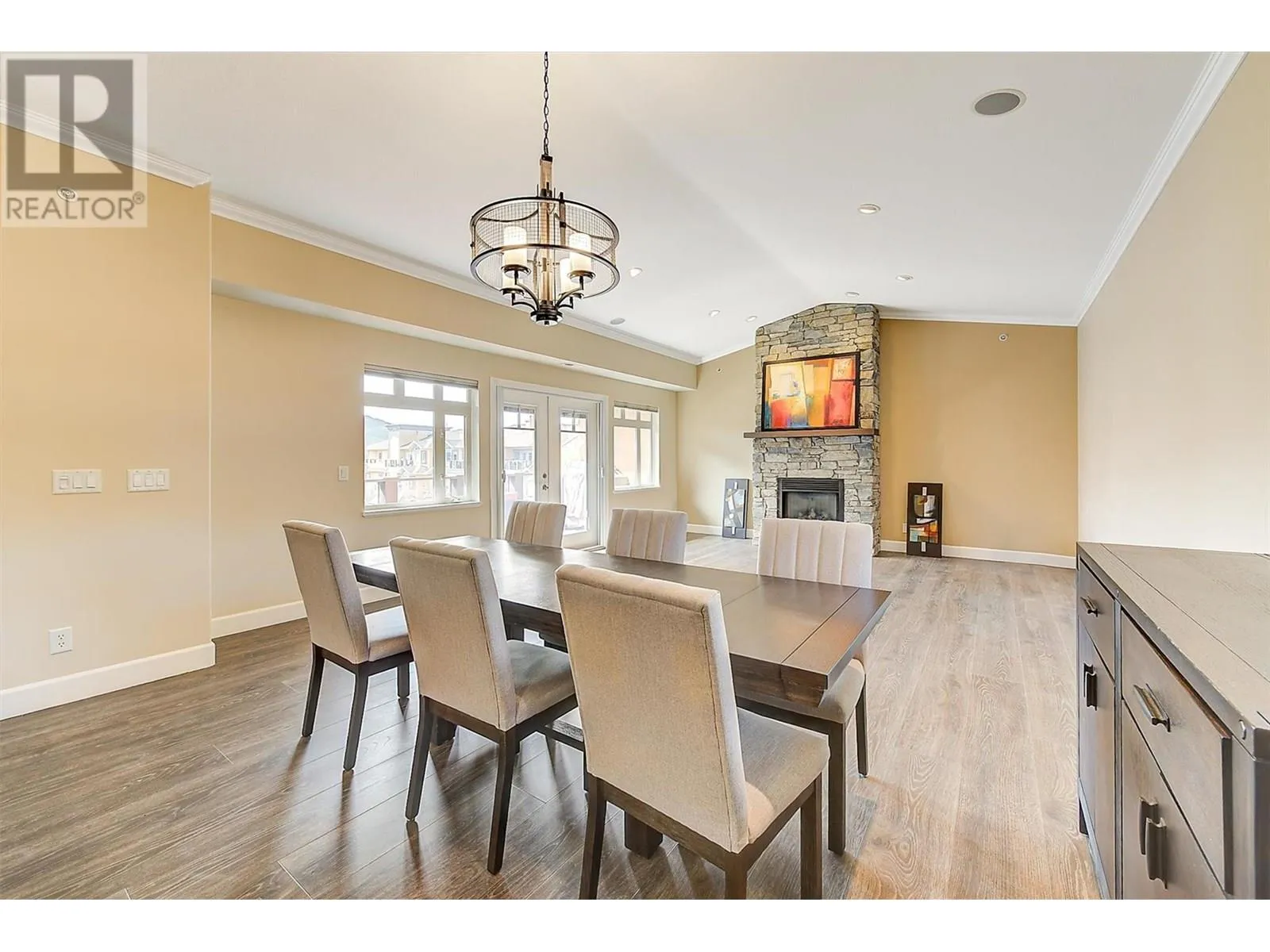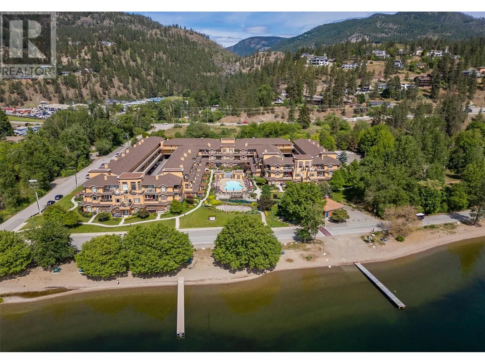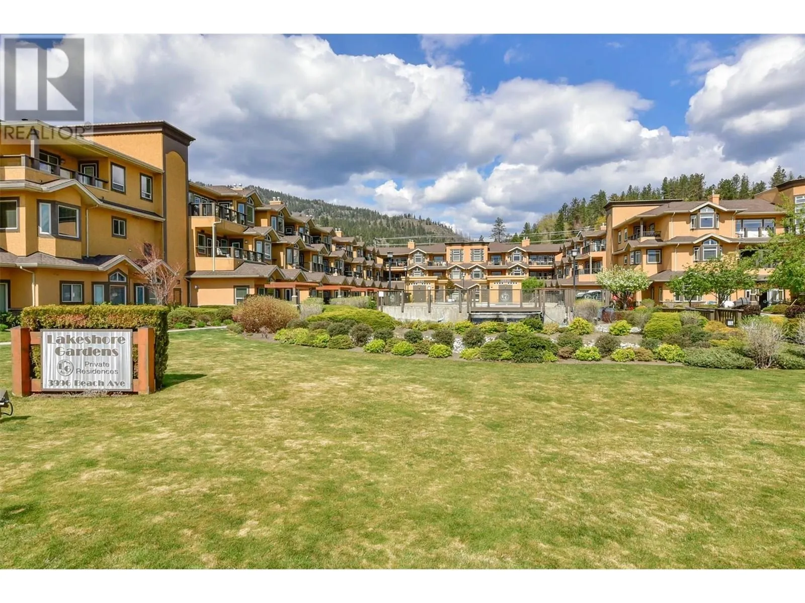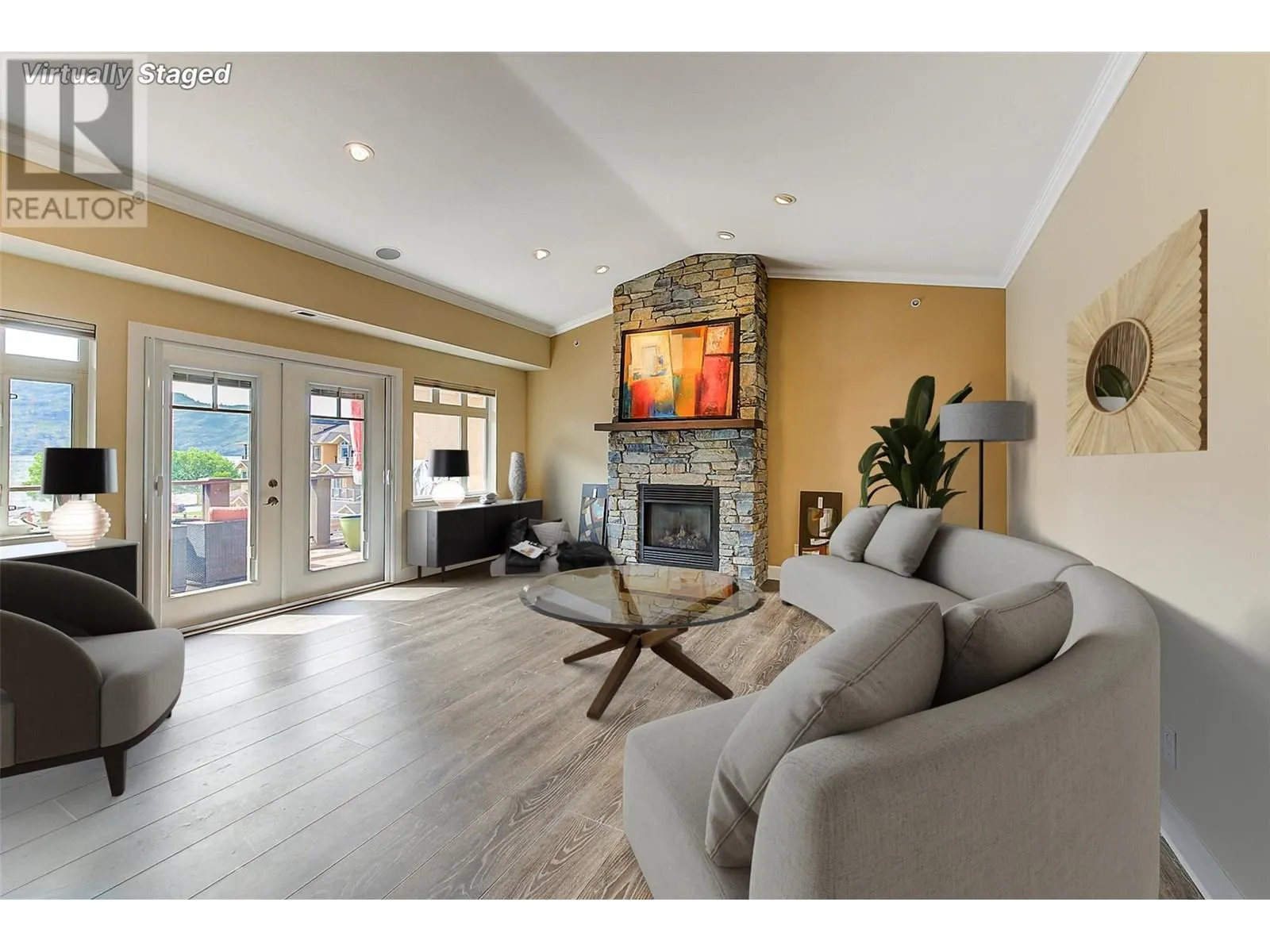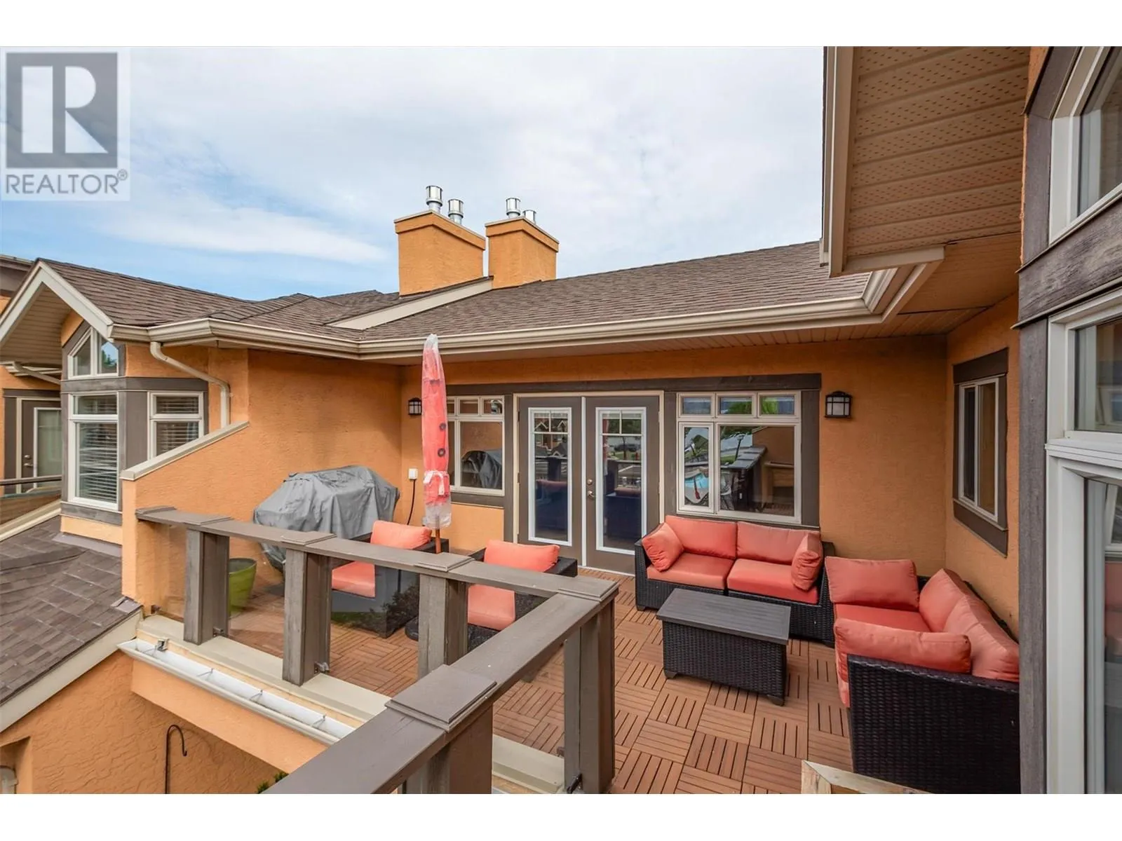 Experience the pinnacle of lakeside luxury in this fully renovated top-floor penthouse at Lakeshore Gardens. Spanning 1,748 square feet, this 3-bedroom, 2-bath retreat offers sweeping views of the lake, pool, and gardens from an oversized double-deck balcony. Inside, vaulted ceilings and high-end finishes create an ambiance of elegance and comfort. The gourmet kitchen is a chefâs dream, outfitted with granite countertops, custom soft-close cabinetry, pull-out drawers, and a premium gas range. In the living room, a striking floor-to-ceiling gas fireplace serves as the centrepiece, while stylish vinyl-coated laminate flooring, luxe tile in the bathrooms, and plush carpeting in the bedrooms add warmth throughout. The primary suite is a private haven with a walk-in closet and spa-like ensuite featuring quartz countertops, a deep soaker tub, and a rainfall shower. A brand-new heat pump, installed in December 2024, ensures optimal climate control year-round. Residents enjoy resort-style amenities including a heated pool, year-round hot tub, full-service gym, secure kayak and bike storage, boat launch, social hall, private storage unit, and two guest suites. Just steps from the shores of Okanagan Lake, this move-in-ready penthouse blends tranquil views with upscale livingâan opportunity not to be missed. Schedule your private viewing today and step into your new lakeside lifestyle. (id:27476)