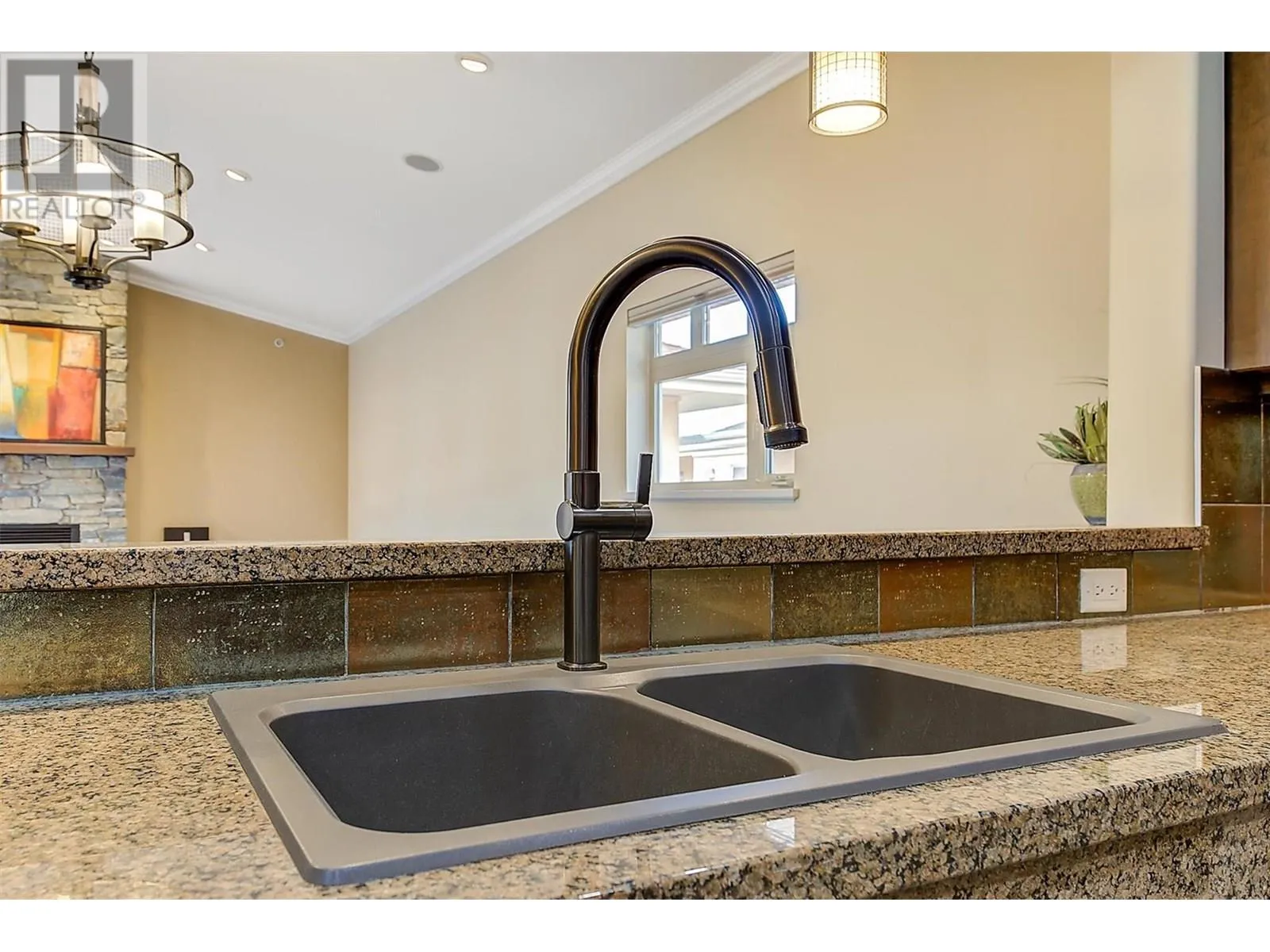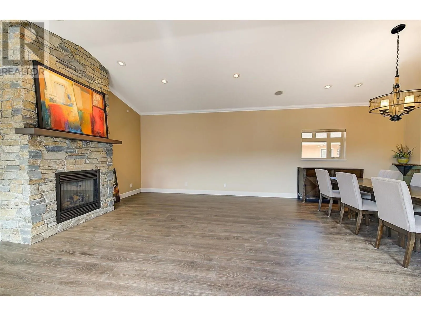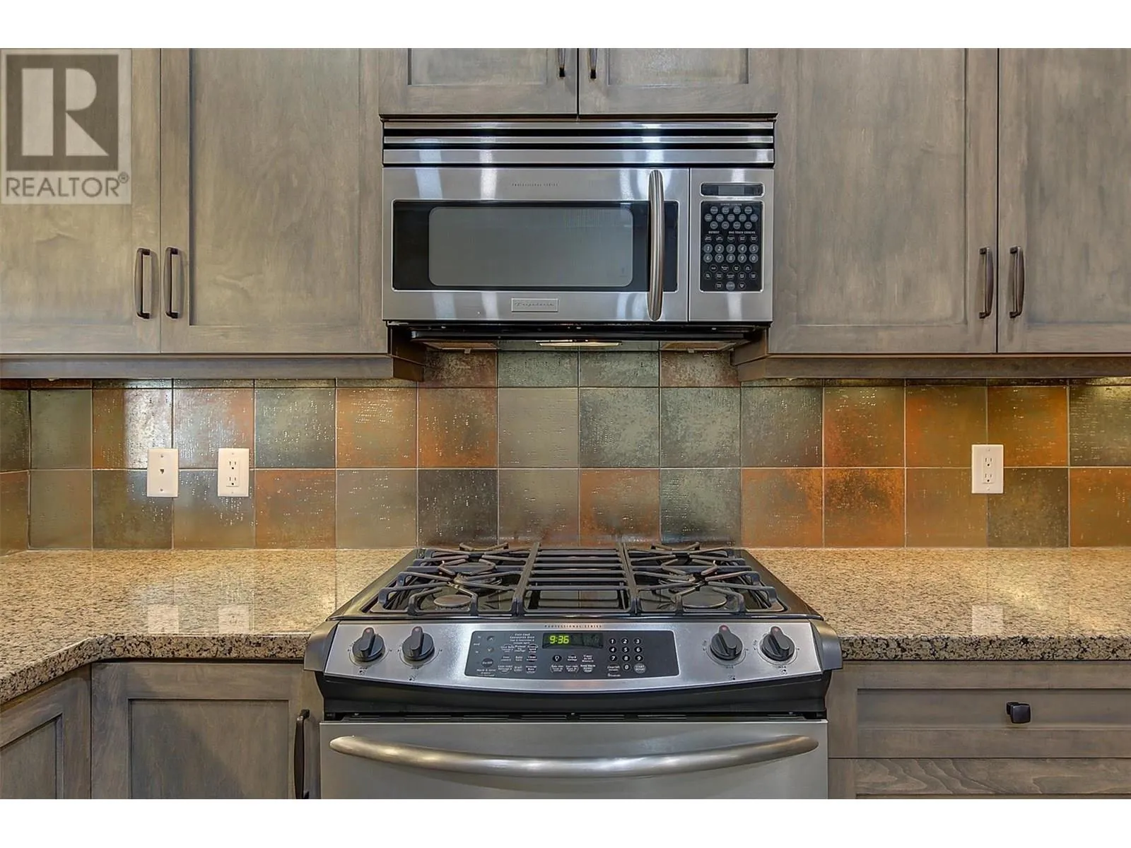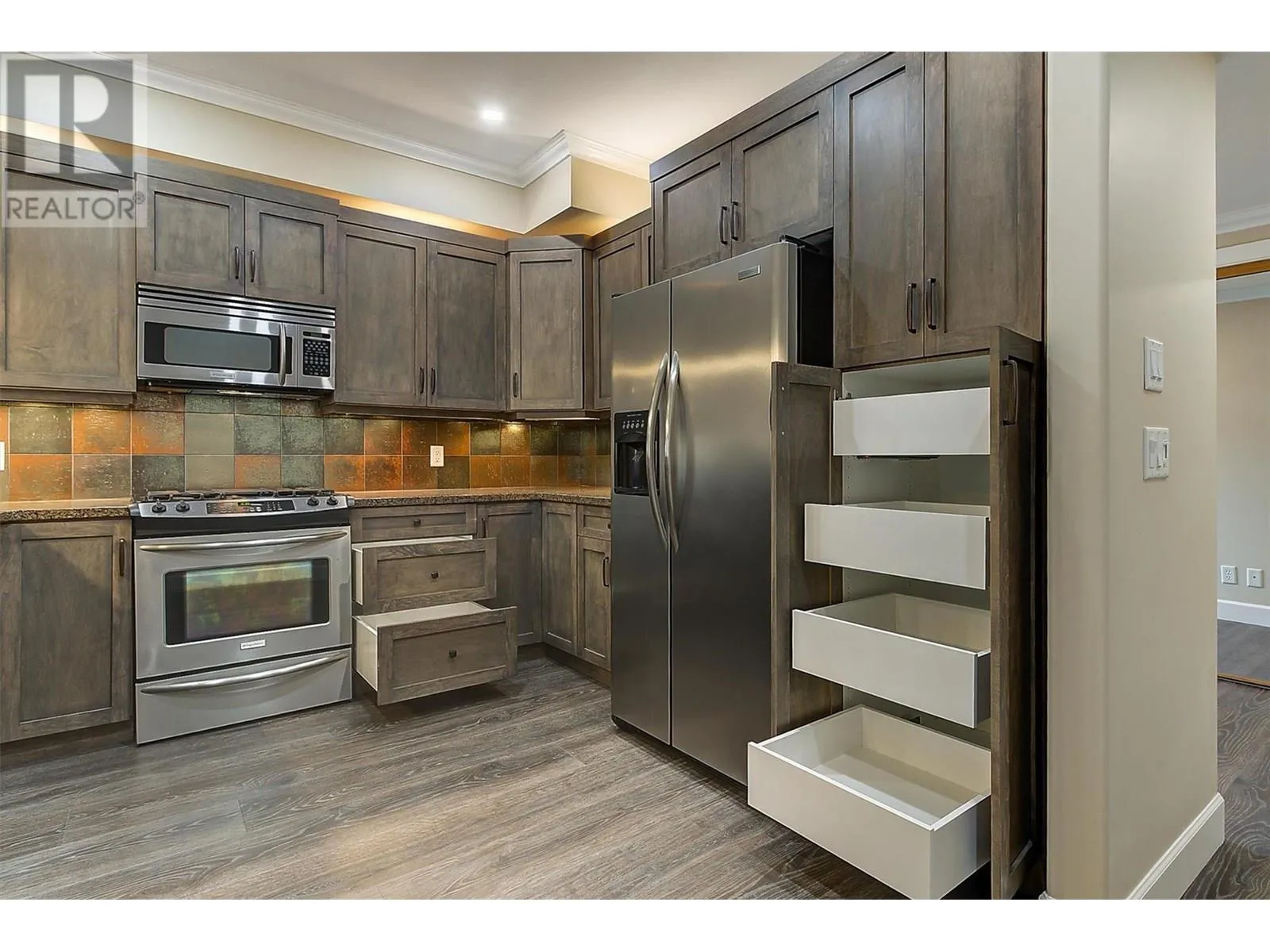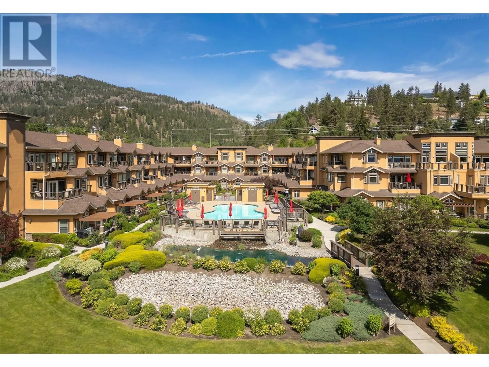 Experience the pinnacle of lakeside luxury in this fully renovated top-floor penthouse at Lakeshore Gardens. Spanning 1,748 square feet, this 3-bedroom, 2-bath retreat offers sweeping views of the lake, pool, and gardens from an oversized double-deck balcony. Inside, vaulted ceilings and high-end finishes create an ambiance of elegance and comfort. The gourmet kitchen is a chefâs dream, outfitted with granite countertops, custom soft-close cabinetry, pull-out drawers, and a premium gas range. In the living room, a striking floor-to-ceiling gas fireplace serves as the centrepiece, while stylish vinyl-coated laminate flooring, luxe tile in the bathrooms, and plush carpeting in the bedrooms add warmth throughout. The primary suite is a private haven with a walk-in closet and spa-like ensuite featuring quartz countertops, a deep soaker tub, and a rainfall shower. A brand-new heat pump, installed in December 2024, ensures optimal climate control year-round. Residents enjoy resort-style amenities including a heated pool, year-round hot tub, full-service gym, secure kayak and bike storage, boat launch, social hall, private storage unit, and two guest suites. Just steps from the shores of Okanagan Lake, this move-in-ready penthouse blends tranquil views with upscale livingâan opportunity not to be missed. Schedule your private viewing today and step into your new lakeside lifestyle. (id:27476)