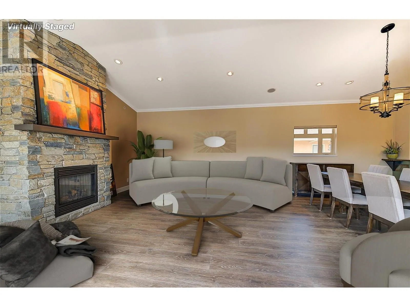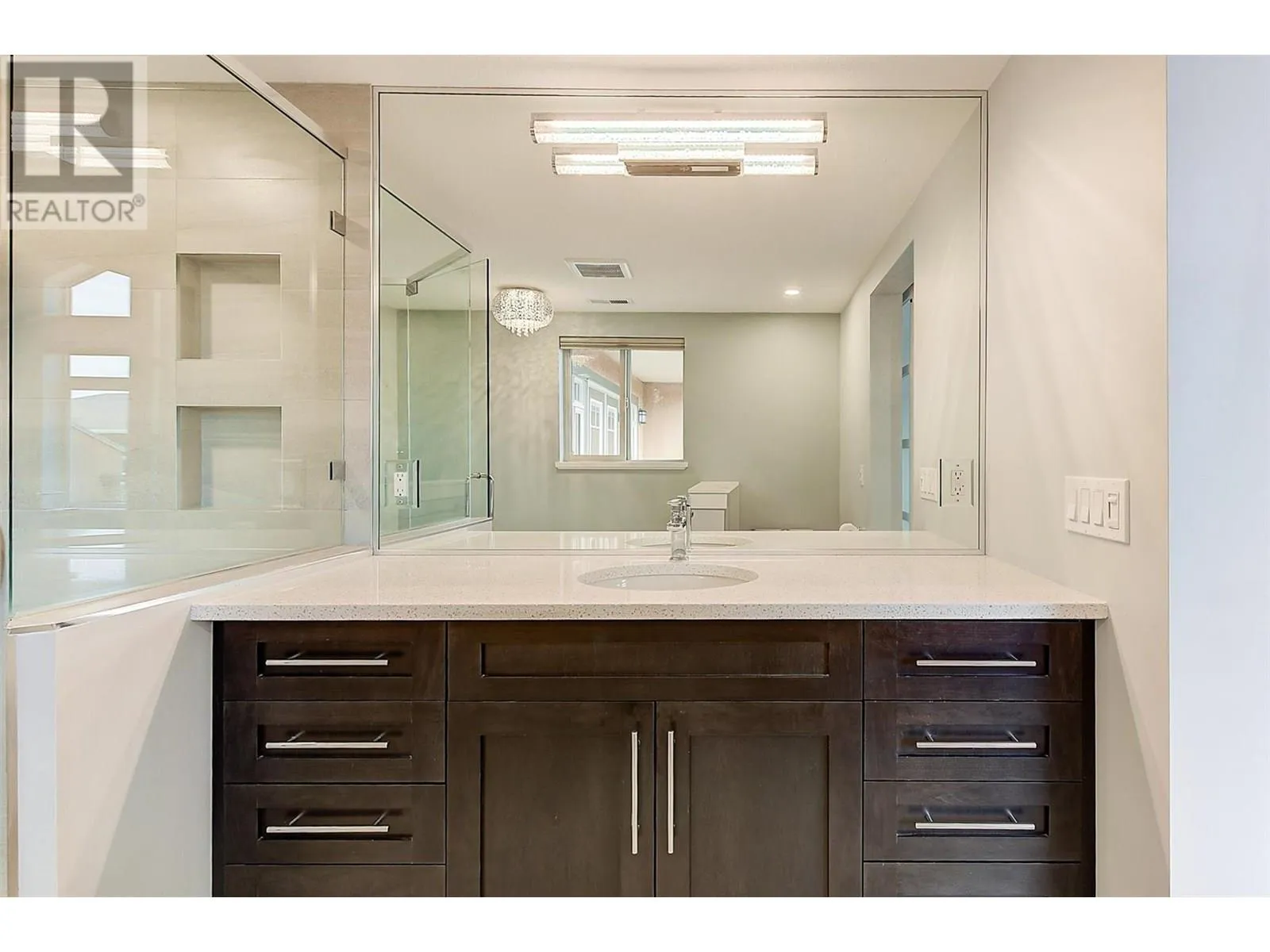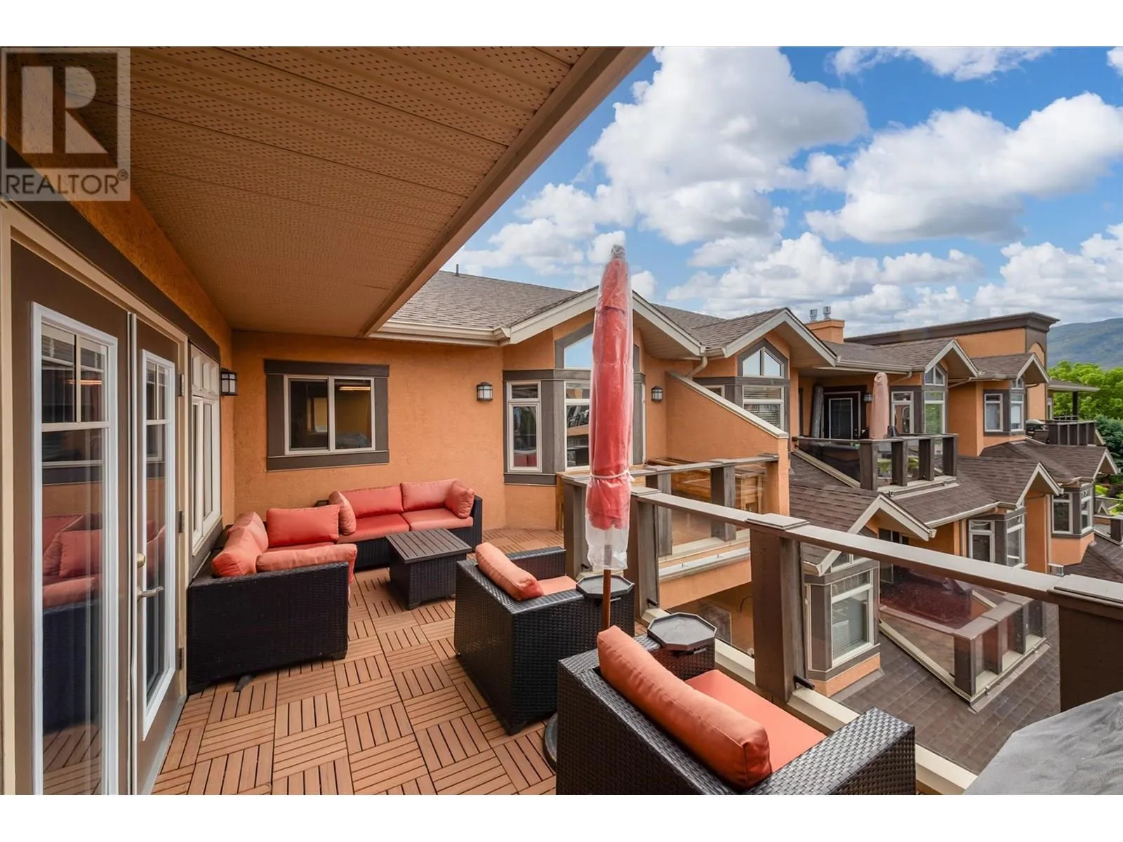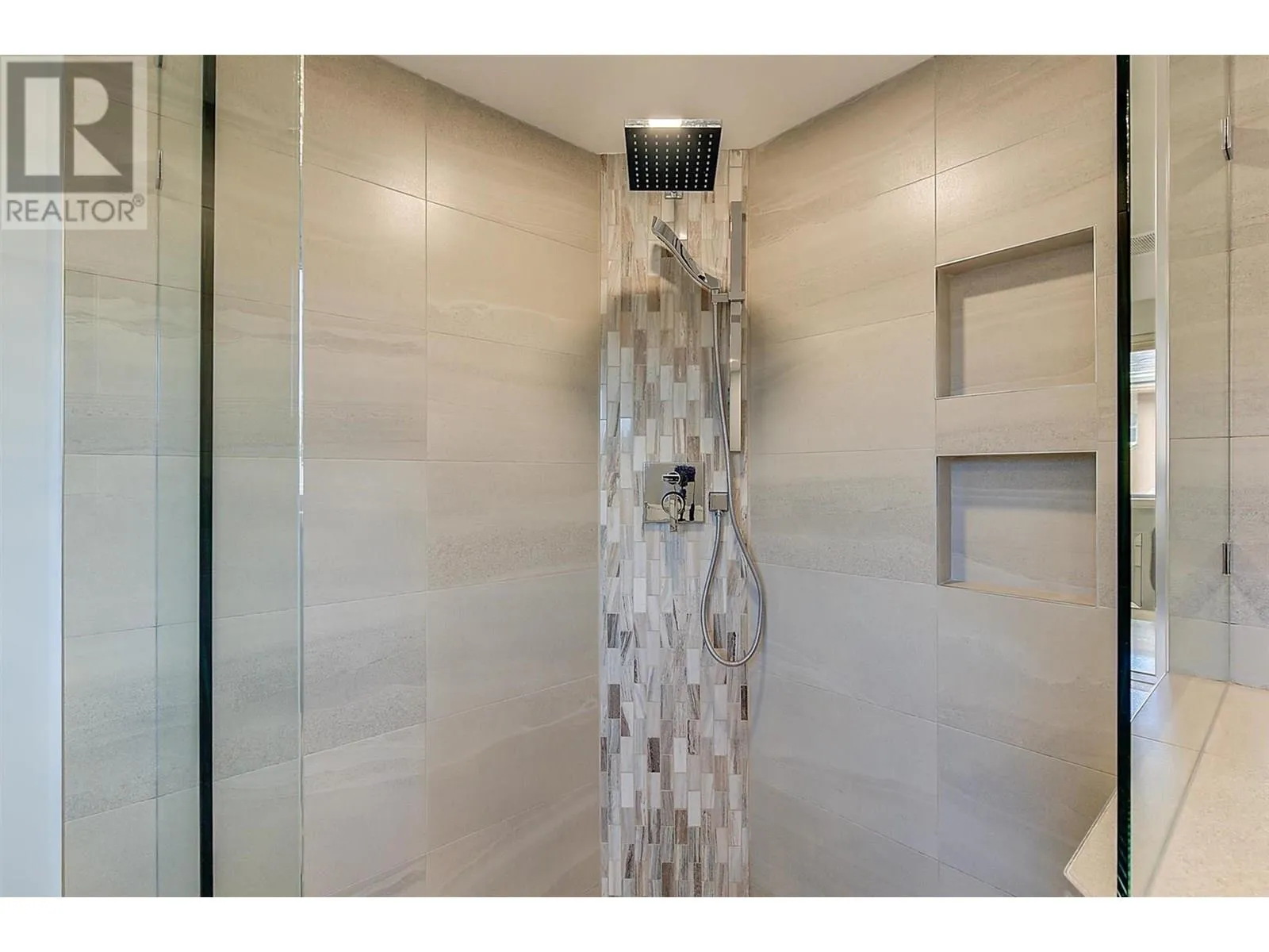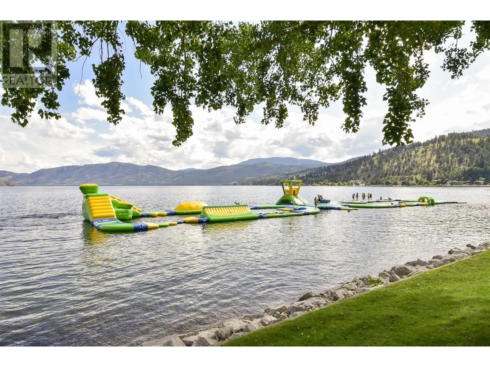 Experience the pinnacle of lakeside luxury in this fully renovated top-floor penthouse at Lakeshore Gardens. Spanning 1,748 square feet, this 3-bedroom, 2-bath retreat offers sweeping views of the lake, pool, and gardens from an oversized double-deck balcony. Inside, vaulted ceilings and high-end finishes create an ambiance of elegance and comfort. The gourmet kitchen is a chefâs dream, outfitted with granite countertops, custom soft-close cabinetry, pull-out drawers, and a premium gas range. In the living room, a striking floor-to-ceiling gas fireplace serves as the centrepiece, while stylish vinyl-coated laminate flooring, luxe tile in the bathrooms, and plush carpeting in the bedrooms add warmth throughout. The primary suite is a private haven with a walk-in closet and spa-like ensuite featuring quartz countertops, a deep soaker tub, and a rainfall shower. A brand-new heat pump, installed in December 2024, ensures optimal climate control year-round. Residents enjoy resort-style amenities including a heated pool, year-round hot tub, full-service gym, secure kayak and bike storage, boat launch, social hall, private storage unit, and two guest suites. Just steps from the shores of Okanagan Lake, this move-in-ready penthouse blends tranquil views with upscale livingâan opportunity not to be missed. Schedule your private viewing today and step into your new lakeside lifestyle. (id:27476)
