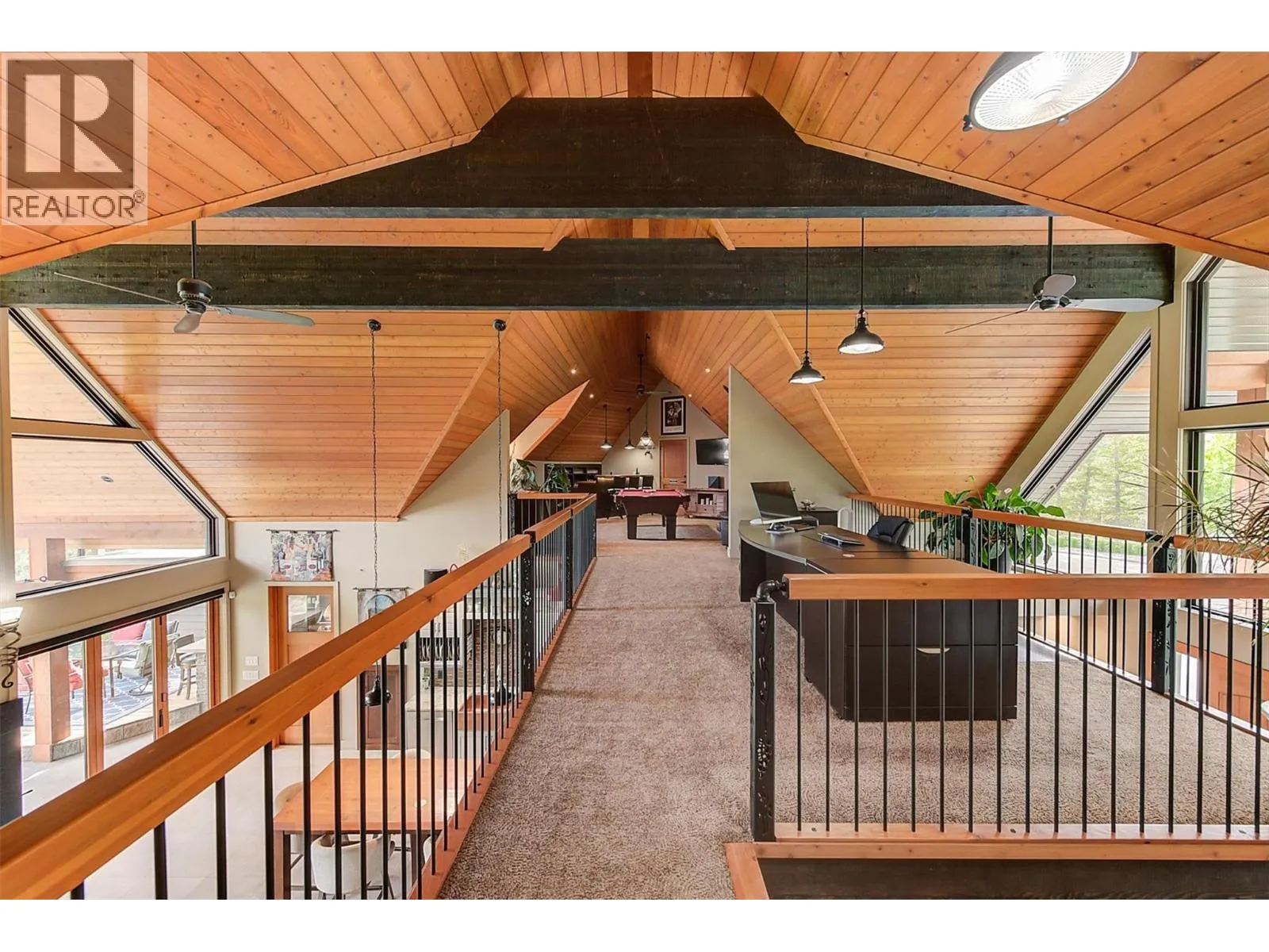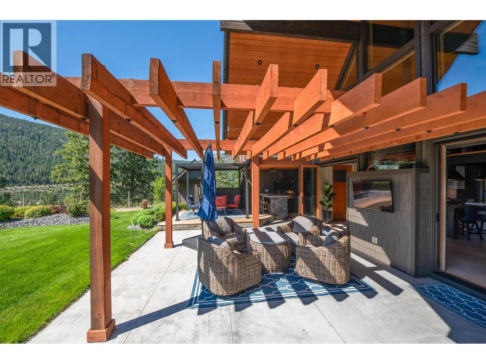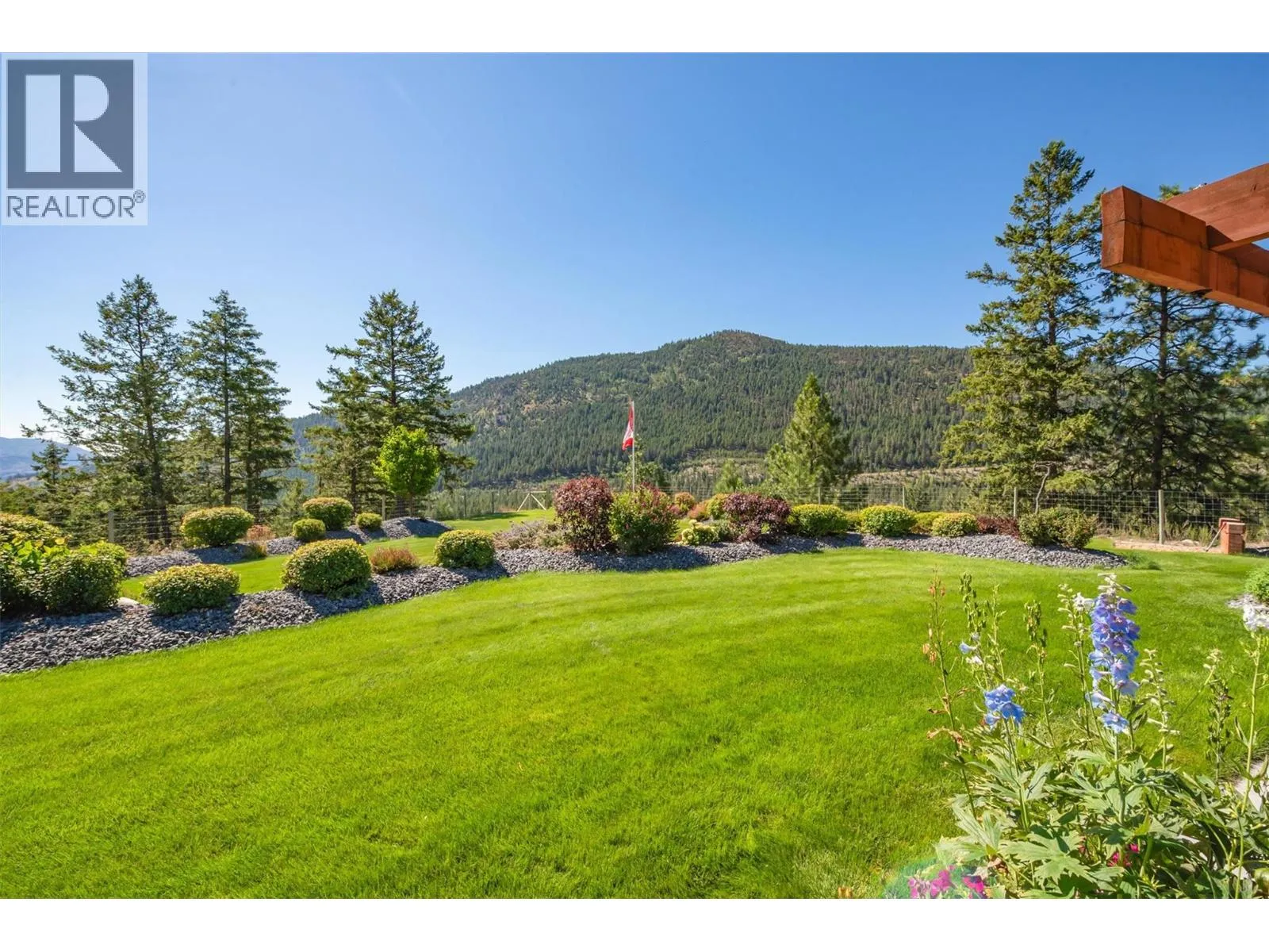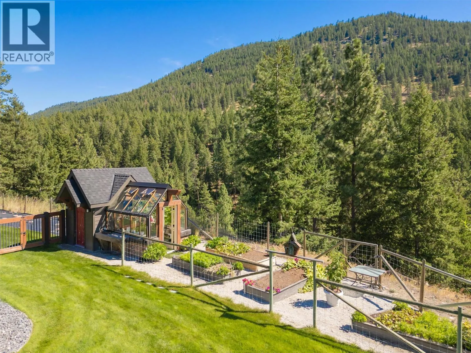 Presenting this exquisite estate property in Peachland. Offering a 6.22 gated acreage, this property is majestic, manicured and has been exceptionally designed to create a park like setting, and offer the ultimate in privacy. This chalet style build has been designed with exceptional craftsmanship and custom finishing's throughout to include wood lined ceilings, a brand new chef-life kitchen with butlerâs pantry, timber beams, wood burning fireplace and summer kitchen. Upon entering the main house, the 25ft cathedral ceilings with bifold doors integrates the indoor/outdoor ultimate living. Open concept main living area with the Primary Suite on the main floor with a luxurious ensuite facing the mountains and glass garden green house. On the upper level youâll find 2 generous sized bedrooms and lofted area that overlooks the great room below. The bar/games room includes a private deck for entertaining at sunset. This 2nd level also connects the most charming 2 bed legal suite situated over the 4 car garage, complete with separate entrance, and private yard with gazebo. Or integrate to a 5 bed home. This estate presents an incredible opportunity with the upper property hosting a solar paneled commercial space, featuring a board room/office and 3 bay workshop with an abundance of space for all equipment, including a new RV parking pad with service, water and sani-dump. Minutes to downtown Peachland and West Kelowna. Virtual Tour, Drone and Video provided to capture it all. (id:27476)