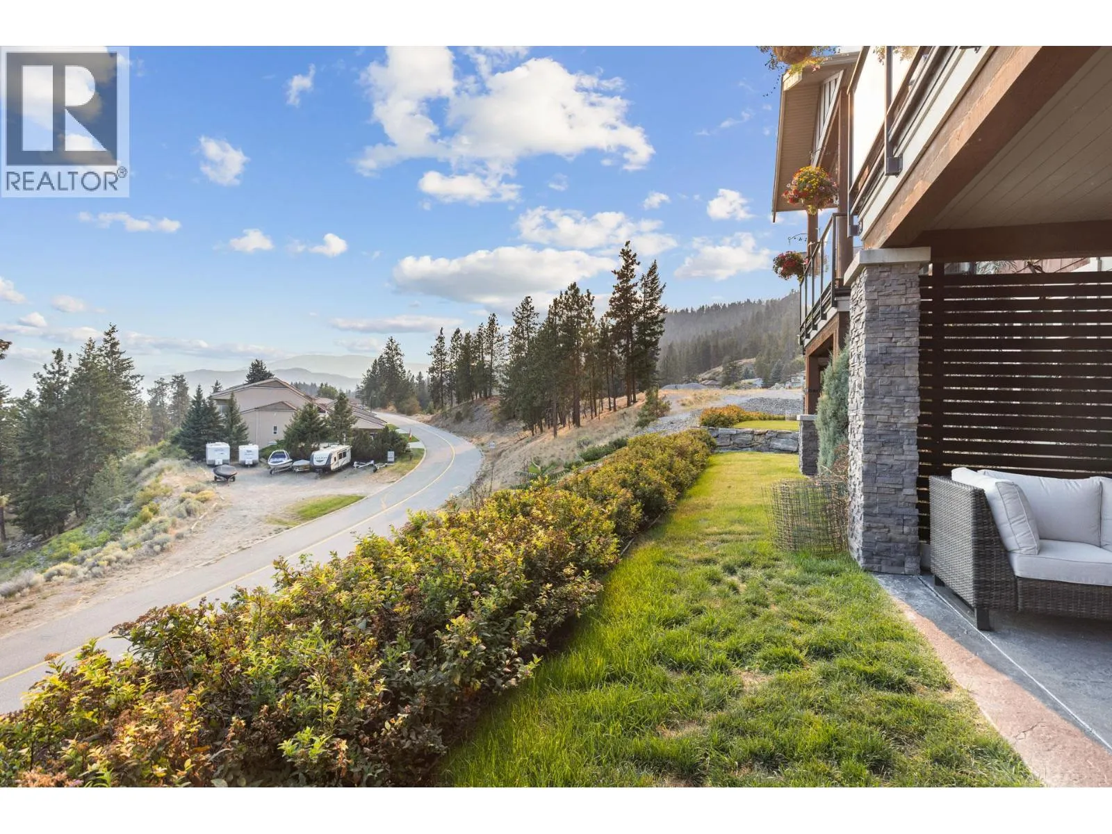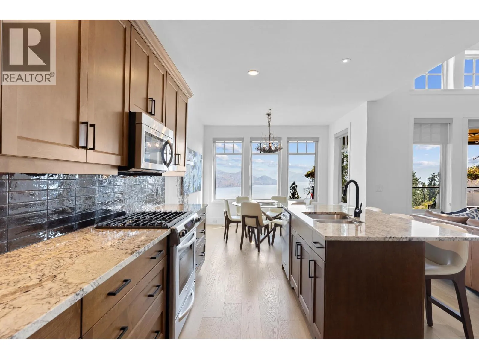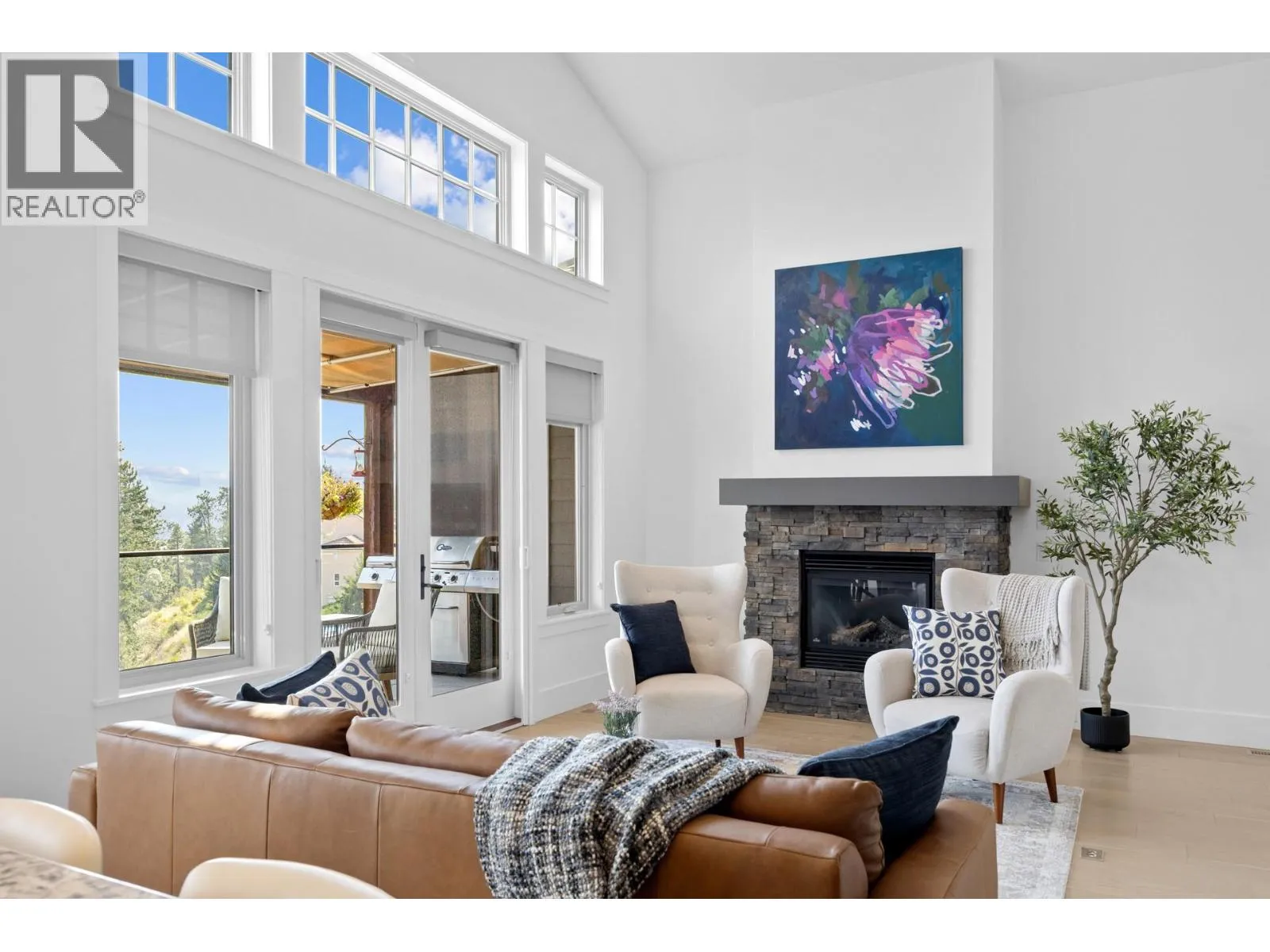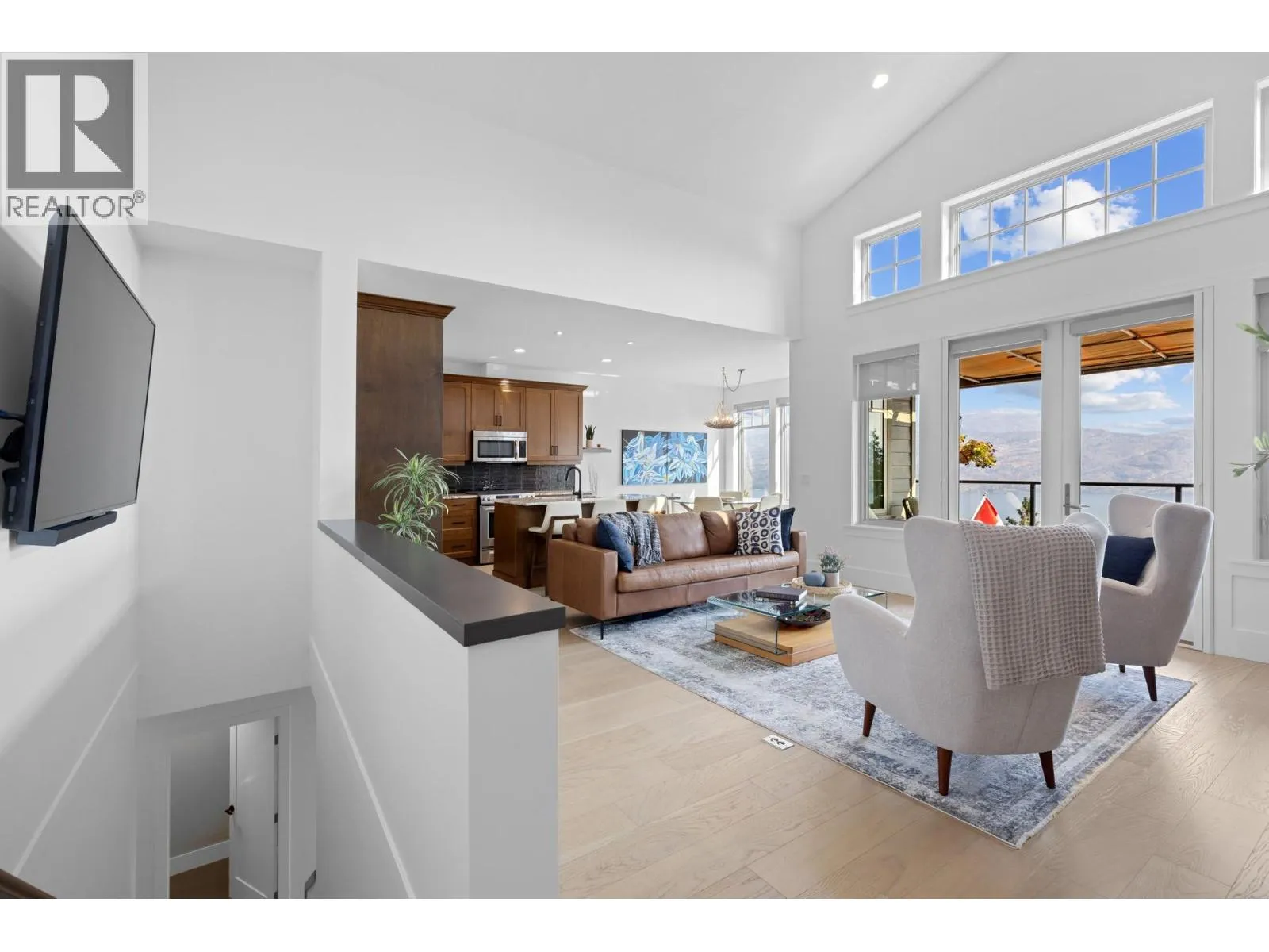 Experience breathtaking panoramic lake and mountain views from nearly every room in this exceptional 2â3 bedroom, 2.5-bath walk-out rancher. Perfectly positioned above the charming lakeside town of Peachland, this home blends tranquility, privacy, and convenience in one stunning package. The bright, open-concept main level features vaulted ceilings, expansive windows that capture the Okanaganâs beauty, and blonde oak Baylor engineered hardwood floors that add warmth and sophistication. Step onto the spacious deck with a natural-gas BBQ hookup â perfect for entertaining, relaxing, or soaking in sunsets over the water. A cozy gas fireplace anchors the living area for year-round comfort and ambiance. The primary suite is a true retreat with French doors to a private patio, a luxurious 5-piece ensuite with heated tile floors, and a generous walk-in closet. The lower level offers an additional bedroom plus a flexible media or guest room with a wet bar, linear electric fireplace, and built-in Murphy bed â ideal as a third bedroom or guest suite. Energy-efficient geothermal heating and cooling ensure comfort through every season. Located in The Trails, youâll enjoy easy access to hiking and biking paths, the vibrant lakefront boardwalk, and Peachlandâs cafés, marina, and waterfront restaurants â all next to an approved 9-hole golf course and surrounded by natural beauty. (id:27476)
