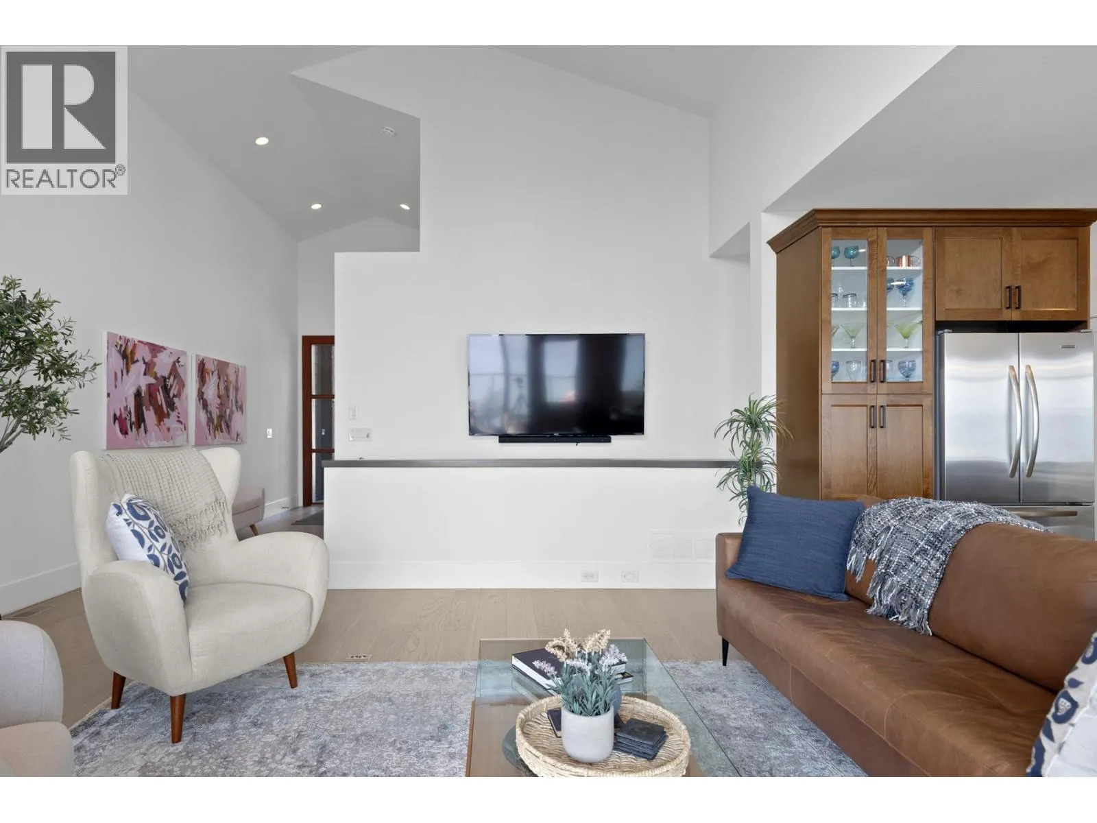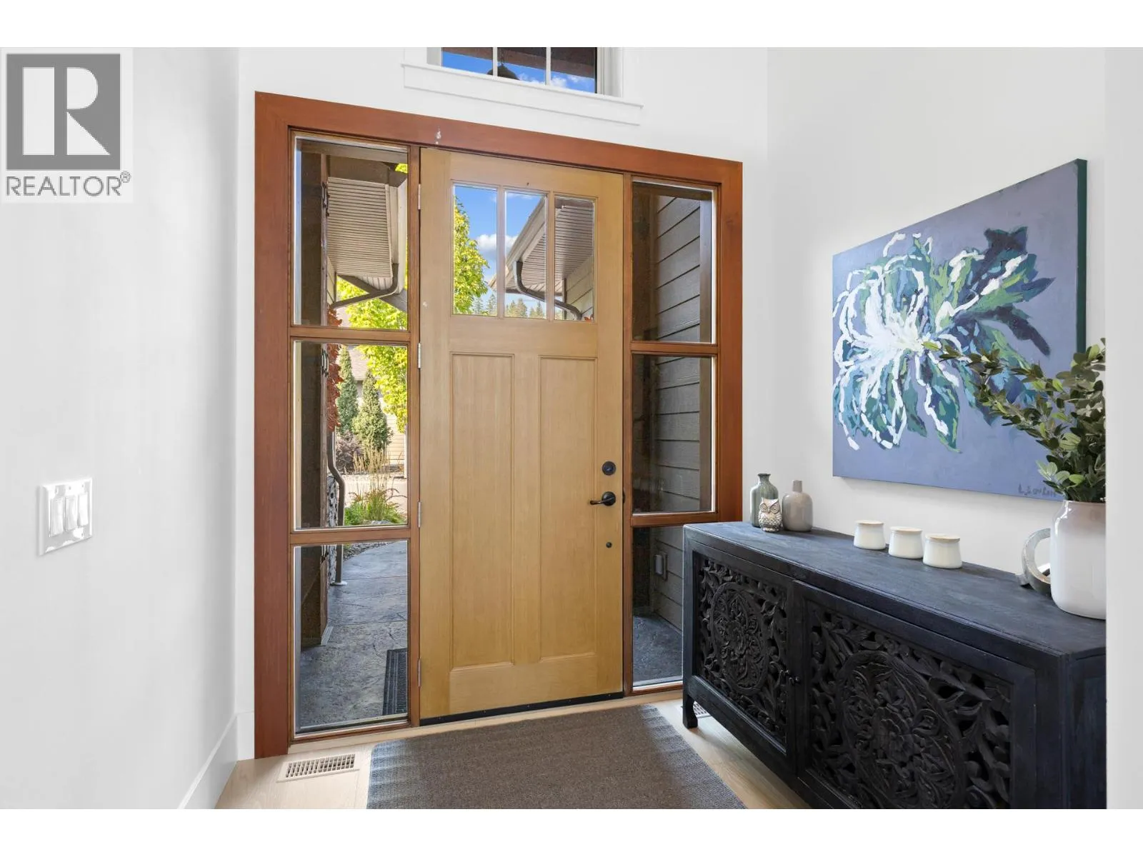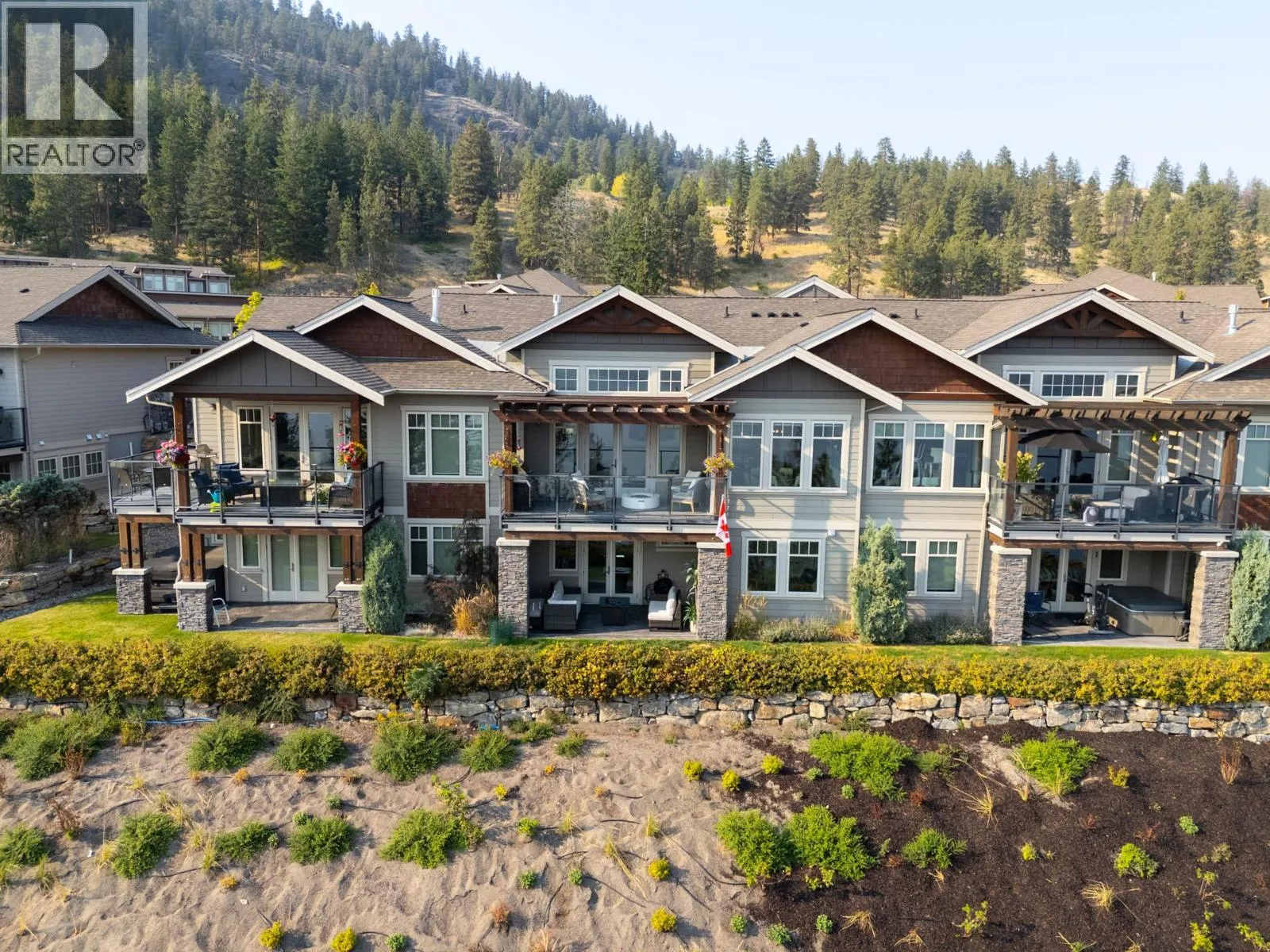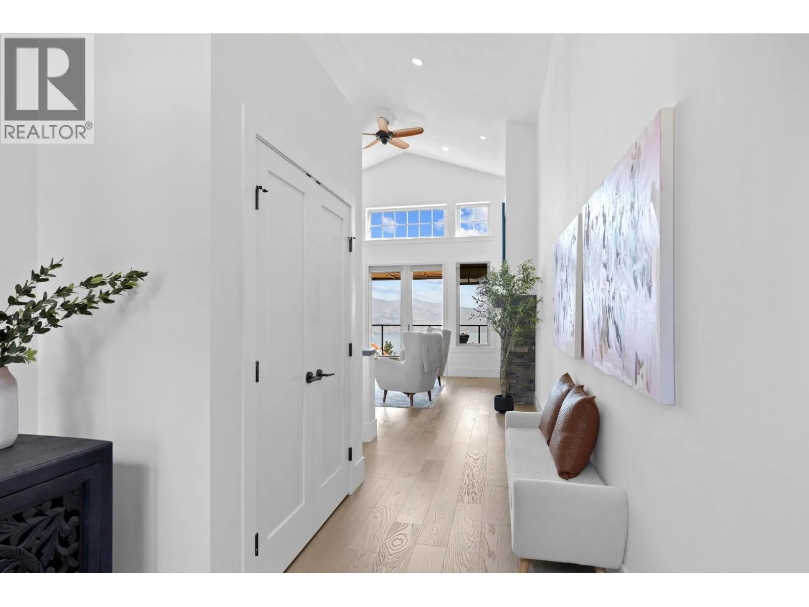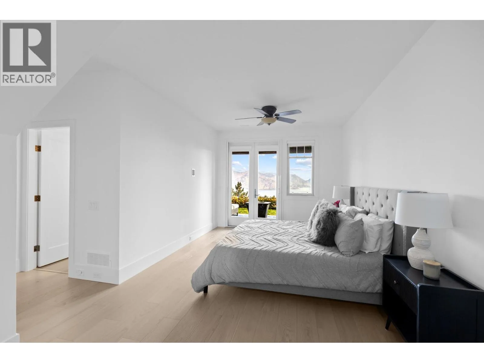 Experience breathtaking panoramic lake and mountain views from nearly every room in this exceptional 2â3 bedroom, 2.5-bath walk-out rancher. Perfectly positioned above the charming lakeside town of Peachland, this home blends tranquility, privacy, and convenience in one stunning package. The bright, open-concept main level features vaulted ceilings, expansive windows that capture the Okanaganâs beauty, and blonde oak Baylor engineered hardwood floors that add warmth and sophistication. Step onto the spacious deck with a natural-gas BBQ hookup â perfect for entertaining, relaxing, or soaking in sunsets over the water. A cozy gas fireplace anchors the living area for year-round comfort and ambiance. The primary suite is a true retreat with French doors to a private patio, a luxurious 5-piece ensuite with heated tile floors, and a generous walk-in closet. The lower level offers an additional bedroom plus a flexible media or guest room with a wet bar, linear electric fireplace, and built-in Murphy bed â ideal as a third bedroom or guest suite. Energy-efficient geothermal heating and cooling ensure comfort through every season. Located in The Trails, youâll enjoy easy access to hiking and biking paths, the vibrant lakefront boardwalk, and Peachlandâs cafés, marina, and waterfront restaurants â all next to an approved 9-hole golf course and surrounded by natural beauty. (id:27476)