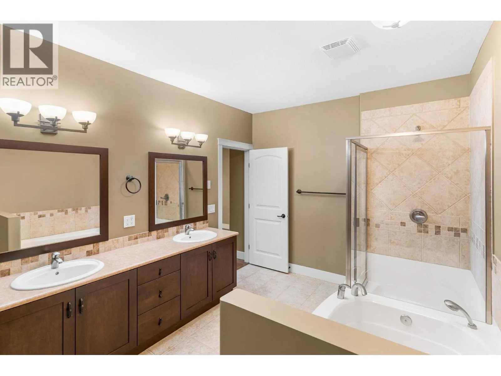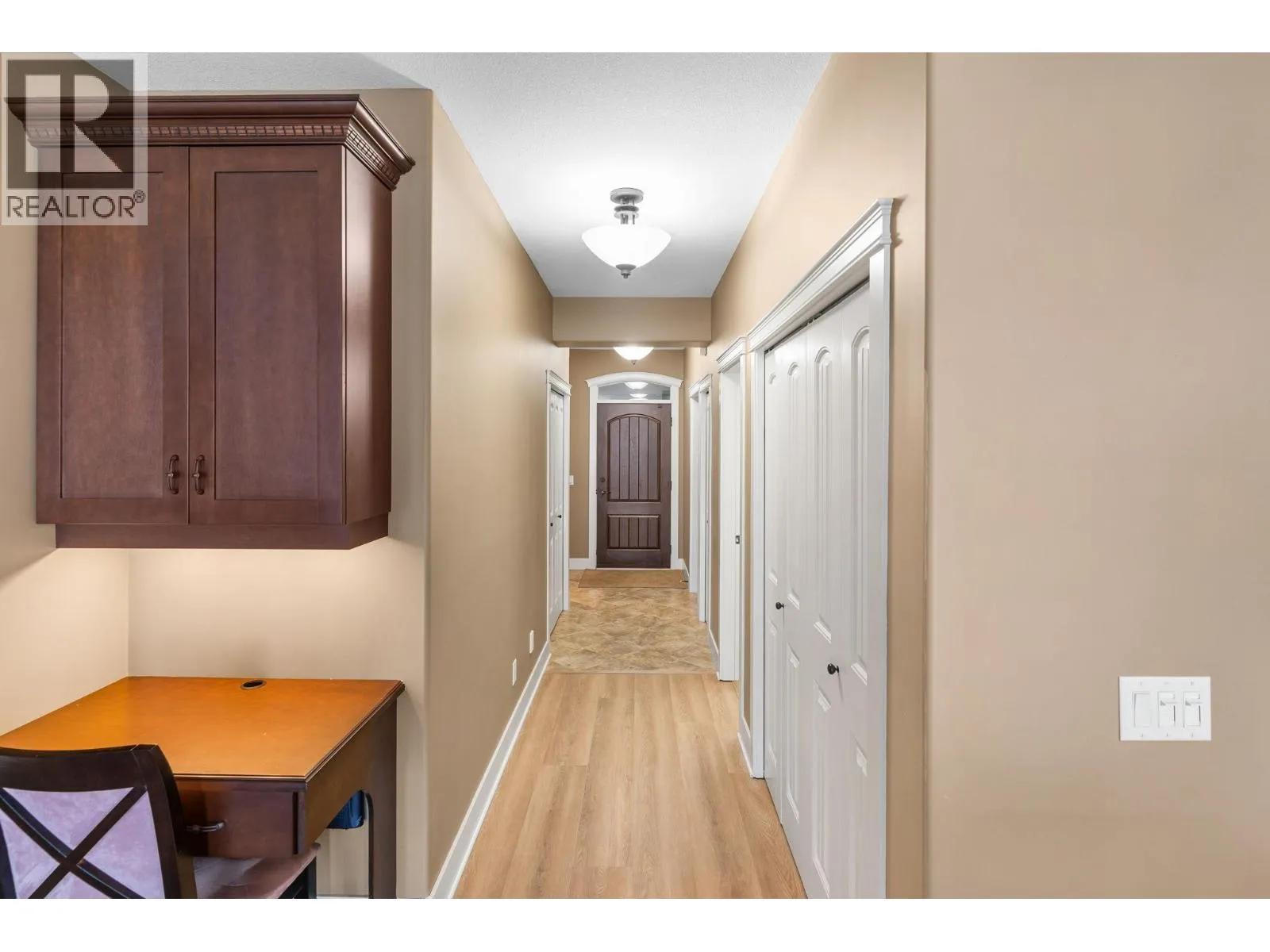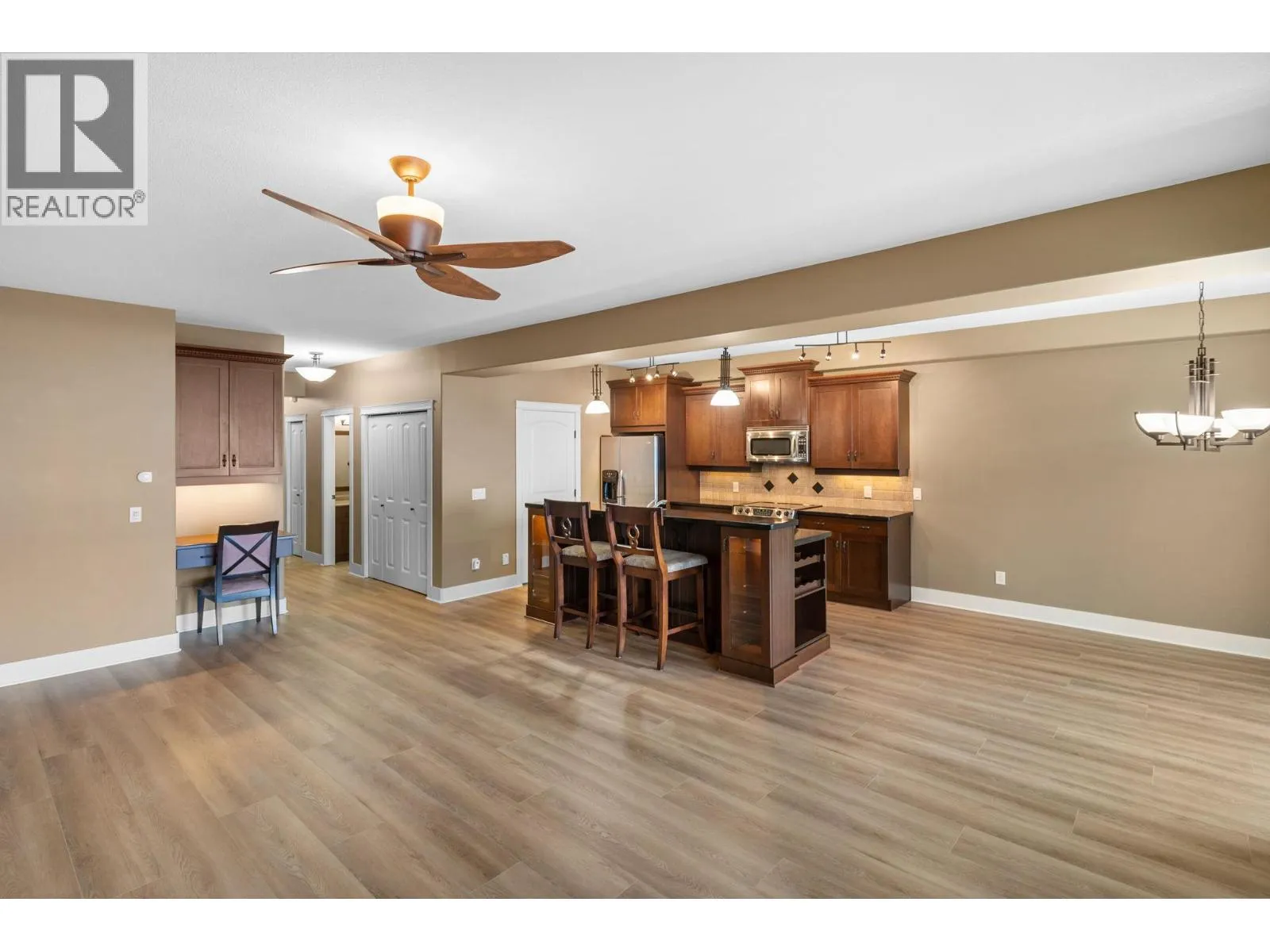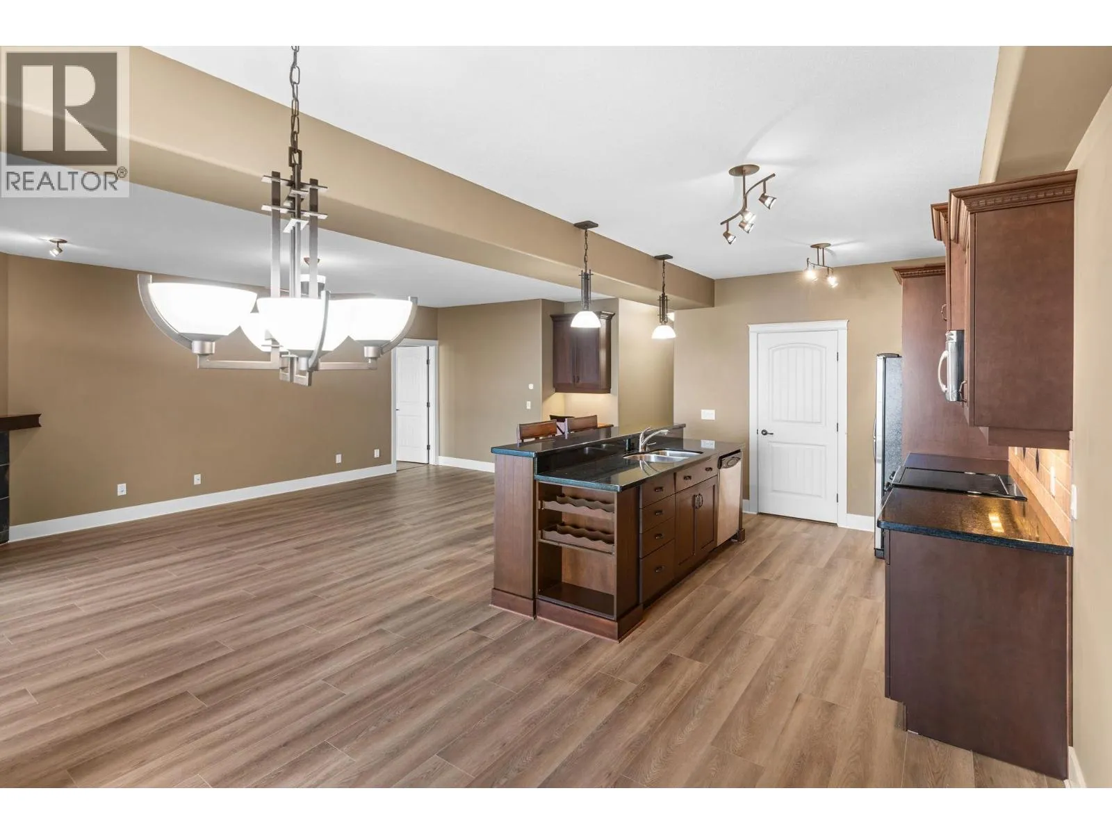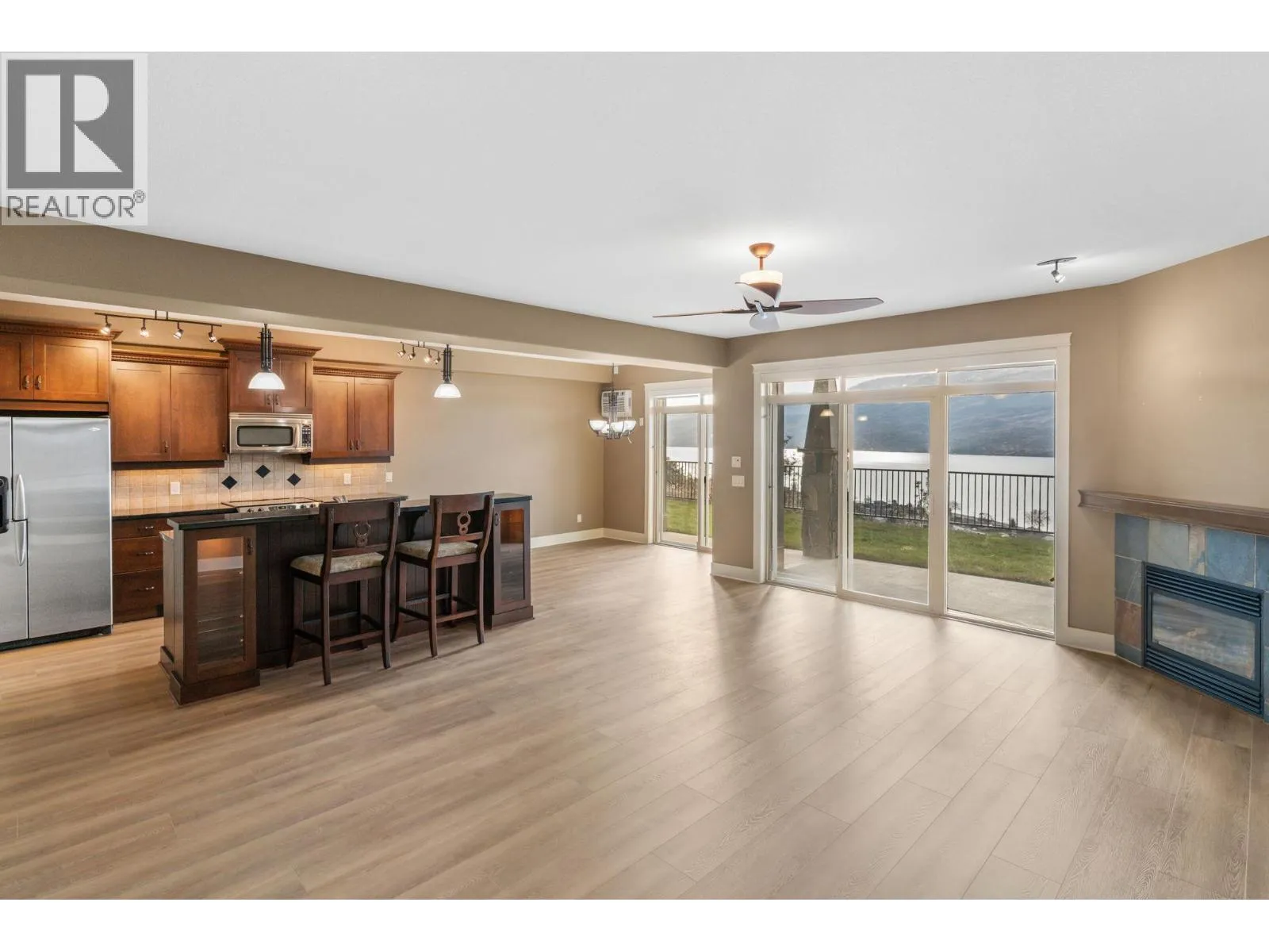 Discover 1588 sq. ft. of luxurious one-level living in this beautiful 2-bedroom, 2-bathroom end-unit townhome, offering breathtaking lake views and an expansive 290 sq. ft. patio. Perfectly designed for both everyday living and a serene summer retreat. Step inside to find an open-concept great room with stunning lake views. The gourmet kitchen is a chef's dream, featuring sleek granite countertops, a large island, stainless steel appliances, and a spacious pantry for all your storage needs. The adjoining dining and living areas boast brand-new wide plank laminate flooring, while in-floor heating and central air units ensure year-round comfort. The cozy gas fireplace adds a touch of elegance to the space. The spacious master suite offers a true retreat, with a luxurious 5-piece ensuite and a generous walk-in closet. A second bedroom, which can also be used as a den, provides versatile living options. This unit offers plenty of storage space, including a conveniently attached single-car garage, one of the few attached garages in the complex! This home is ready for you to move in and enjoy. Donât miss out on this remarkable opportunity to own a piece of paradise at Eagles View! Eagles View is an exceptional gated community with a vibrant community, clubhouse, gym, RV parking, and ample visitor parking available. (id:27476)