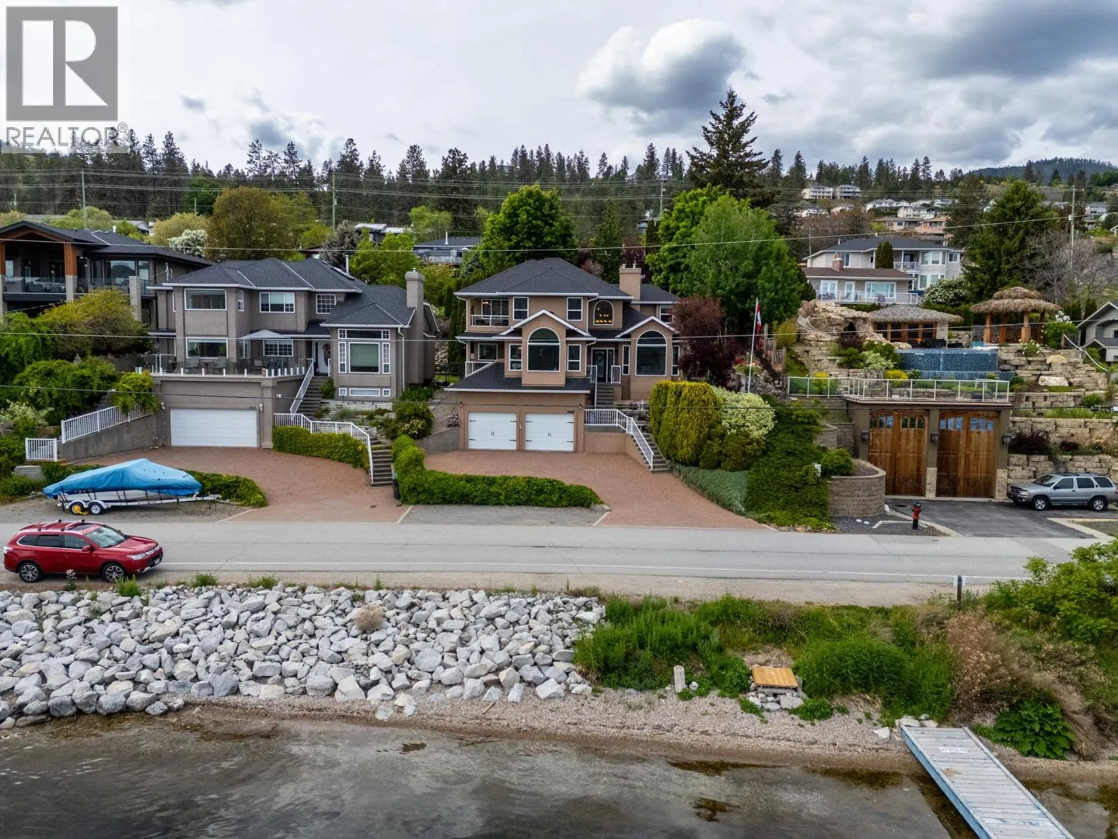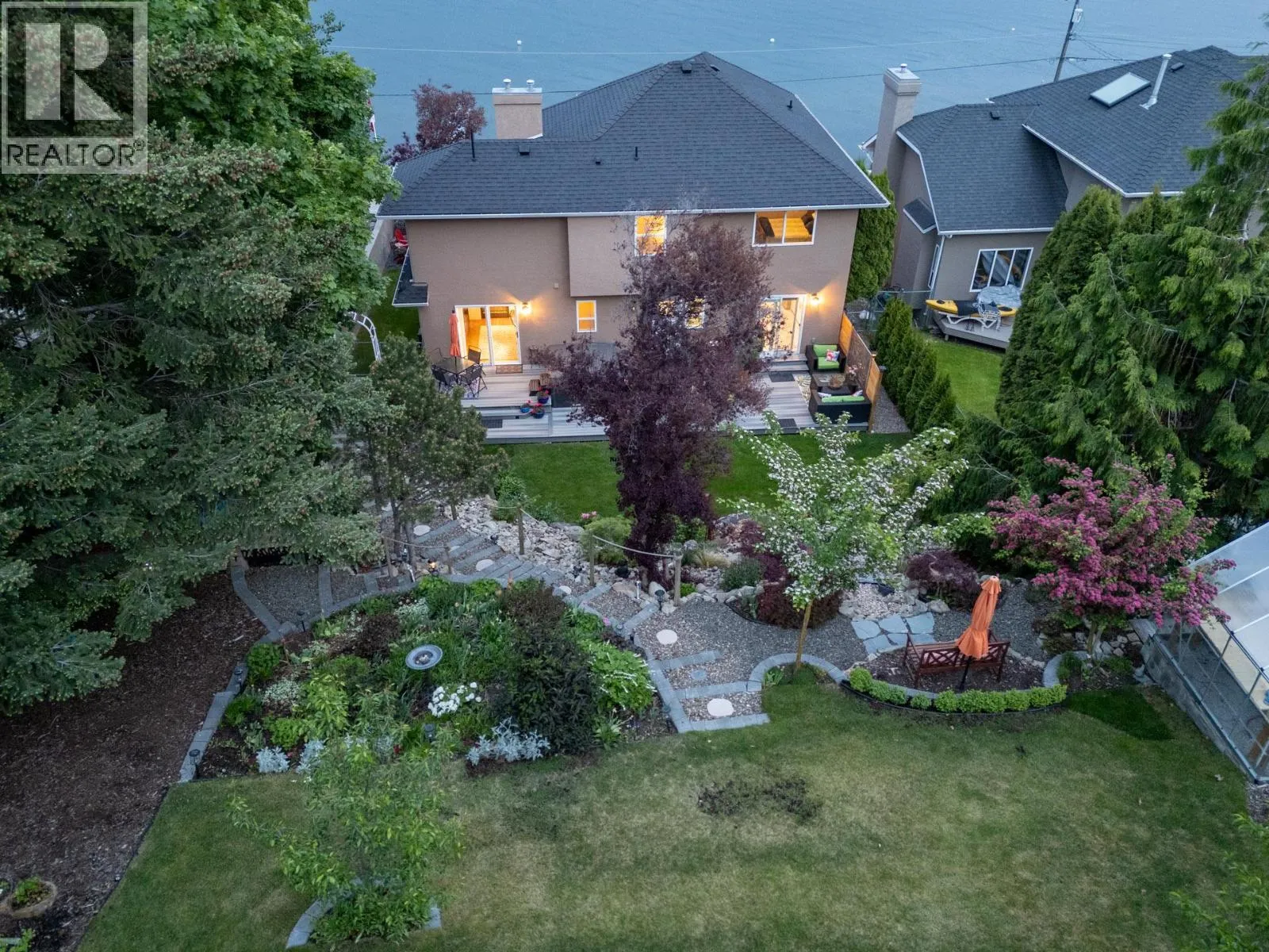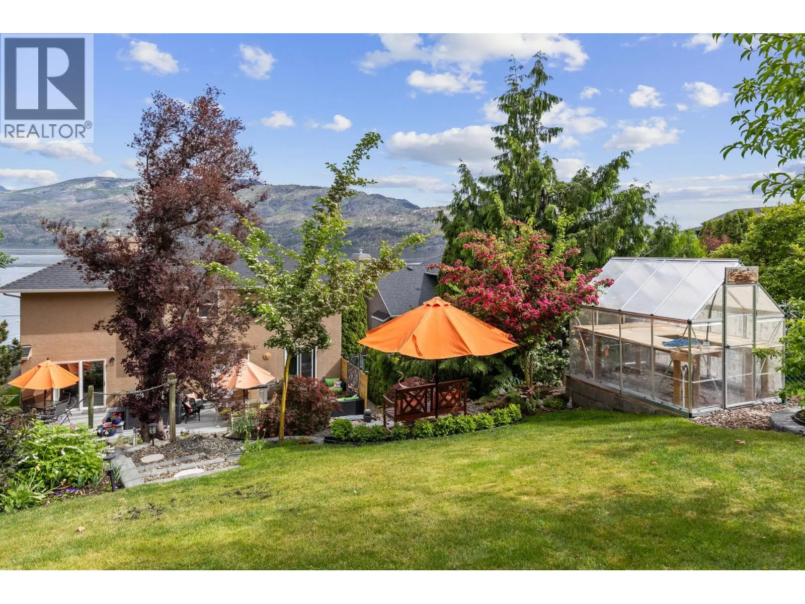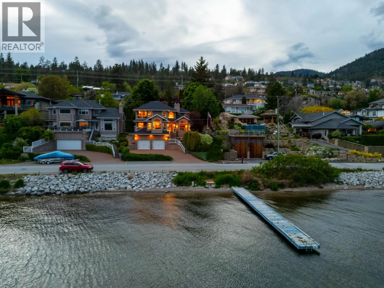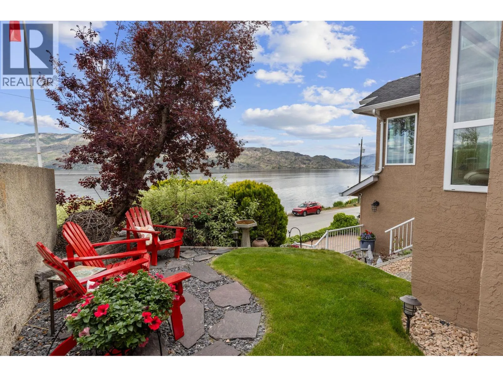 Step outside your front door to enjoy immediate access to Okanagan Lake, where a licensed private buoy awaits your water toys. This immaculate home showcases pride of ownership with its four bedrooms, versatile flex room, and spacious recreation room ideal for a pool table or games room. The newly renovated kitchen features mostly newer appliances, elegant quartz countertops, a beverage fridge and additional sink. The ten foot long island in the kitchen is the perfect gathering place. The primary bedroom ensuite boasts a jetted tub. Additional highlights include a newer front load washer and dryer, built-in vacuum system, and gleaming hardwood oak flooring throughout the home. The property features two front decks for taking in the lake and mountain views, a sunken living room with a gas fireplace, pristinely kept double garage. The outdoor space is fully irrigated, complete with timed drip lines, a stunning water feature, exceptional landscaping with a park like setting of your very own, a greenhouse, garden boxes and a hot tub on the back patio. The home is equipped with a newer geothermal heating and cooling system, ensuring energy efficiency. Your new lifestyle awaits you in the beautiful Peachland along the shores of Okanagan Lake! (id:27476)
