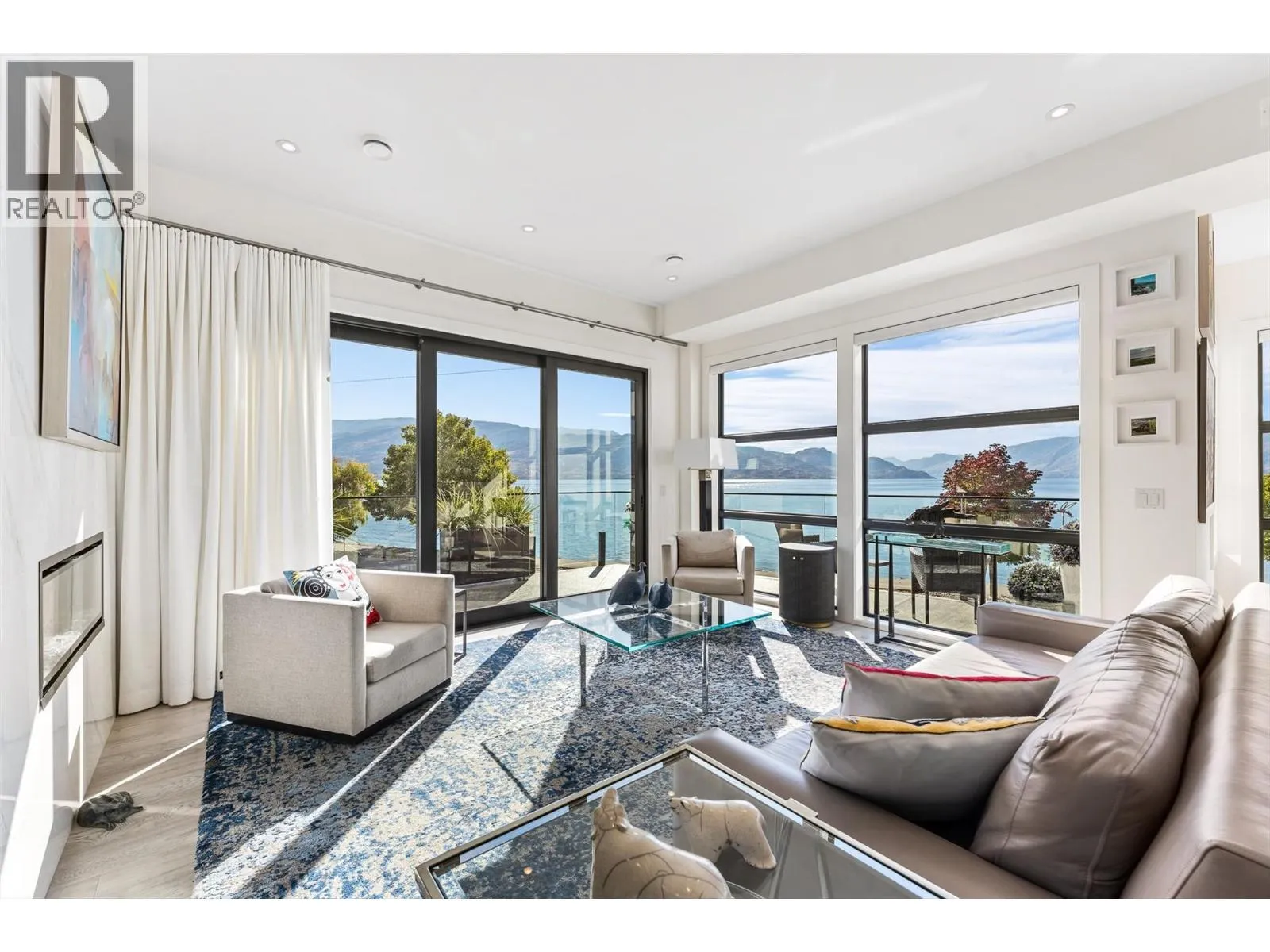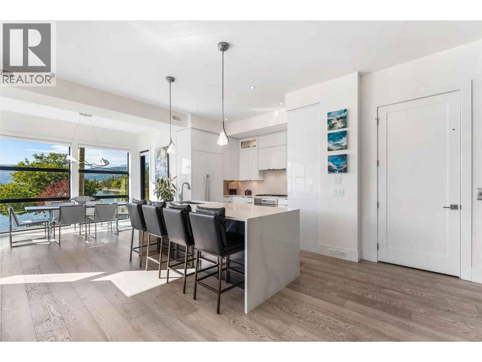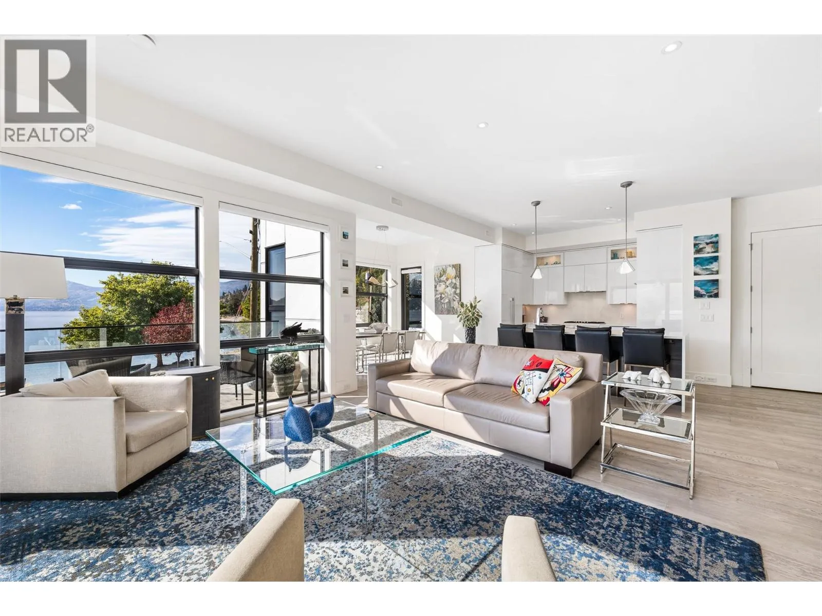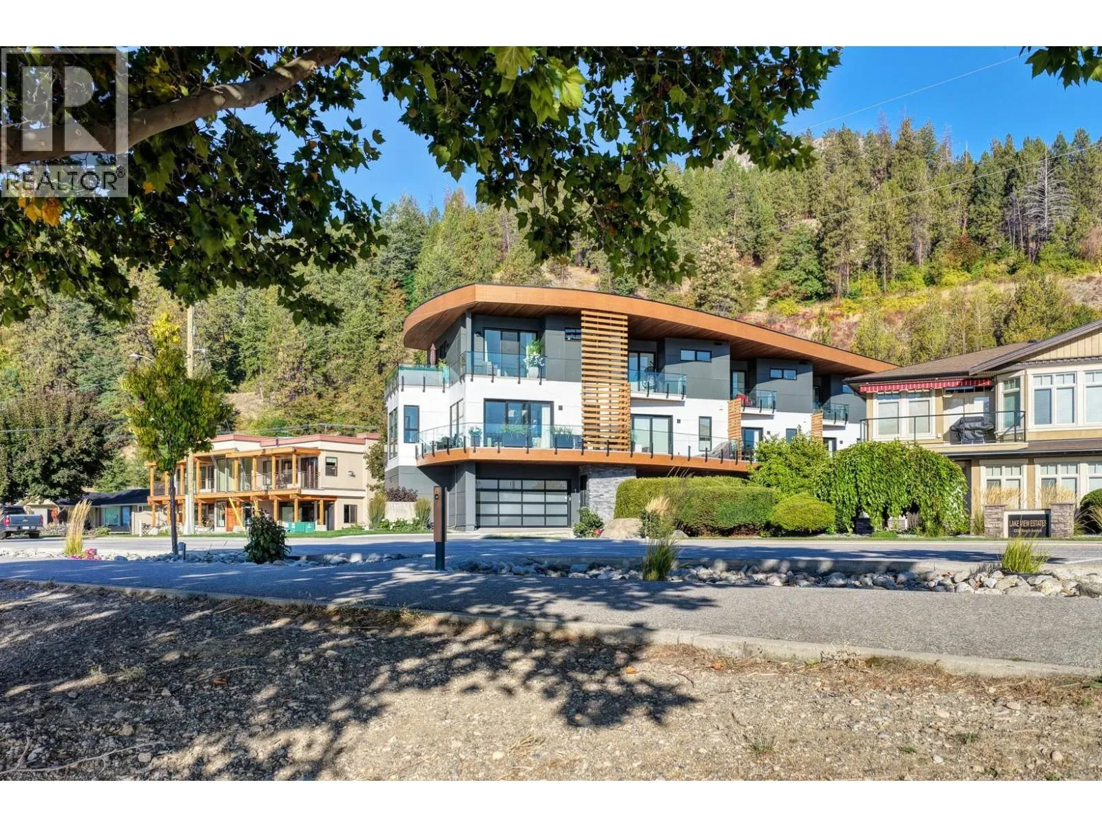 Set in the heart of Peachlandâs vibrant waterfront, this architecturally striking residence by Lakepoint Homes offers refined design and a seamless connection to the Okanagan lifestyle. One of only seven exclusive homes, this end unit sits closest to the water, just steps from the beach, cafes and boutique shops along Beach Avenue. Soaring 10-ft ceilings and floor-to-ceiling Marvin windows flood the interior with natural light, while wide-plank white oak floors and a floating glass staircase add a sense of understated sophistication. The open-concept main level is ideal for entertaining, featuring a chefâs kitchen with Thermador appliances, quartz surfaces, and a statement island that flows into the dining and living areas, framed by panoramic lake and mountain views. Expansive sliding doors open to a wrap-around deck with glass railings, extending your living space outdoors. A private elevator connects all three levels, including the tranquil upper floor where the primary suite offers two walk-in closets, a spa-inspired ensuite, and access to two serene view decks. An additional bedroom with an adjacent bath, office, and laundry complete the layout. The double garage provides abundant storage, epoxy floors, and EV charging. With multiple, distinct outdoor living spaces and meticulous attention to detail throughout, this home embodies elevated lakeside living in one of Peachlandâs most charming waterfront communities. (id:27476)