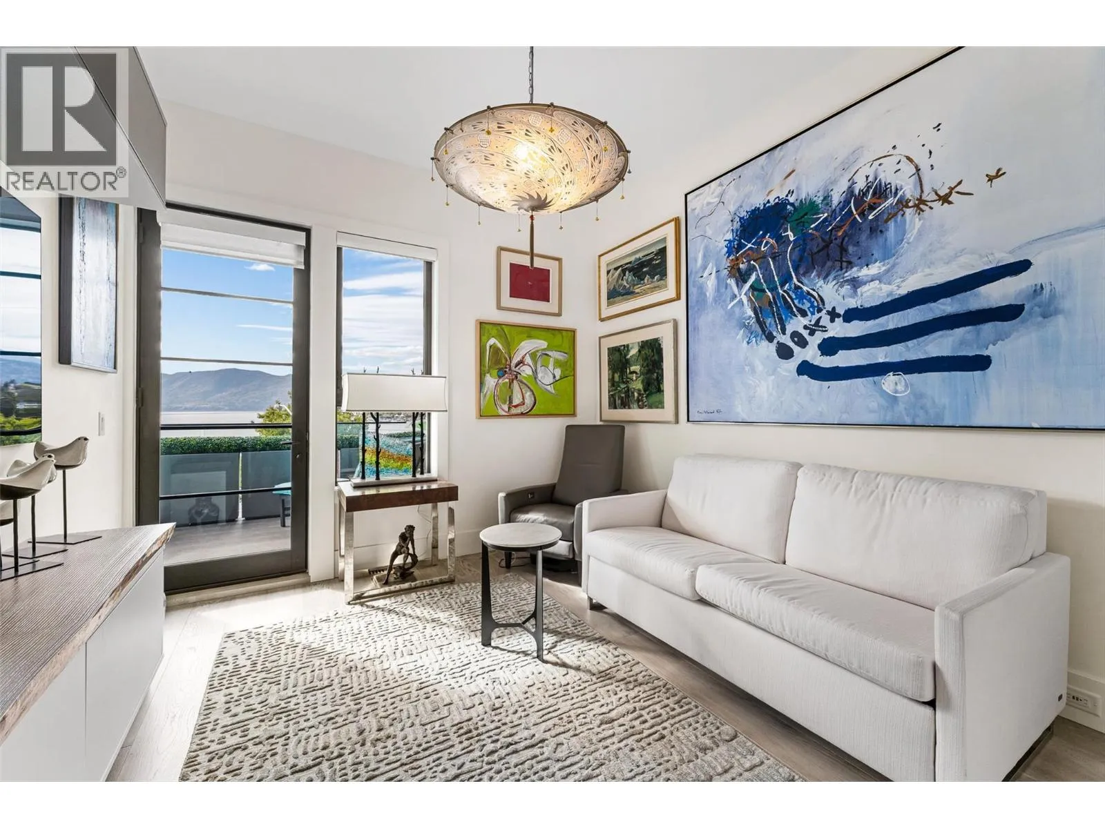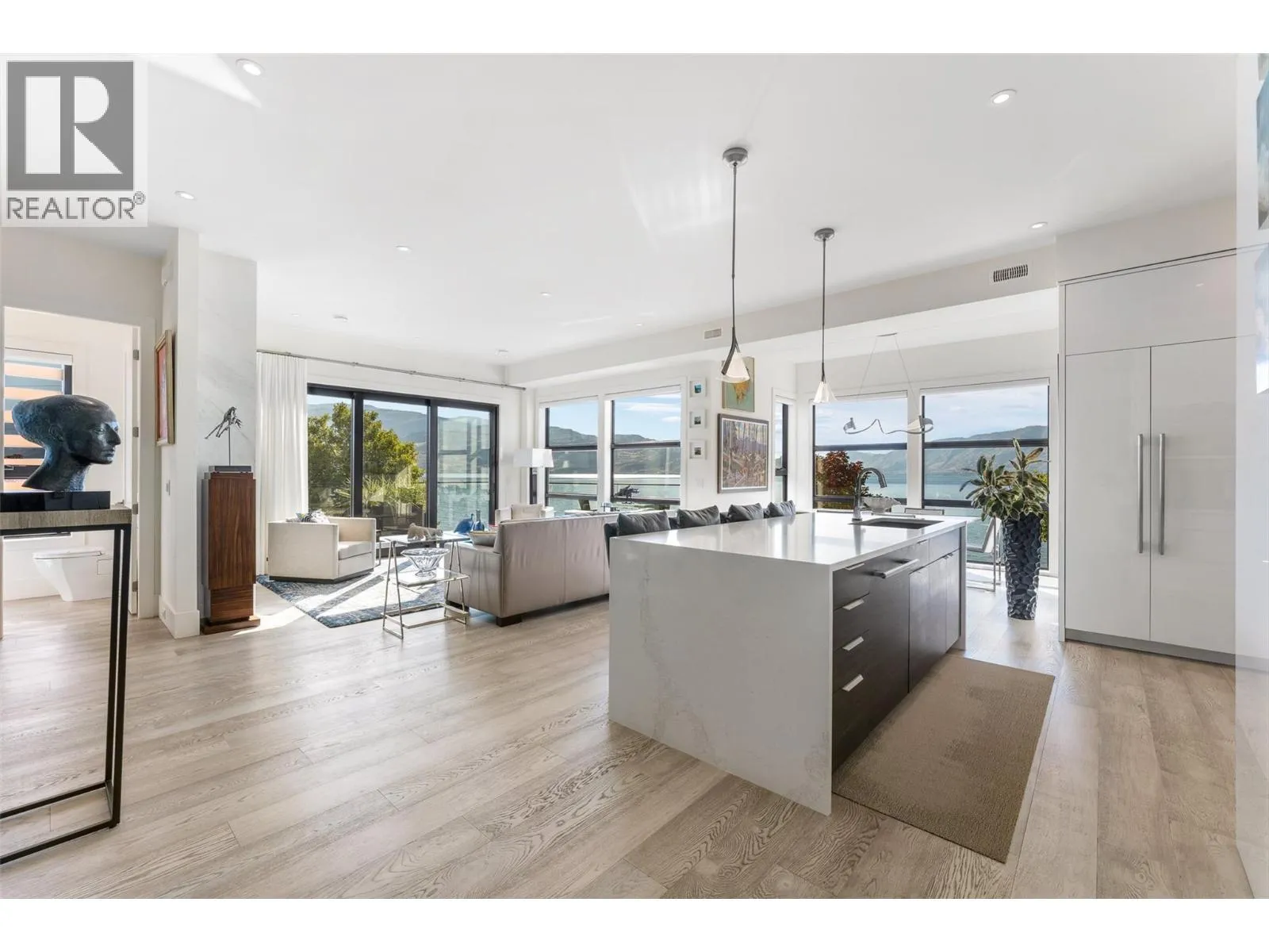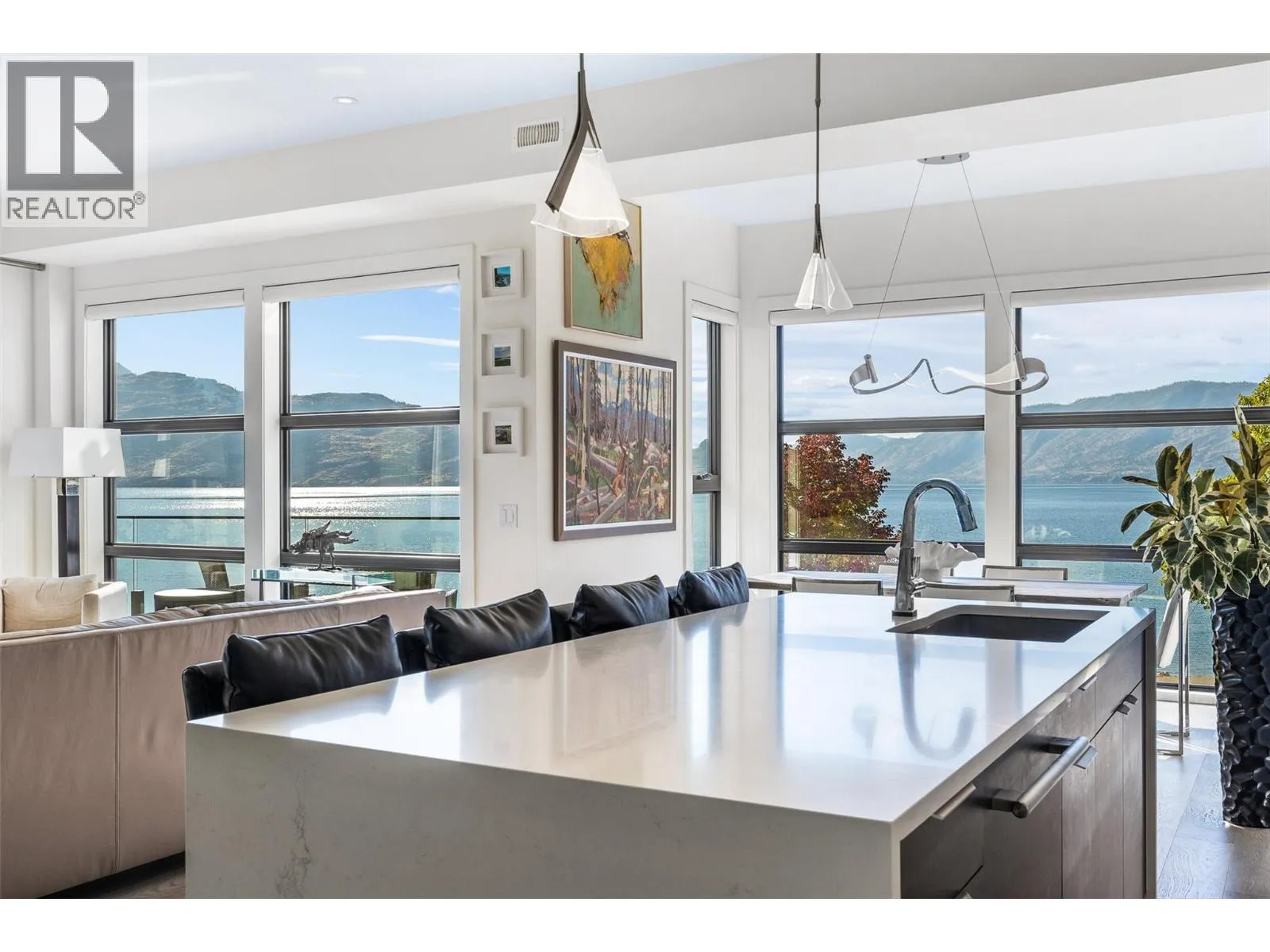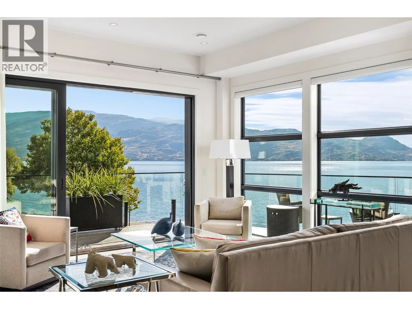 Set in the heart of Peachlandâs vibrant waterfront, this architecturally striking residence by Lakepoint Homes offers refined design and a seamless connection to the Okanagan lifestyle. One of only seven exclusive homes, this end unit sits closest to the water, just steps from the beach, cafes and boutique shops along Beach Avenue. Soaring 10-ft ceilings and floor-to-ceiling Marvin windows flood the interior with natural light, while wide-plank white oak floors and a floating glass staircase add a sense of understated sophistication. The open-concept main level is ideal for entertaining, featuring a chefâs kitchen with Thermador appliances, quartz surfaces, and a statement island that flows into the dining and living areas, framed by panoramic lake and mountain views. Expansive sliding doors open to a wrap-around deck with glass railings, extending your living space outdoors. A private elevator connects all three levels, including the tranquil upper floor where the primary suite offers two walk-in closets, a spa-inspired ensuite, and access to two serene view decks. An additional bedroom with an adjacent bath, office, and laundry complete the layout. The double garage provides abundant storage, epoxy floors, and EV charging. With multiple, distinct outdoor living spaces and meticulous attention to detail throughout, this home embodies elevated lakeside living in one of Peachlandâs most charming waterfront communities. (id:27476)