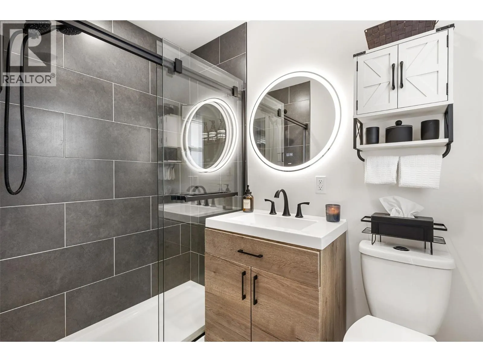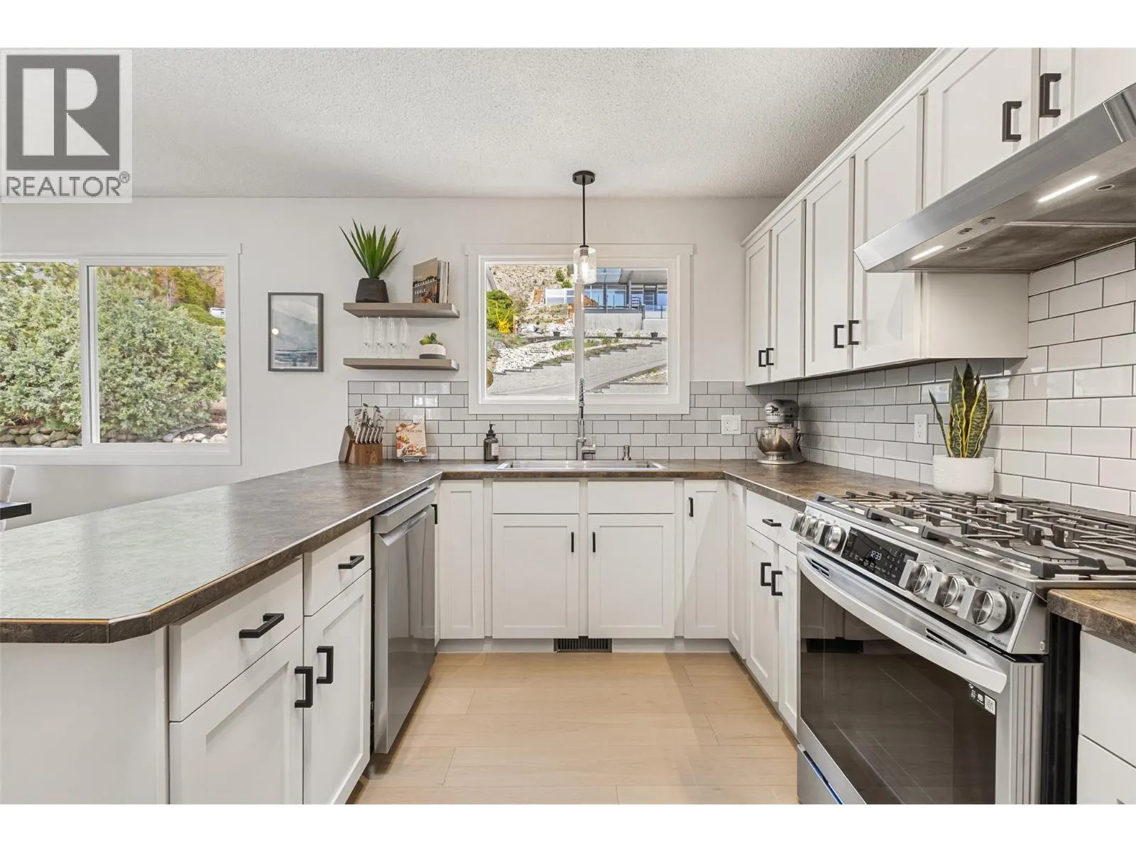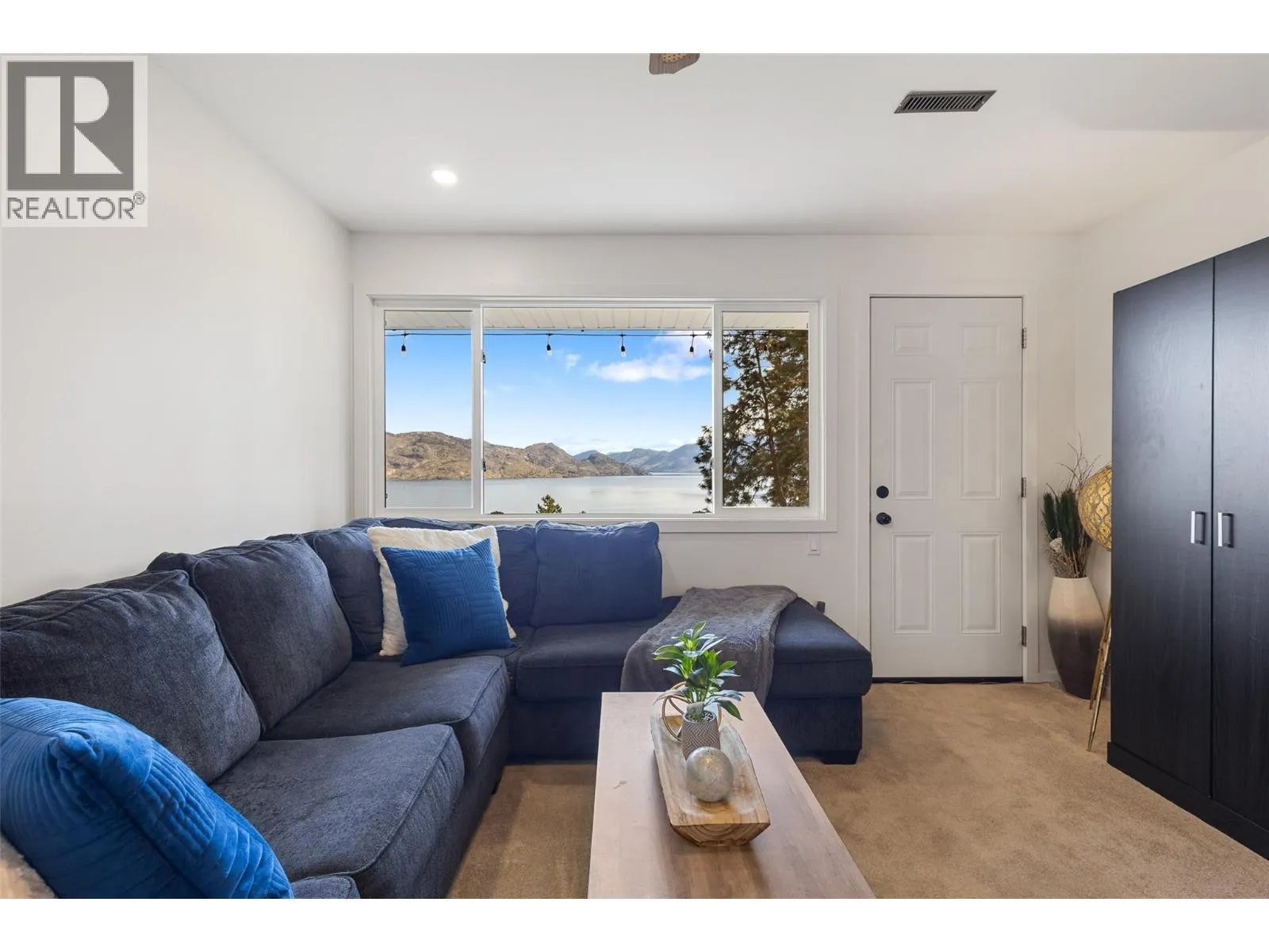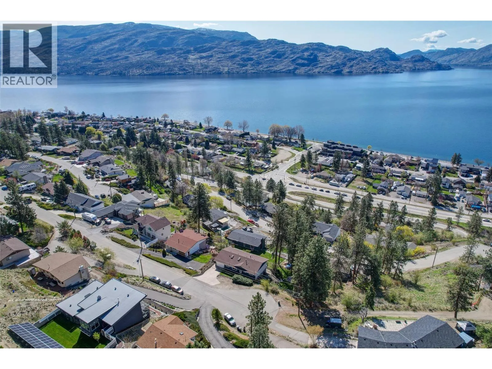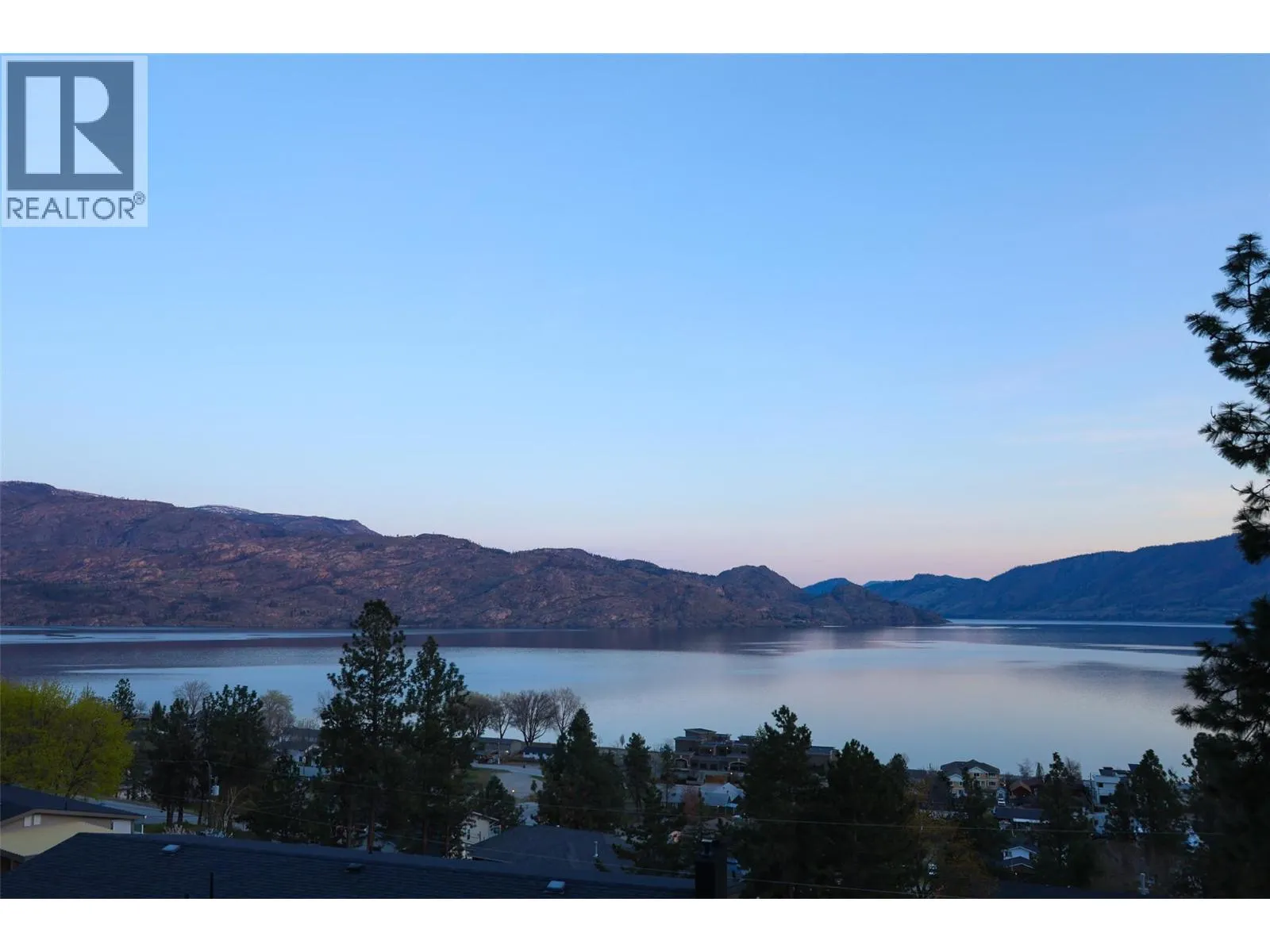Welcome to this beautifully renovated rancher with a fully finished walkout basement, tucked away on a quiet cul-de-sac with panoramic lake and mountain views from nearly every room. Extensively updated with modern finishes, the main level features a spacious primary bedroom with a sleek ensuite, custom built-in closets, and sliding door access to a view balcony. The open-concept kitchen with brand-new stainless steel appliances flows into the living room with a cozy gas fireplace. A generous guest bedroom that comfortably fits a king bed, a four-piece main bathroom, and an oversized single-car garage complete the main level. The bright walkout basement offers exceptional flexibility with a private office, flex space, theatre-grade insulated media room, workshop/storage room, and new washer and dryer. A self-contained one-bedroom in-law suite with a private entrance provides excellent potential for extended family or rental income. Set on a landscaped 0.22-acre lot, the fully fenced yard includes in-ground sprinklers, a hot tub on the lower patio, and RV parking. This home offers modern comfort, functionality, and stunning natural surroundings perfect for enjoying the Okanagan lifestyle. ***Extensive updates include: All plumbing upgraded to PEX, Electrical outlets and switches upgraded, GFI outlets added in bathrooms, venting upgraded throughout, upgraded natural gas meter, A/C installed, new flooring throughout, interior and exterior paint, all trim replaced, door handles replaced, Pot lights added in basement, Theatre-grade insulation added to downstairs media room, Updated fireplace surrounding, built-in closets, backsplash kitchen, cabinets new hardware, appliances in main home, new appliances in suite, All main floor bathrooms fully renovated, new window coverings, landscaping, tree removal, fencing added, Hot tub, new septic 2018, new roof in 2015. (id:27476)