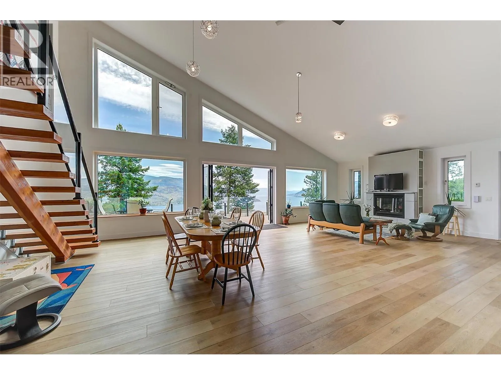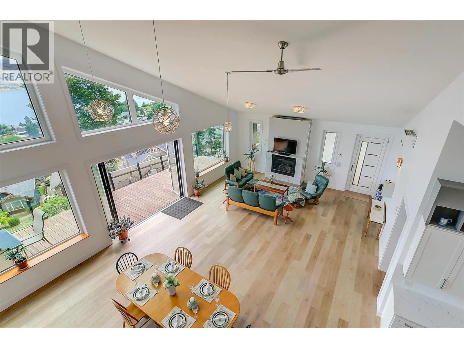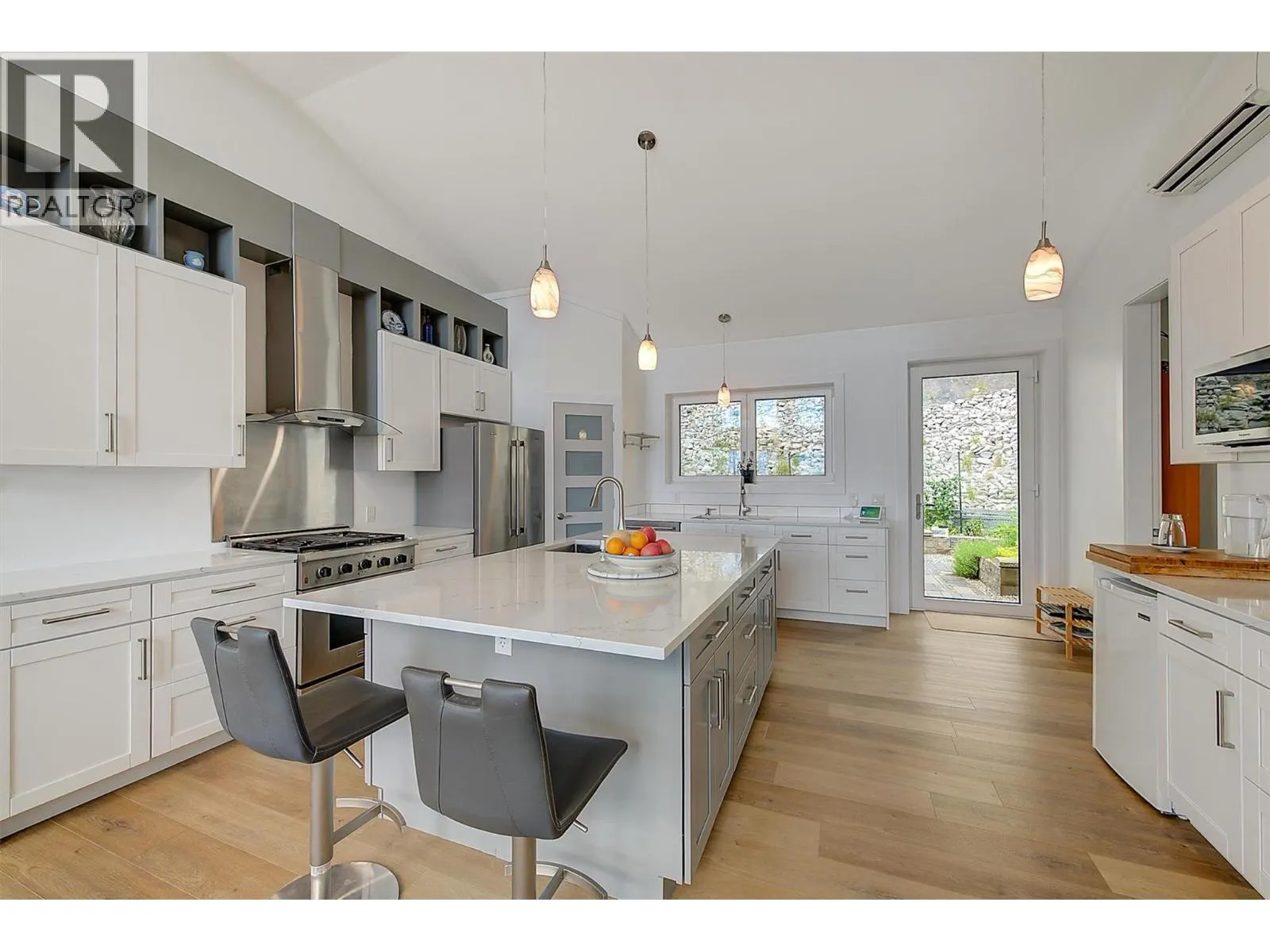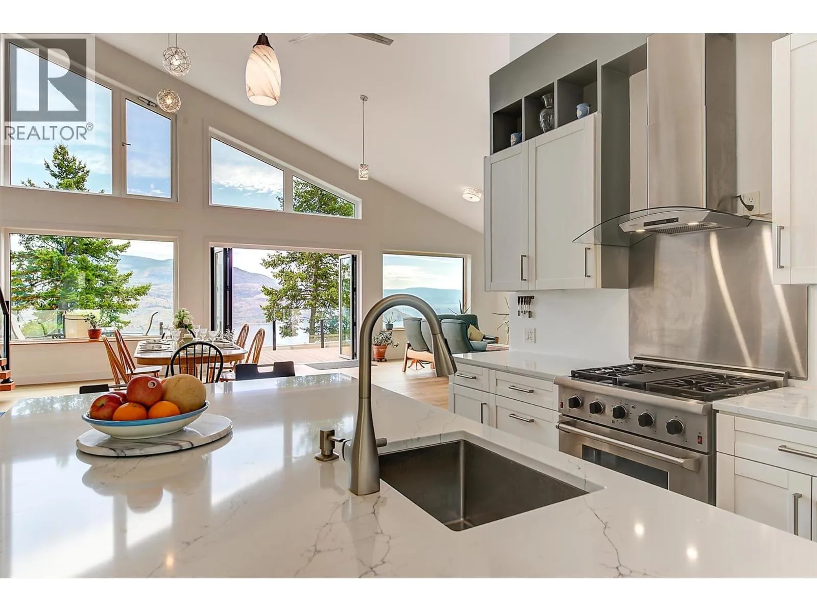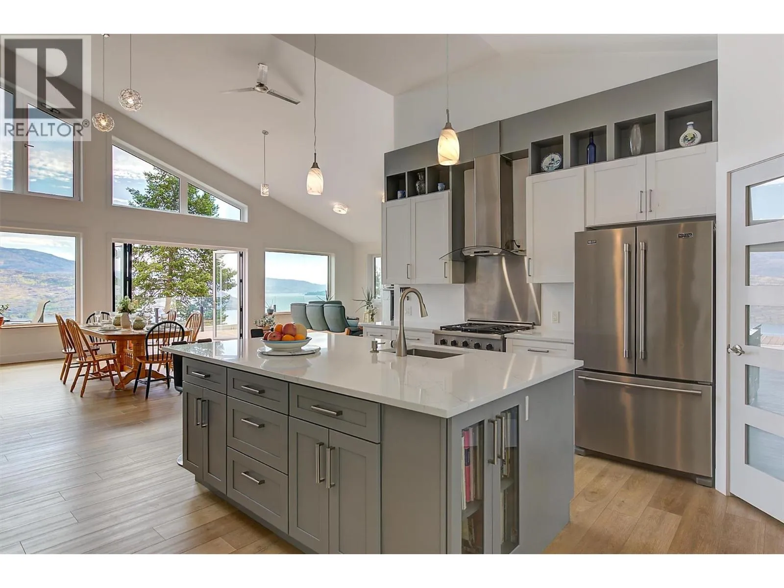 This stunning 2019 owner-built home offers thoughtful design and breathtaking panoramic views of Okanagan Lake and the surrounding mountains. Perched on the hillside, the home captures the scenery from both the spacious front deck and the bright interior living spaces. The open-concept main living area features soaring vaulted ceilings, a generous living room, and seamless flow into the dining area and beautifully designed chefâs kitchen complete with stainless steel appliances, quartz countertops, and a large islandâperfect for entertaining or everyday living. The home offers three spacious bedrooms, each with walk-in closets and private access to modern bathrooms, providing comfort and privacy for family or guests. Step outside to a peaceful garden patio surrounded by nature, or explore the nearby trail system for the ultimate quiet and private Okanagan lifestyle. Adding exceptional versatility, the property includes a separate one-bedroom legal suite with its own entrance, ideal for extended family, guests, or generating rental income. Built to exceed building code standards, this high-performance home is engineered to be fire-smart, wind-resistant, and earthquake-resistant, offering long-term durability and peace of mind. Year-round comfort is ensured with a super high-efficiency design, radiant in-floor heating, and ductless split air conditioning. Sustainability and energy efficiency are enhanced by a 10-kilowatt solar panel system, natural gas generator, and battery backup system, helping reduce utility costs while providing added security. Completing the home is an attached double garage with a Level 2 EV charger for modern convenience. Beautifully maintained and move-in ready, this Peachland property perfectly blends luxury, efficiency, and the relaxed Okanagan lifestyle. (id:27476)
