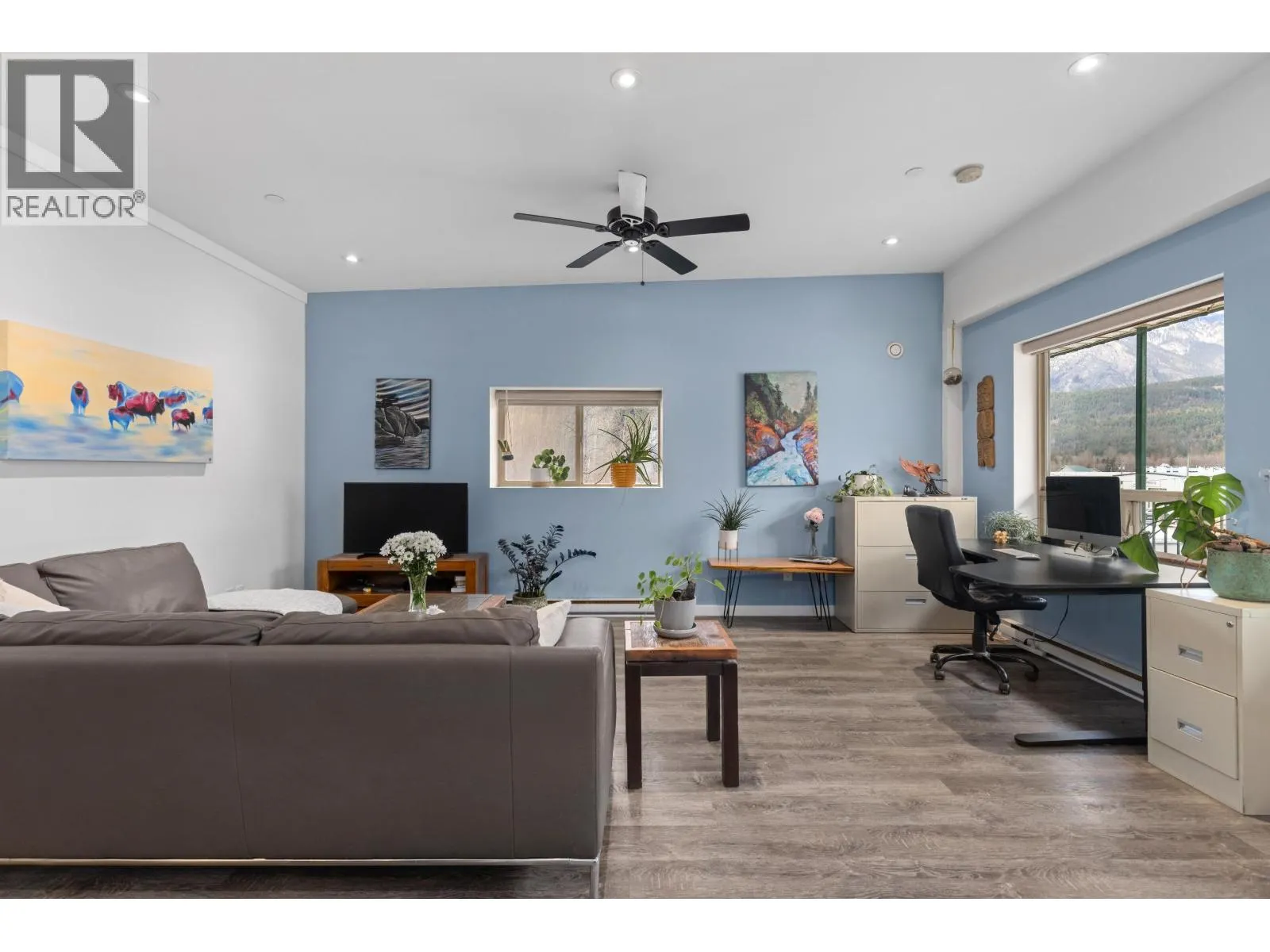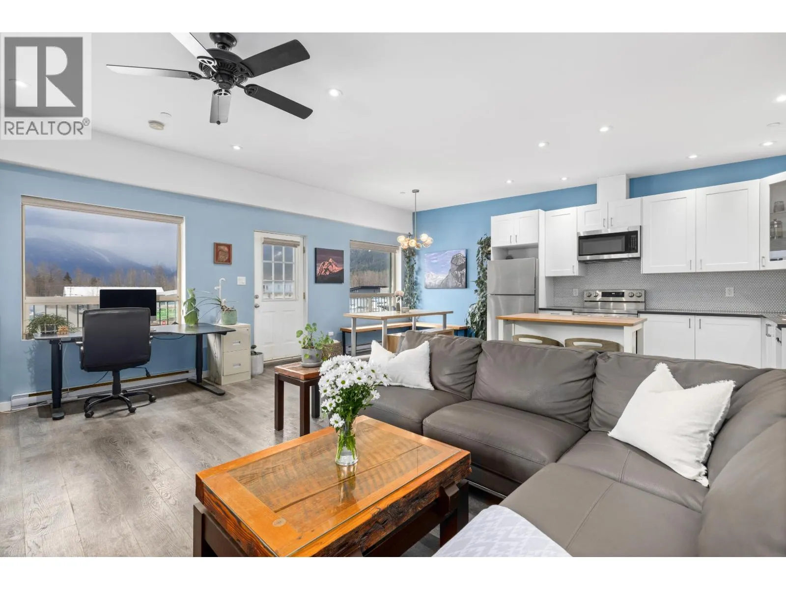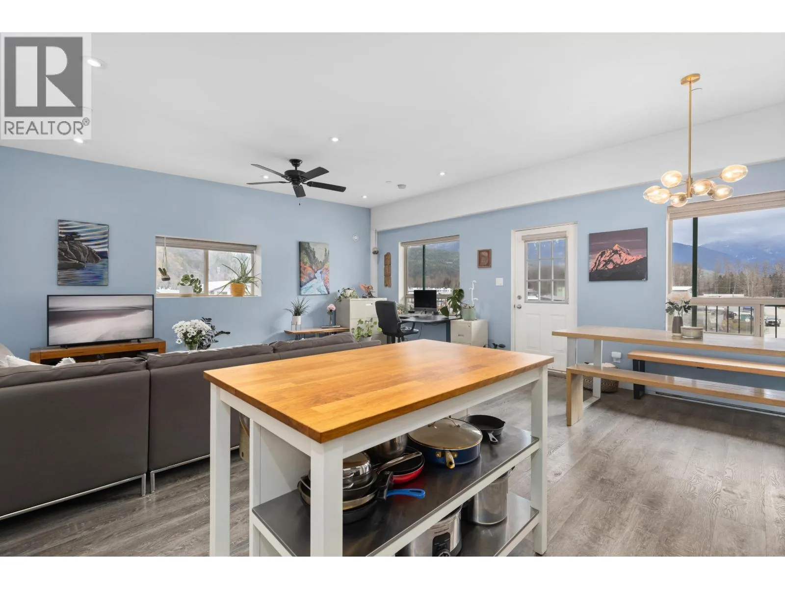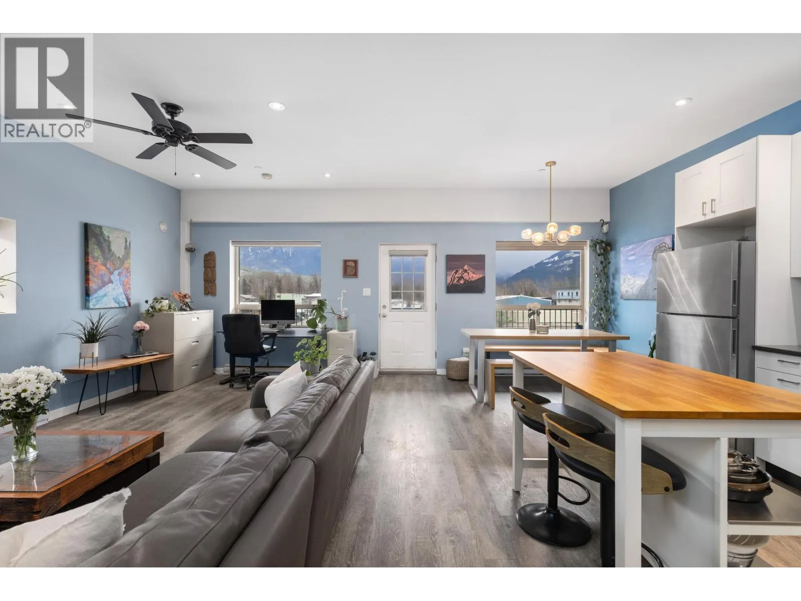 Rare mixed-use opportunity in Pemberton's Industrial Park. This bright end-unit features commercial/shop space on the lower level and a well-maintained 1 bedroom, 1 bathroom residential suite above. The upper-level living space offers an open layout, large bedroom, spacious utility/laundry room, and plenty of natural light. Below offers 907sq ft of commercial space that includes a bright open work area, washroom, generous ceiling height, a 16-foot bay door, 20ft ceiling height and 3-phase power. Flexible M-1 zoning supports a range of industrial and commercial uses, with residential living permitted above. (id:27476)