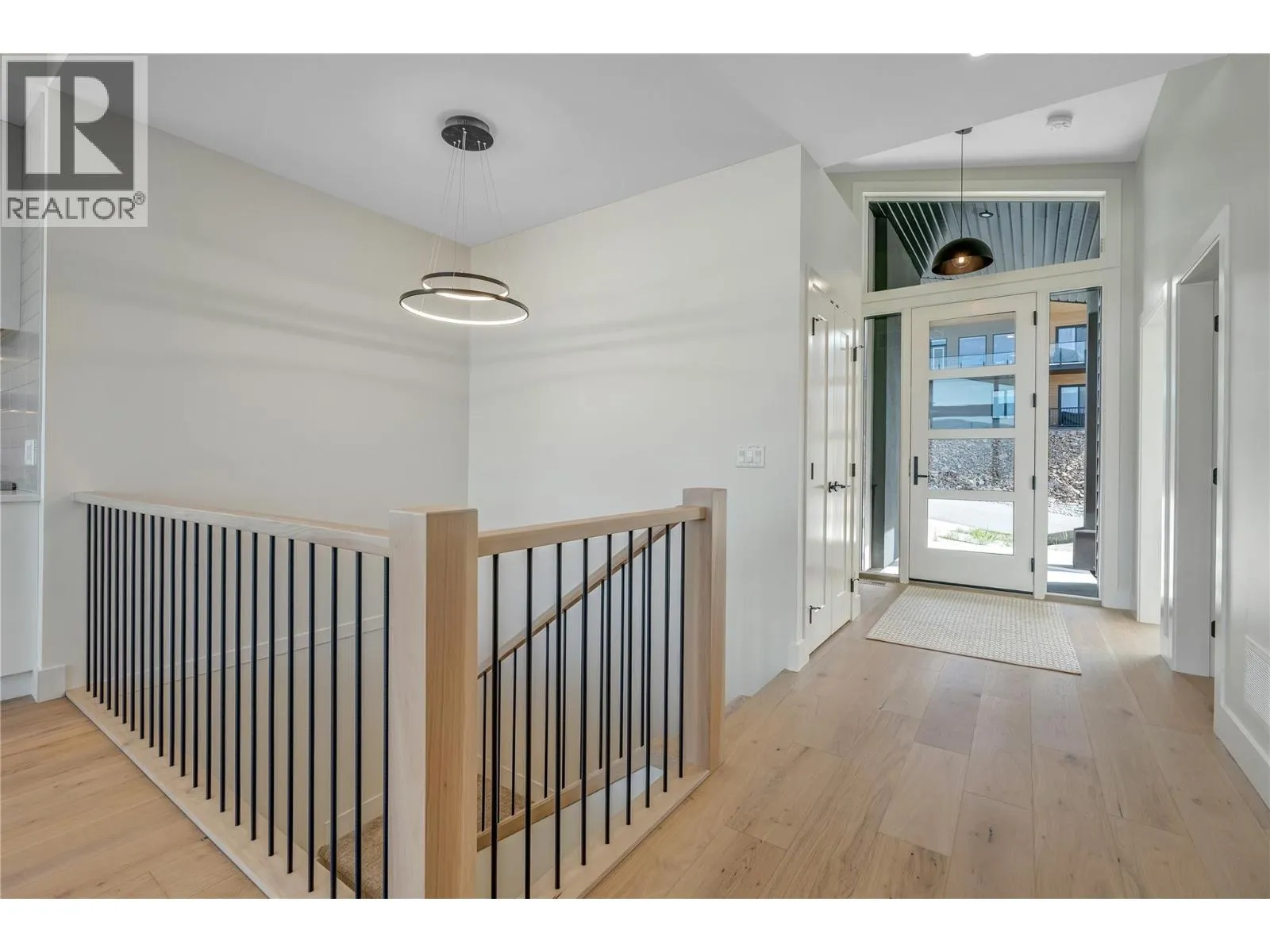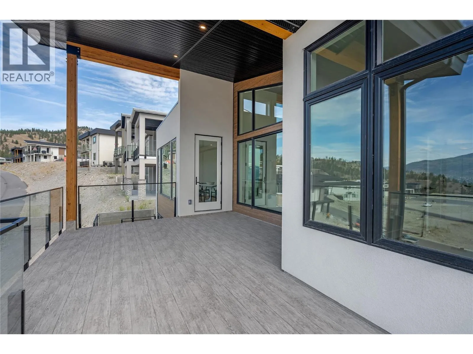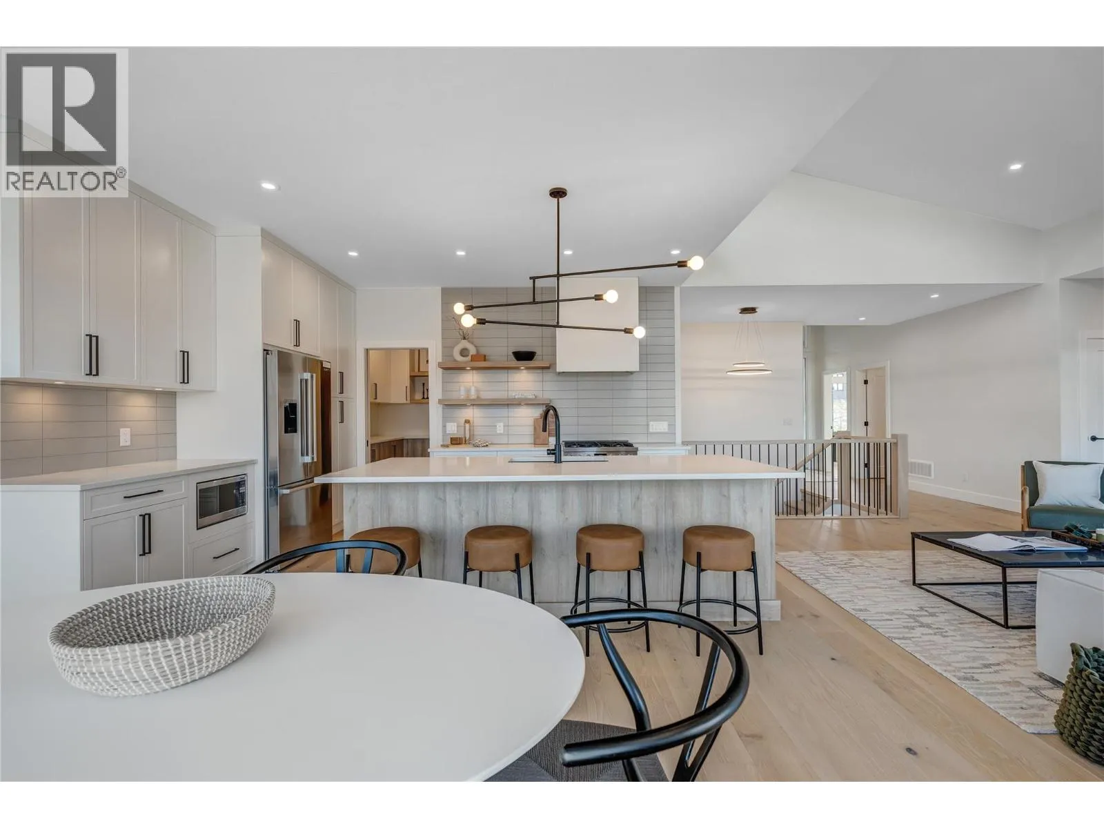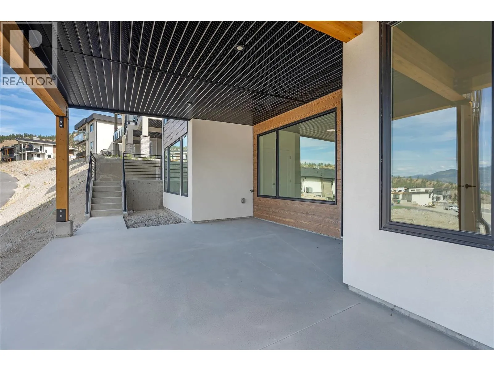 Luxurious family home with legal walk-out suite. Welcome to this stunning 2400+ square foot home in the highly sought-after The Ridge Penticton neighborhood. Blending modern design with functional living spaces, this home is perfect for families or those seeking rental income. The main house includes 3 bedrooms and 2 1/2 baths in a thoughtfully designed open-concept layout. The living area features beautiful white oak engineered hardwood flooring, while the ensuite bathroom features matte porcelain tile. The vaulted ceilings enhance the airy and spacious feel of the home. The kitchen is equipped with quartz countertops, custom cabinetry, and high-end Bosch appliances, including a gas range. For added convenience, the Samsung washer and dryer are located in a multifunctional mudroom/laundry room, which has private access from the 2-car garage. A fully carpeted staircase leads to the lower level, continuing into the hallway and one of the bedrooms. The legal walk-out basement suite offers 2 bedrooms and 1 bathroom, making it perfect for long or short-term rentals following the updated provincial legislation. The suite has laminate flooring in the main living area, a private entrance from the street with stair access, a spacious 200+ square foot covered patio and an in-suite laundry. Located in a peaceful neighborhood with access to local amenities, parks, and schools, this property also offers excellent rental potential with its legal suite. (id:27476)