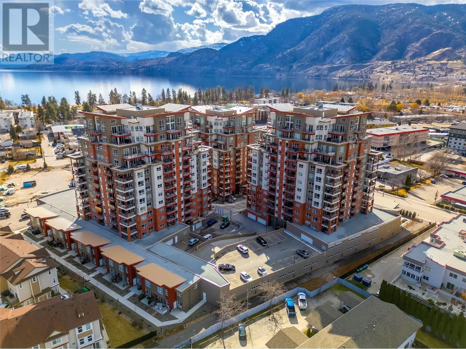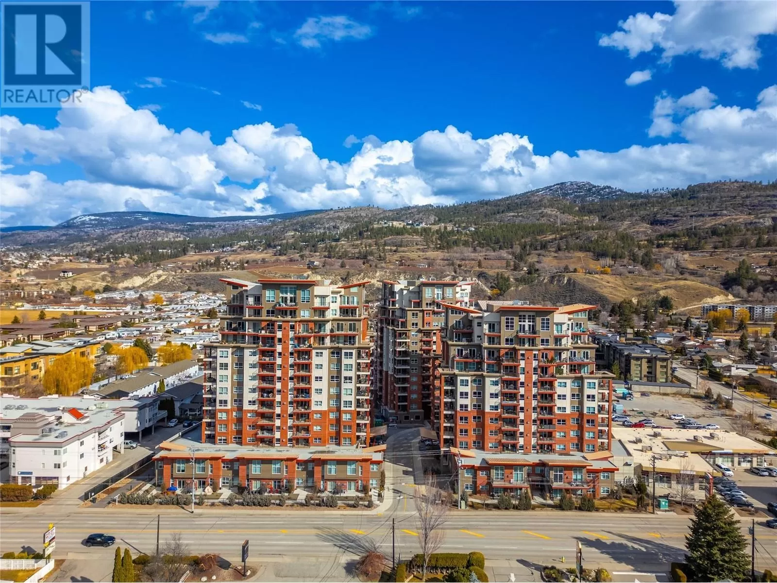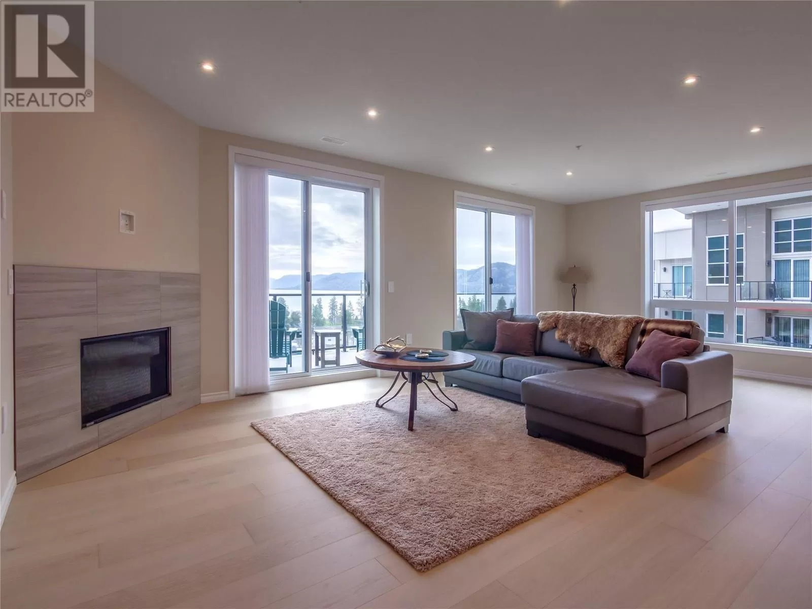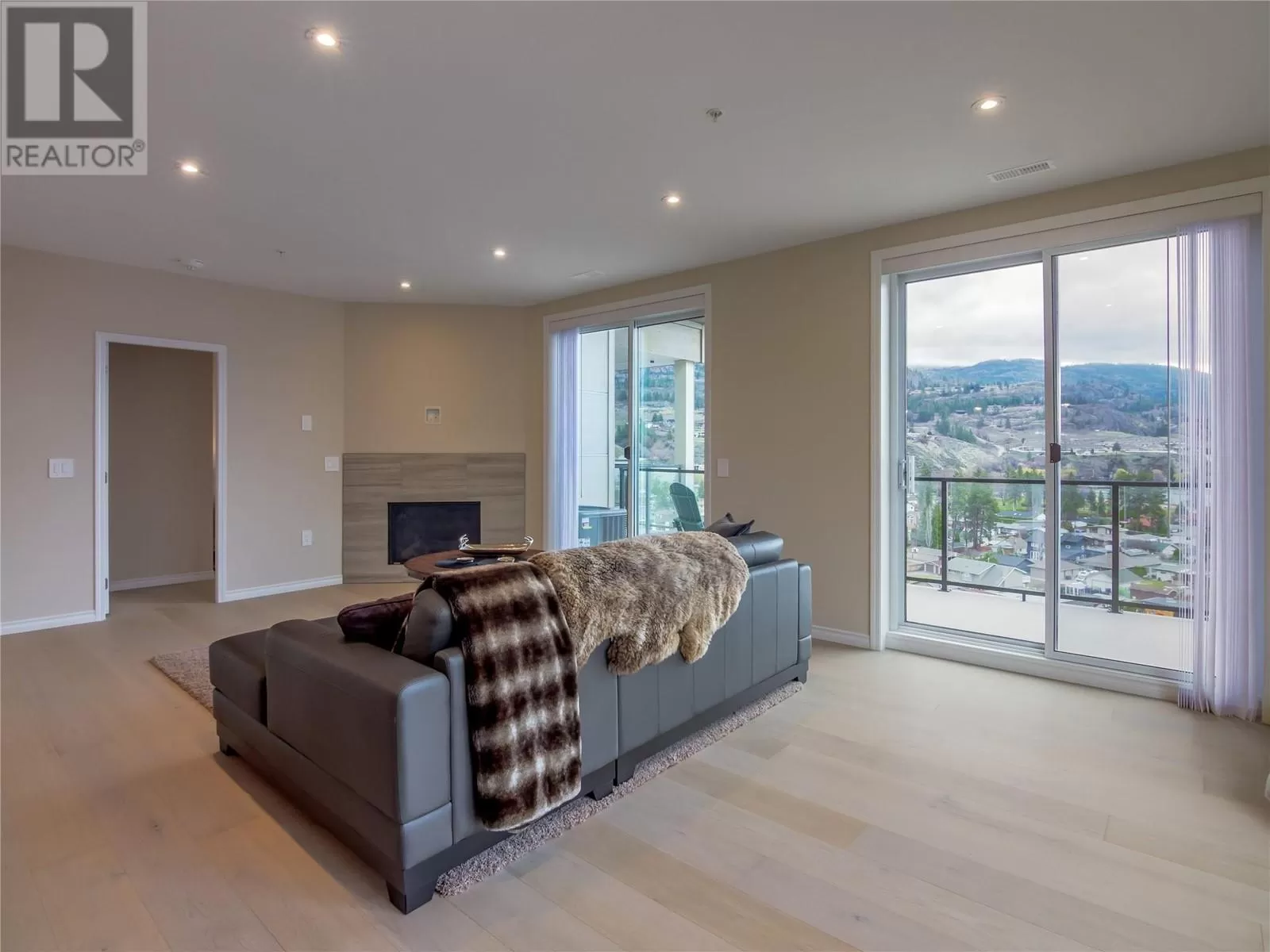 One of Skaha Lake Towers most prime units, a South West corner with unsurpassed lake views in Phase 3! This upgraded & customized unit is 1379sqft with 2 bedrooms 2 bathrooms + a den, with 2 gorgeous decks to enjoy the views from. The expansive open great room features engineered hardwood throughout, 2 sets of patio doors out to the huge South facing deck, a feature gas fireplace with modern tile, 9â ceilings & a layout that offers great flexible options for furniture. This upgraded kitchen has sleek wood cabinets to the ceiling, is an extended size adding more cabinets & a built in microwave, has expansive counter space with a stunning huge peninsula to entertain at, quartz counters, & stainless steel appliances top it off. The customisations continue in the primary bathroom with a custom tile shower, hardwood floors run throughout all the rooms including the spacious guest bedroom & the dedicated den/home office. The primary bedroom enjoys its own deck, ensuite with double sinks & a walk in closet. This energy efficient unit has a gas hot water on demand unit, forced air heat & central AC. The suite has a storage unit on the same floor, a secure parkade parking spot, + the building has a dedicated bike locker room, common rec room & patio, & more. Enjoy living a short stroll to Skaha Lake with its gorgeous beach, parks, & walking paths. Plus enjoy conveniences nearby like Kojo sushi, the bakery and pizza shop, spinco, the Dragon Boat pub and more. This one is a must see! (id:27476)