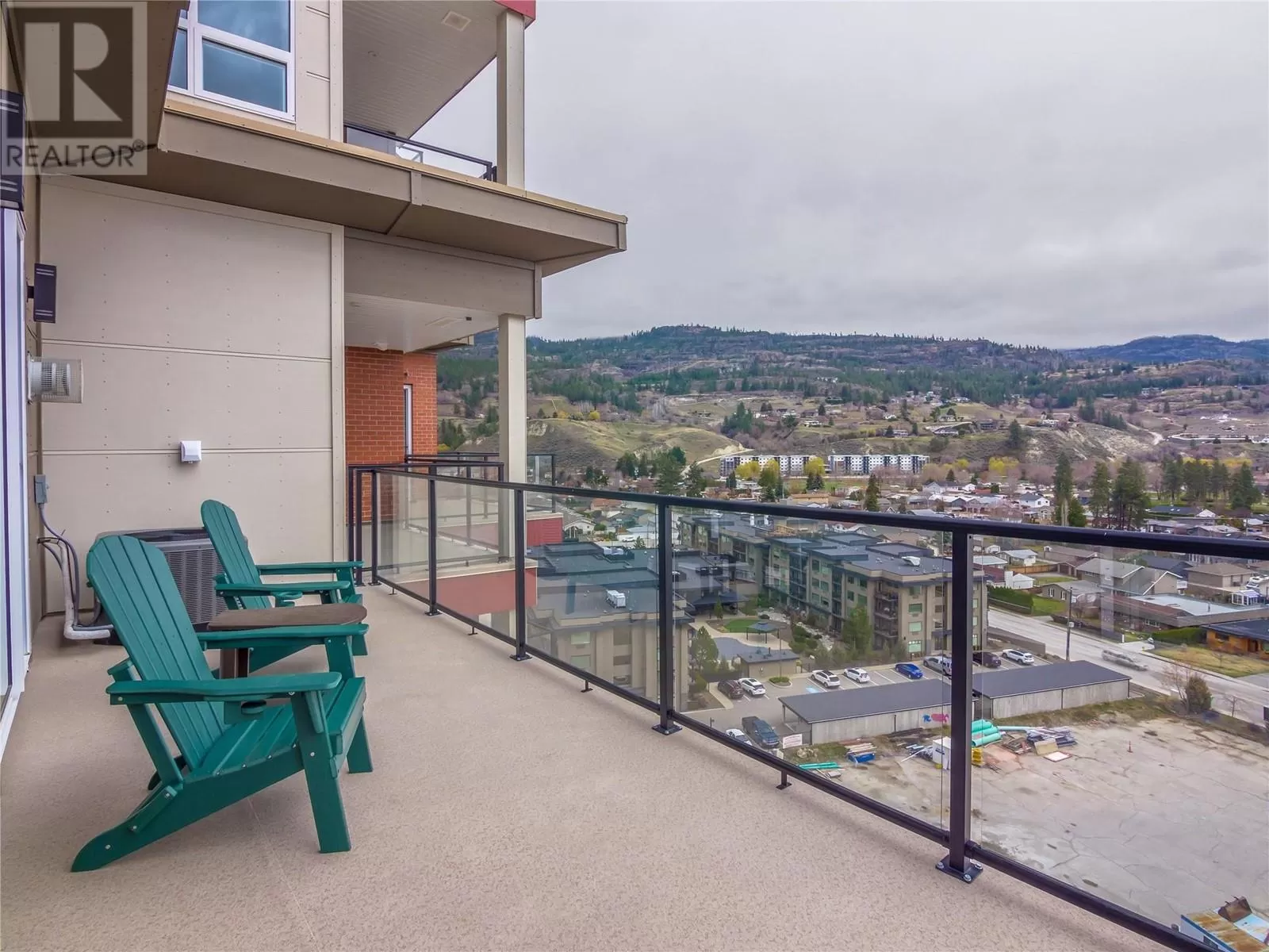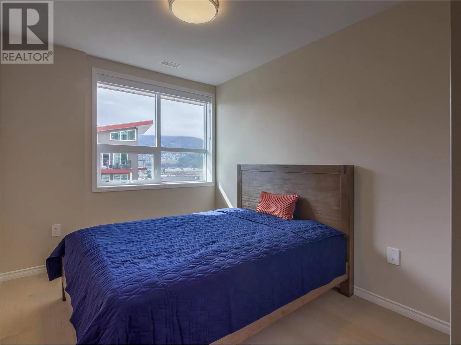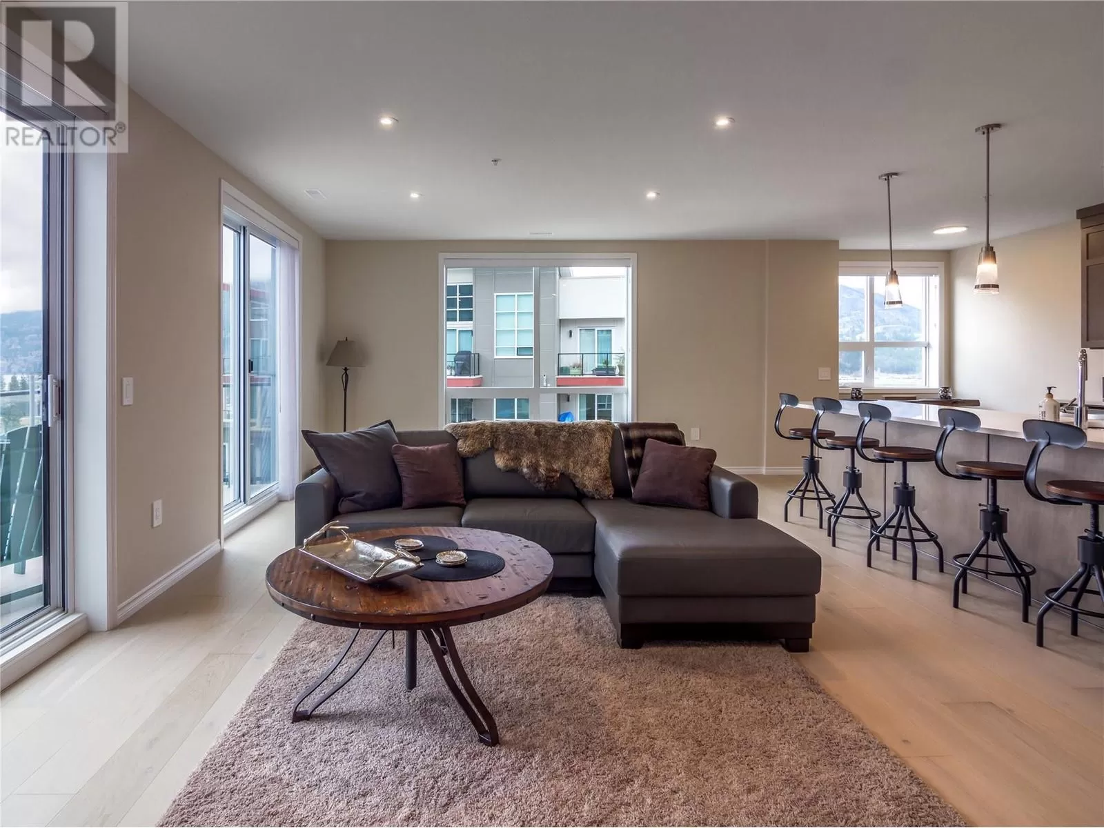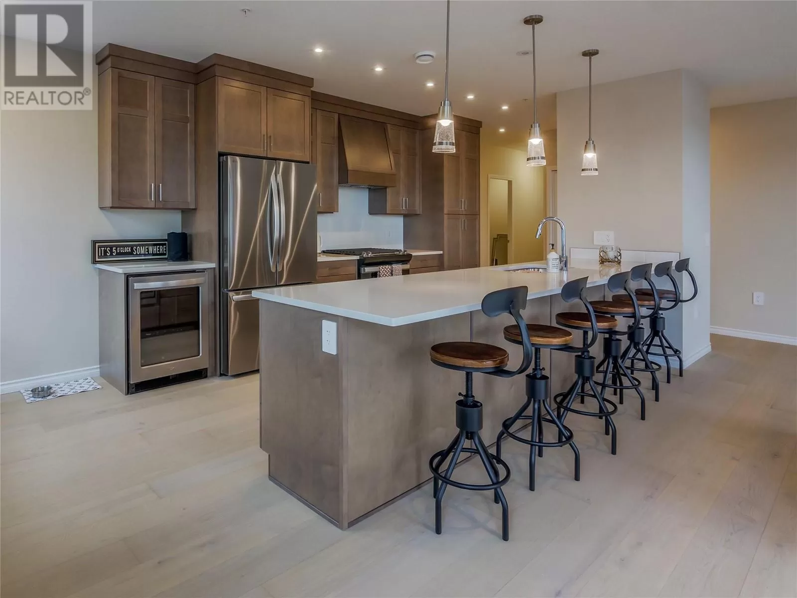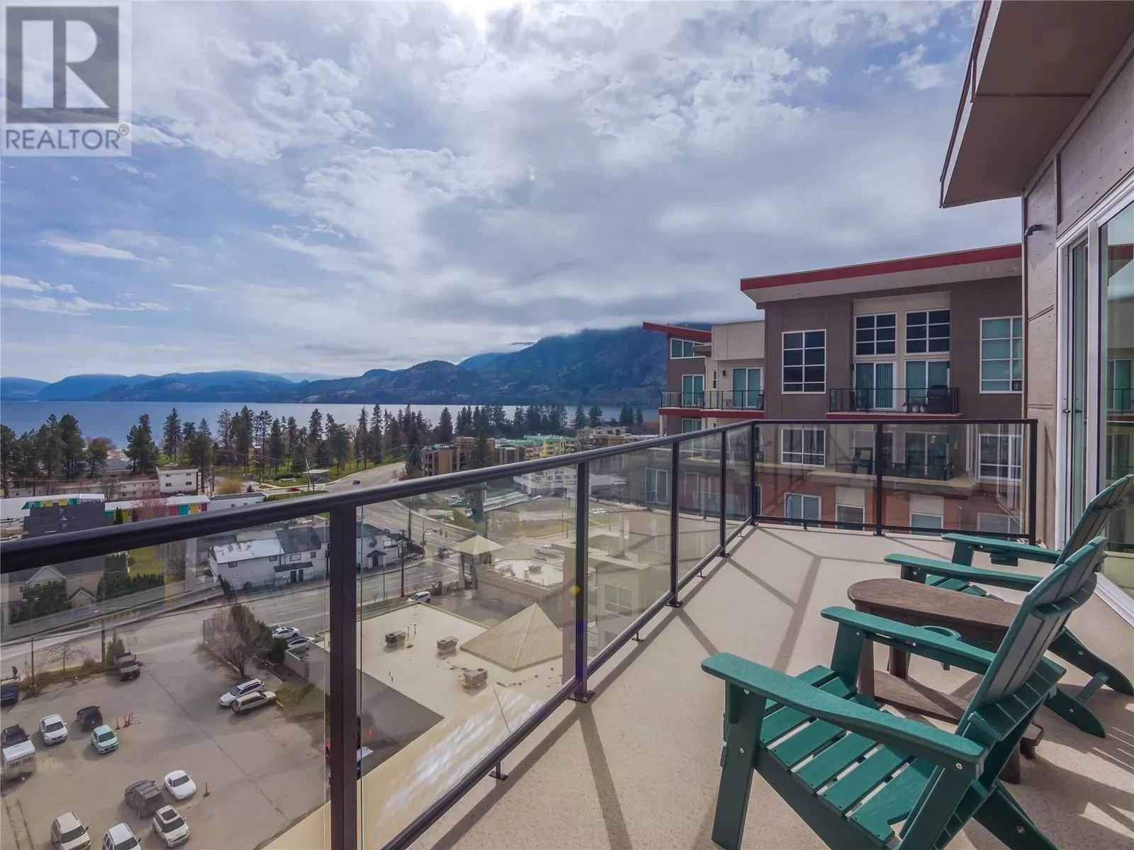 One of Skaha Lake Towers most prime units, a South West corner with unsurpassed lake views in Phase 3! This upgraded & customized unit is 1379sqft with 2 bedrooms 2 bathrooms + a den, with 2 gorgeous decks to enjoy the views from. The expansive open great room features engineered hardwood throughout, 2 sets of patio doors out to the huge South facing deck, a feature gas fireplace with modern tile, 9â ceilings & a layout that offers great flexible options for furniture. This upgraded kitchen has sleek wood cabinets to the ceiling, is an extended size adding more cabinets & a built in microwave, has expansive counter space with a stunning huge peninsula to entertain at, quartz counters, & stainless steel appliances top it off. The customisations continue in the primary bathroom with a custom tile shower, hardwood floors run throughout all the rooms including the spacious guest bedroom & the dedicated den/home office. The primary bedroom enjoys its own deck, ensuite with double sinks & a walk in closet. This energy efficient unit has a gas hot water on demand unit, forced air heat & central AC. The suite has a storage unit on the same floor, a secure parkade parking spot, + the building has a dedicated bike locker room, common rec room & patio, & more. Enjoy living a short stroll to Skaha Lake with its gorgeous beach, parks, & walking paths. Plus enjoy conveniences nearby like Kojo sushi, the bakery and pizza shop, spinco, the Dragon Boat pub and more. This one is a must see! (id:27476)