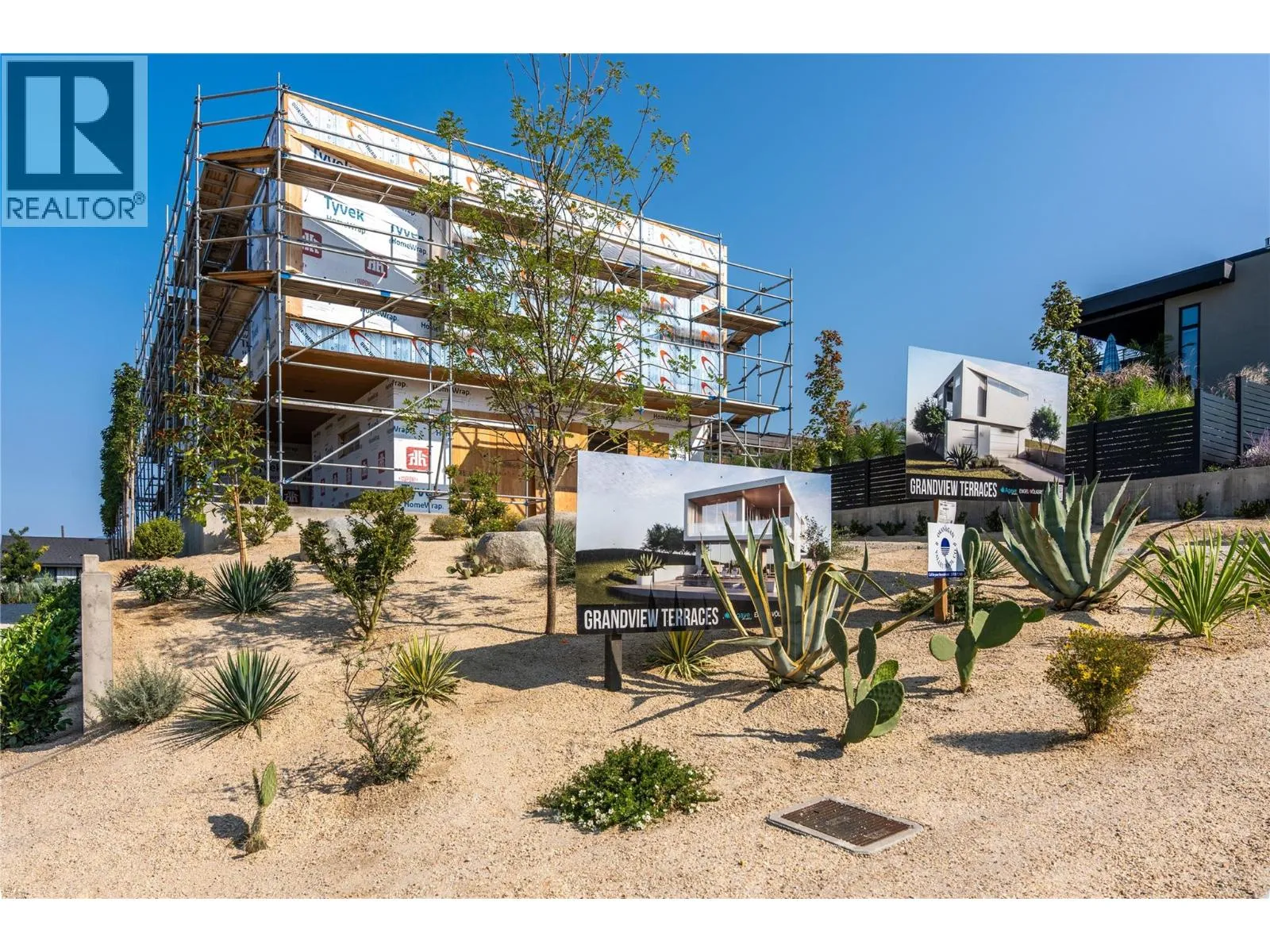 Welcome to Grandview Terraces, a premier luxury development by Agave Homes. This future California Modern residence is ideally situated in a serene, elevated setting, steps away from the scenic KVR trail and within walking distance of downtown Pentictonâs vibrant restaurants, craft breweries, Okanagan Lake, the marina, and the popular weekly Farmerâs Market. Beautiful low-maintenance landscaping and a gated, intimate side courtyard entry welcome you into the home. The innovative reverse floor plan maximizes spectacular lake and mountain views from the expansive deck, main living area, and kitchen - all conveniently accessible by elevator. The private patio off the primary suite is engineered for a hot tub, offering a perfect retreat for quiet evenings. Designed for effortless entertaining, the bright, open-concept kitchen features custom cabinetry, a quartz waterfall island, high-end integrated appliances, and a concealed walk-in pantry. A temperature-controlled wine cellar keeps your collection at its best, while the outdoor kitchen and saltwater fiberglass pool extend the living space, embodying the best of Okanagan indoor-outdoor living. Purchase price exclusive of GST. Measurements approx - based on architect's renderings. Call your Realtor®; or the listing agent today for more information about this beautiful build from Agave Homes! (id:27476)
