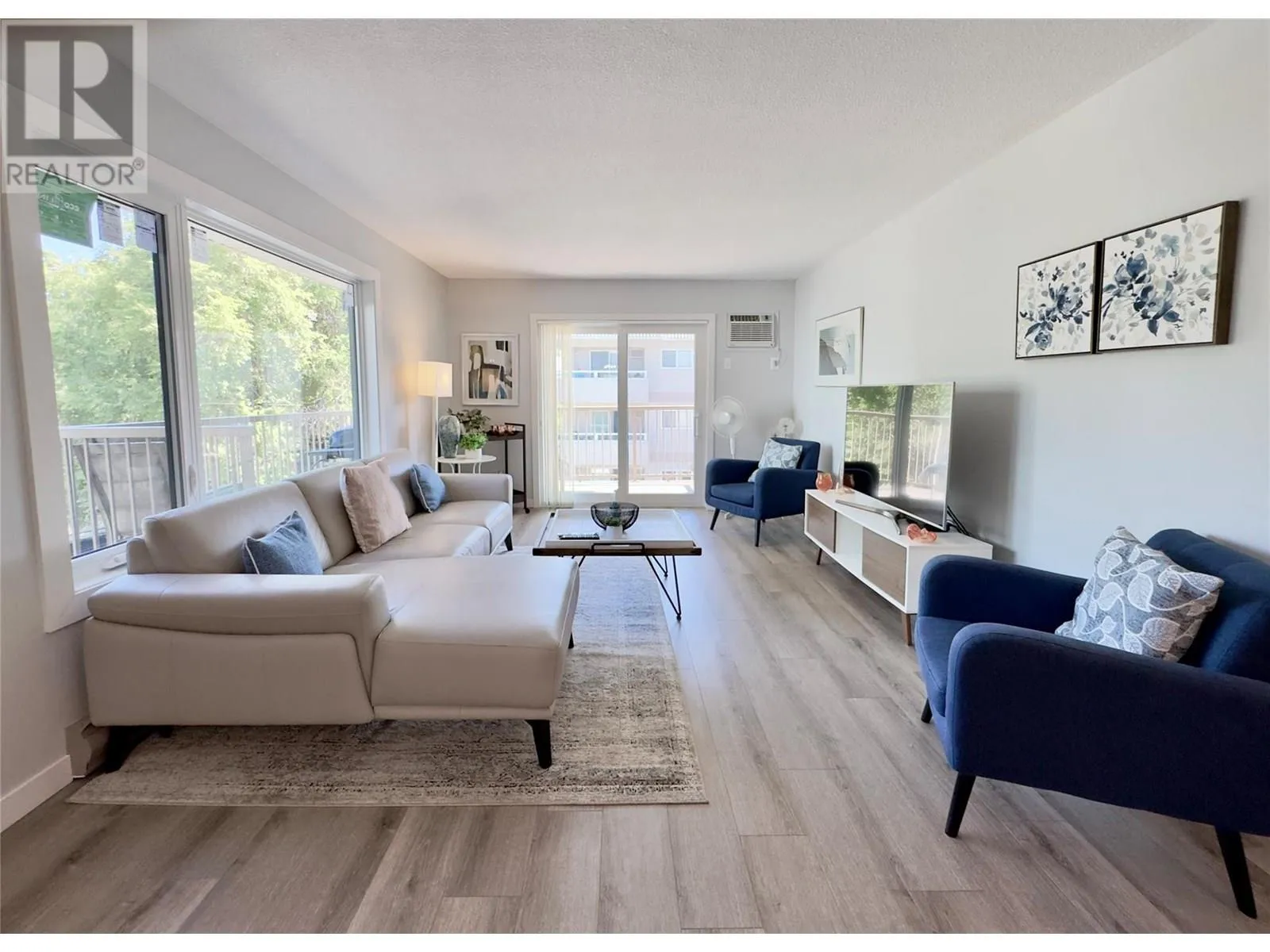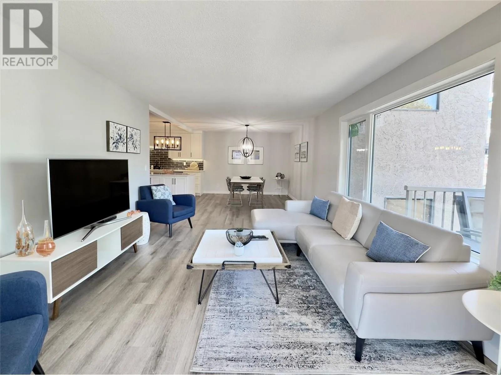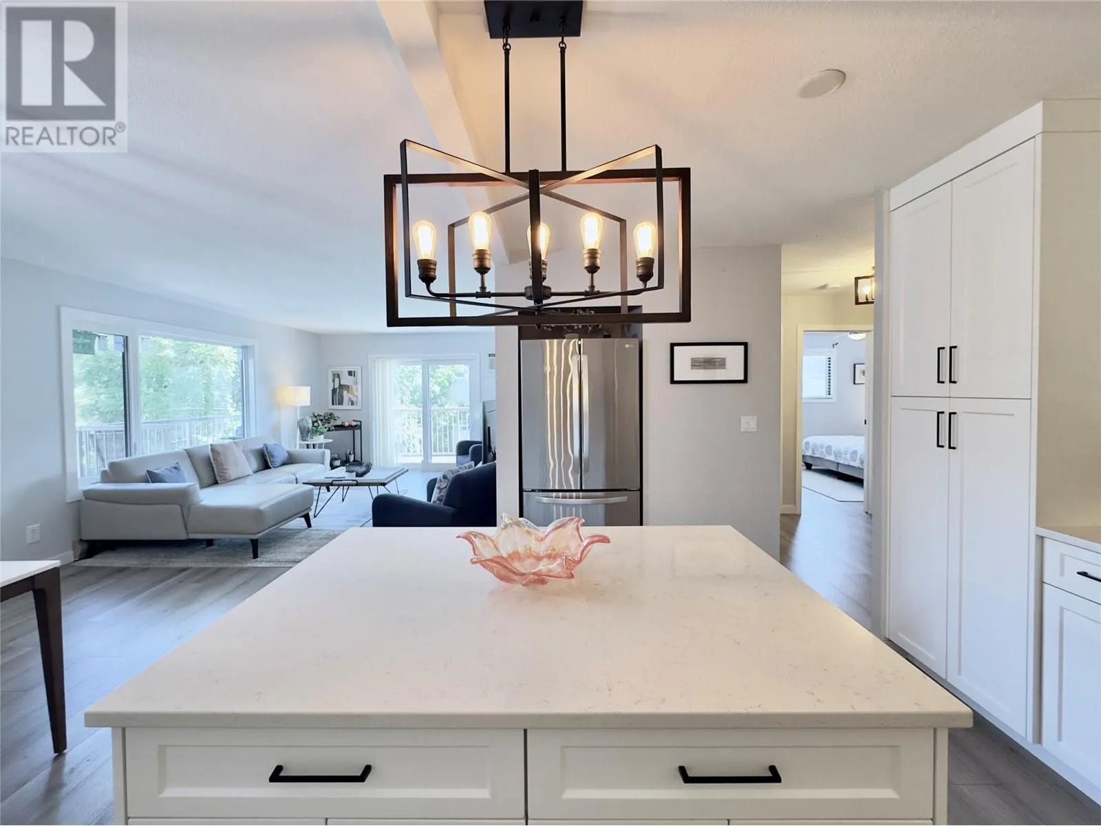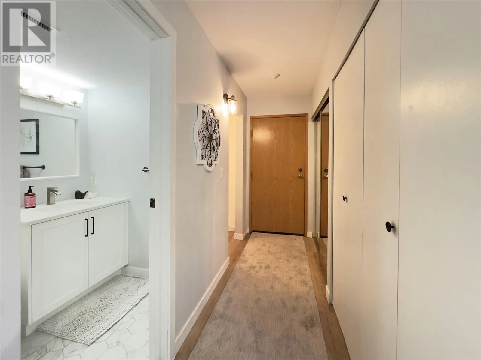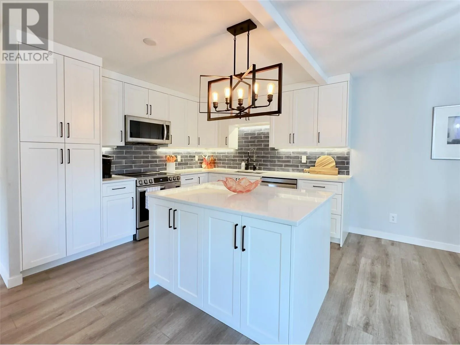 #203 â 84 Van Horne Street | Renovated Downtown Penticton Condo! Step into style and comfort with this beautifully renovated 2-bedroom, 2-bathroom condo located in the heart of downtown Pentictonâjust one block from Okanagan Lake and steps to restaurants, cafes, breweries, the KVR Trail, and the famous farmers market. This southeast-facing corner unit has been substantially updated throughout, featuring all-new flooring, fresh paint, a brand-new hot water tank, and a fully renovated kitchen with quartz countertops, white shaker-style cabinetry, under-cabinet lighting, a large island, and all new stainless steel appliances. Both bathrooms have been tastefully renovated, and the unit also offers in-suite laundry and a bonus office/storage space. The open-concept living area is filled with natural light thanks to the new window and sliding door, which lead to a wrap-around covered balconyâperfect for enjoying morning sun and views. Hallmark Manor is a well-maintained and secure 55+ complex, ideally situated in one of Pentictonâs most walkable neighborhoods. The building features secure underground parking, a recreation room, and a storage locker room with a workshop area. Small pets are allowed with strata approval. Rentals permitted with restrictions. Whether you're looking for a full-time home, a vacation getaway, or a low-maintenance investment, this condo checks all the boxes. Move-in ready and close to everything Penticton has to offer! (id:27476)