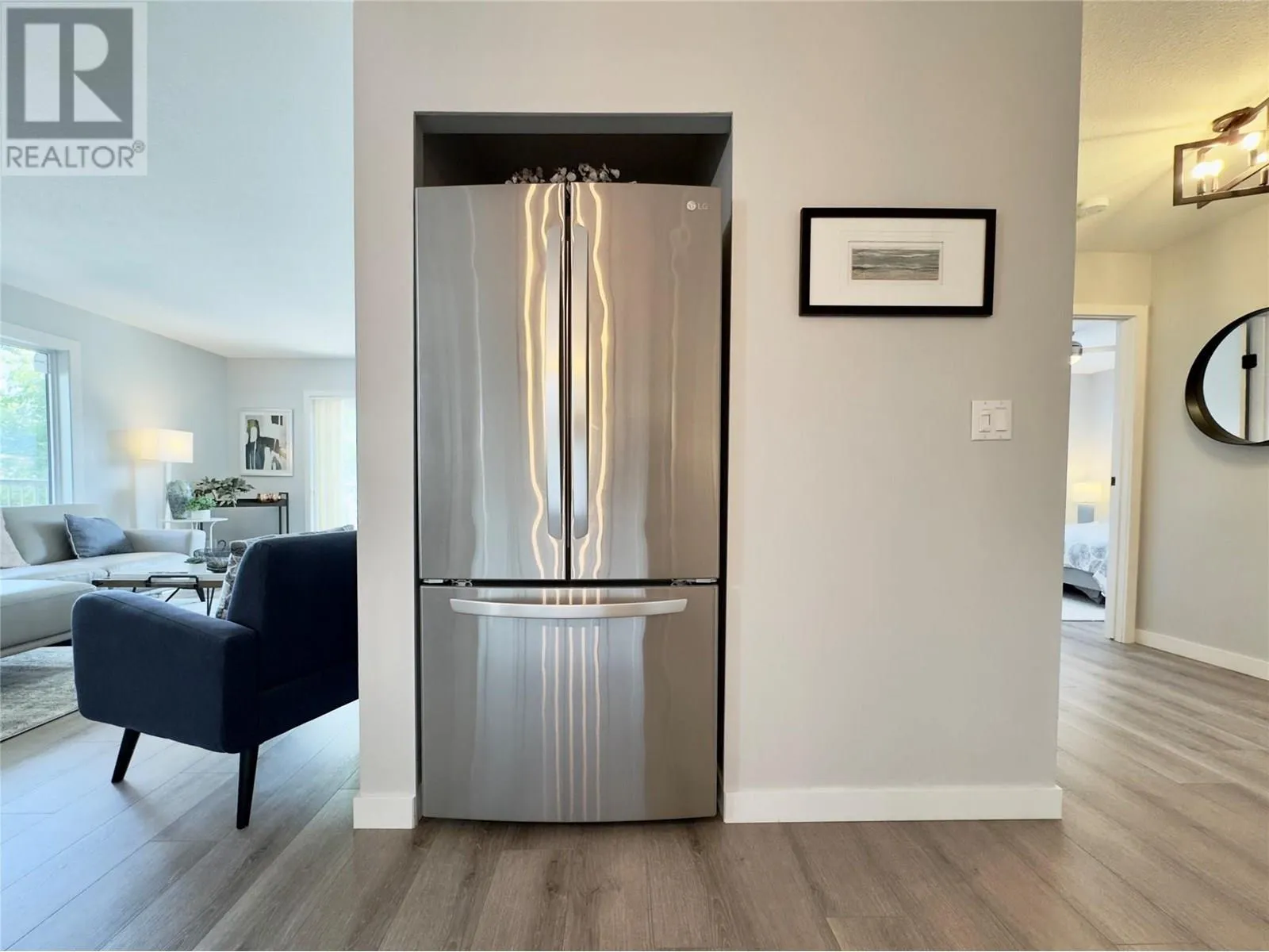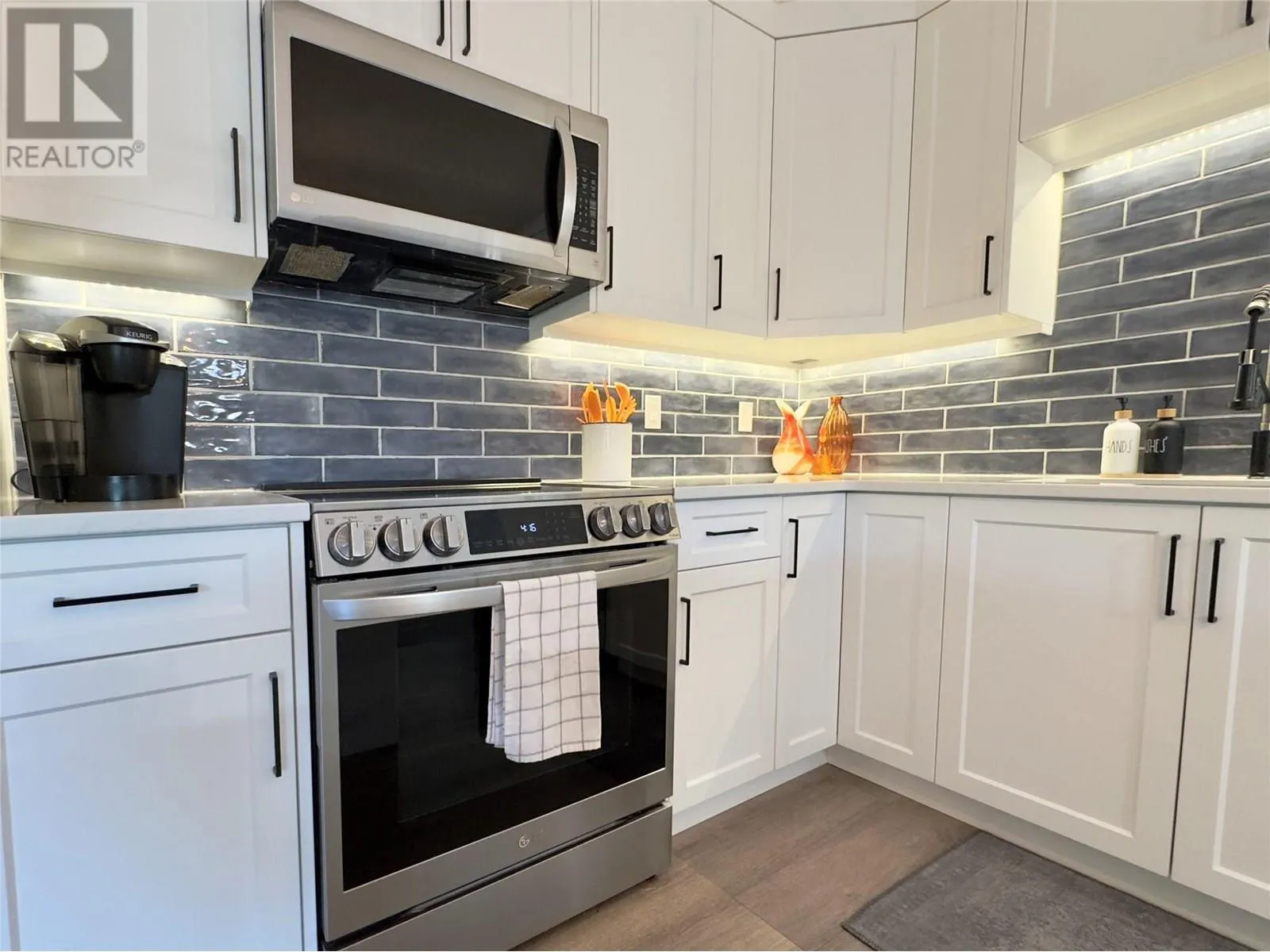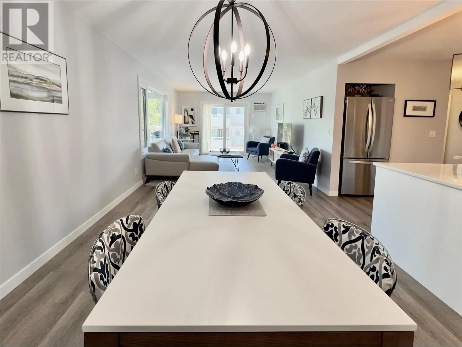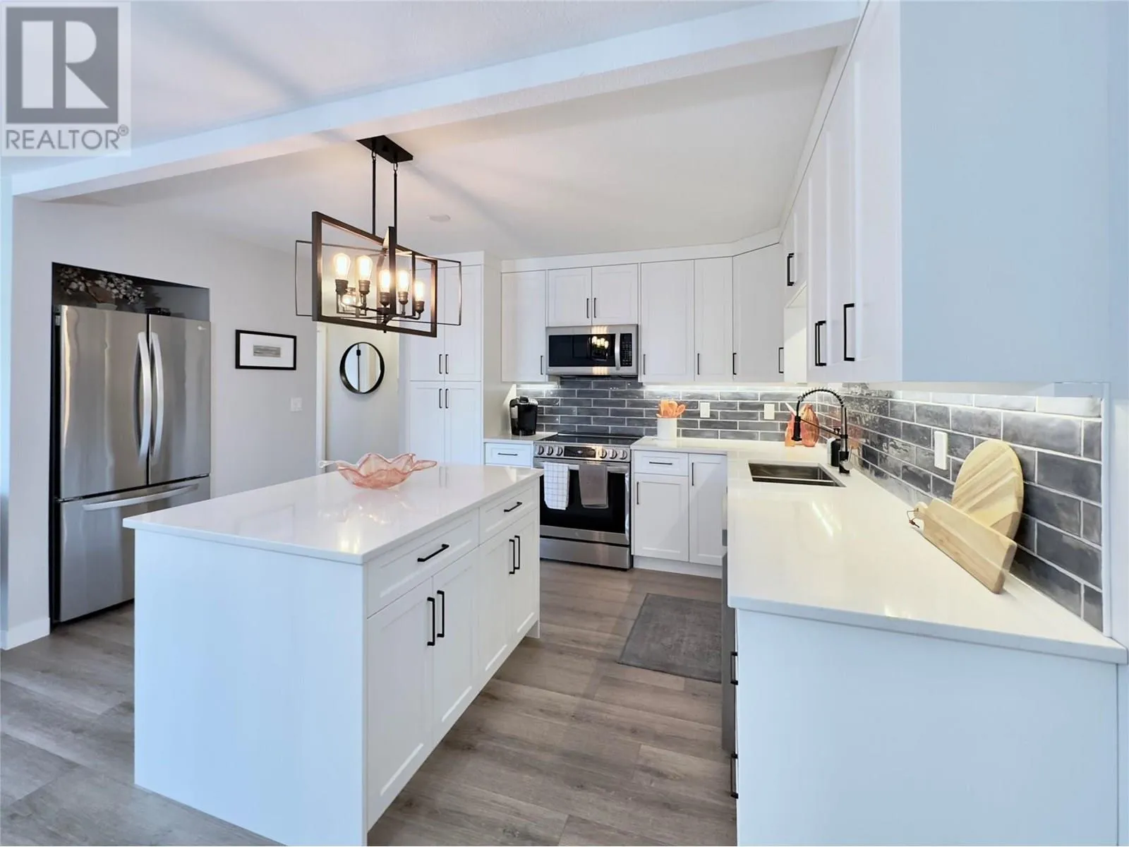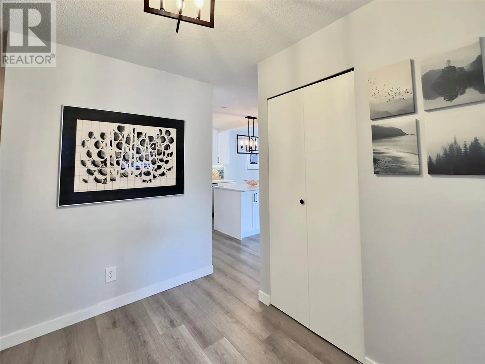 #203 â 84 Van Horne Street | Renovated Downtown Penticton Condo! Step into style and comfort with this beautifully renovated 2-bedroom, 2-bathroom condo located in the heart of downtown Pentictonâjust one block from Okanagan Lake and steps to restaurants, cafes, breweries, the KVR Trail, and the famous farmers market. This southeast-facing corner unit has been substantially updated throughout, featuring all-new flooring, fresh paint, a brand-new hot water tank, and a fully renovated kitchen with quartz countertops, white shaker-style cabinetry, under-cabinet lighting, a large island, and all new stainless steel appliances. Both bathrooms have been tastefully renovated, and the unit also offers in-suite laundry and a bonus office/storage space. The open-concept living area is filled with natural light thanks to the new window and sliding door, which lead to a wrap-around covered balconyâperfect for enjoying morning sun and views. Hallmark Manor is a well-maintained and secure 55+ complex, ideally situated in one of Pentictonâs most walkable neighborhoods. The building features secure underground parking, a recreation room, and a storage locker room with a workshop area. Small pets are allowed with strata approval. Rentals permitted with restrictions. Whether you're looking for a full-time home, a vacation getaway, or a low-maintenance investment, this condo checks all the boxes. Move-in ready and close to everything Penticton has to offer! (id:27476)