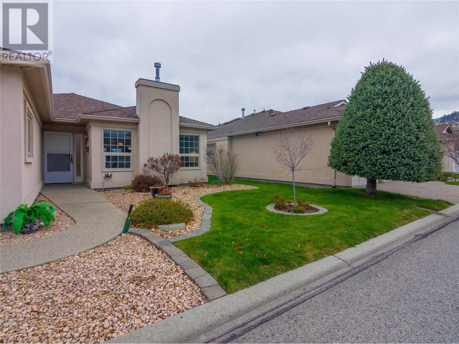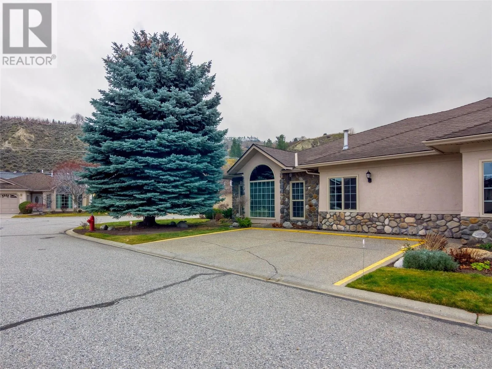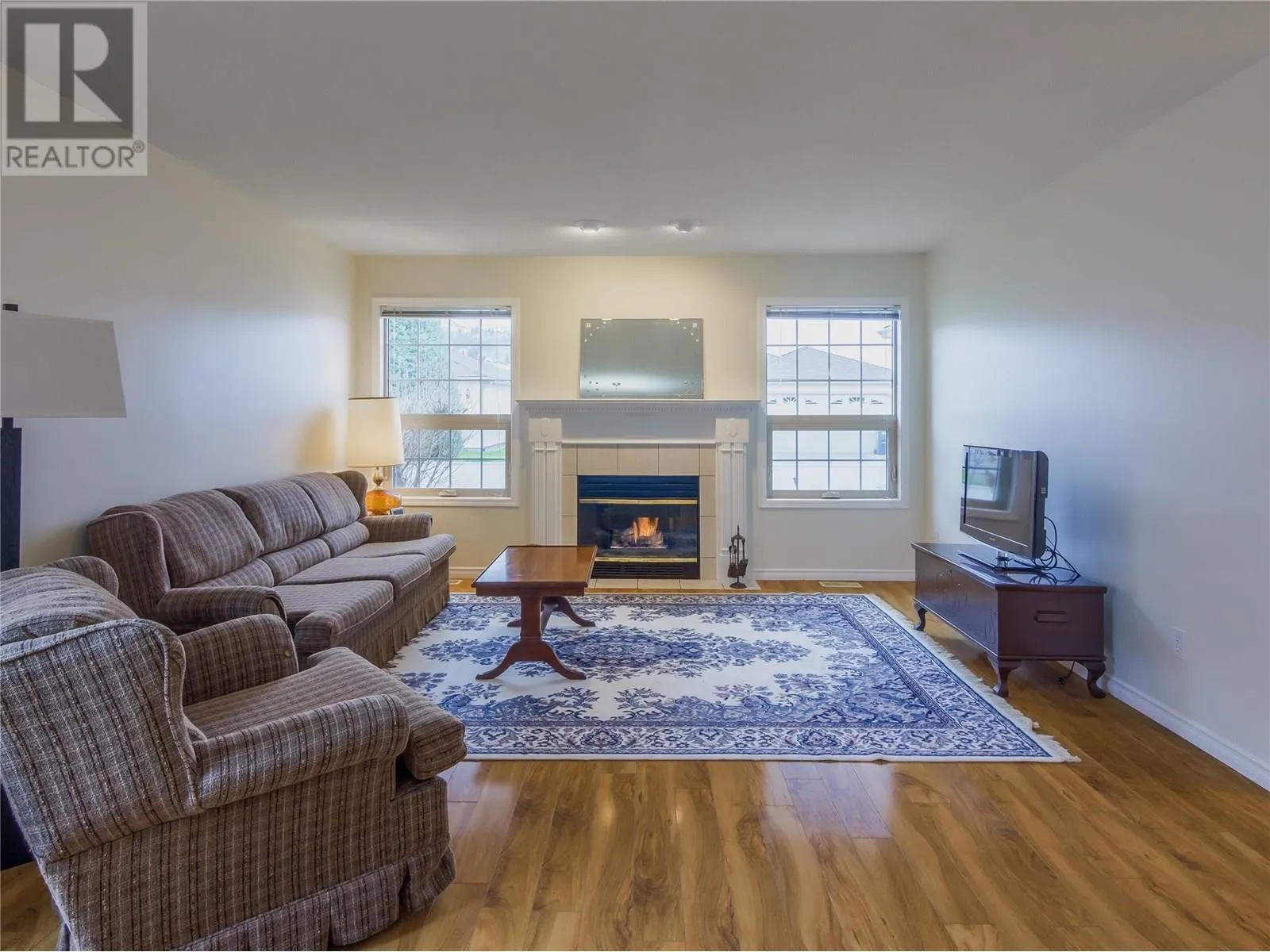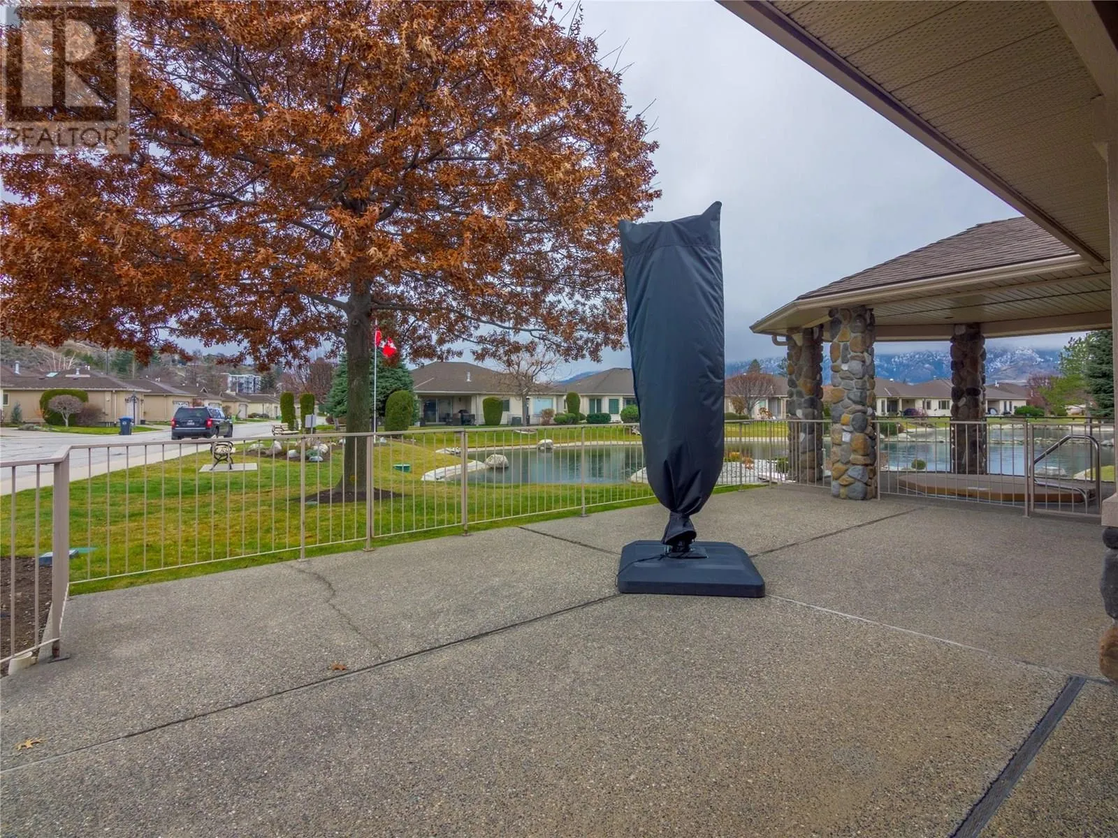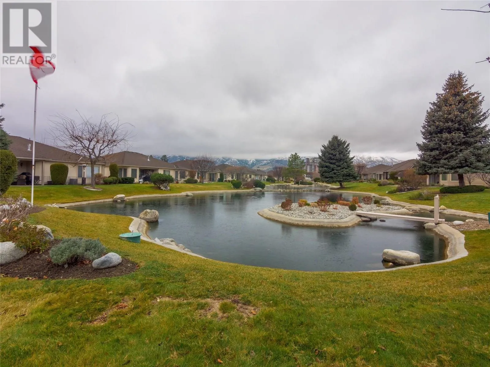 Welcome to Sandbridge, a coveted gated community with stunning waterways and landscaping, beautiful club house with a pool, and a premium location near Skaha Lake and the seniors center. This lovely 1307sqft rancher style home is move in ready. As you enter the front foyer to your right is the large laundry room with extra storage space and garage access, a large closet and welcoming space. The well appointed living and dining room features easy care laminate floors, a gas fireplace, tons of windows and natural light and room for all your furniture. This home has had the kitchen redone and a window opened up between the spaces creating a more modern layout, more natural light and a great space for entertaining. There are beautiful shaker style cabinets in a warm wood with contrasting counters and stainless steel appliances. The kitchen has space for a table or island or more cabinets, and it opens to the very private back North facing patio with no homes looking back at it. There is a large guest bedroom and bathroom and a very spacious primary suite with walk in closet and large ensuite bathroom. The main areas have been freshly painted, and the poly b has been removed from the home, just move in and enjoy this lovely home in a friendly and well run complex. A short walk will take you to shops, trails, walkways, the beach and parks, a pub, and so much more. (id:27476)