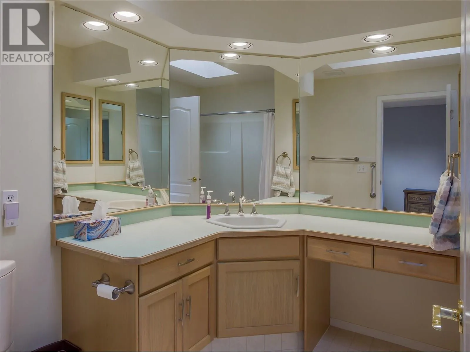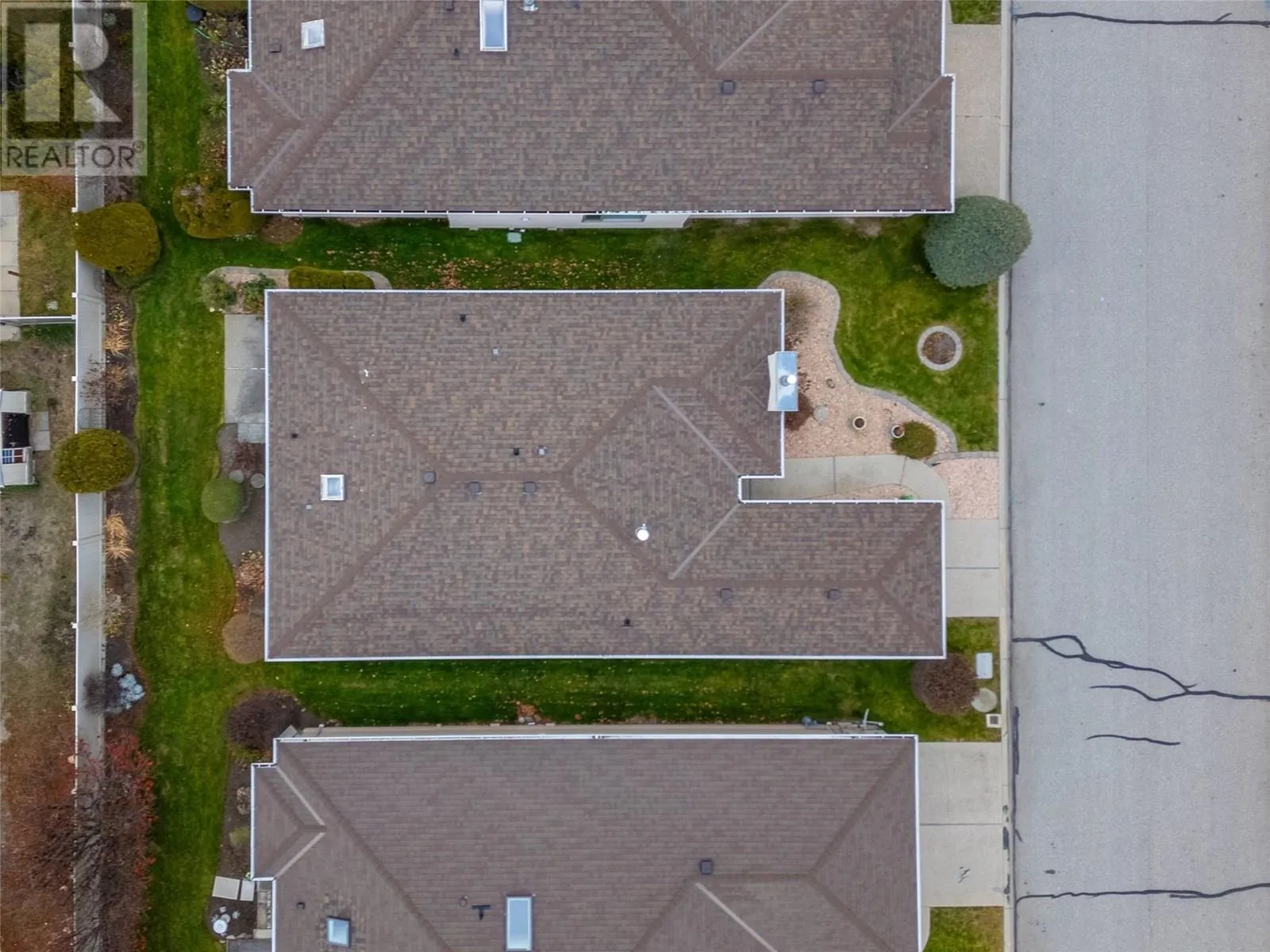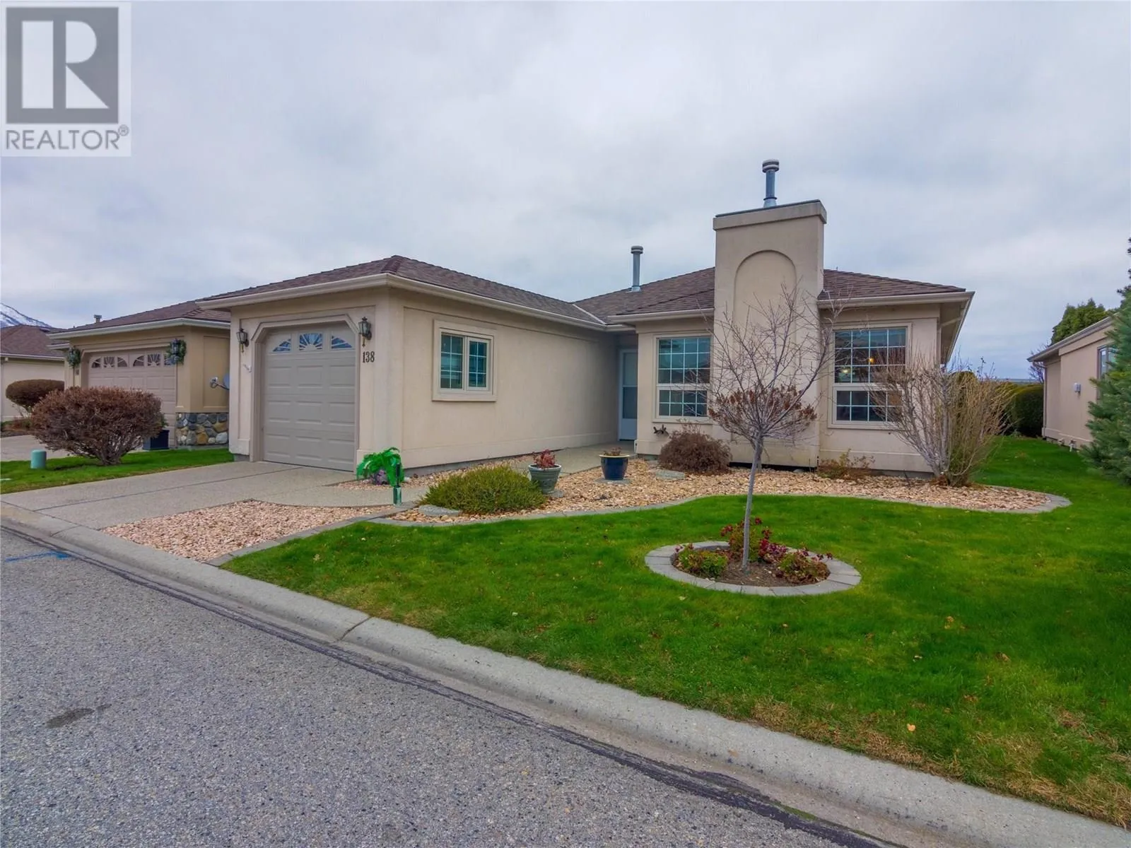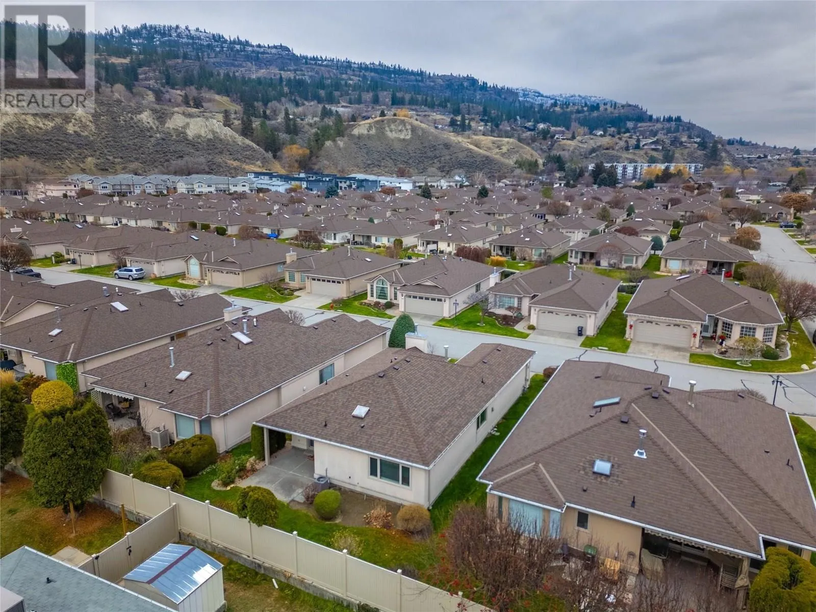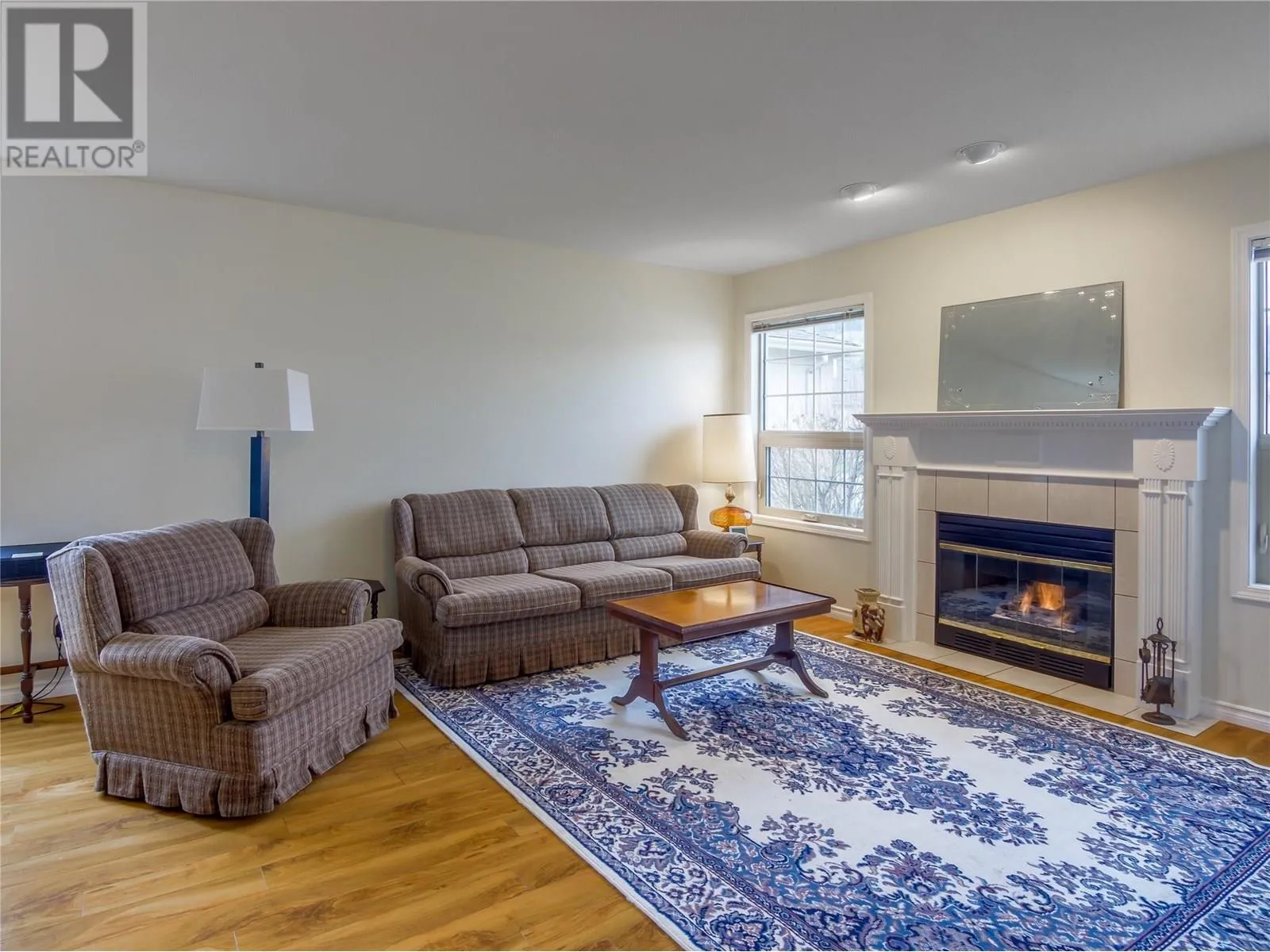 Welcome to Sandbridge, a coveted gated community with stunning waterways and landscaping, beautiful club house with a pool, and a premium location near Skaha Lake and the seniors center. This lovely 1307sqft rancher style home is move in ready. As you enter the front foyer to your right is the large laundry room with extra storage space and garage access, a large closet and welcoming space. The well appointed living and dining room features easy care laminate floors, a gas fireplace, tons of windows and natural light and room for all your furniture. This home has had the kitchen redone and a window opened up between the spaces creating a more modern layout, more natural light and a great space for entertaining. There are beautiful shaker style cabinets in a warm wood with contrasting counters and stainless steel appliances. The kitchen has space for a table or island or more cabinets, and it opens to the very private back North facing patio with no homes looking back at it. There is a large guest bedroom and bathroom and a very spacious primary suite with walk in closet and large ensuite bathroom. The main areas have been freshly painted, and the poly b has been removed from the home, just move in and enjoy this lovely home in a friendly and well run complex. A short walk will take you to shops, trails, walkways, the beach and parks, a pub, and so much more. (id:27476)