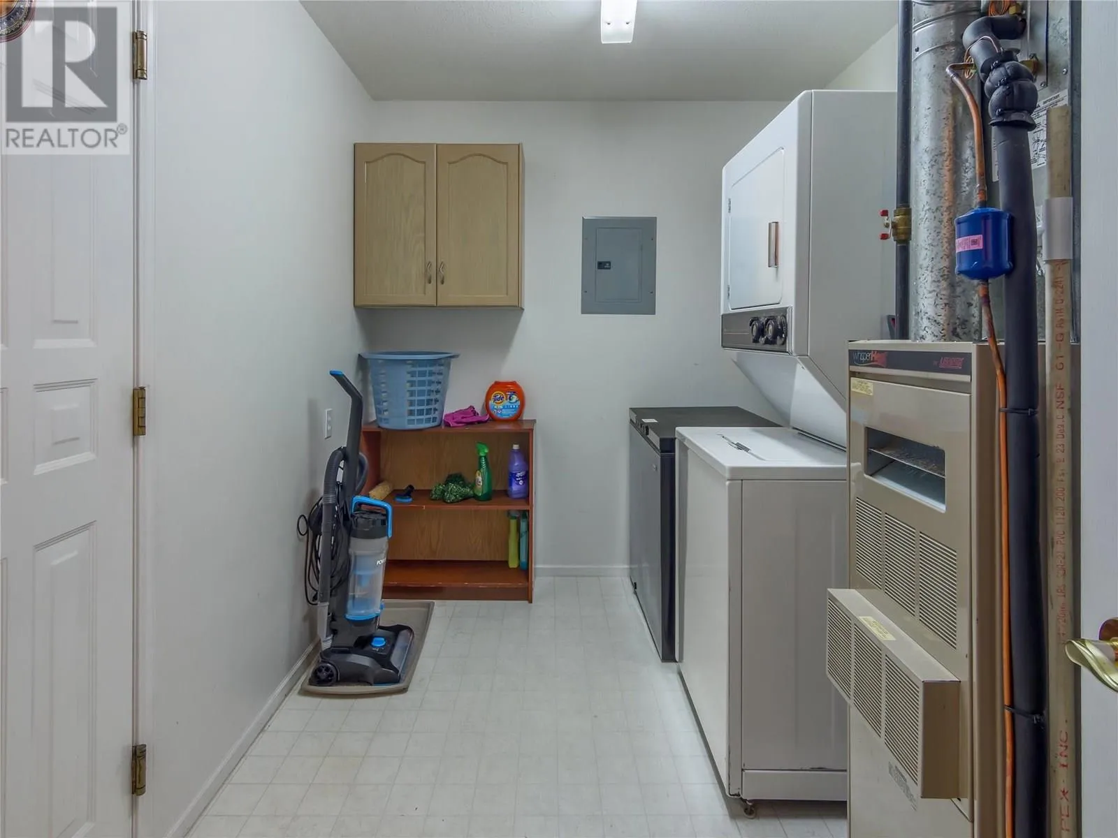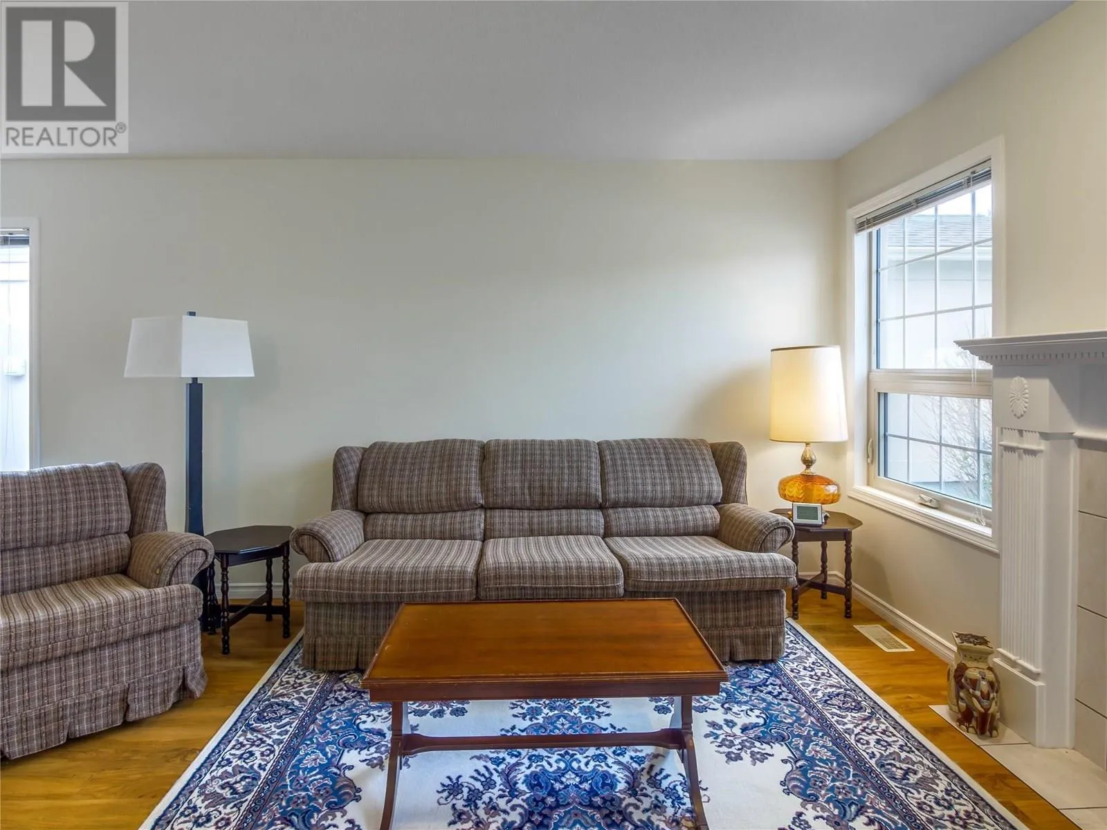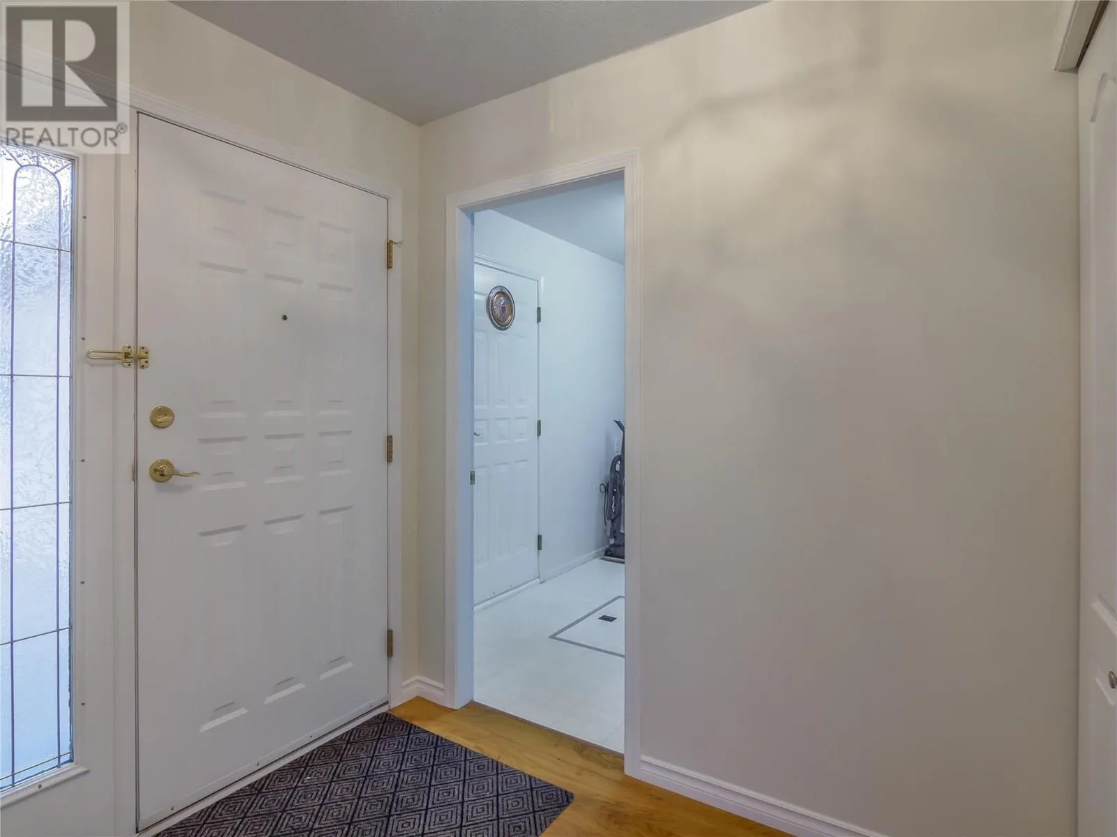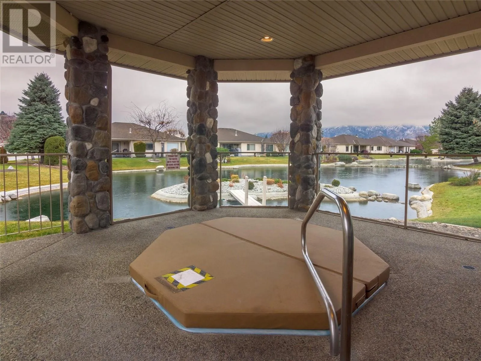 Welcome to Sandbridge, a coveted gated community with stunning waterways and landscaping, beautiful club house with a pool, and a premium location near Skaha Lake and the seniors center. This lovely 1307sqft rancher style home is move in ready. As you enter the front foyer to your right is the large laundry room with extra storage space and garage access, a large closet and welcoming space. The well appointed living and dining room features easy care laminate floors, a gas fireplace, tons of windows and natural light and room for all your furniture. This home has had the kitchen redone and a window opened up between the spaces creating a more modern layout, more natural light and a great space for entertaining. There are beautiful shaker style cabinets in a warm wood with contrasting counters and stainless steel appliances. The kitchen has space for a table or island or more cabinets, and it opens to the very private back North facing patio with no homes looking back at it. There is a large guest bedroom and bathroom and a very spacious primary suite with walk in closet and large ensuite bathroom. The main areas have been freshly painted, and the poly b has been removed from the home, just move in and enjoy this lovely home in a friendly and well run complex. A short walk will take you to shops, trails, walkways, the beach and parks, a pub, and so much more. (id:27476)