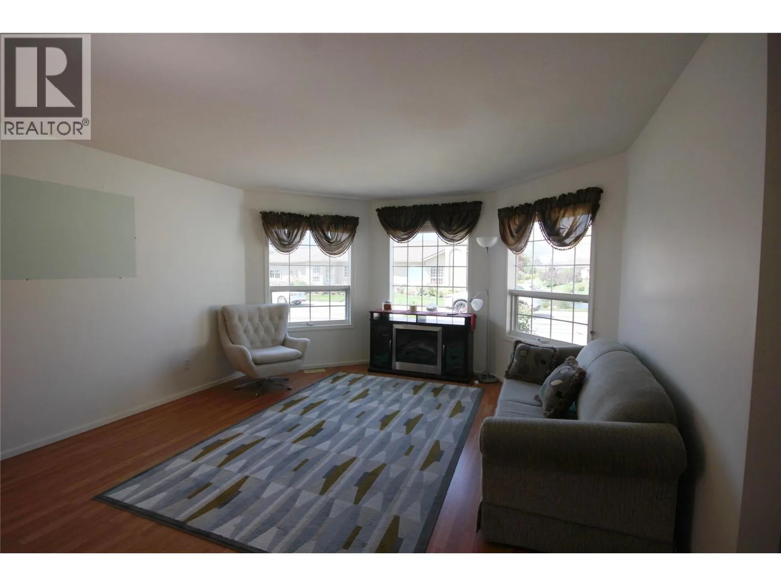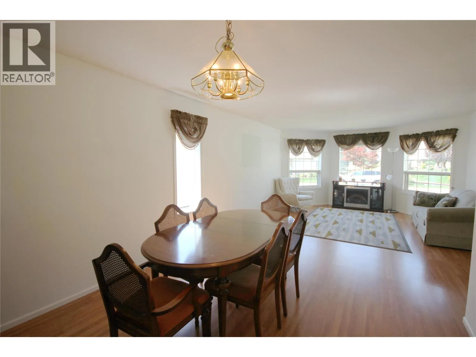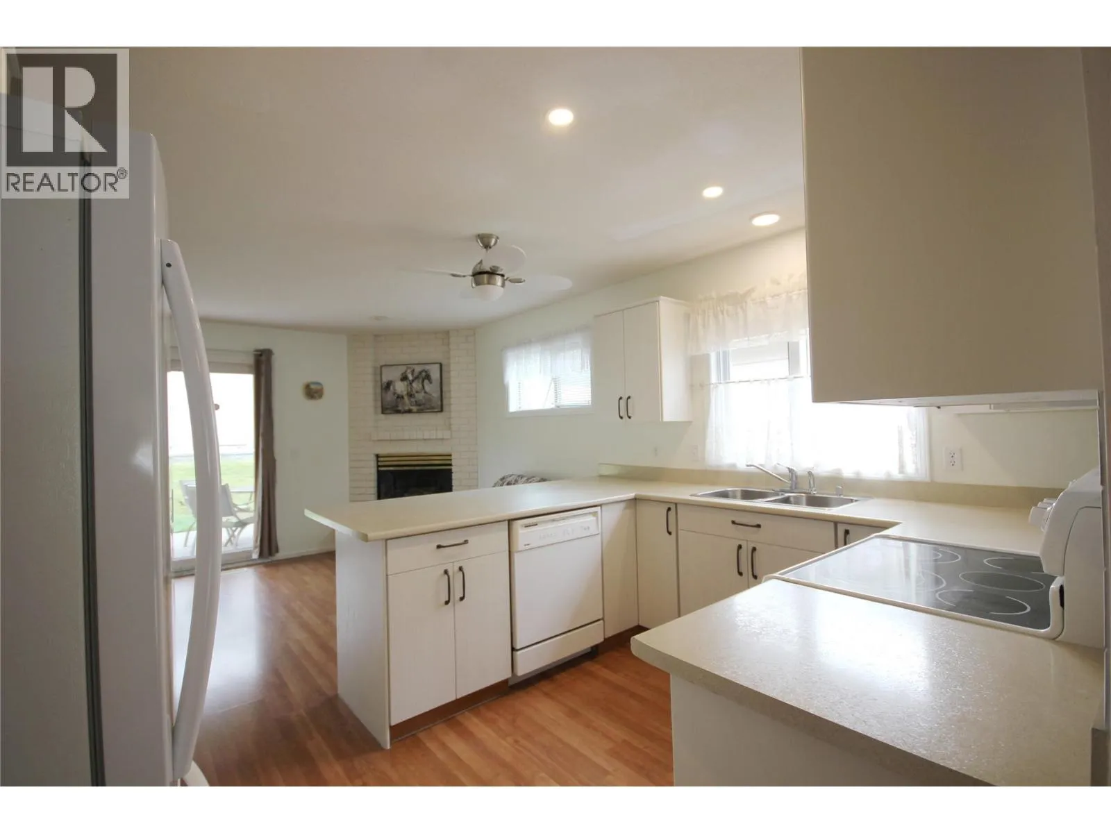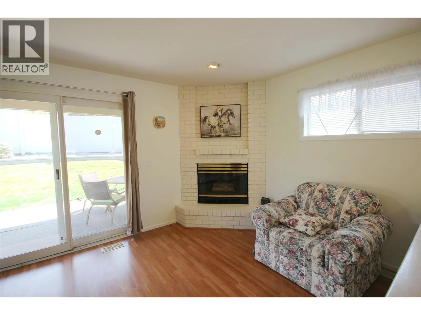 Welcome to prestigious Sandbridge, a sought-after gated community featuring stunning waterways, lush landscaping, and a charming clubhouse with a hot tub and pool. This 1,374 sq ft rancher is move-in ready. Enter through the foyer to an open living and dining area with easy-care laminate floors, abundant natural light, and ample space for your furniture, creating a warm, inviting atmosphere. Enjoy tranquil views of foliage and waterway from your living room window whenever you wish. An adjacent door leads to a spacious utility room with extra storage and garage access. The home boasts a generous primary suite with a walk-in closet and a 4-piece ensuite, along with a guest bedroom and a main bathroom with a walk-in shower. The renovated kitchen features modern cabinets, white appliances, and room for three at the counter. A cozy family room with a gas fireplace provides the perfect space for relaxing evenings. The family room opens to a private, east-facing covered back patio and yardâideal for outdoor entertaining. Conveniently located near shopping, trails, parks, the beach, pubs, Skaha Lake, and the seniors center, all within a friendly, well-managed community. (id:27476)