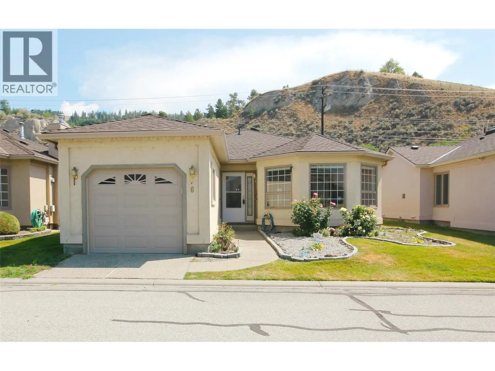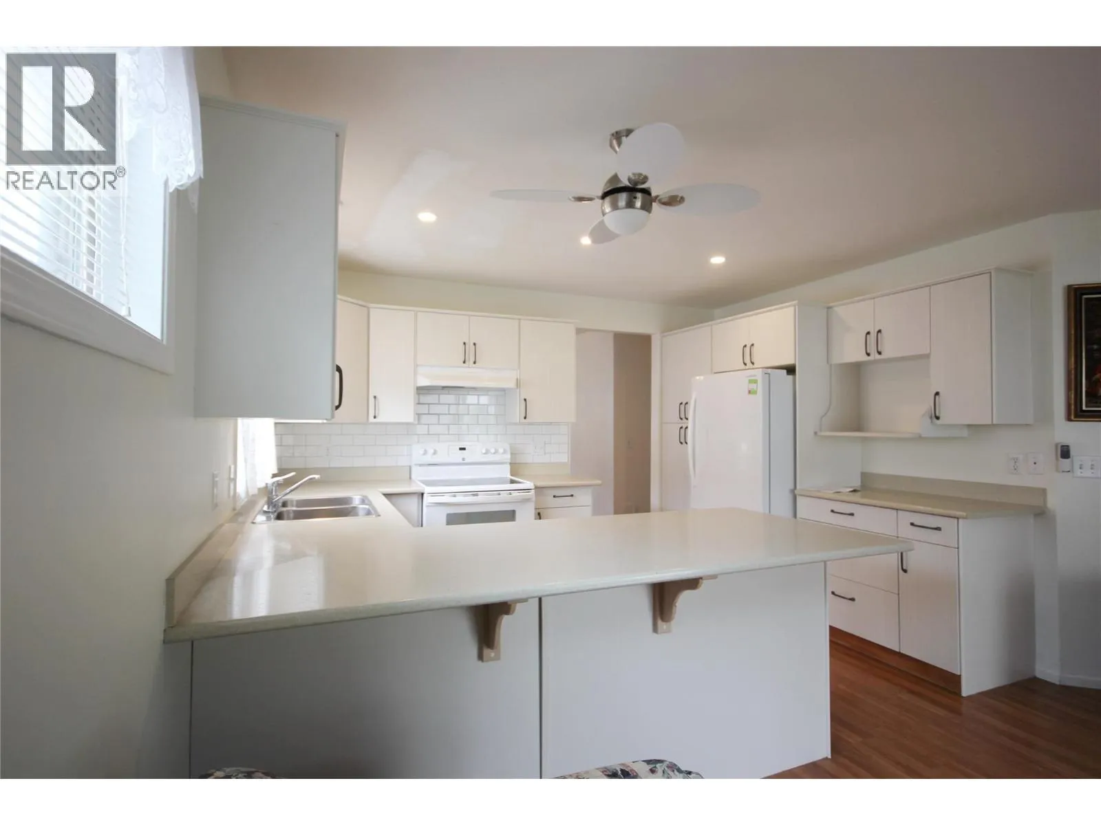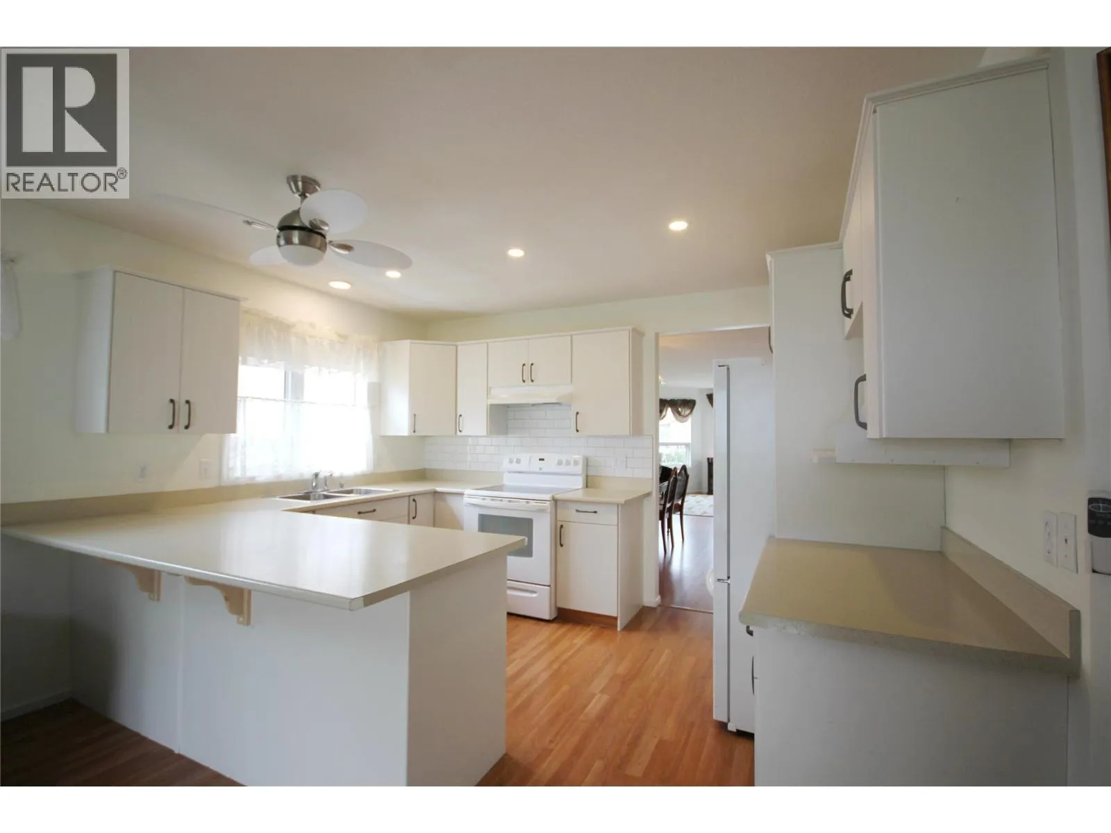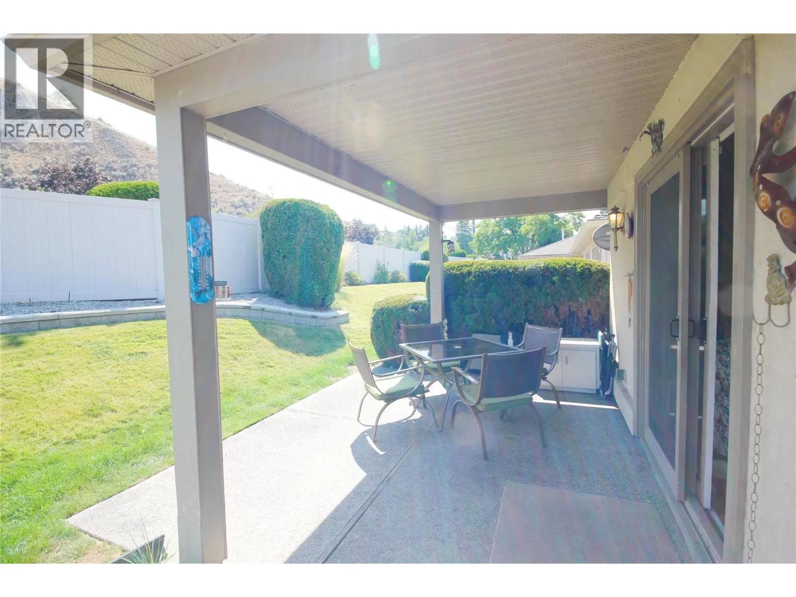 Welcome to prestigious Sandbridge, a sought-after gated community featuring stunning waterways, lush landscaping, and a charming clubhouse with a hot tub and pool. This 1,374 sq ft rancher is move-in ready. Enter through the foyer to an open living and dining area with easy-care laminate floors, abundant natural light, and ample space for your furniture, creating a warm, inviting atmosphere. Enjoy tranquil views of foliage and waterway from your living room window whenever you wish. An adjacent door leads to a spacious utility room with extra storage and garage access. The home boasts a generous primary suite with a walk-in closet and a 4-piece ensuite, along with a guest bedroom and a main bathroom with a walk-in shower. The renovated kitchen features modern cabinets, white appliances, and room for three at the counter. A cozy family room with a gas fireplace provides the perfect space for relaxing evenings. The family room opens to a private, east-facing covered back patio and yardâideal for outdoor entertaining. Conveniently located near shopping, trails, parks, the beach, pubs, Skaha Lake, and the seniors center, all within a friendly, well-managed community. (id:27476)