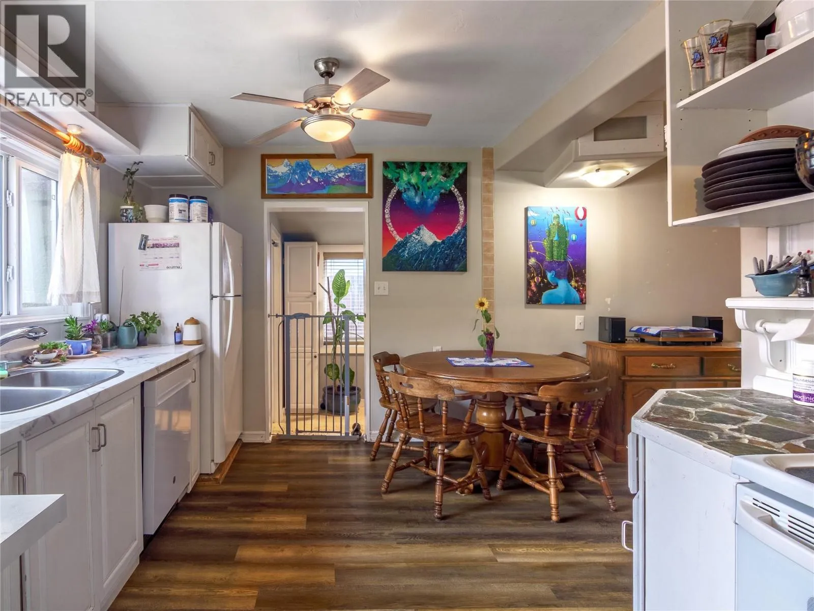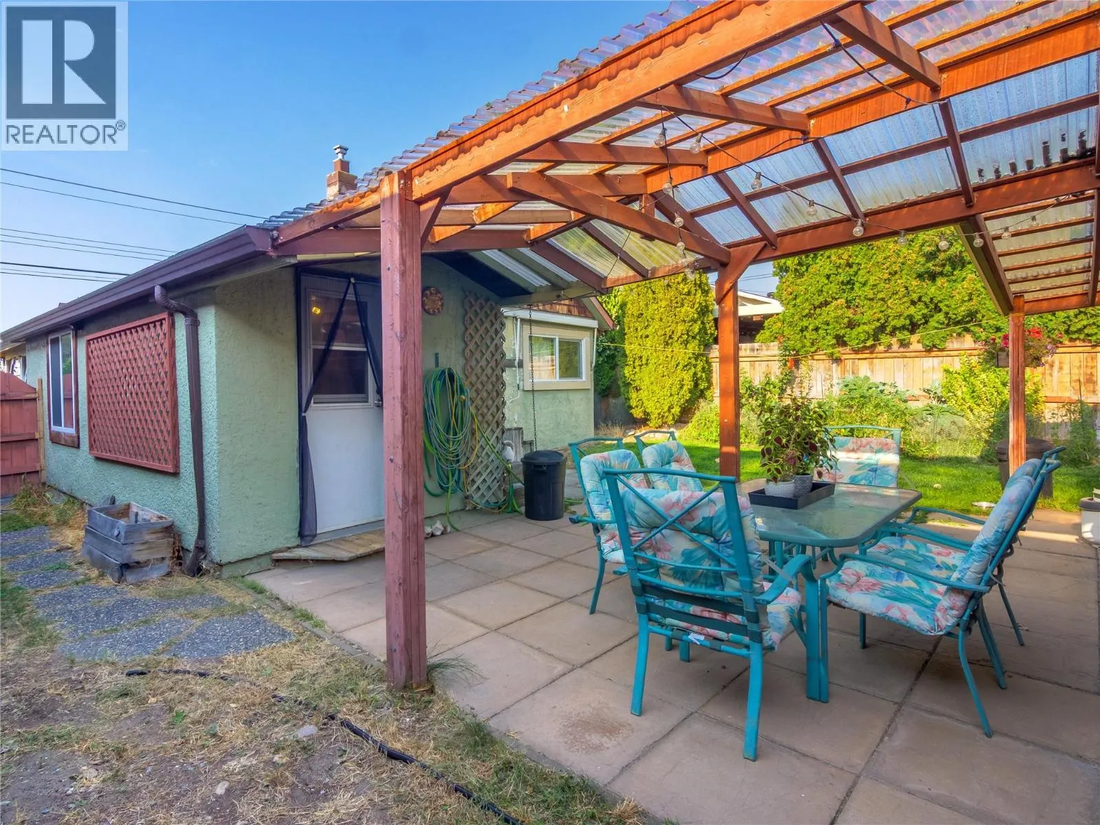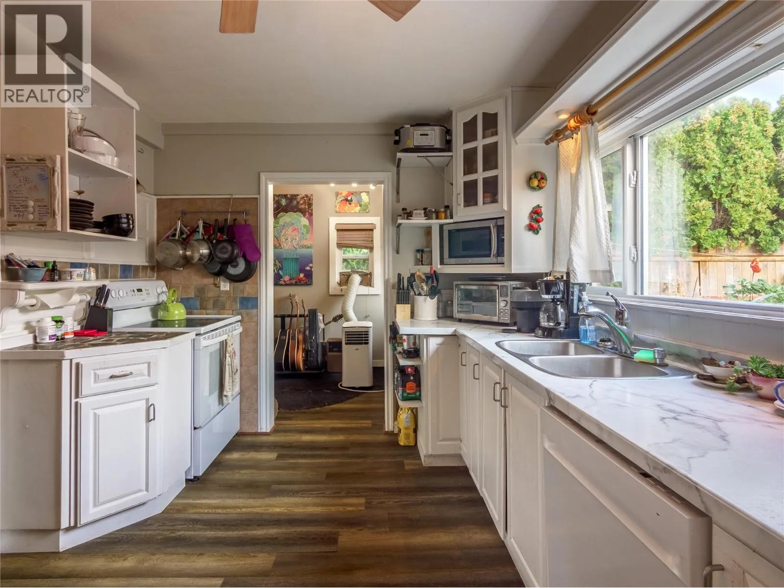 First Time Buyers alert! Check out this charming cottage style character home with a detached double garage, fenced yard, and great area, perfect for your first home. The exterior of this home has accent cedar shingles, a front porch for your morning coffee or evening relaxing, grassy area for kids or pets to play, and a huge back patio with a cover thatâs private and spacious for entertaining. As you enter the home, youâll find a good-sized foyer perfect for storage and gear, a large laundry room with more storage and access to the outside. The cozy main area of the home is open plan, has laminate floors throughout and light from the front and back of the home pouring in. The bright white kitchen has a charming feel and large window; thereâs room for a dining table and a nice living area with a cozy gas fireplace. The main bedroom is at the front of the house, and the small 2nd bedroom/den would make a great office or nursery. Off the alley is a large detached double garage perfect for storage or parking or an ideal workshop! From this location your can walk to schools, parks, shops, restaurants and more! A great first-time buyer or retiree alternative to a condo or townhome, you own the land and have no strata fees. (id:27476)