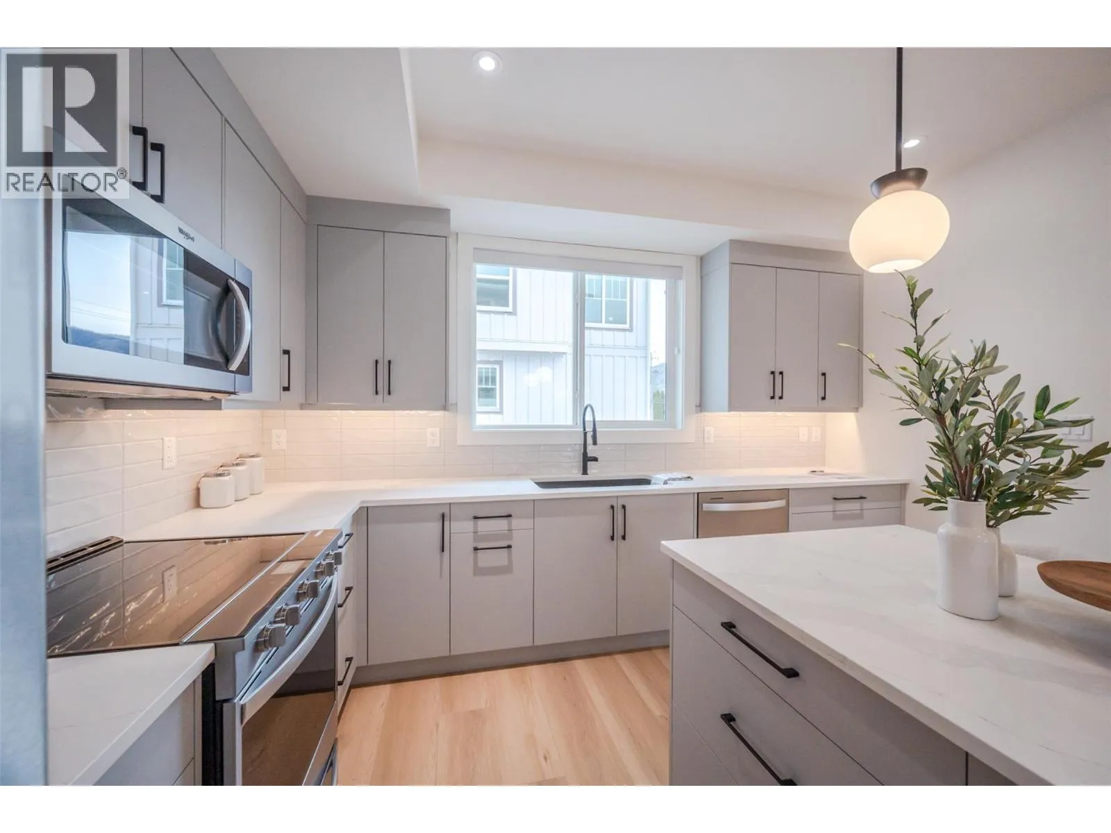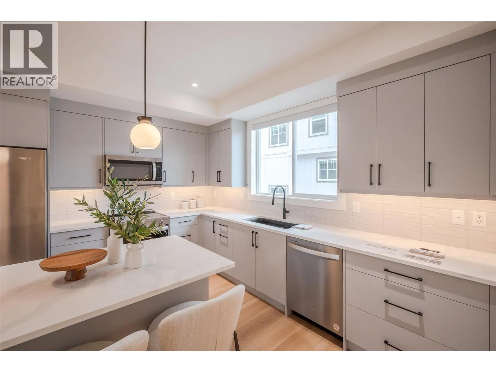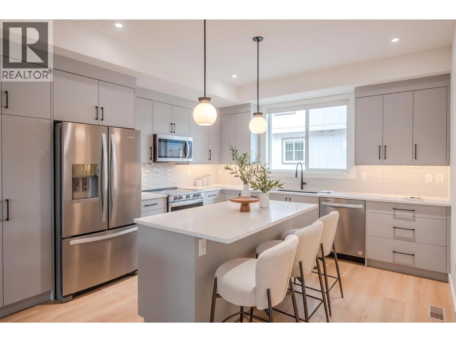 *PUBLIC OPEN HOUSE | SATURDAY NOVEMBER 22nd | 1:00pm to 2:30pm* This bright & modern 1,541 sf 3 storey townhouse is finished with 3 beds & 2.5 baths. Open-concept main floor showcases a luxury kitchen with an upgraded appliance package & beautiful quartz counters. The living room features electric FP by Dimplex. The slider patio door lets in lots of natural light and leads you to the covered deck with room for bbq & seating. The complimentary light gray cabinets and stunning quartz countertops pair well with any fabrics and furnishings making this home customizable for your liking. The third floor consists of your 3 bedrooms, primary ensuite, 1 full bath and a laundry closet. The primary bedroom is complete with an ensuite, that includes a tiled shower. A convenient full sized stacked washer & dryer are accessible from all bedrooms. The lower level has your spacious single car garage, foyer, entry closet & access to the spacious, fenced backyard. Garage comes pre wired for an electric car charger! Located close to local coffee shops, breweries, Okanagan Lake, and Penticton's downtown core! 2/5/10 Year New Home Warranty. Bonus for First-Time Homebuyers: Take advantage of possible GST exemption, making this the perfect opportunity to step into homeownership at a lower cost. Eligible first-time home buyers may also qualify for a full GST rebate, adding even more value. For details contact the listing agent! (id:27476)