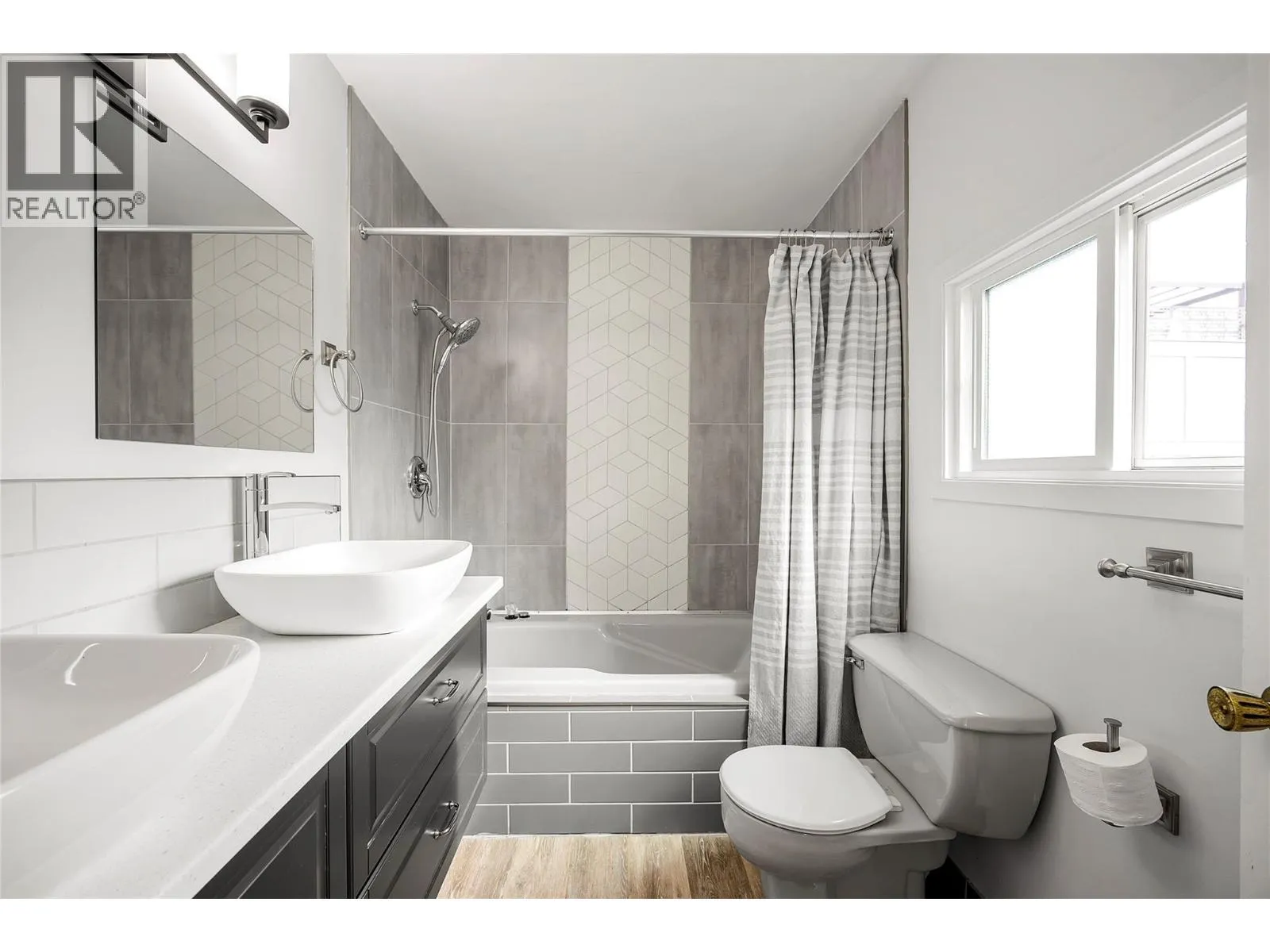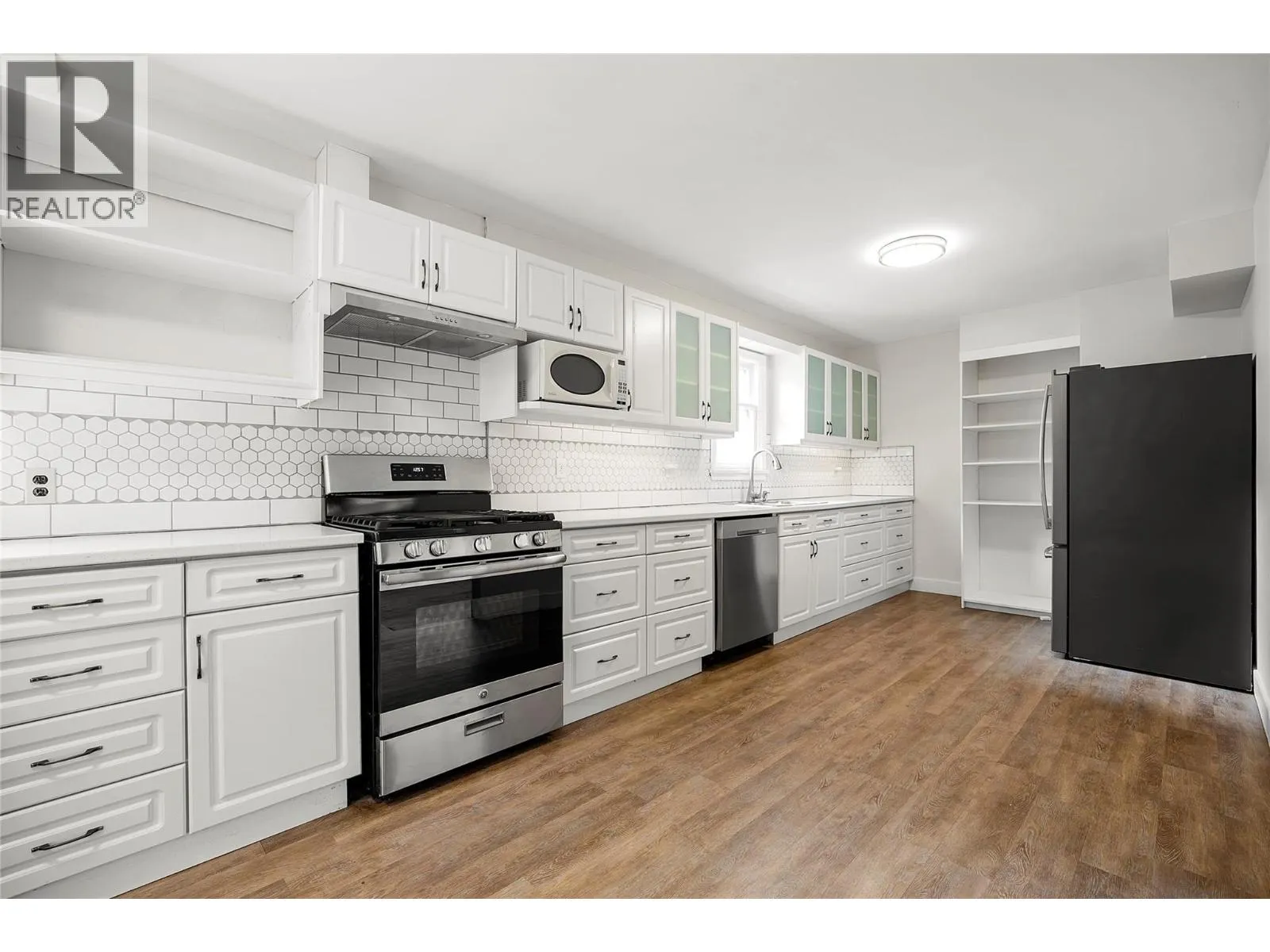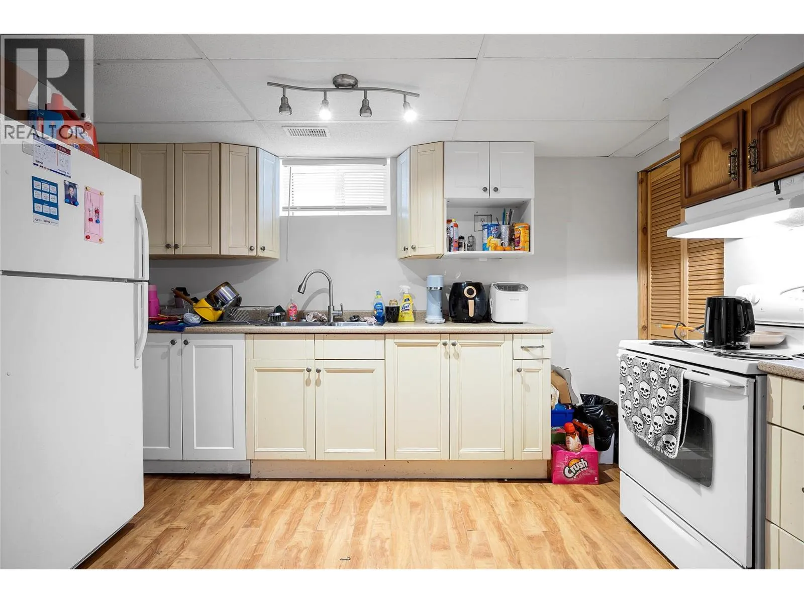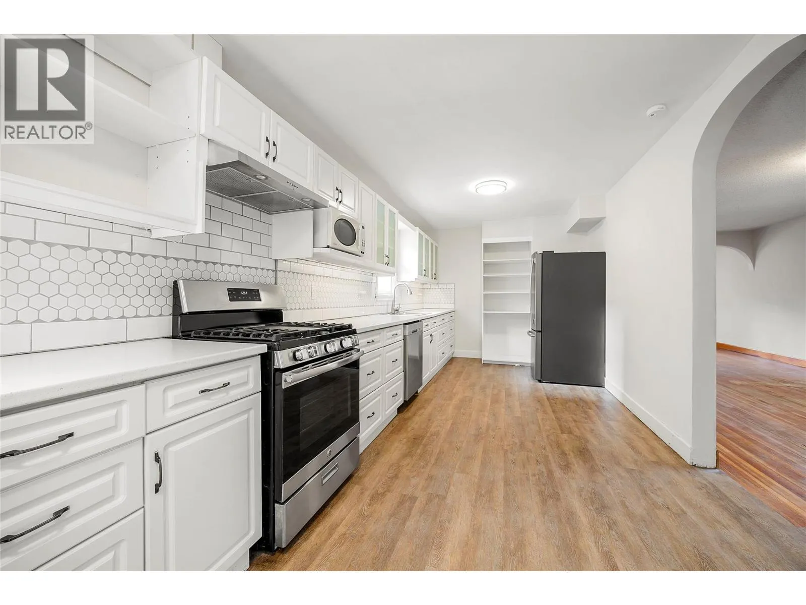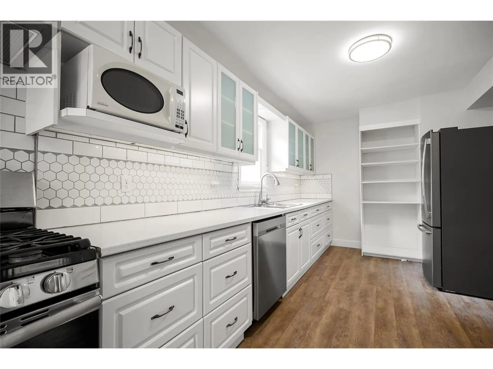 Adorable Character home in the heartbeat of the Okanagan. This 1945 built home has been lovingly cared for throughout its life. Offering a massive open living and dining space, complete with coved ceilings and original hardwood flooring. The Kitchen has been recently renovated offering heaps of (new) counter space and cabinet storage, under cabinet lighting and beautiful tiled backsplash. The main floor is completed by a fresh 3 piece bathroom with comer shower. Upstairs you will find generously sized bedrooms including a sprawling primary bedroom with double closets, uncommon in this vintage of home, as well as a beautifully remodeled bathroom which hosts double sinks and a spectacular tiled tub surround. The home offers a full 2 bedroom basement suite with full kitchen and separate laundry. While seated on a 30'xl 17' lot, you also find a garage with alley access and RV Parking. Only moments to the beach, parks and amenities, this home is ready for its new owners! All measurements are approximate and should be verified if fundamental. (id:27476)