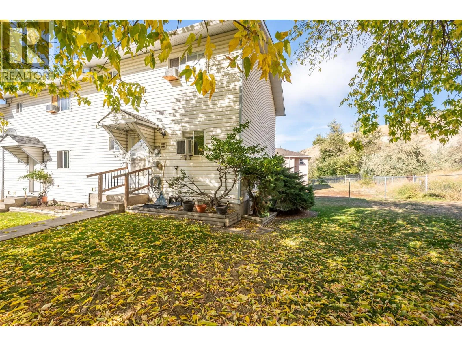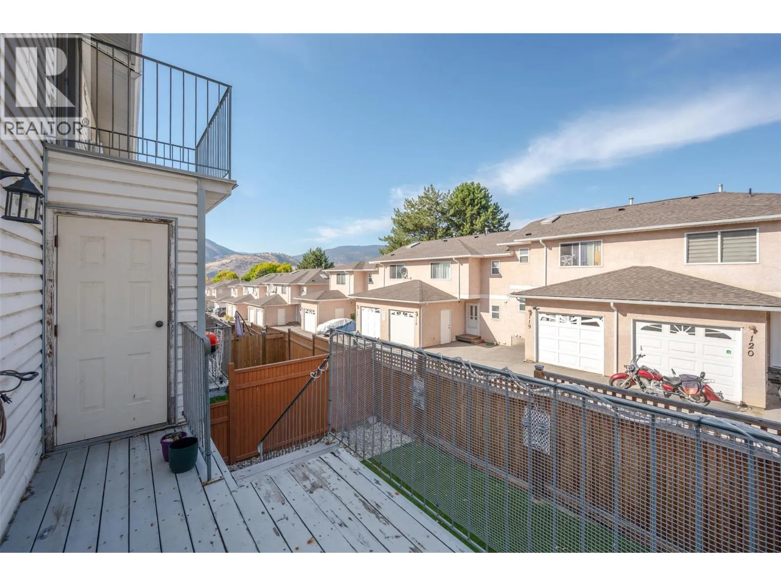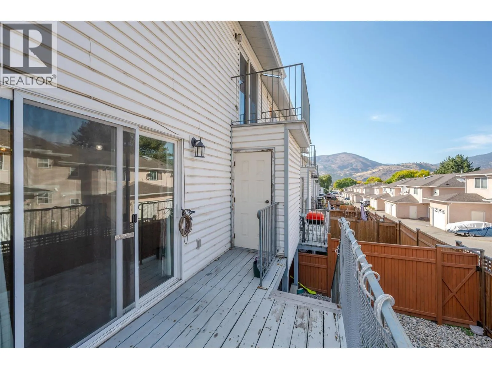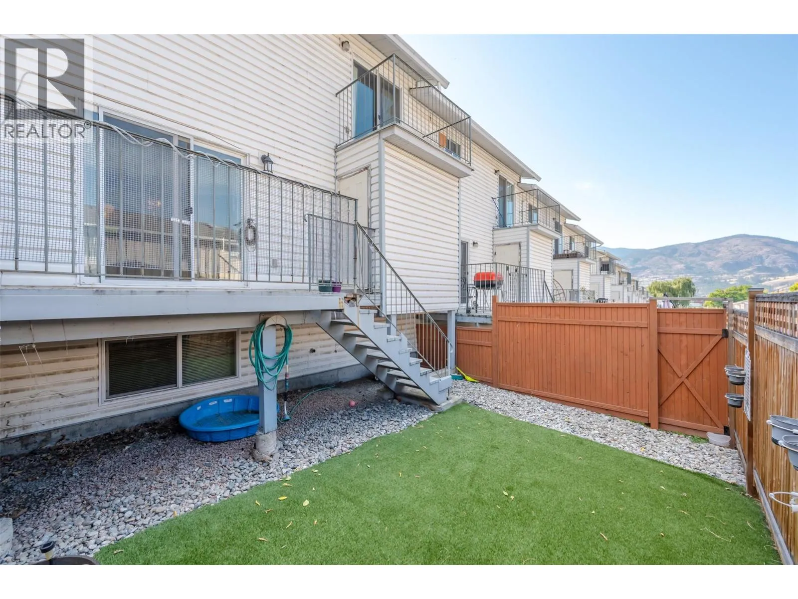 Welcome to this charming end-unit townhome offering comfort, space, and convenience in a fantastic location! The main floor features a bright open living and dining area with sliding glass doors leading to a deckâcomplete with extra storage and stairs down to a fenced backyard. The kitchen provides plenty of cabinet space and a window unit A/C for comfort, plus a handy 2pc bath and main floor laundry. Upstairs are three bedrooms and a full 4pc bath, including one bedroom with its own private balcony and mountain views. The unfinished basement offers endless possibilitiesâcreate a kidsâ playroom, rec room, or hobby spaceâwith even more storage. There are two parking spots with this unit, pet-friendly policies (with restrictions), and no age restrictions, this is the perfect starter home close to schools, shopping, recreation, the bus route, Skaha Lake, and nearby parks. Contact the listing agent to view! (id:27476)