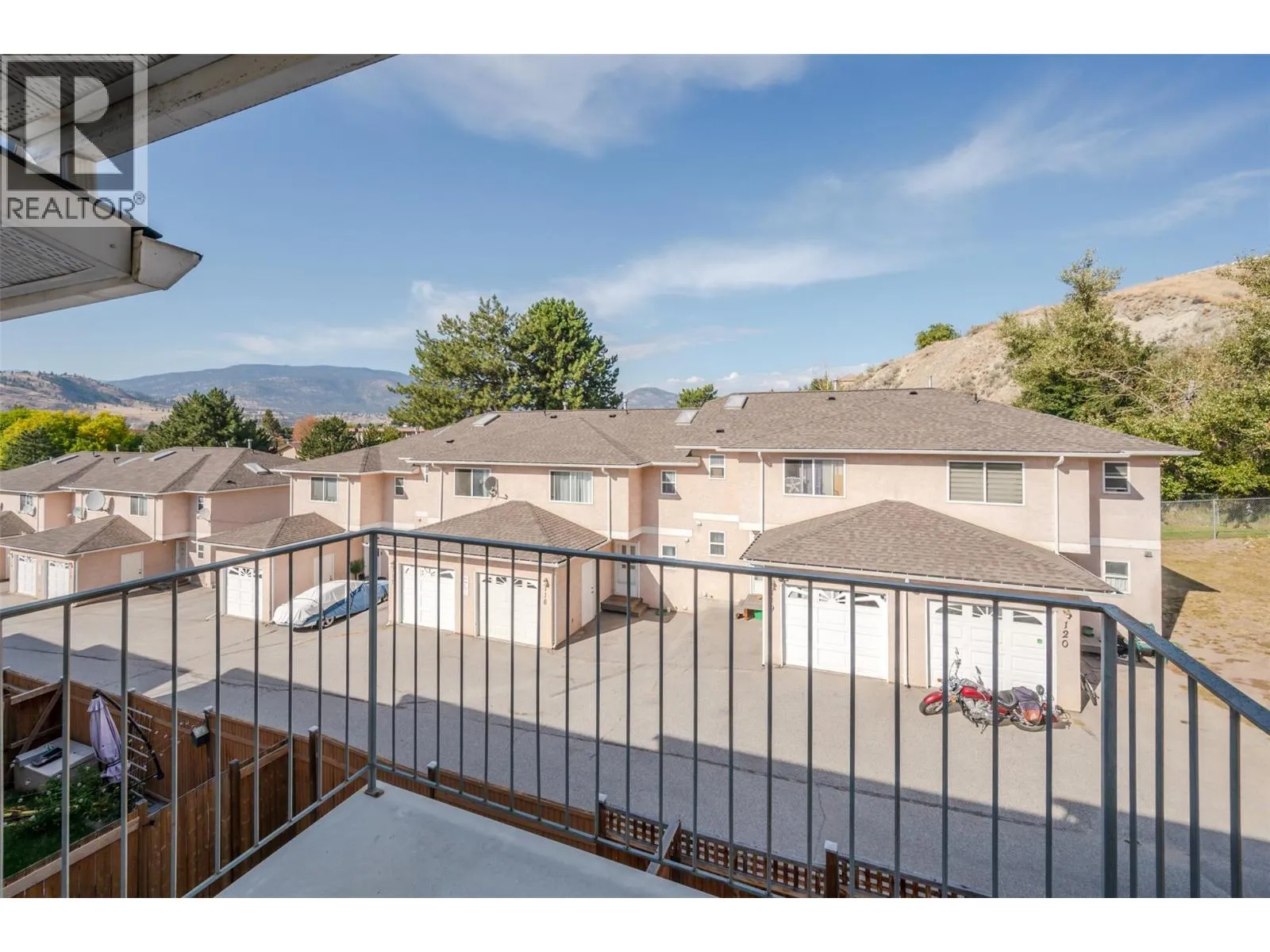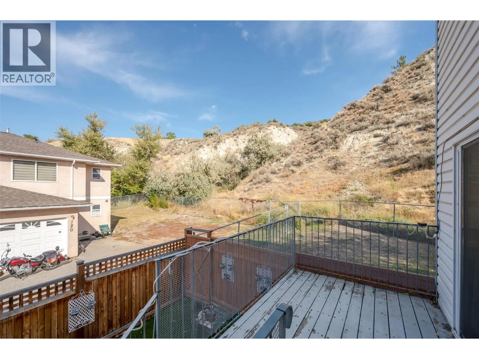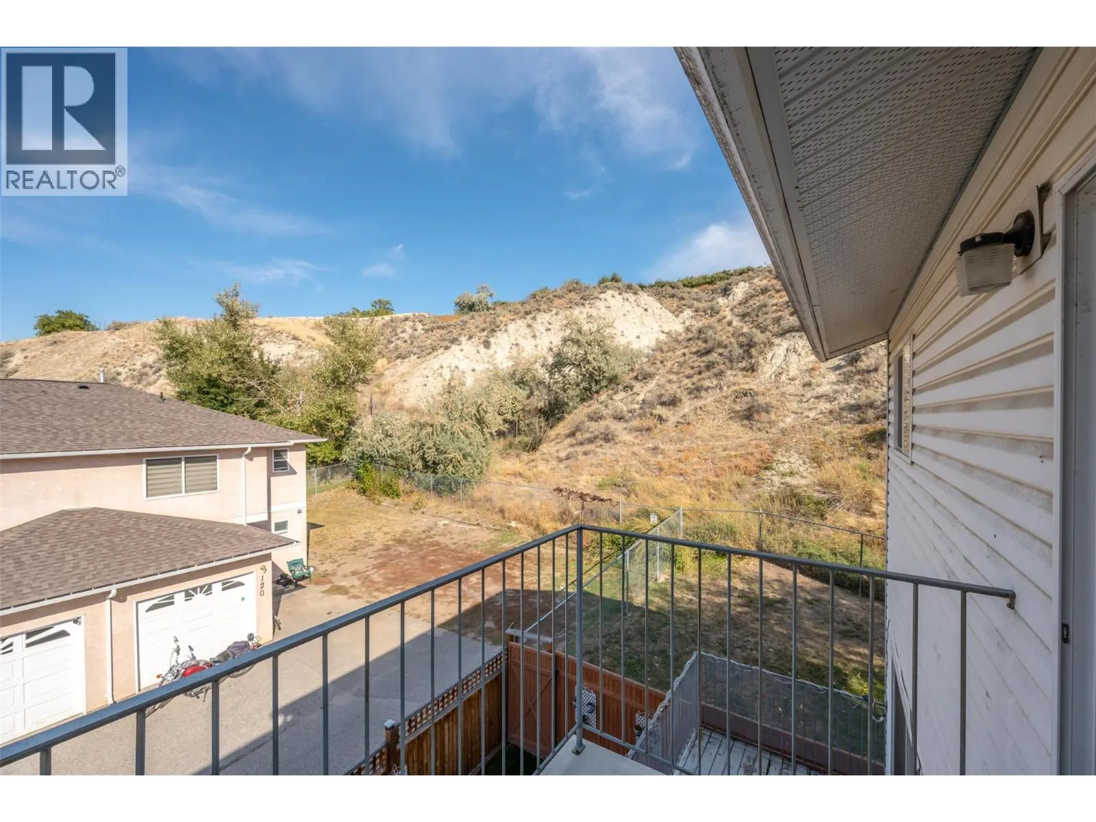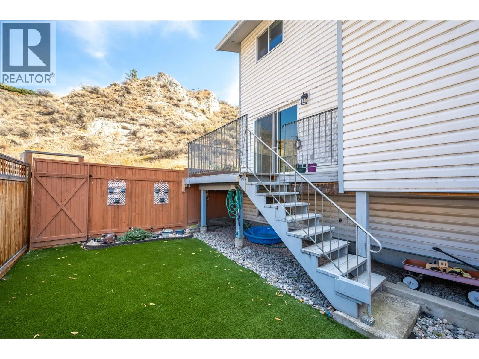 Welcome to this charming end-unit townhome offering comfort, space, and convenience in a fantastic location! The main floor features a bright open living and dining area with sliding glass doors leading to a deckâcomplete with extra storage and stairs down to a fenced backyard. The kitchen provides plenty of cabinet space and a window unit A/C for comfort, plus a handy 2pc bath and main floor laundry. Upstairs are three bedrooms and a full 4pc bath, including one bedroom with its own private balcony and mountain views. The unfinished basement offers endless possibilitiesâcreate a kidsâ playroom, rec room, or hobby spaceâwith even more storage. There are two parking spots with this unit, pet-friendly policies (with restrictions), and no age restrictions, this is the perfect starter home close to schools, shopping, recreation, the bus route, Skaha Lake, and nearby parks. Contact the listing agent to view! (id:27476)
