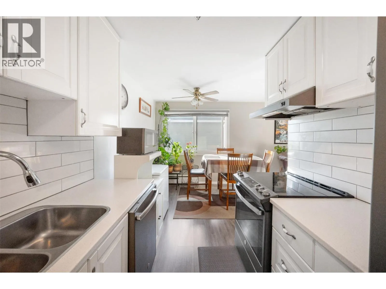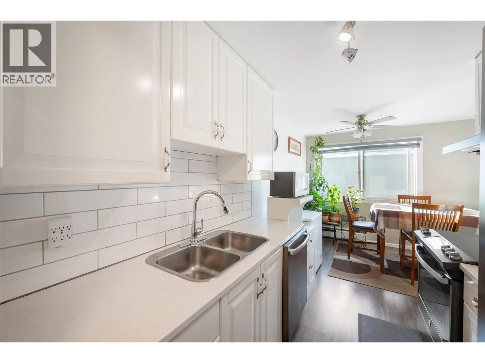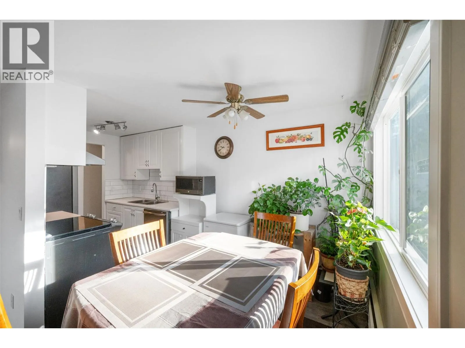 This bright and inviting second-floor corner unit offers an incredible amount of natural light that fills every room. The open floor plan creates a seamless flow throughout the home, complemented by a beautifully updated modern kitchen featuring a stylish tile backsplash, new appliances, refreshed counters, cupboards, and flooring. Additional updates extend to the bathroom with a double sink vanity, tile flooring, and tub with tile surround! The condition is updated and move-in ready! Step out onto the covered deck and enjoy a lovely view of the park and tennis courts â the perfect spot for a morning coffee or relaxing evening. Located in a quiet and friendly neighborhood, this home is just a short drive from downtown shopping, restaurants, and other amenities. Rental-friendly with no age restrictions, this property offers affordable living at its best. The monthly strata fee conveniently covers electricity, hot water, garbage, sewer, water, management and building maintenance â truly cheaper than rent! (id:27476)