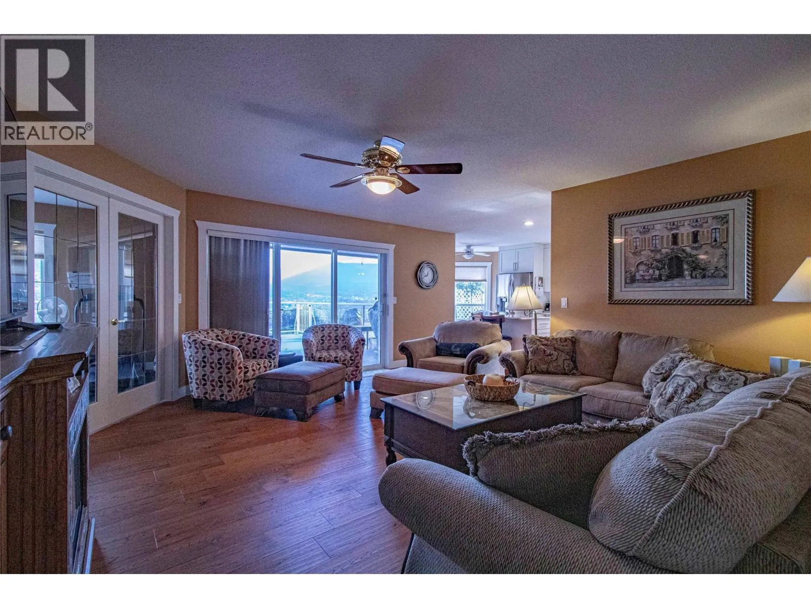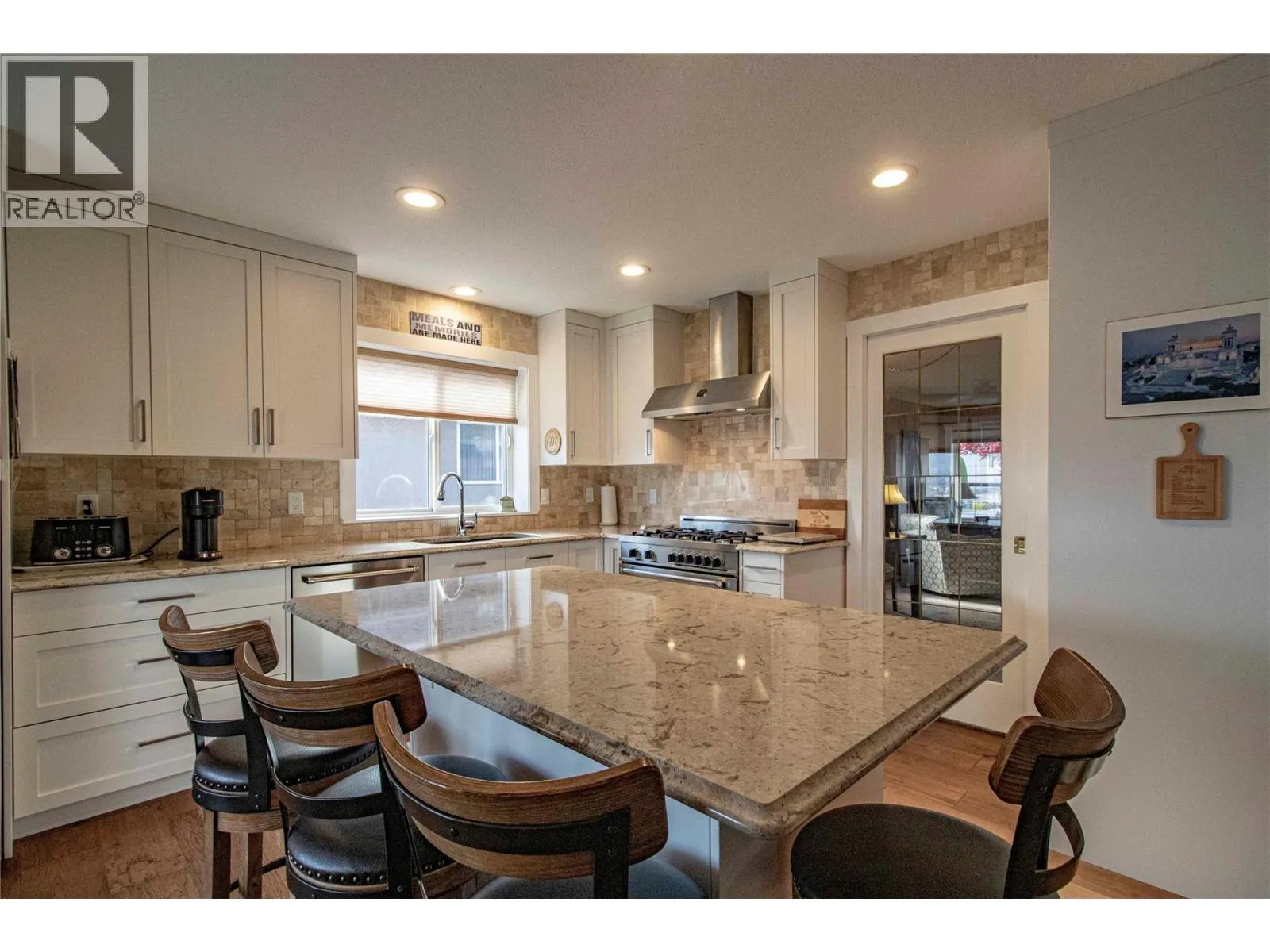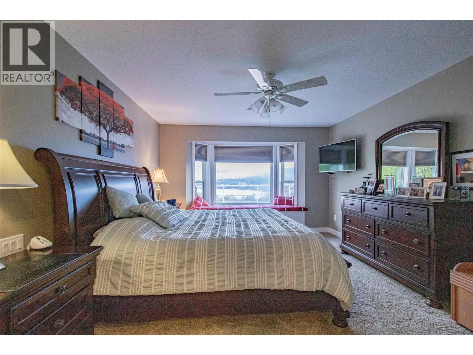 The pictures say it all: one of the most breathtaking views of Okanagan Lake and Penticton all the way to Skaha Lake! This rancher, located in Red Wing Resorts, has two bedrooms plus a den that take full advantage of the view inside and out. The patio doors in the family room open onto the massive composite deck that steps down to low maintenance landscaping complete with a prune plum tree. Many quality upgrades including a custom kitchen with quartz counters, travertine tile backsplash, large sit-up island, stainless steel appliances including a high-end Bertazzoni gas range and hood fan, engineered hardwood flooring, quality blinds throughout, newer Valor gas fireplace in the living room, high-efficiency furnace installed last year as well as a new hot water tank, and the list goes on. Spacious primary bedroom with window seat that takes in the view. Tastefully updated ensuite with soaker tub and separate shower, large double vanity offering a generous amount of storage. Tons of storage throughout, double garage with workbench and cabinets. Poly-B has been replaced. Must be seen to be truly appreciated. CONTINGENT to Red Wing Resorts waiving its right of first refusal. (id:27476)