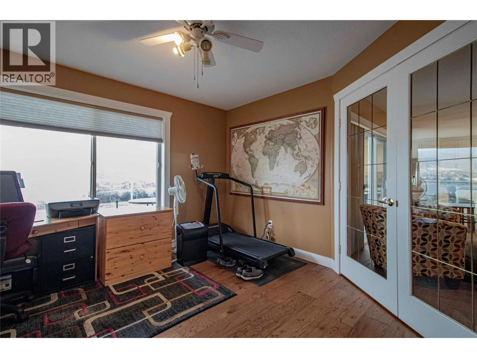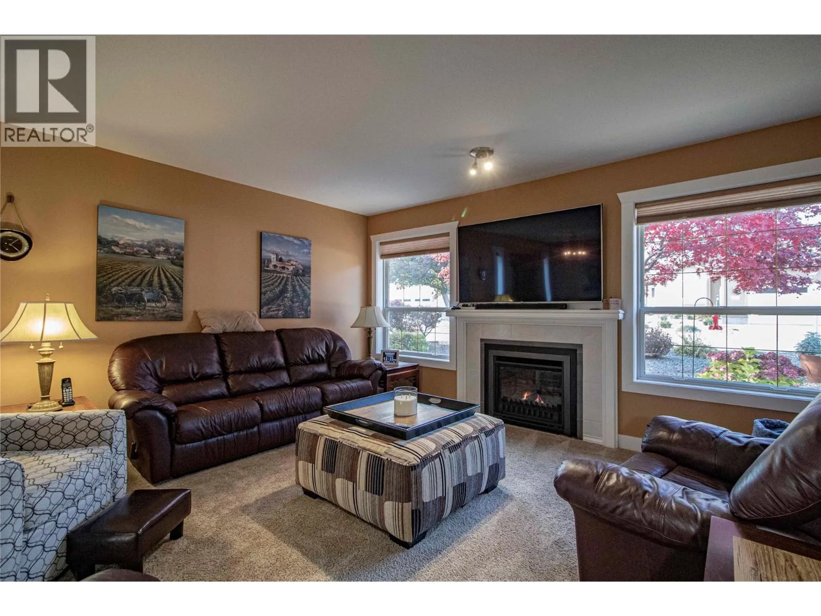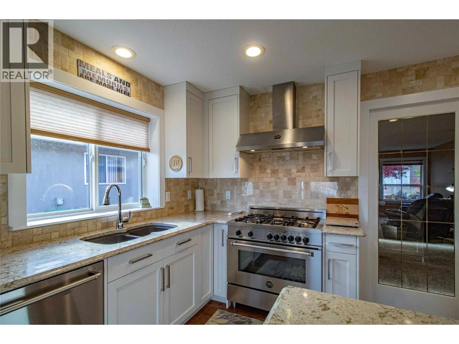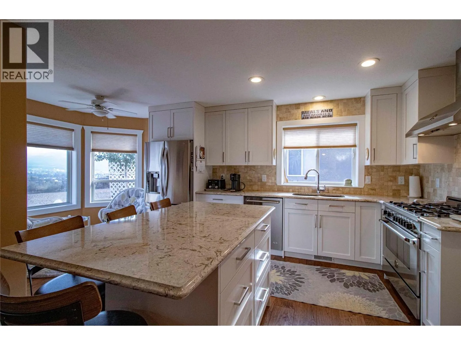 The pictures say it all: one of the most breathtaking views of Okanagan Lake and Penticton all the way to Skaha Lake! This rancher, located in Red Wing Resorts, has two bedrooms plus a den that take full advantage of the view inside and out. The patio doors in the family room open onto the massive composite deck that steps down to low maintenance landscaping complete with a prune plum tree. Many quality upgrades including a custom kitchen with quartz counters, travertine tile backsplash, large sit-up island, stainless steel appliances including a high-end Bertazzoni gas range and hood fan, engineered hardwood flooring, quality blinds throughout, newer Valor gas fireplace in the living room, high-efficiency furnace installed last year as well as a new hot water tank, and the list goes on. Spacious primary bedroom with window seat that takes in the view. Tastefully updated ensuite with soaker tub and separate shower, large double vanity offering a generous amount of storage. Tons of storage throughout, double garage with workbench and cabinets. Poly-B has been replaced. Must be seen to be truly appreciated. CONTINGENT to Red Wing Resorts waiving its right of first refusal. (id:27476)