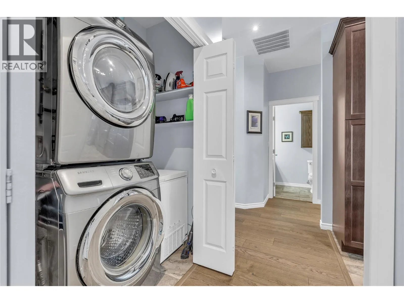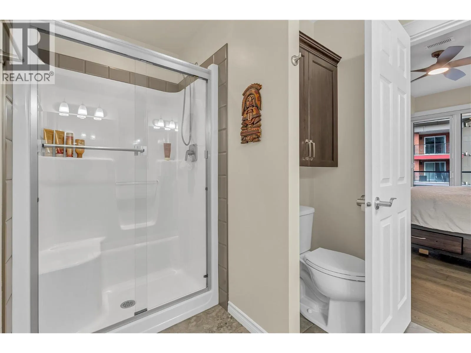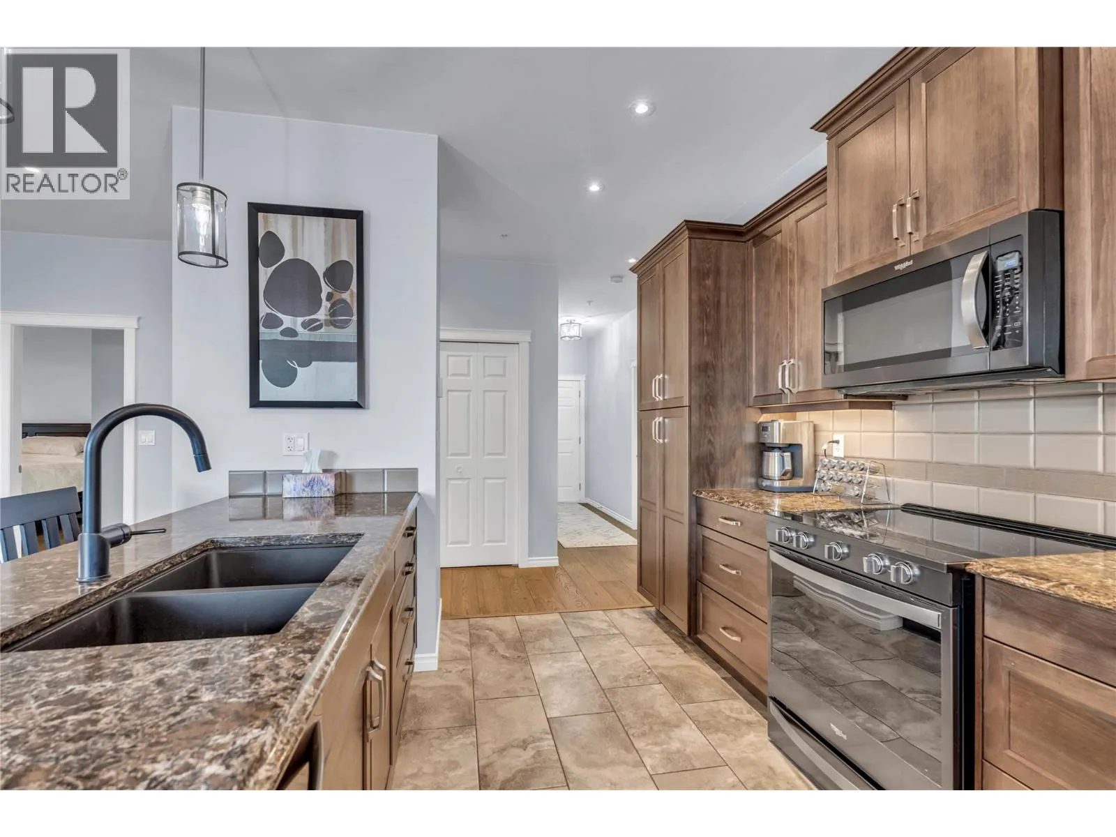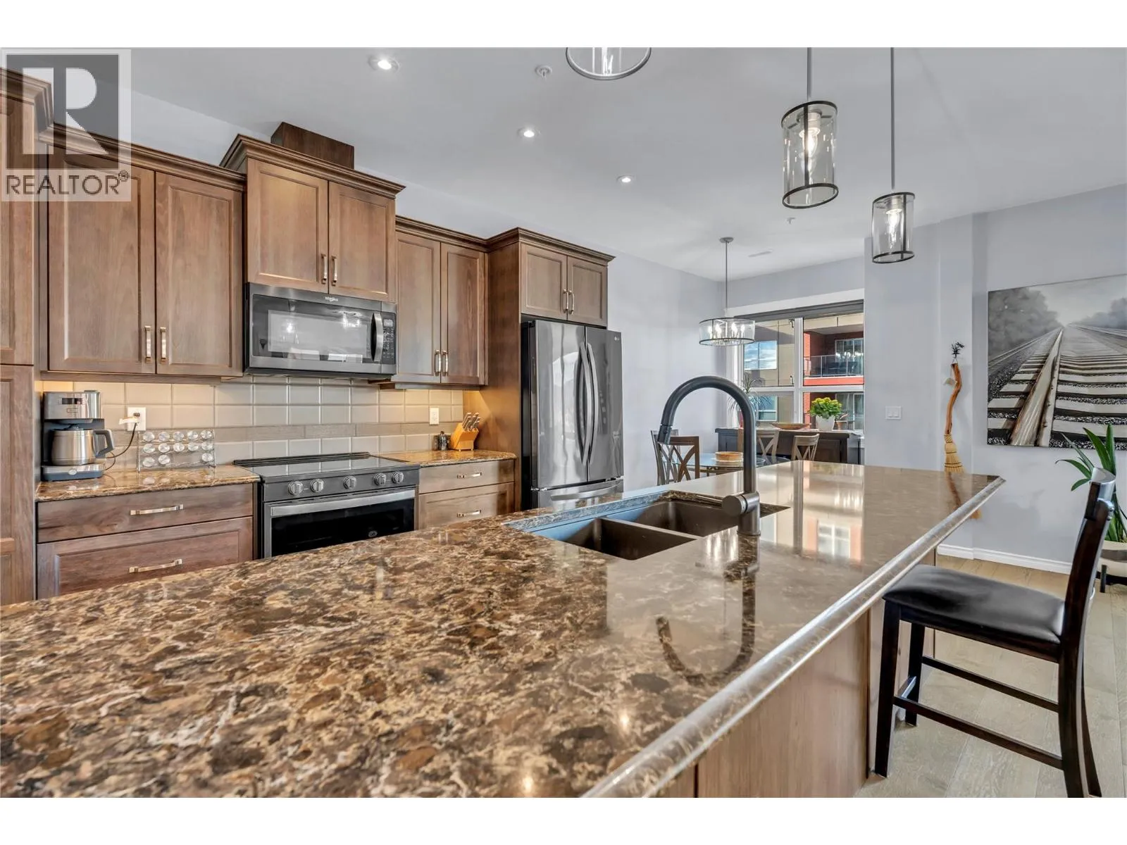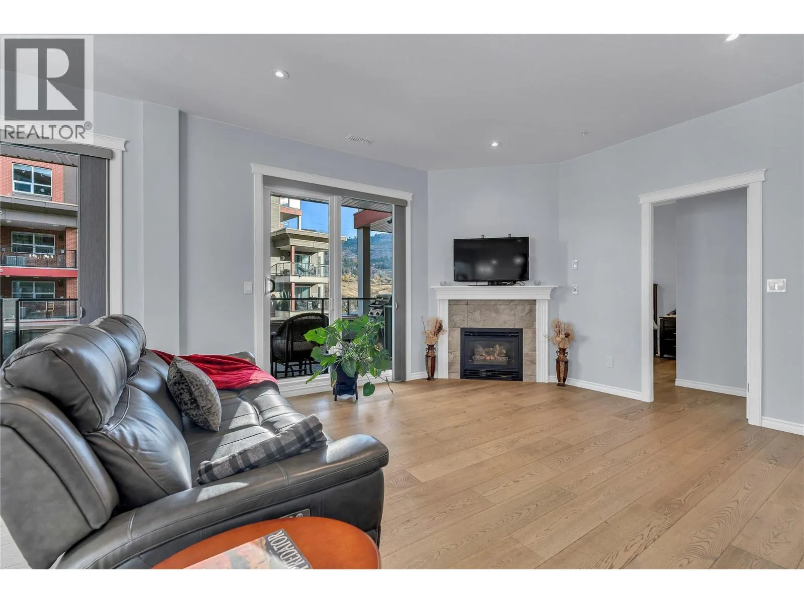This stunning natural daylight condo in Skaha Towers was built in 2018 with approx. Featuring 2 bedrooms plus a generous den/flex room. Enjoy this Northwest facing unit with Okanagan Mountain views, an oversize deck to relax on. The floor plan is inviting with room to entertain your guests in comfort. The entry foyer that leads to the spacious kitchen and great room, centred around a cozy custom gas fireplace. Upgrades include real hardwood flooring, solid surface countertop throughout, custom kitchen cabinetry, undermount lighting, brushed nickel faucets, oversize island & pantry. The primary bedroom features a convenient ensuite with double sinks and a walk-in shower, plus walk-in closet with interior upgraded shelving. Enjoy hot water on demand, central AC, water softener, and energy-efficient heating. Pride of ownership is felt from the moment you enter. The neighborhood has you situated steps to Skaha Beach/Park and Skaha Lake marina. Close to many amenities like Kojo Sushi, Marmalade bakery, Skaha pizza, a short walk to South main market, the Dragon Boat Pub, Walmart and Second Cup Coffee. The unit includes secure parkade parking, secure bike storage, private storage locker on the same floor. Also, games room onsite to book if needed. Skaha Towers is ready to call home; no age restrictions and two pets allowed with approval. Call today to view. (id:27476)