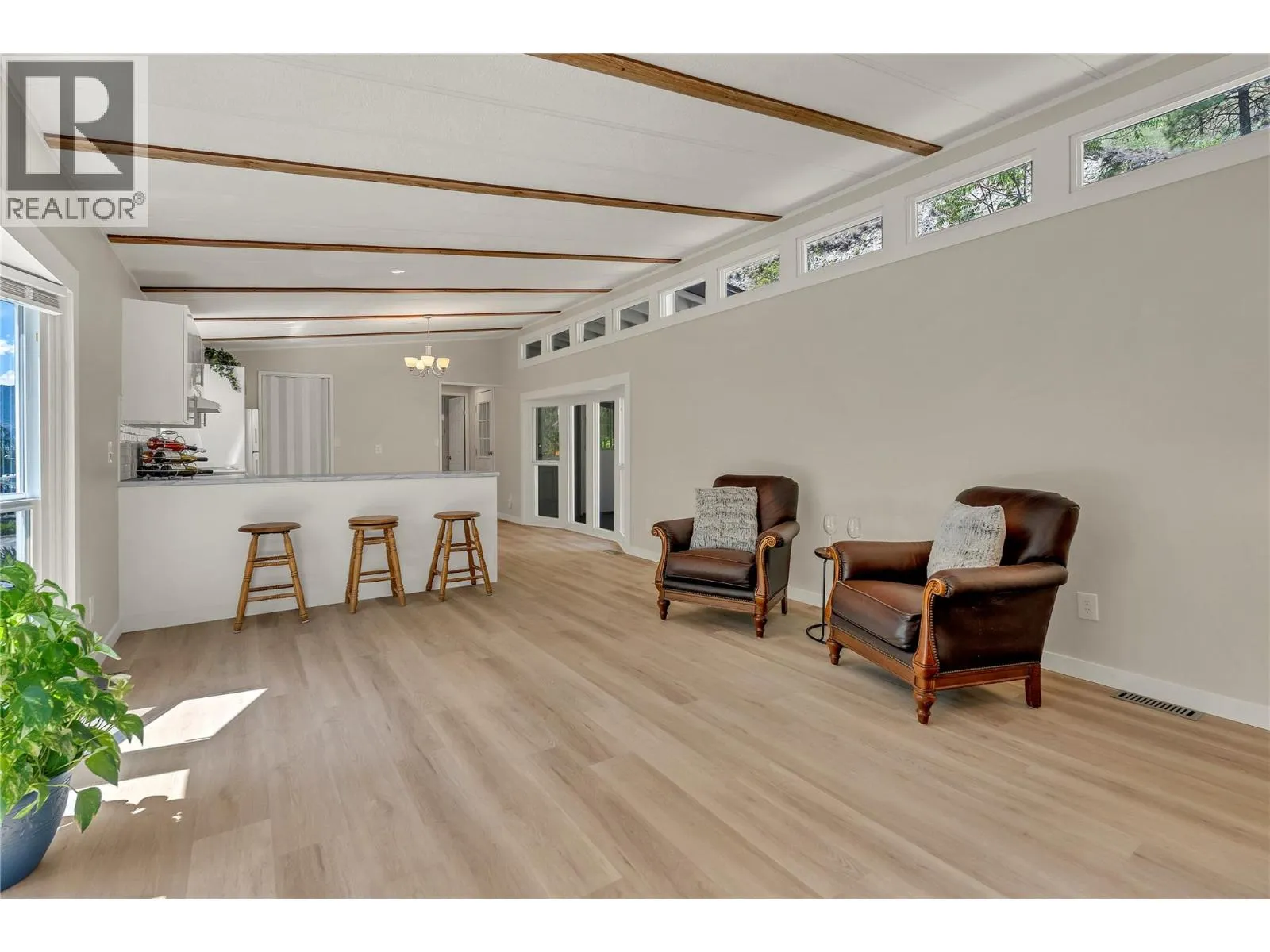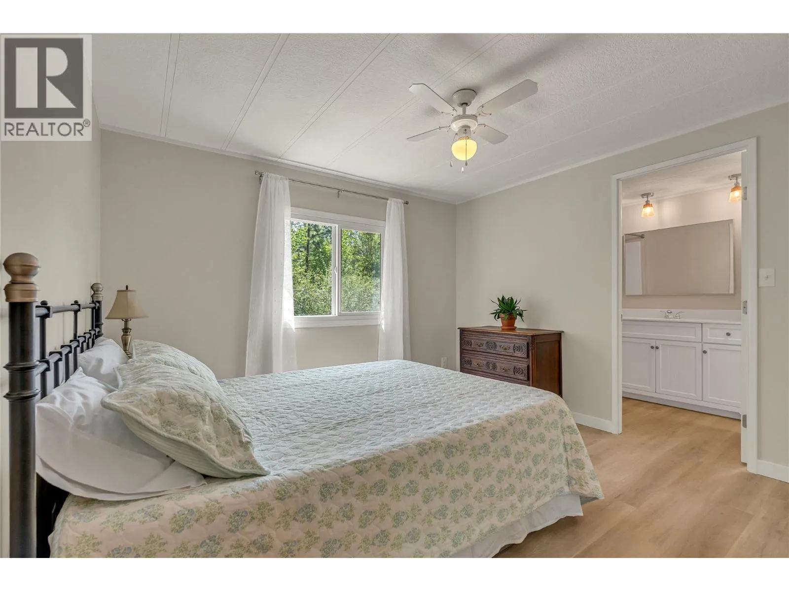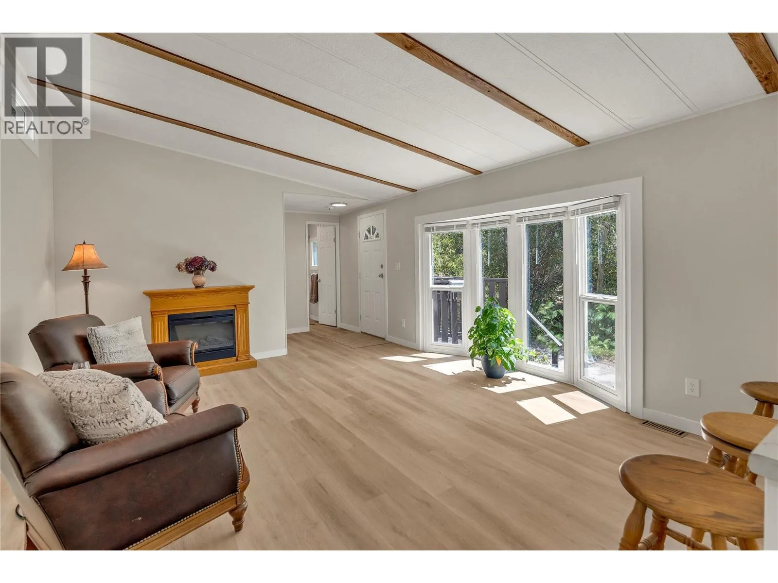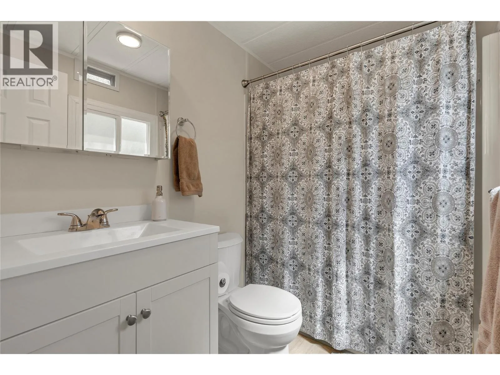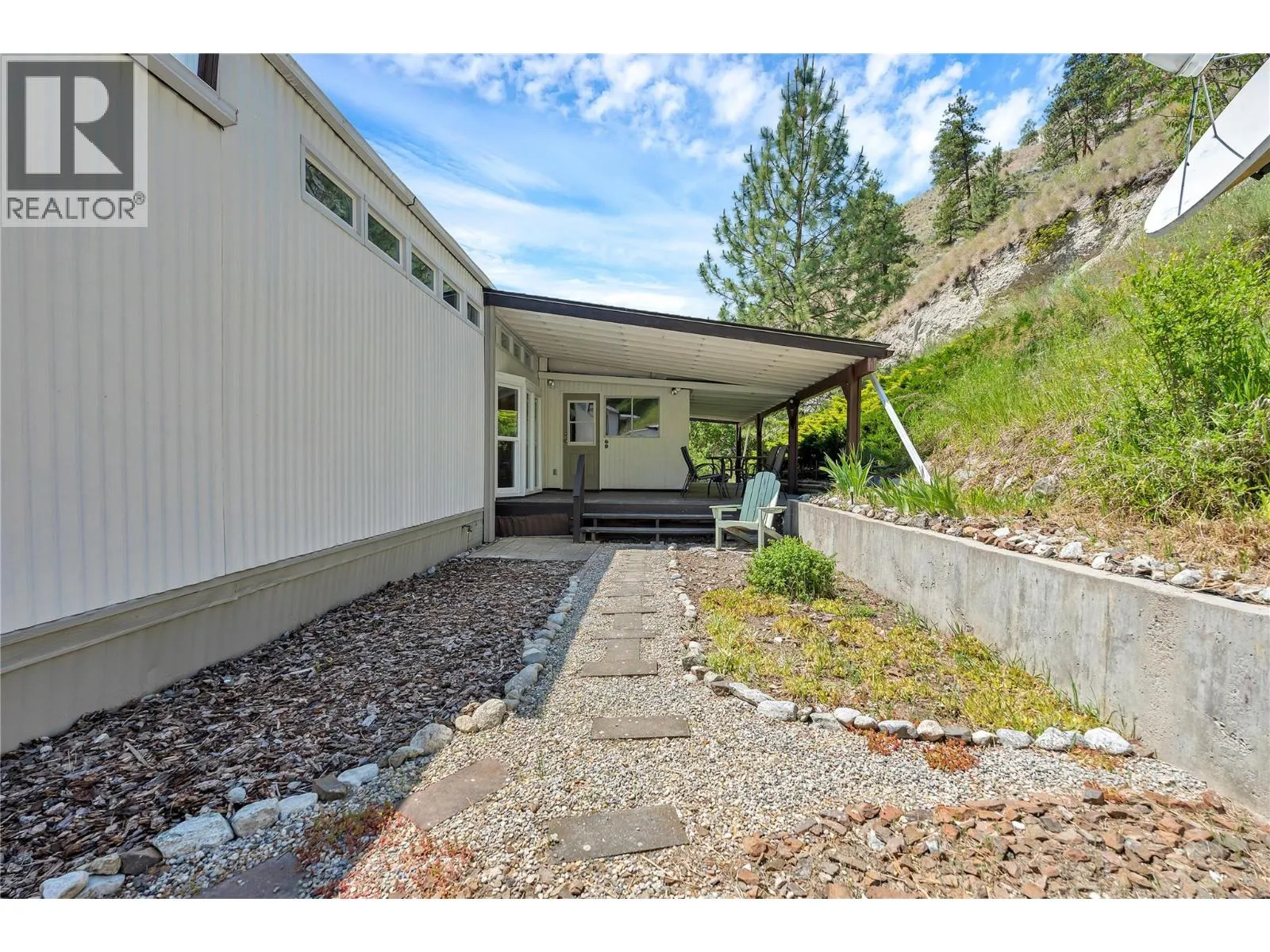 Welcome to Pleasant Valley, one of the most unique mobile home parks in the Okanaganâjust a short, level drive to the heart of Penticton. Surrounded by nature and bordered by the ever-flowing, beautiful Penticton Creek, this park offers a peaceful setting unlike any other. This substantially renovated 3-bedroom, 2-bathroom home is tucked away in a private, low-traffic area across the creek, where the soothing sound of water and the natural surroundings create a serene atmosphere. The home feels far from a typical mobile, with its high shed-style ceilings, abundant natural light, and absence of narrow hallways. Inside, the impressive renovations include a new kitchen and bathrooms, updated flooring throughout, fresh interior and exterior paint, modern light fixtures, and plumbing. Outside, the spacious yard is ideal for outdoor living and hobbies, featuring a large covered deck, a flat and private backyard, and even a small patio area overlooking the creek. There is ample parking, and the park also offers RV parking (subject to availability and a monthly fee). Pleasant Valley is a well-managed 55+ community that allows two pets (size restrictions apply). (id:27476)