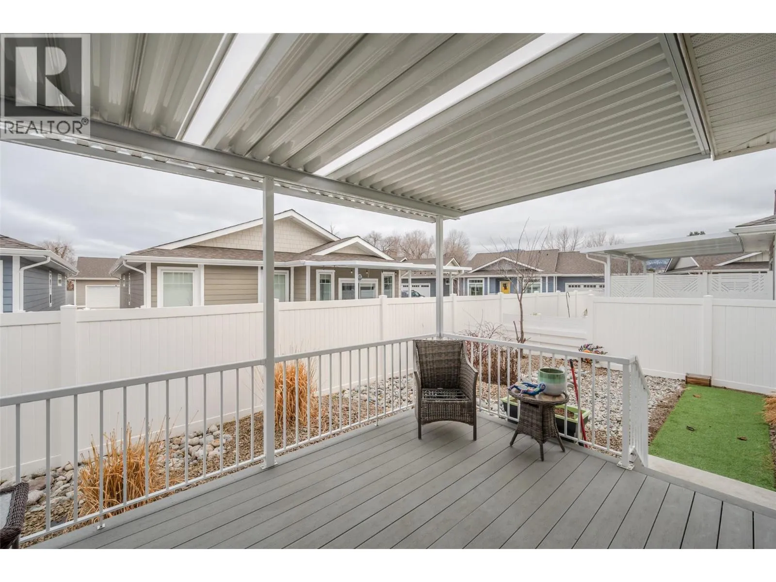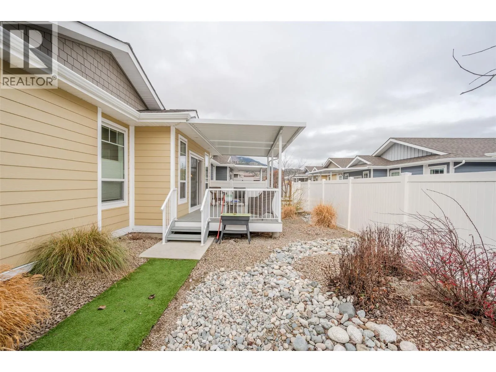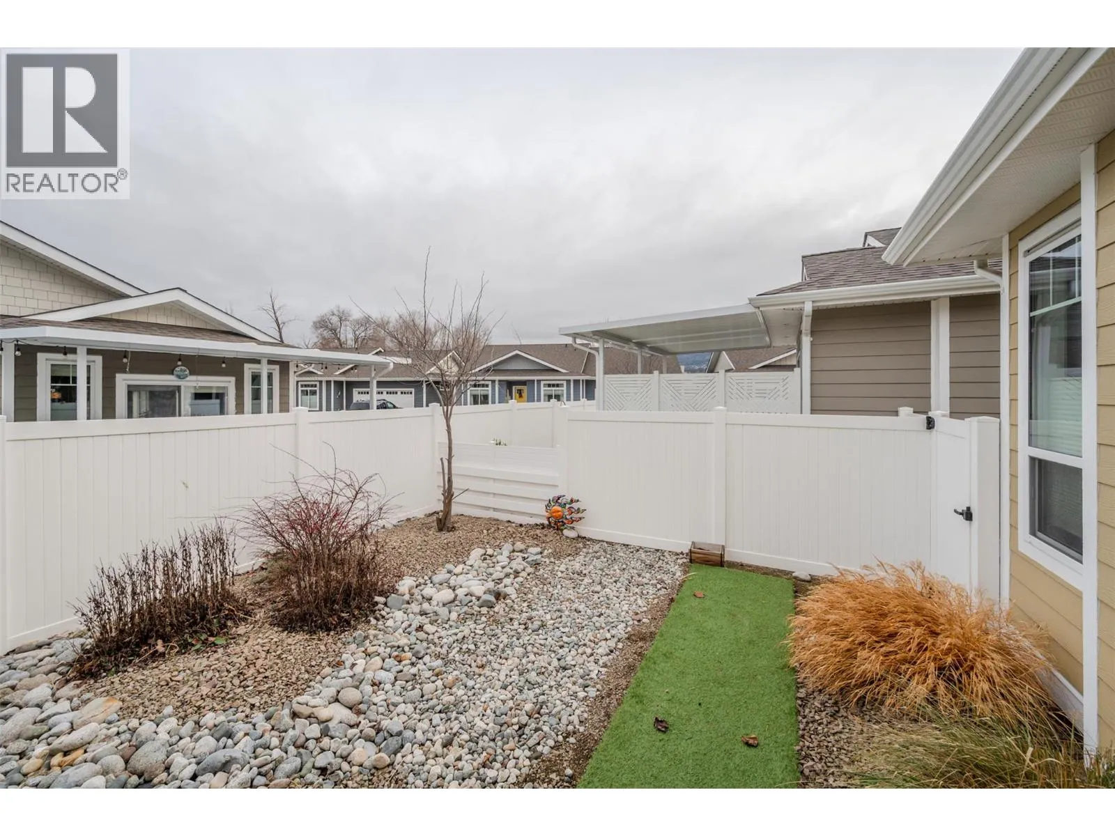 Bright and spacious well appointed two bedroom, two full bathroom unit located in one of Penticton's most desirable developments, The Bow. This one level rancher offers an airy open concept living space with tons of windows and features custom blinds that can go all the way up, all the way down or partial up or down for privacy and letting the light in. The kitchen includes a large island with room for seating, great counter space, and tons of storage. The large living room offers the coziness of the electric fireplace and has access to the beautiful outdoor space. Outside you can enjoy the covered deck as well as the low maintenance, easy care yard that looks great, even while you are away travelling. The attached single garage means no more parking in the elements! The huge primary bedroom has a walk in closet, and a private ensuite with two sinks and a step in shower. The second bedroom is at the opposite end of this home, next to the main bathroom. Living at The Bow offers access to the clubhouse that can be booked for private engagements, an active social committee, a great walking path, centrally located to shopping and onsite property management. This development welcomes all agents and allows pets with approval. Check out the virtual tour online and book your private tour today! (id:27476)