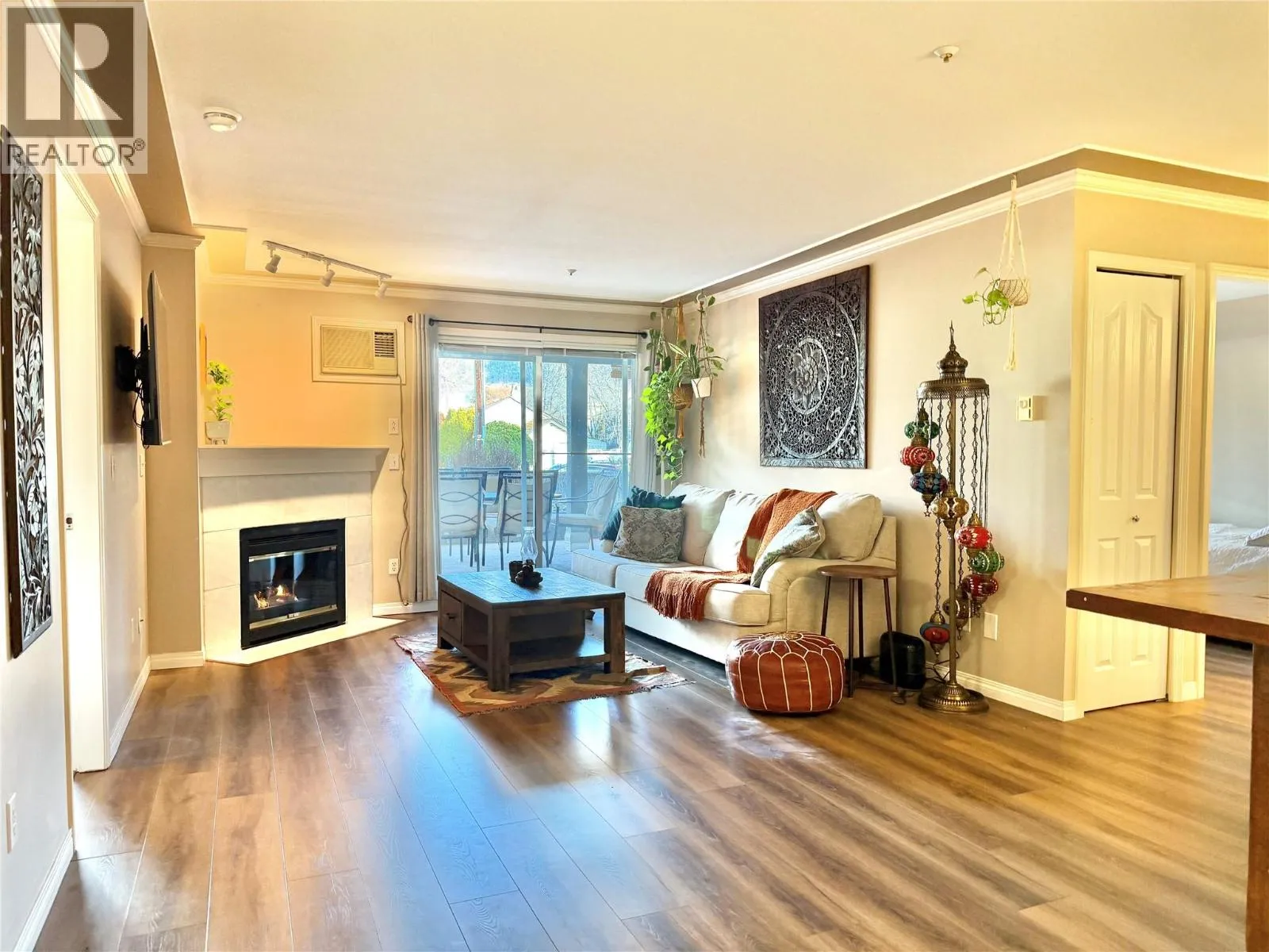 Discover the perfect urban retreat with this spacious 1,001-square-foot, two-bedroom, two-bathroom residence situated in an awesome location just steps from vibrant coffee shops, local breweries, and the beautiful shores of Okanagan Lake. This home features an incredibly smart floor plan where the bedrooms are separated by a large, open living and dining area to ensure maximum privacy and flow. The interior has been thoughtfully updated with recently upgraded flooring, fresh paint, and modern lighting fixtures throughout, making it entirely move-in ready. One of the most impressive features of this home is the massive covered patio, which is accessible via sliding glass doors from both bedrooms as well as the main living room. This outdoor oasis includes a natural gas hookup for your barbecue, while the cozy indoor gas fireplace is conveniently included in your strata fee to help keep living costs predictable. Residents also benefit from the peace of mind provided by secure underground parking in a well-maintained building. This professionally managed complex is perfect for investors or those seeking a quiet lifestyle, as rentals are permitted. While the building remains a no-pet community, the proximity to downtown amenities and the lakefront makes it a premier choice for anyone looking to enjoy the best of the Okanagan lifestyle. (id:27476)