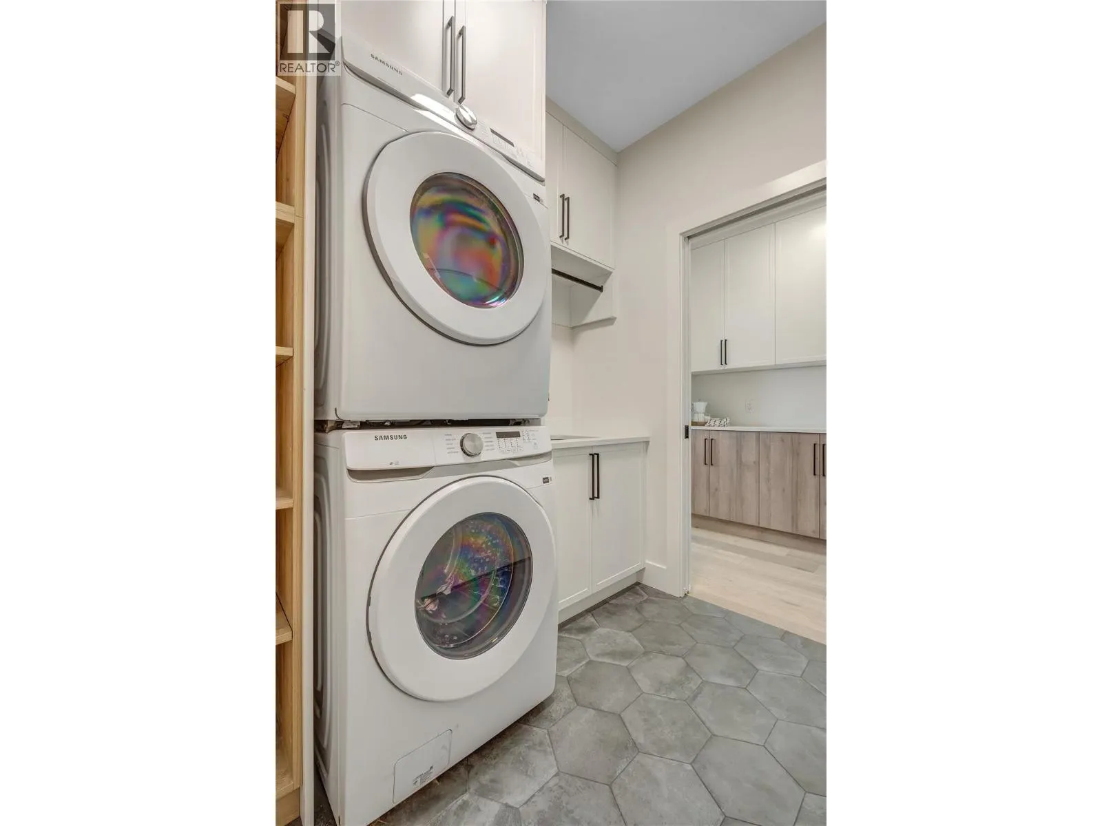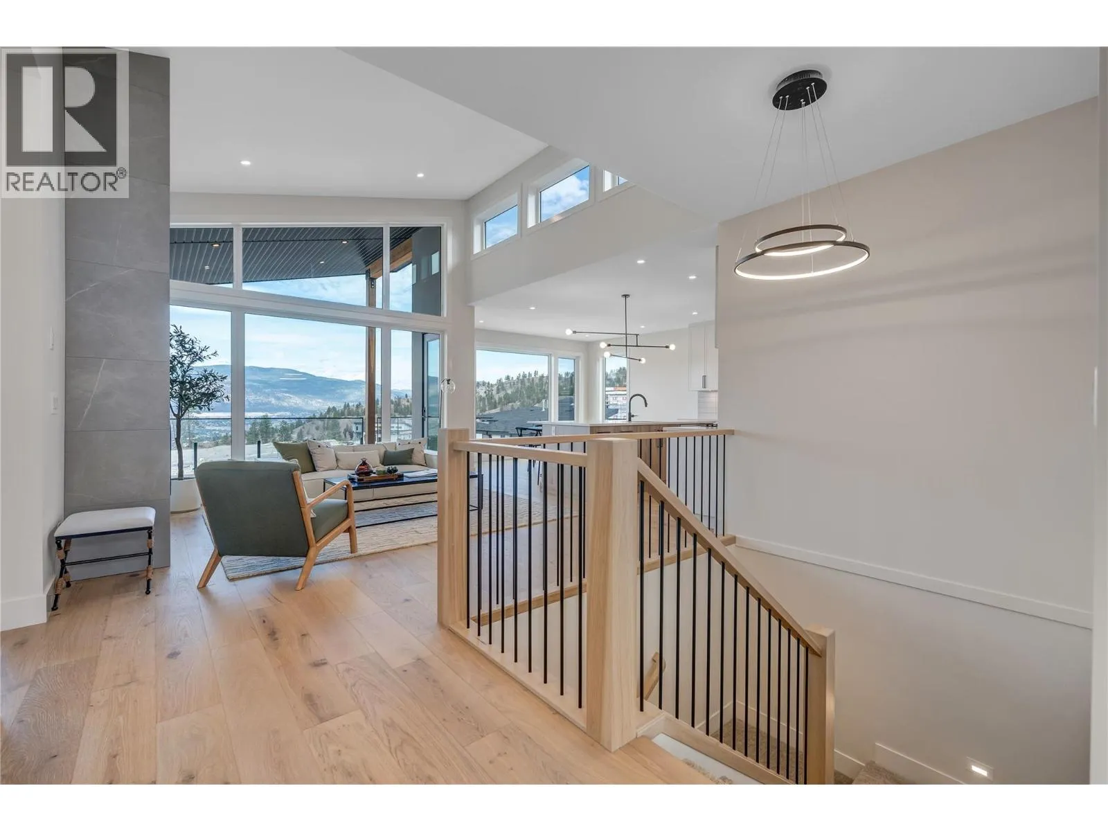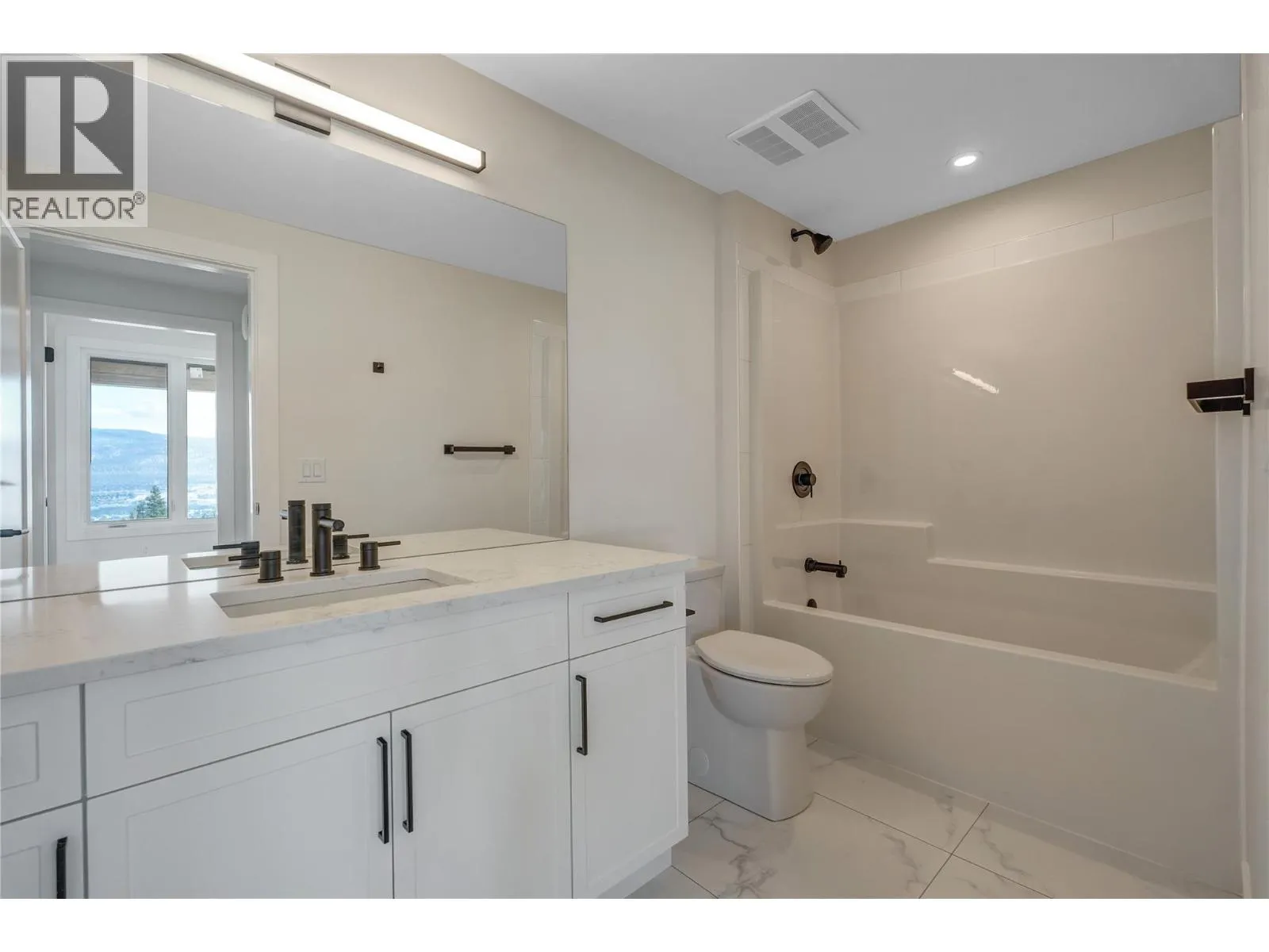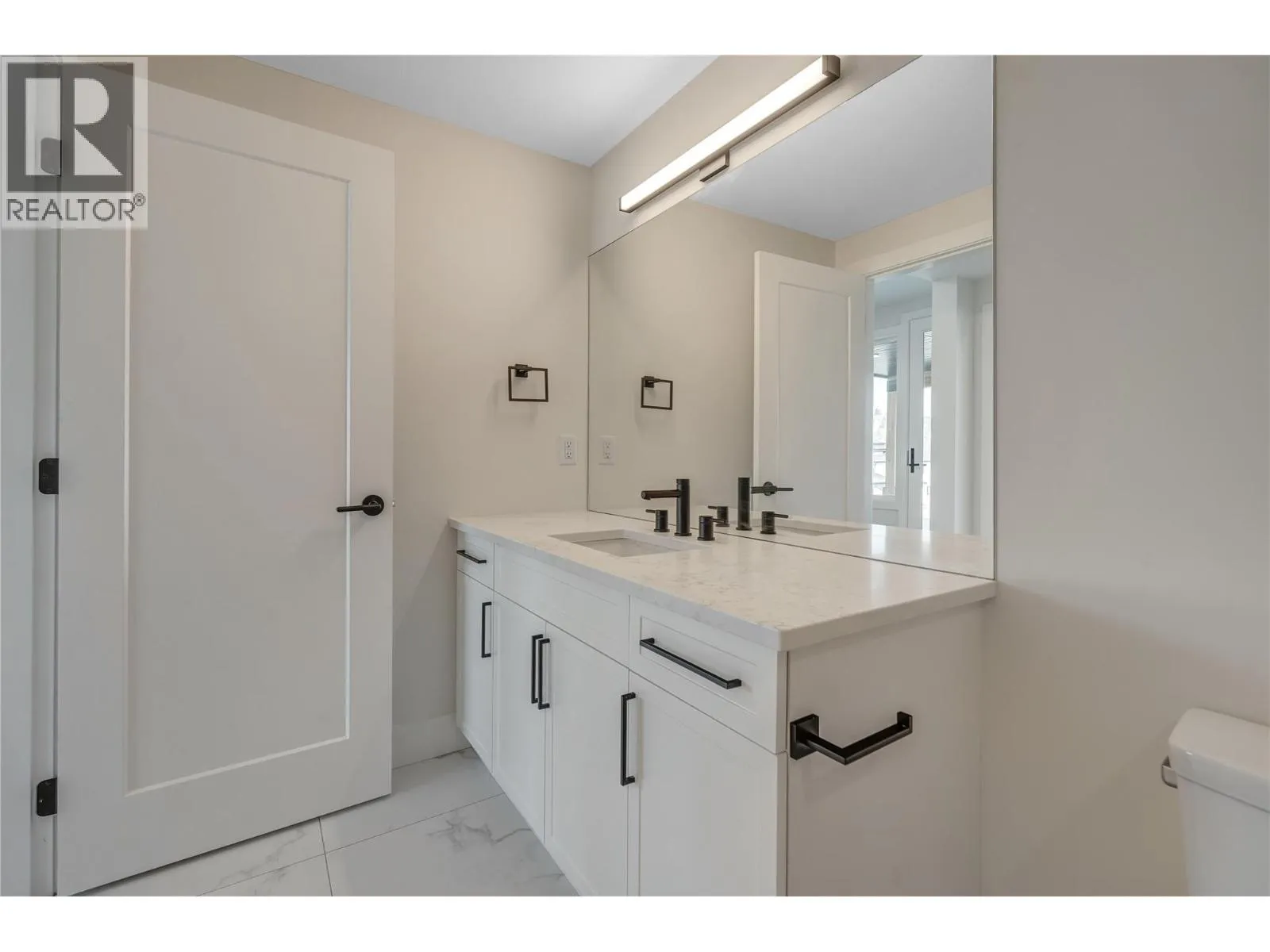 Luxurious family home with legal walk-out suite. Welcome to this stunning 2400+ square foot home in the highly sought-after The Ridge Penticton neighborhood. Blending modern design with functional living spaces, this home is perfect for families or those seeking rental income. The main house includes 3 bedrooms and 2 1/2 baths in a thoughtfully designed open-concept layout. The living area features beautiful white oak engineered hardwood flooring, while the ensuite bathroom features matte porcelain tile. The vaulted ceilings enhance the airy and spacious feel of the home. The kitchen is equipped with quartz countertops, custom cabinetry, and high-end Bosch appliances, including a gas range. For added convenience, the Samsung washer and dryer are located in a multifunctional mudroom/laundry room, which has private access from the 2-car garage. A fully carpeted staircase leads to the lower level, continuing into the hallway and one of the bedrooms. The legal walk-out basement suite offers 2 bedrooms and 1 bathroom, making it perfect for long or short-term rentals following the updated provincial legislation. The suite has laminate flooring in the main living area, a private entrance from the street with stair access, a spacious 200+ square foot covered patio and an in-suite laundry. Located in a peaceful neighborhood with access to local amenities, parks, and schools, this property also offers excellent rental potential with its legal suite. (id:27476)