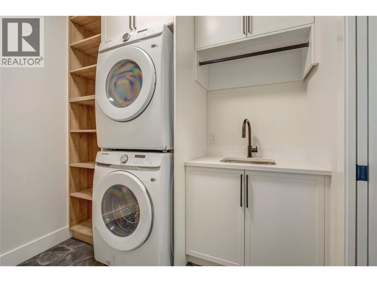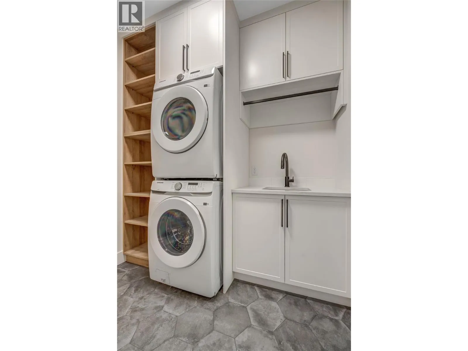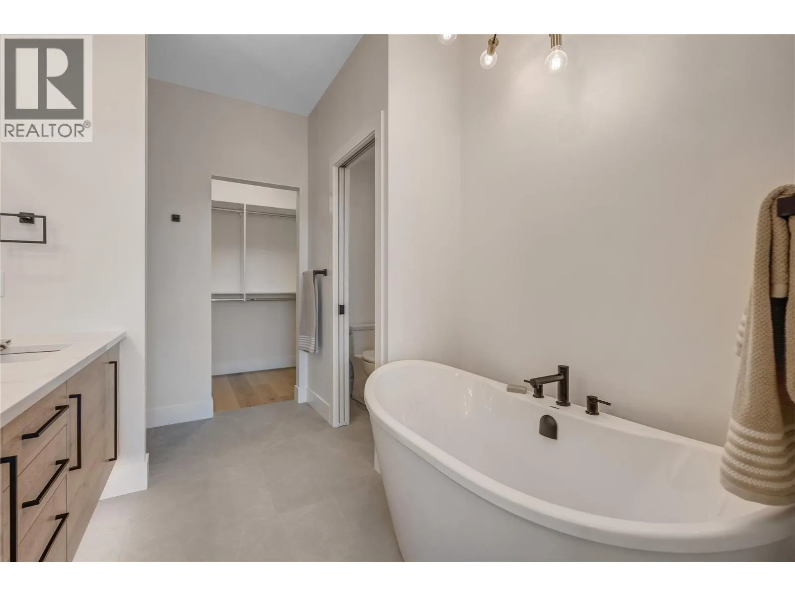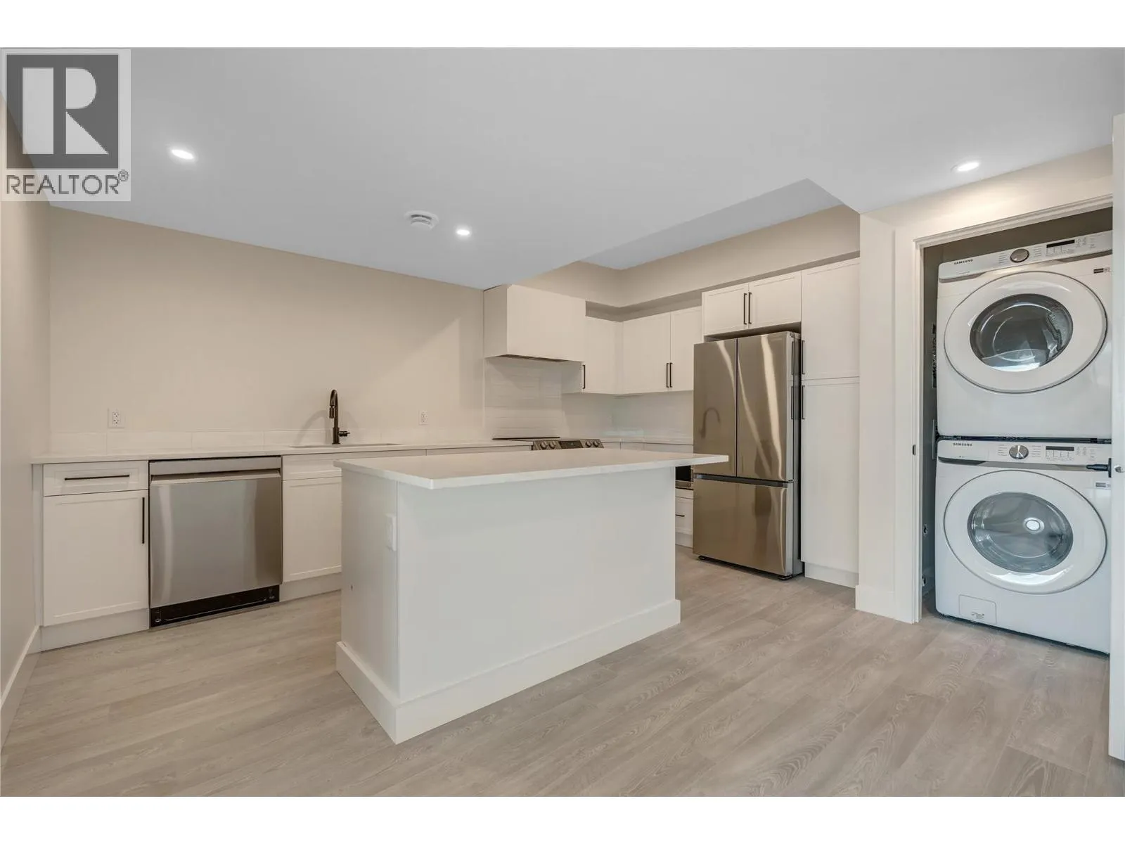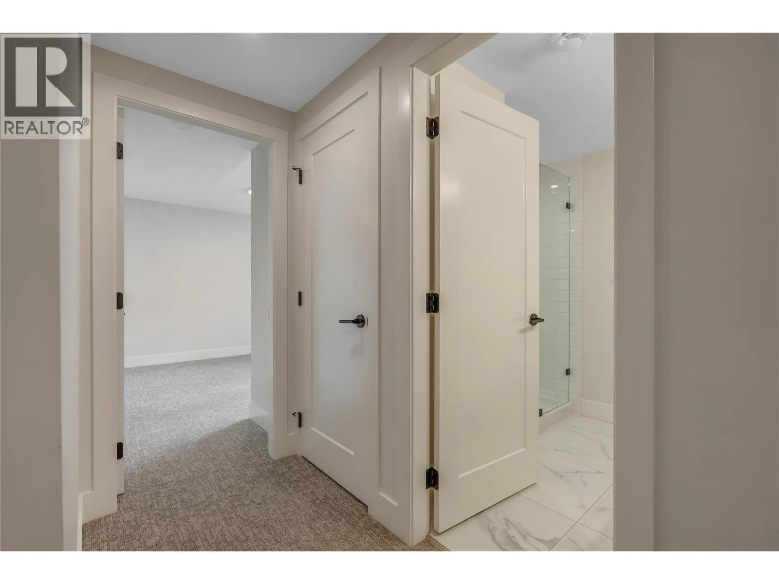 Luxurious family home with legal walk-out suite. Welcome to this stunning 2400+ square foot home in the highly sought-after The Ridge Penticton neighborhood. Blending modern design with functional living spaces, this home is perfect for families or those seeking rental income. The main house includes 3 bedrooms and 2 1/2 baths in a thoughtfully designed open-concept layout. The living area features beautiful white oak engineered hardwood flooring, while the ensuite bathroom features matte porcelain tile. The vaulted ceilings enhance the airy and spacious feel of the home. The kitchen is equipped with quartz countertops, custom cabinetry, and high-end Bosch appliances, including a gas range. For added convenience, the Samsung washer and dryer are located in a multifunctional mudroom/laundry room, which has private access from the 2-car garage. A fully carpeted staircase leads to the lower level, continuing into the hallway and one of the bedrooms. The legal walk-out basement suite offers 2 bedrooms and 1 bathroom, making it perfect for long or short-term rentals following the updated provincial legislation. The suite has laminate flooring in the main living area, a private entrance from the street with stair access, a spacious 200+ square foot covered patio and an in-suite laundry. Located in a peaceful neighborhood with access to local amenities, parks, and schools, this property also offers excellent rental potential with its legal suite. (id:27476)