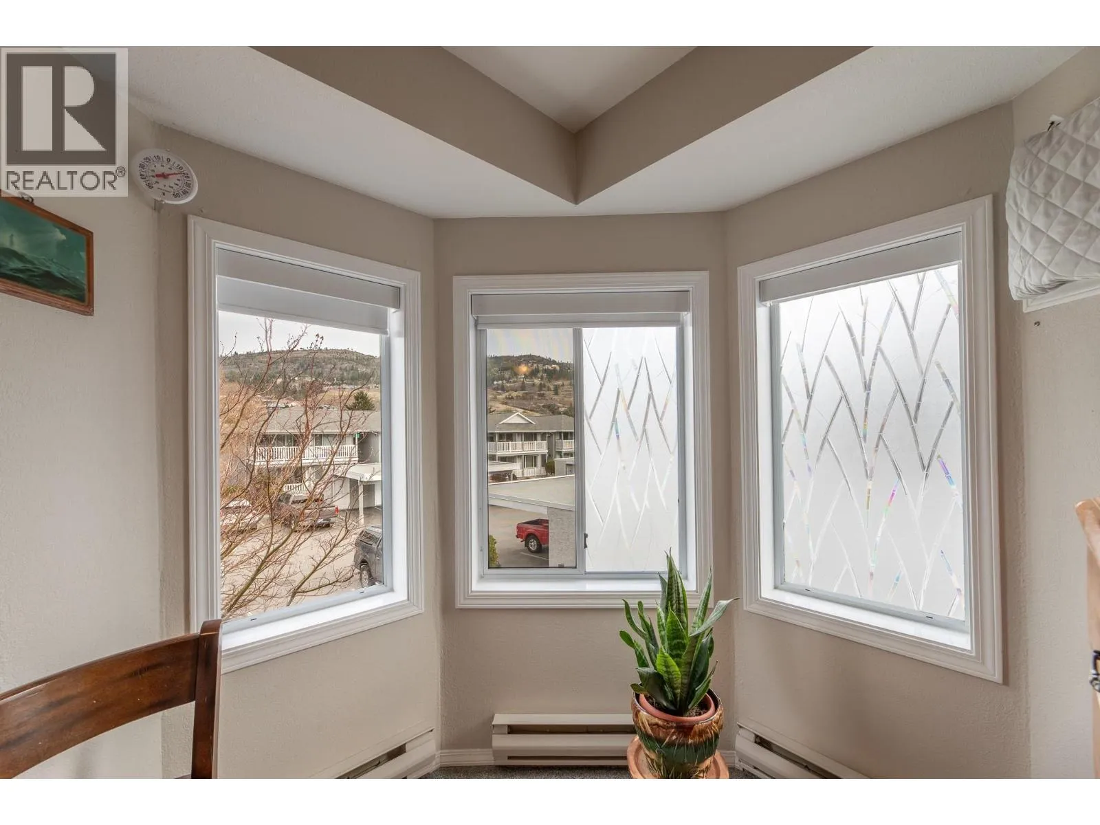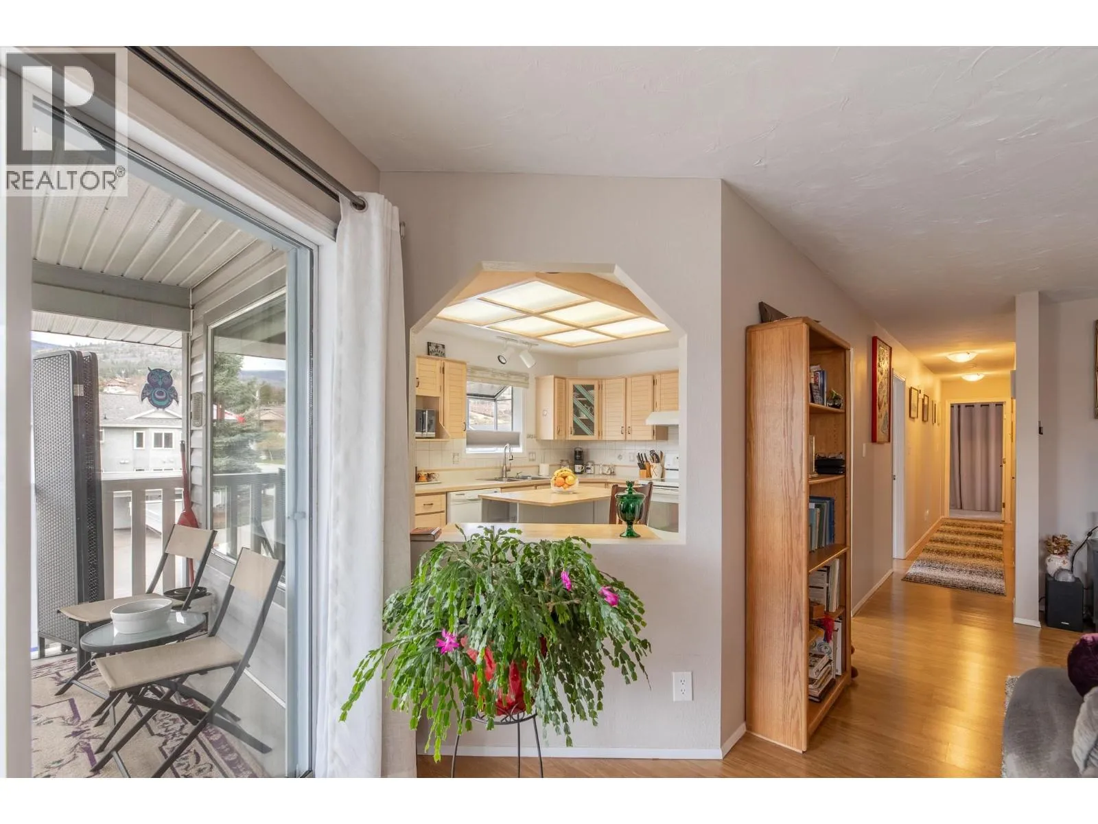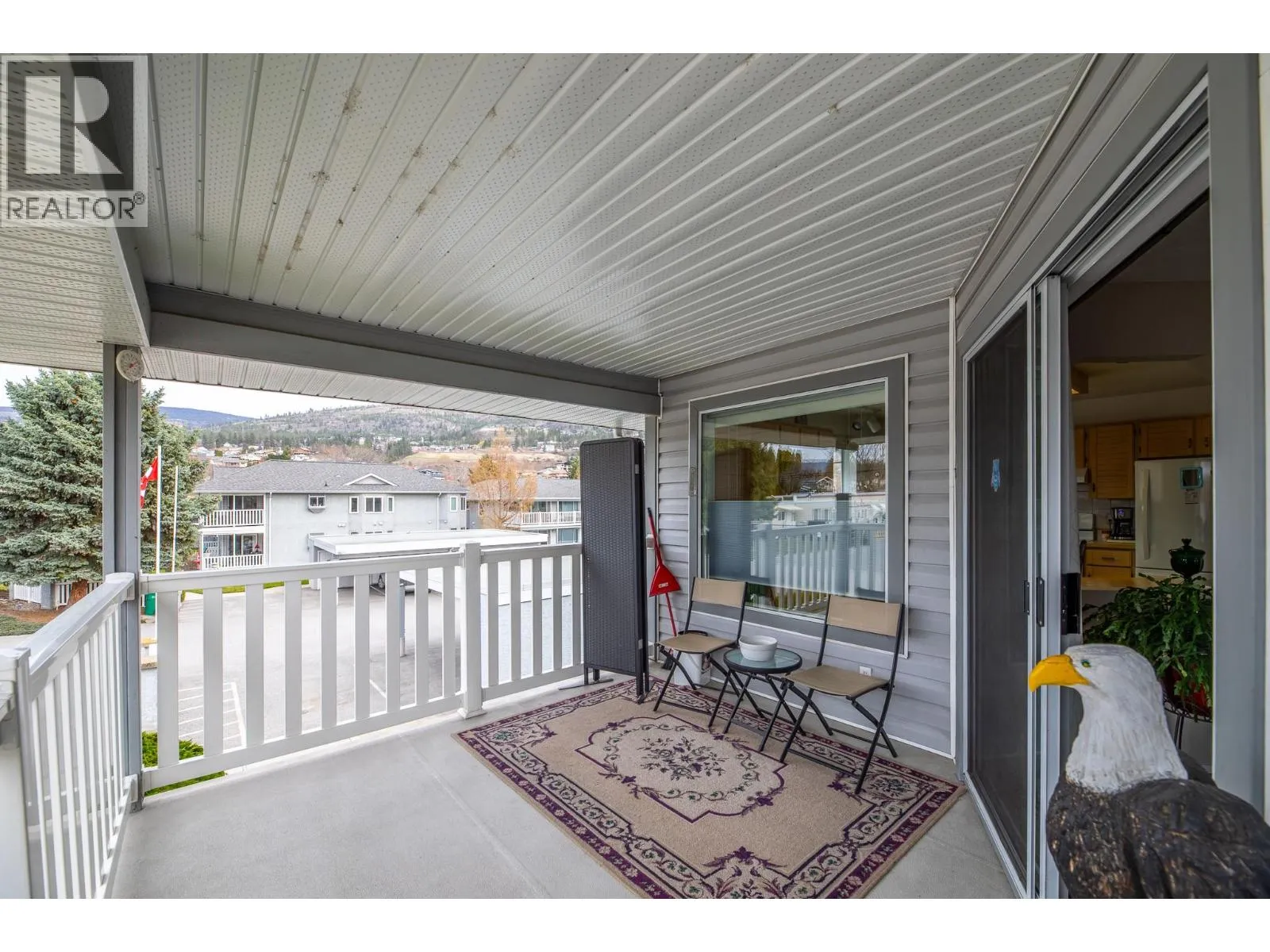 Spacious second-storey unit offering 2 bedrooms and 2 bathrooms, featuring an open and inviting living space. The kitchen is filled with natural light and features a convenient island, along with a charming bay window over the sink that frames beautiful mountain views. Step outside to a covered deck, ideal for relaxing or entertaining. This well-positioned home offers the rare benefit of no shared walls, providing added privacy. Blossom Court is well-maintained strata complex that boasts beautifully manicured grounds, all set on a peaceful, low-traffic street. Conveniently located just minutes from Skaha Lake Park and with easy access to nearby shopping and amenities. Additional features include a covered parking space with a storage unit near by. This is a 55+ community, pet-free, offering a quiet and peaceful lifestyle! (id:27476)