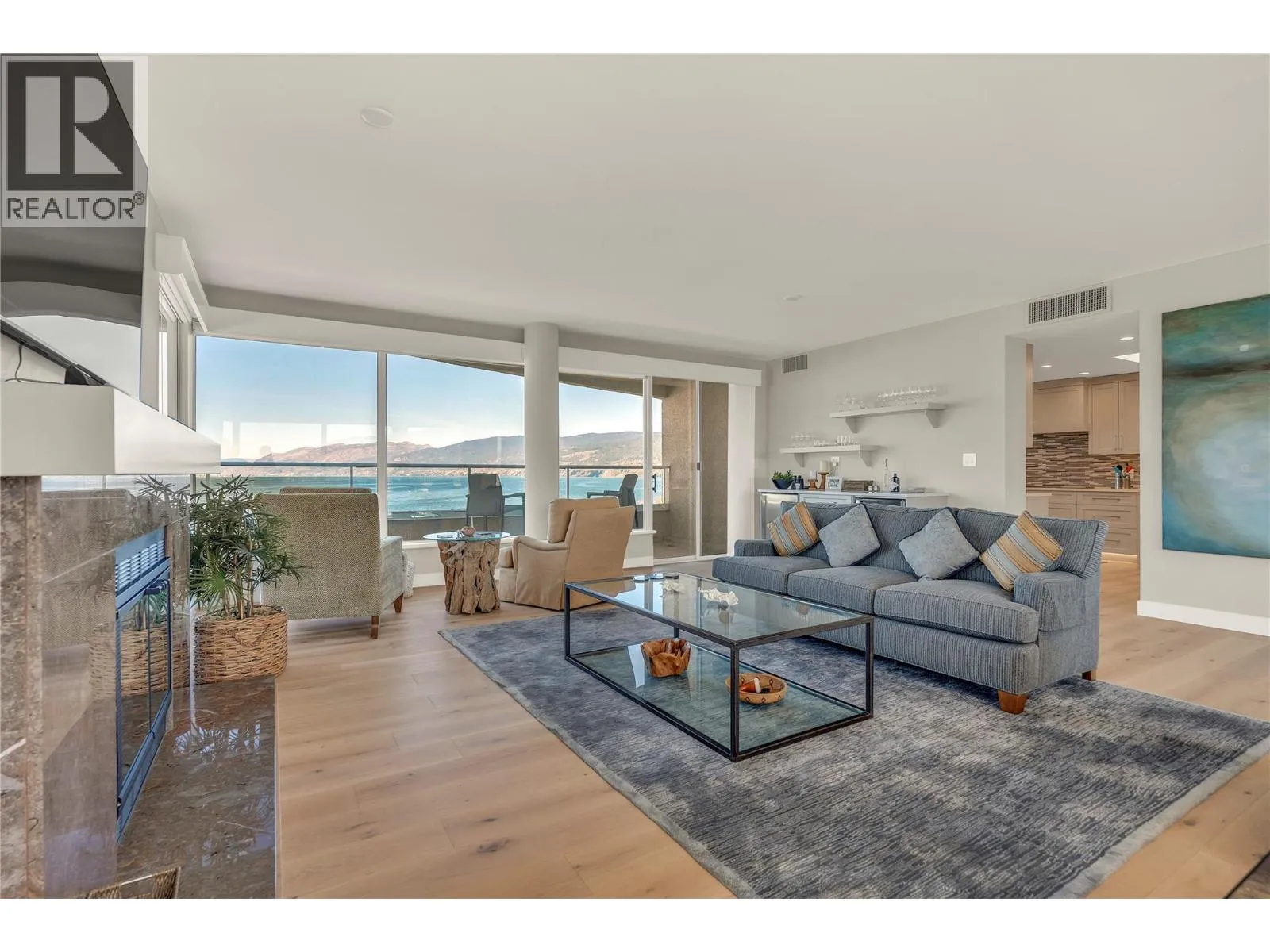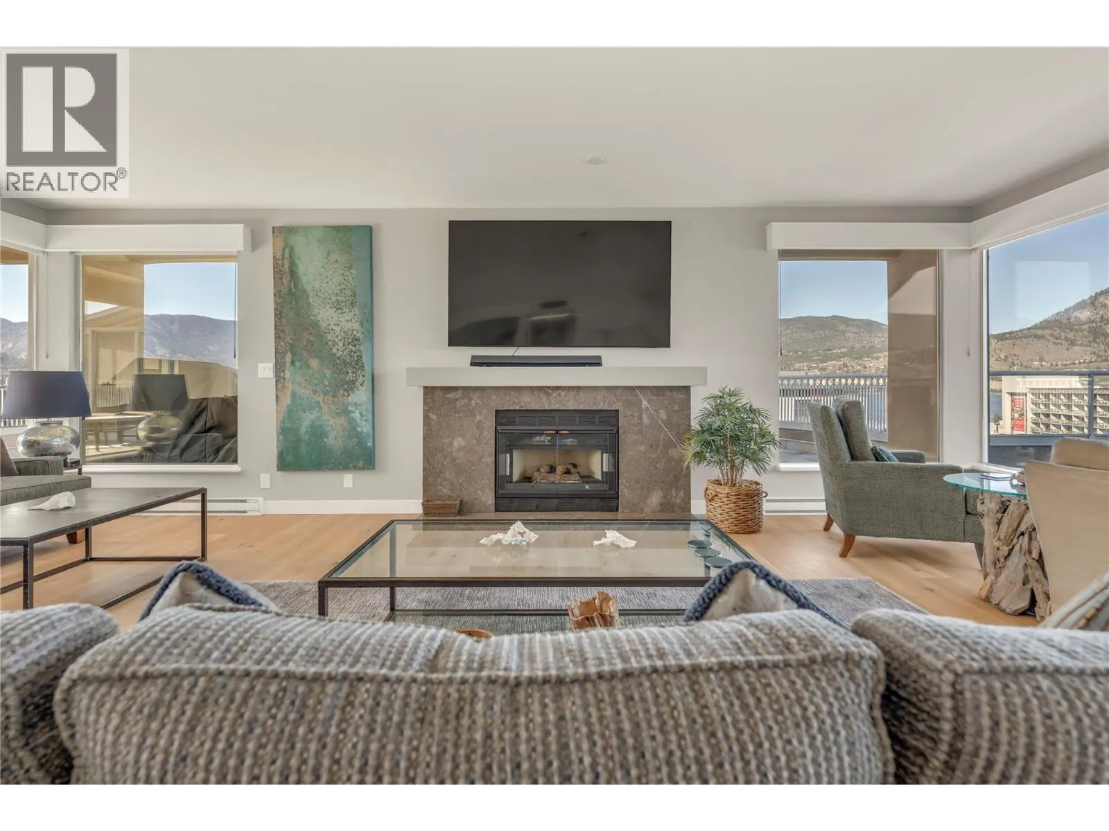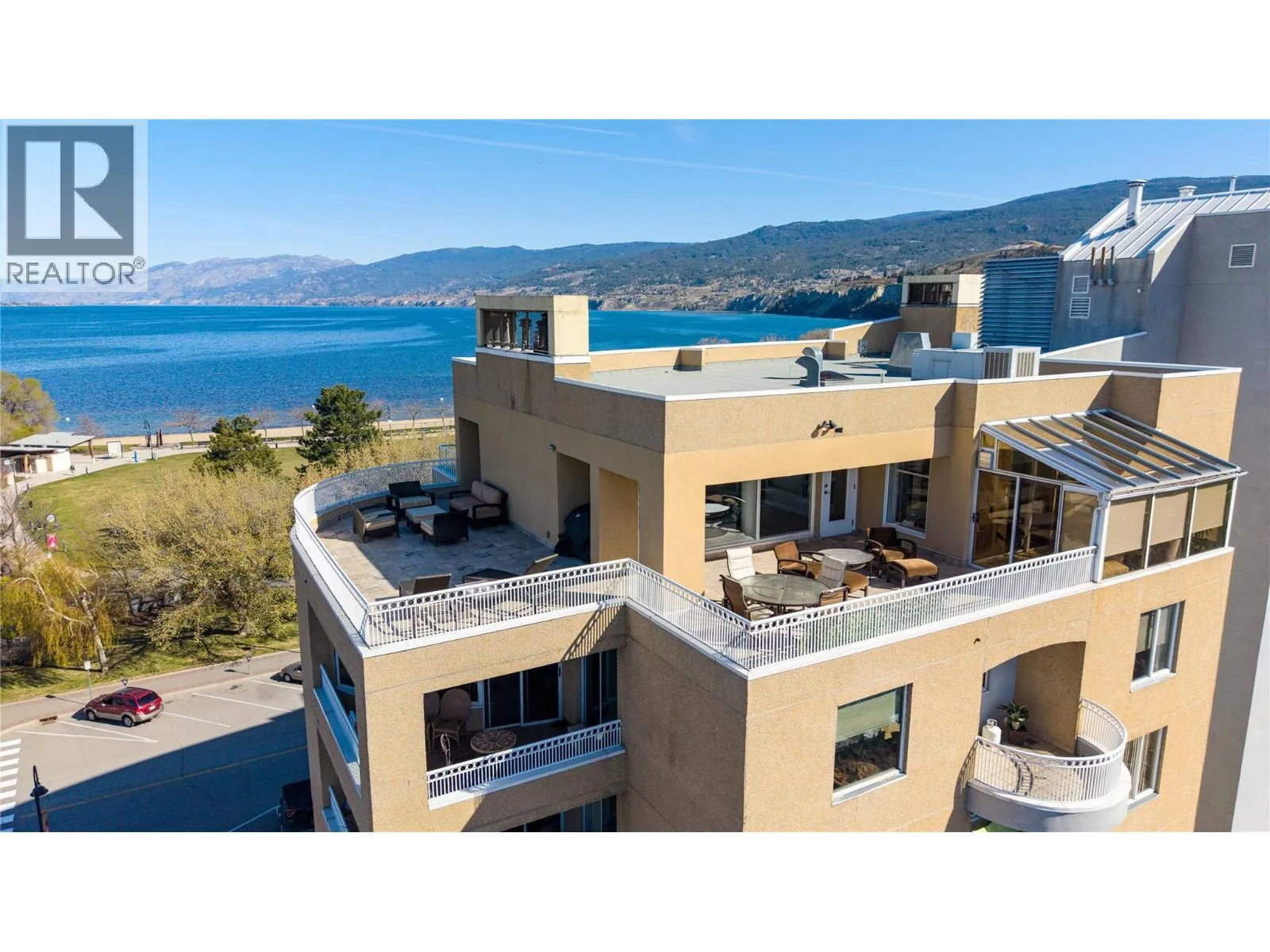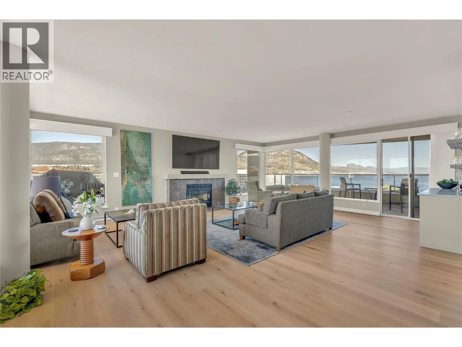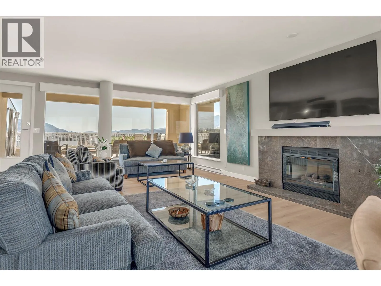 Perfectly positioned in one of Pentictonâs most sought after addresses, this gorgeous penthouse at 86 Lakeshore Drive delivers a truly rare offering, unobstructed, panoramic views spanning Okanagan Lake, the City of Penticton, and the surrounding mountains from every window. With over 1,200 sq.ft. of wraparound deck, this is a front row seat to the Okanagan lifestyle. Beautifully updated throughout, this home showcases a stunning custom kitchen with quartz countertops, premium stainless appliances, and seamless flow to a sunlit nook with direct access to the lakeview deck. New flooring carries throughout into an expansive living space anchored by a gas fireplace, bar with wine and beverage fridges, and walls of glass framing breathtaking views in every direction. The layout is both functional and refined, offering a den/office, sunroom, an impressive primary retreat with walk-in closet, full ensuite, and direct deck access, plus a spacious second bedroom with its own ensuite and equally stunning views. Set directly across from the beach, park, and Okanagan lake, this exclusive 55+ residence includes two secure underground parking stalls and storage. This is more than a home, itâs penthouse living at its finest. (id:27476)