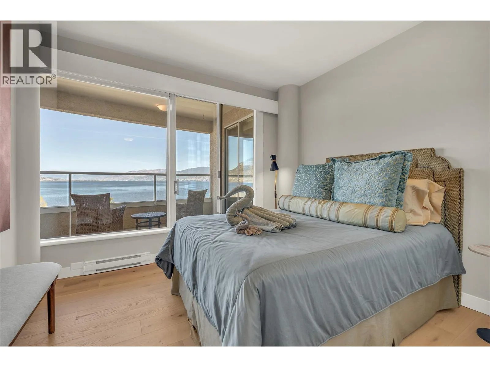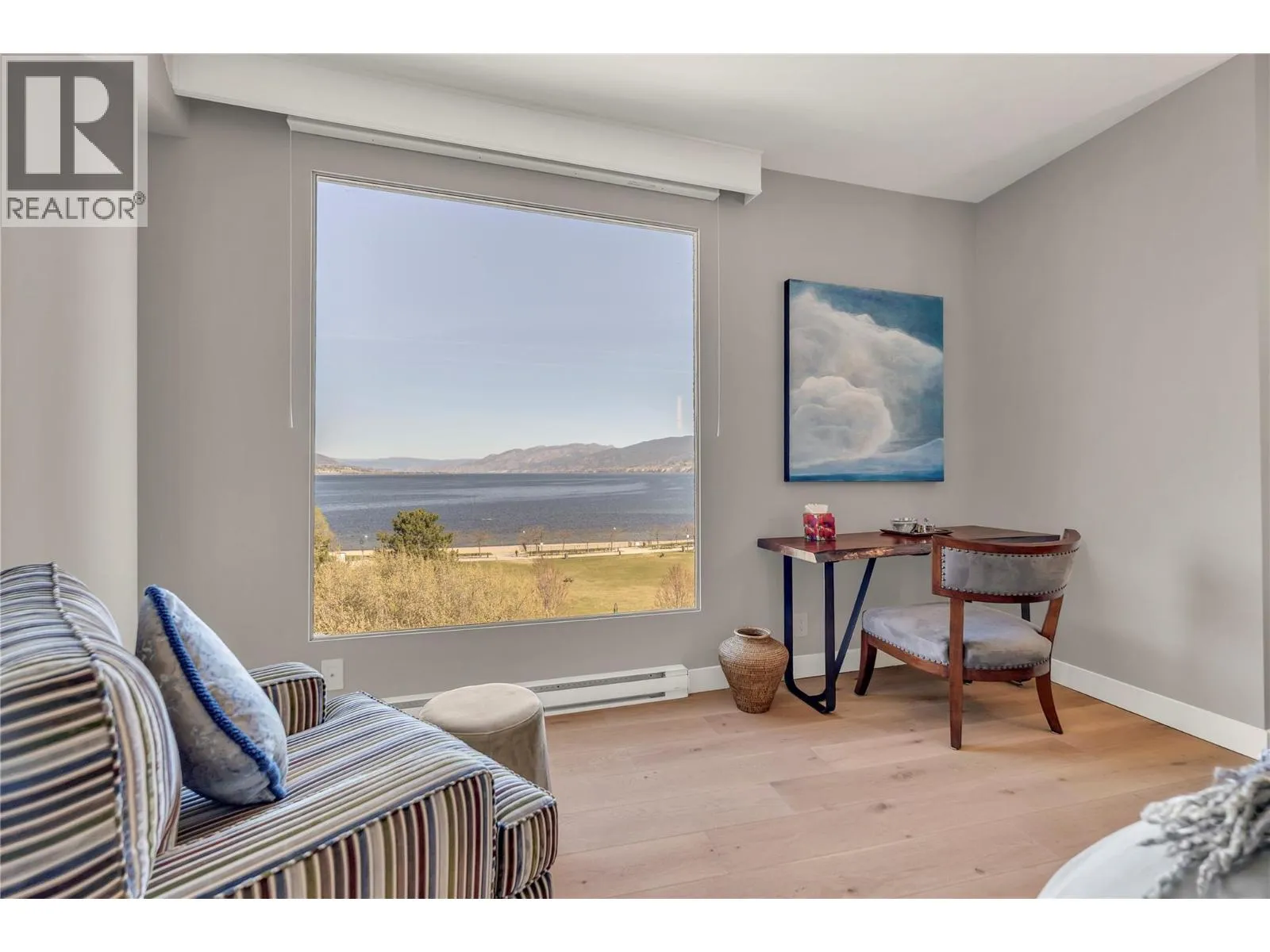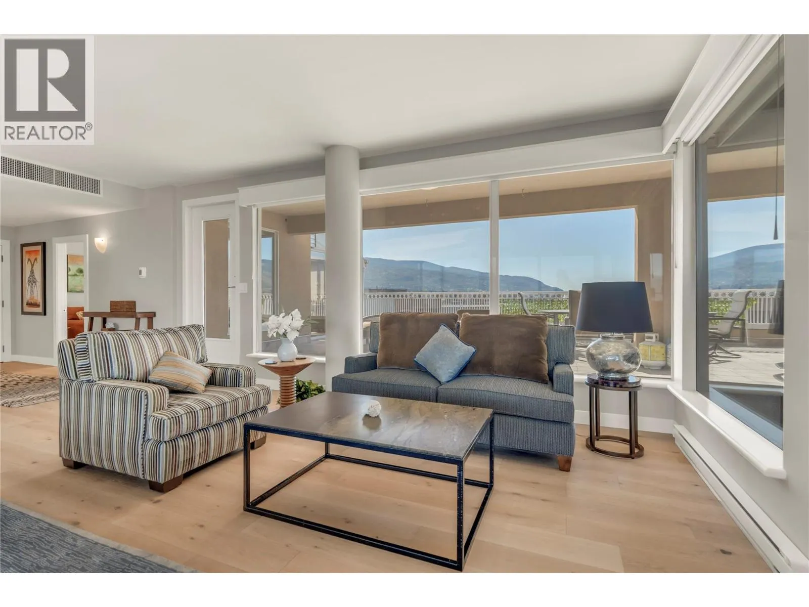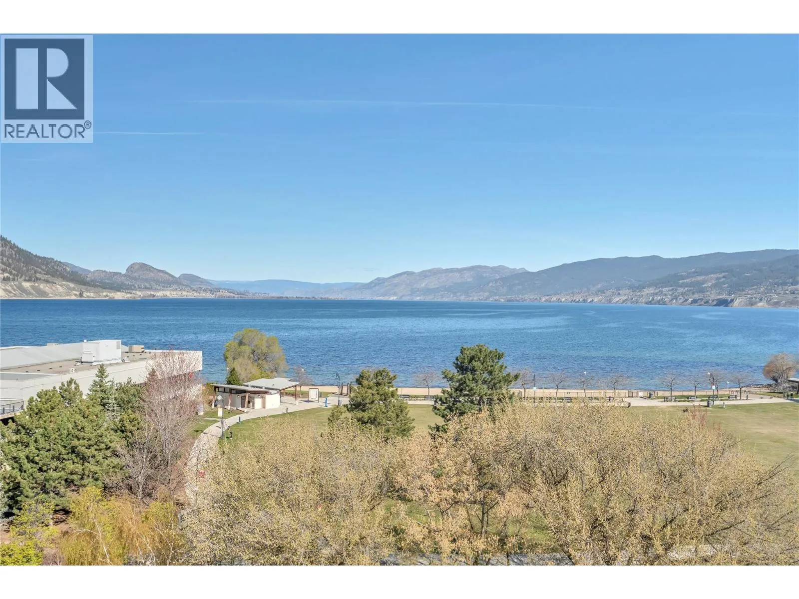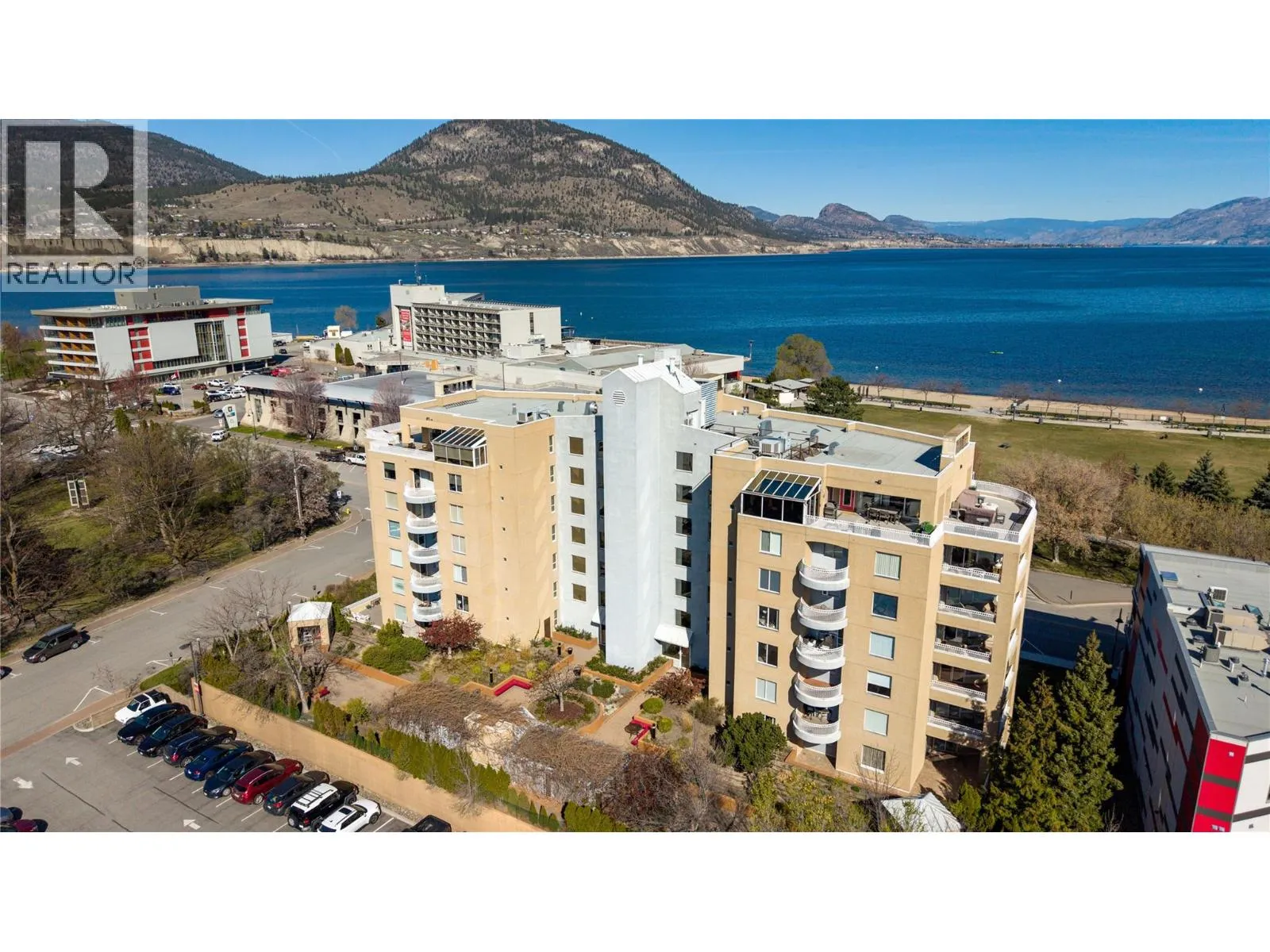 Perfectly positioned in one of Pentictonâs most sought after addresses, this gorgeous penthouse at 86 Lakeshore Drive delivers a truly rare offering, unobstructed, panoramic views spanning Okanagan Lake, the City of Penticton, and the surrounding mountains from every window. With over 1,200 sq.ft. of wraparound deck, this is a front row seat to the Okanagan lifestyle. Beautifully updated throughout, this home showcases a stunning custom kitchen with quartz countertops, premium stainless appliances, and seamless flow to a sunlit nook with direct access to the lakeview deck. New flooring carries throughout into an expansive living space anchored by a gas fireplace, bar with wine and beverage fridges, and walls of glass framing breathtaking views in every direction. The layout is both functional and refined, offering a den/office, sunroom, an impressive primary retreat with walk-in closet, full ensuite, and direct deck access, plus a spacious second bedroom with its own ensuite and equally stunning views. Set directly across from the beach, park, and Okanagan lake, this exclusive 55+ residence includes two secure underground parking stalls and storage. This is more than a home, itâs penthouse living at its finest. (id:27476)