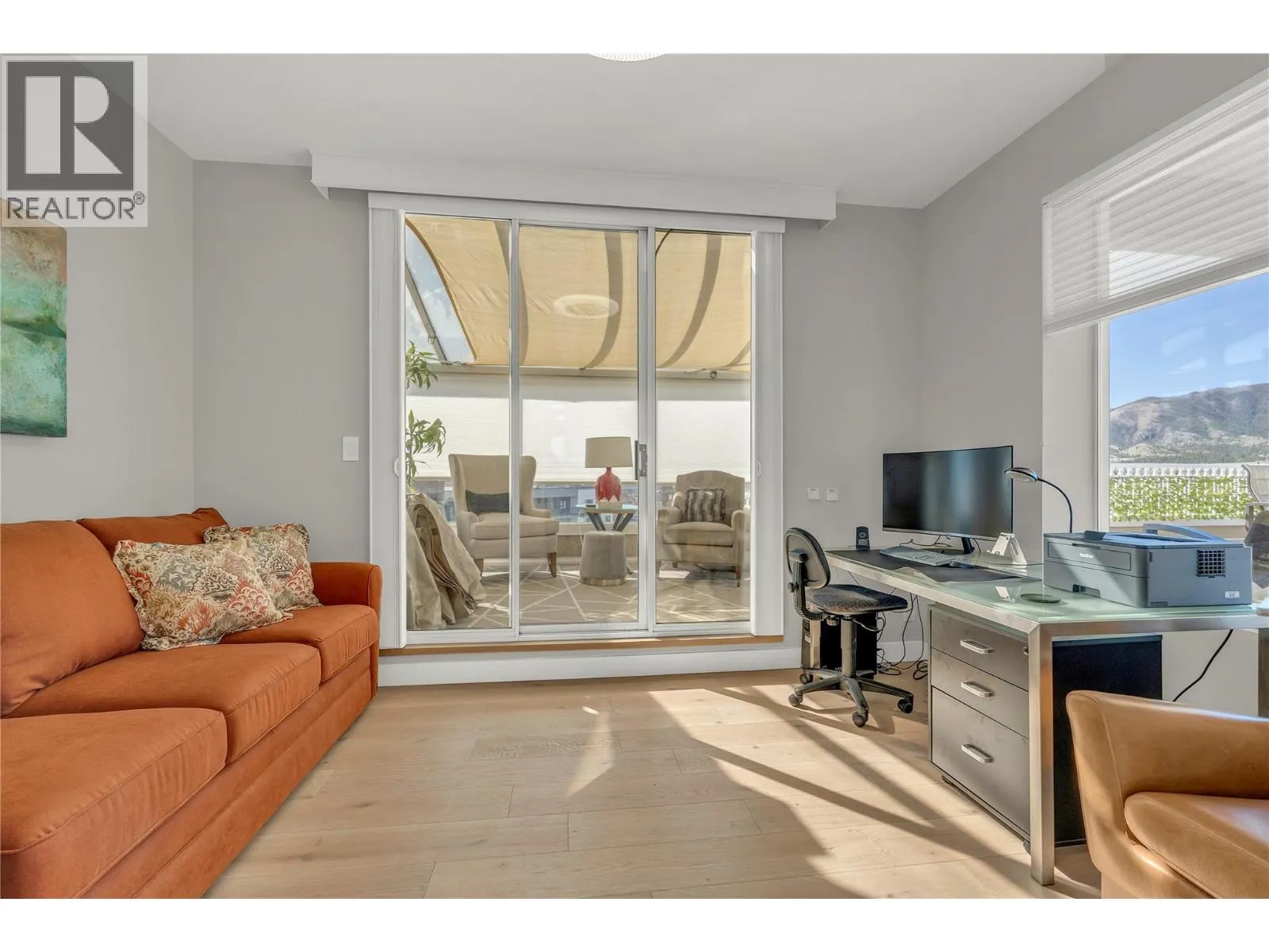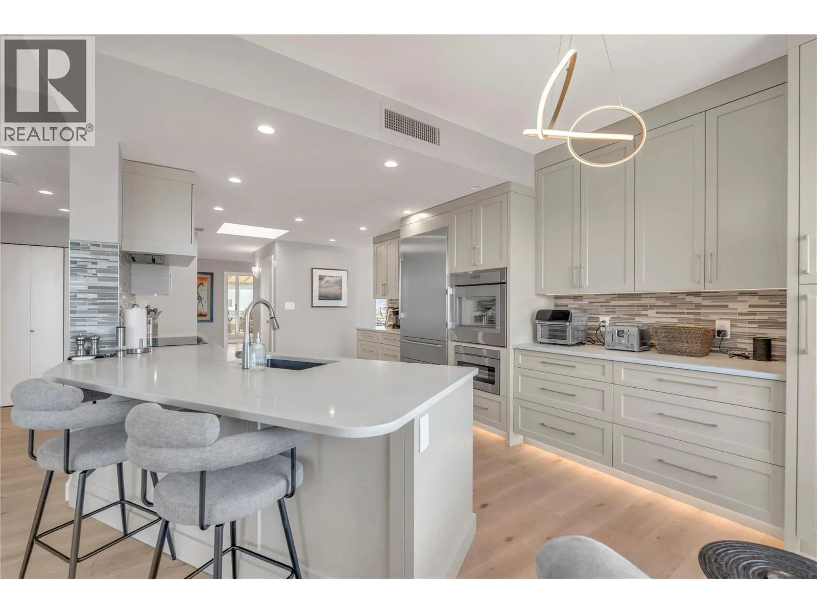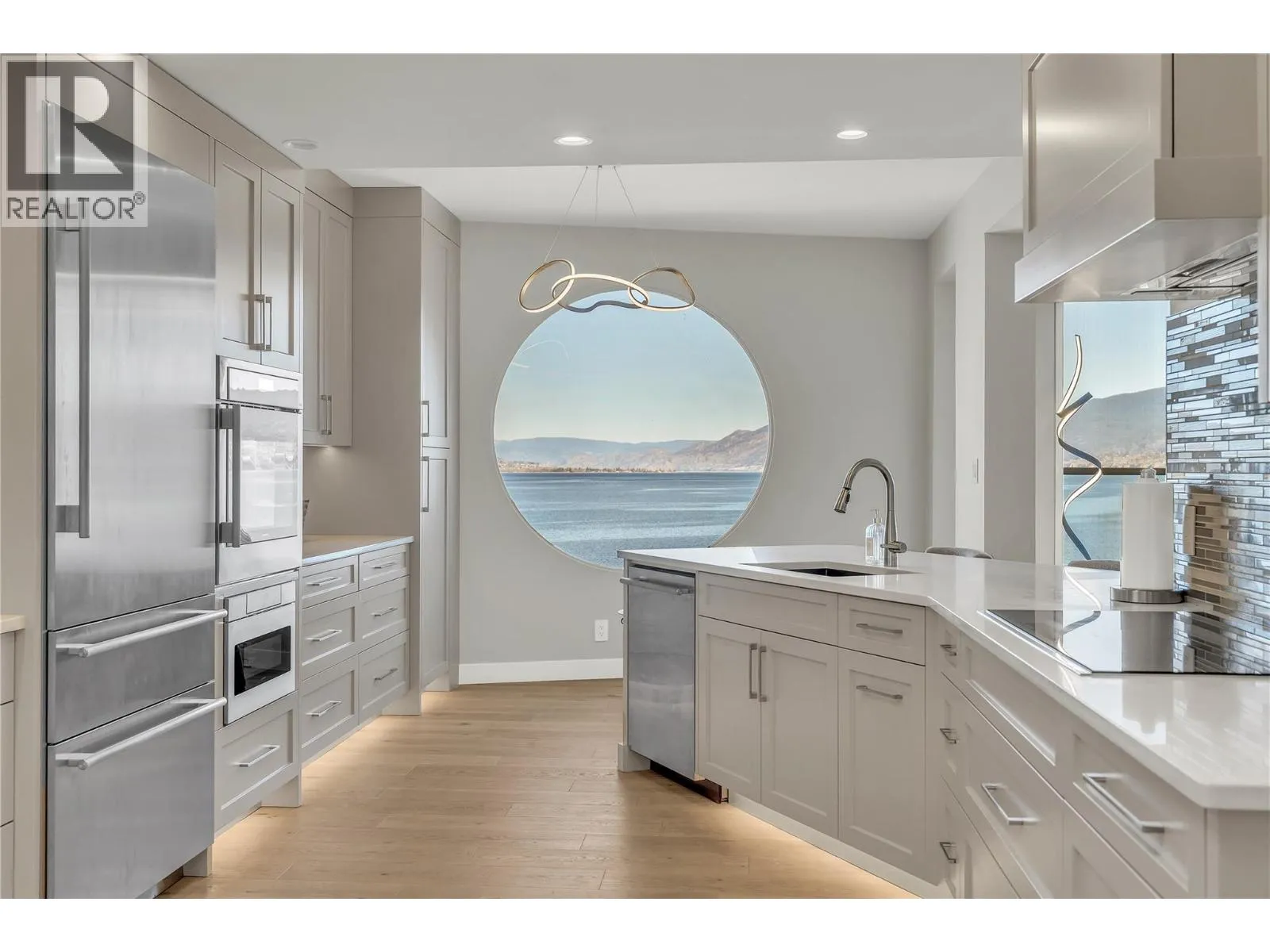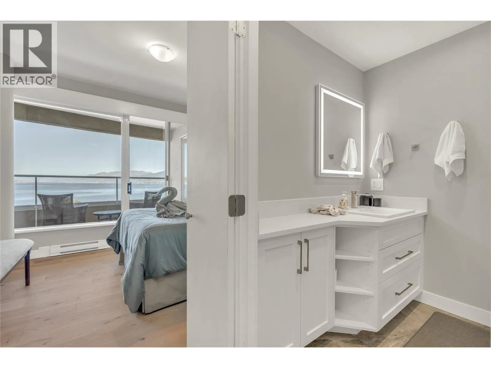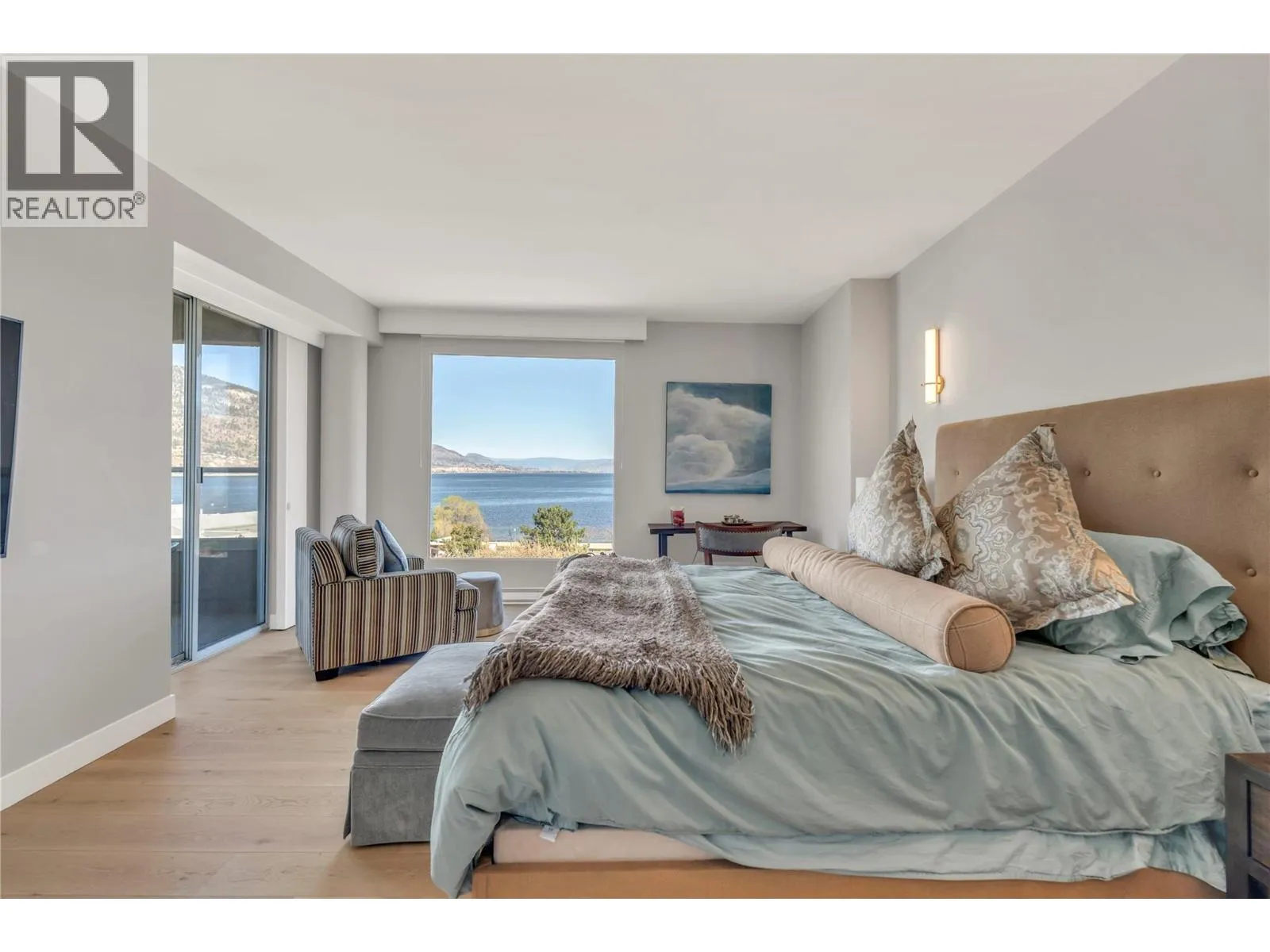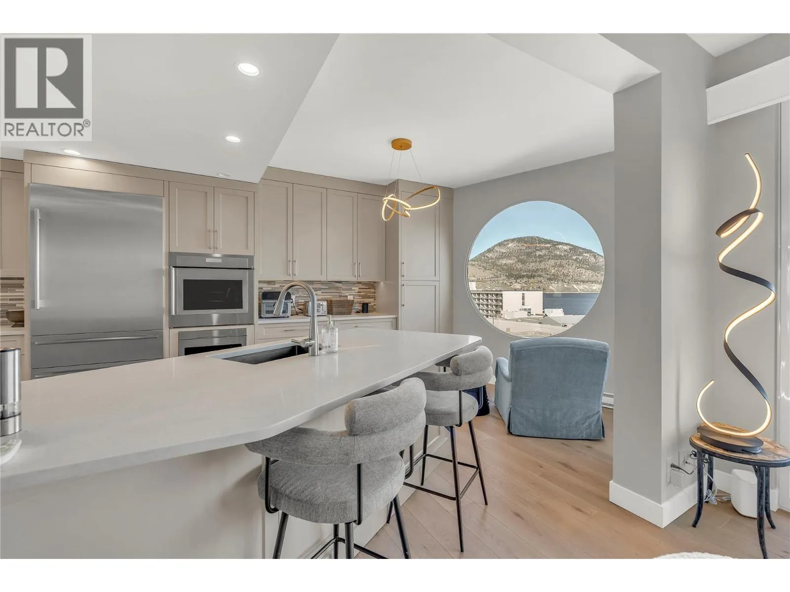 Perfectly positioned in one of Pentictonâs most sought after addresses, this gorgeous penthouse at 86 Lakeshore Drive delivers a truly rare offering, unobstructed, panoramic views spanning Okanagan Lake, the City of Penticton, and the surrounding mountains from every window. With over 1,200 sq.ft. of wraparound deck, this is a front row seat to the Okanagan lifestyle. Beautifully updated throughout, this home showcases a stunning custom kitchen with quartz countertops, premium stainless appliances, and seamless flow to a sunlit nook with direct access to the lakeview deck. New flooring carries throughout into an expansive living space anchored by a gas fireplace, bar with wine and beverage fridges, and walls of glass framing breathtaking views in every direction. The layout is both functional and refined, offering a den/office, sunroom, an impressive primary retreat with walk-in closet, full ensuite, and direct deck access, plus a spacious second bedroom with its own ensuite and equally stunning views. Set directly across from the beach, park, and Okanagan lake, this exclusive 55+ residence includes two secure underground parking stalls and storage. This is more than a home, itâs penthouse living at its finest. (id:27476)