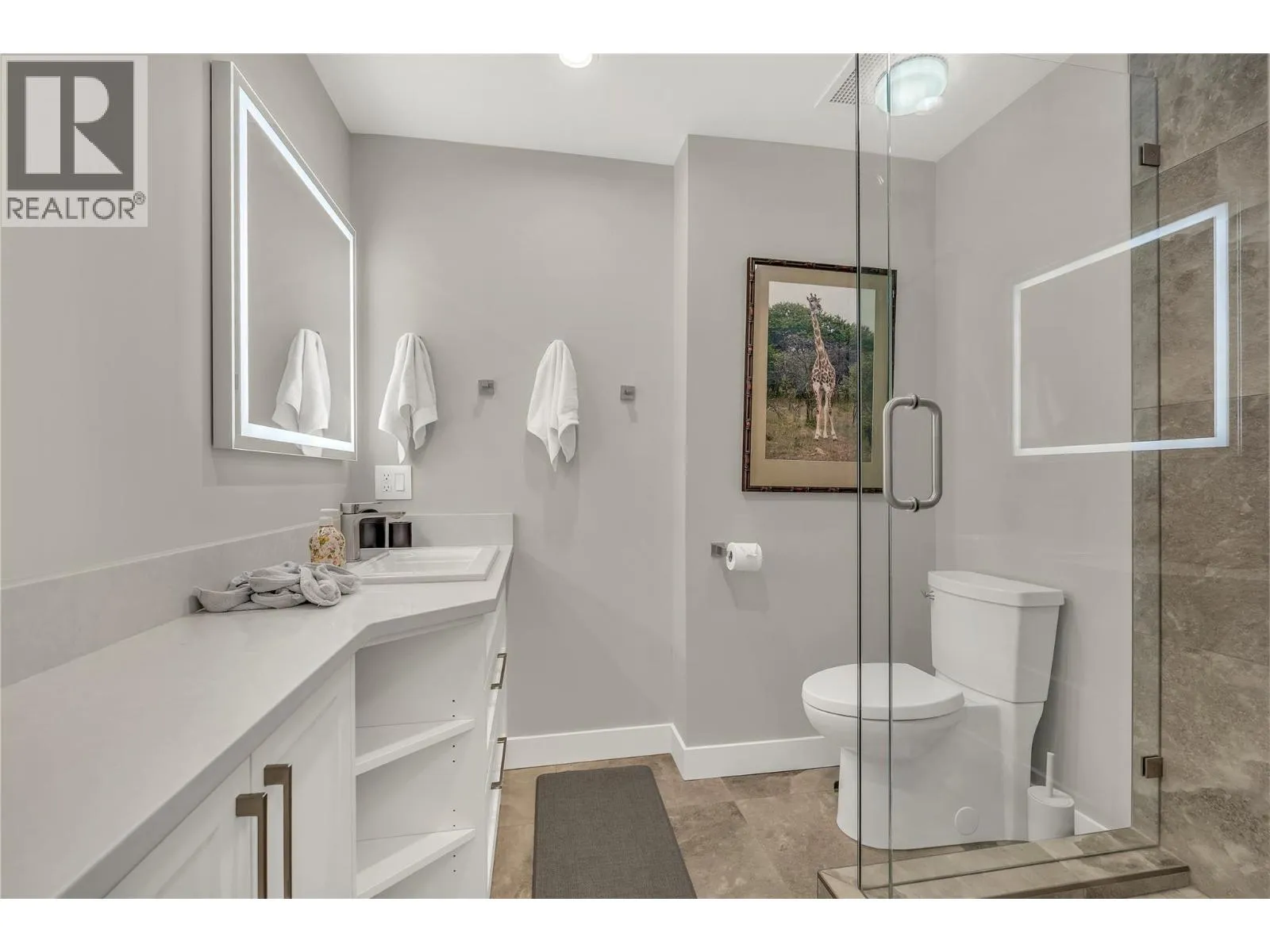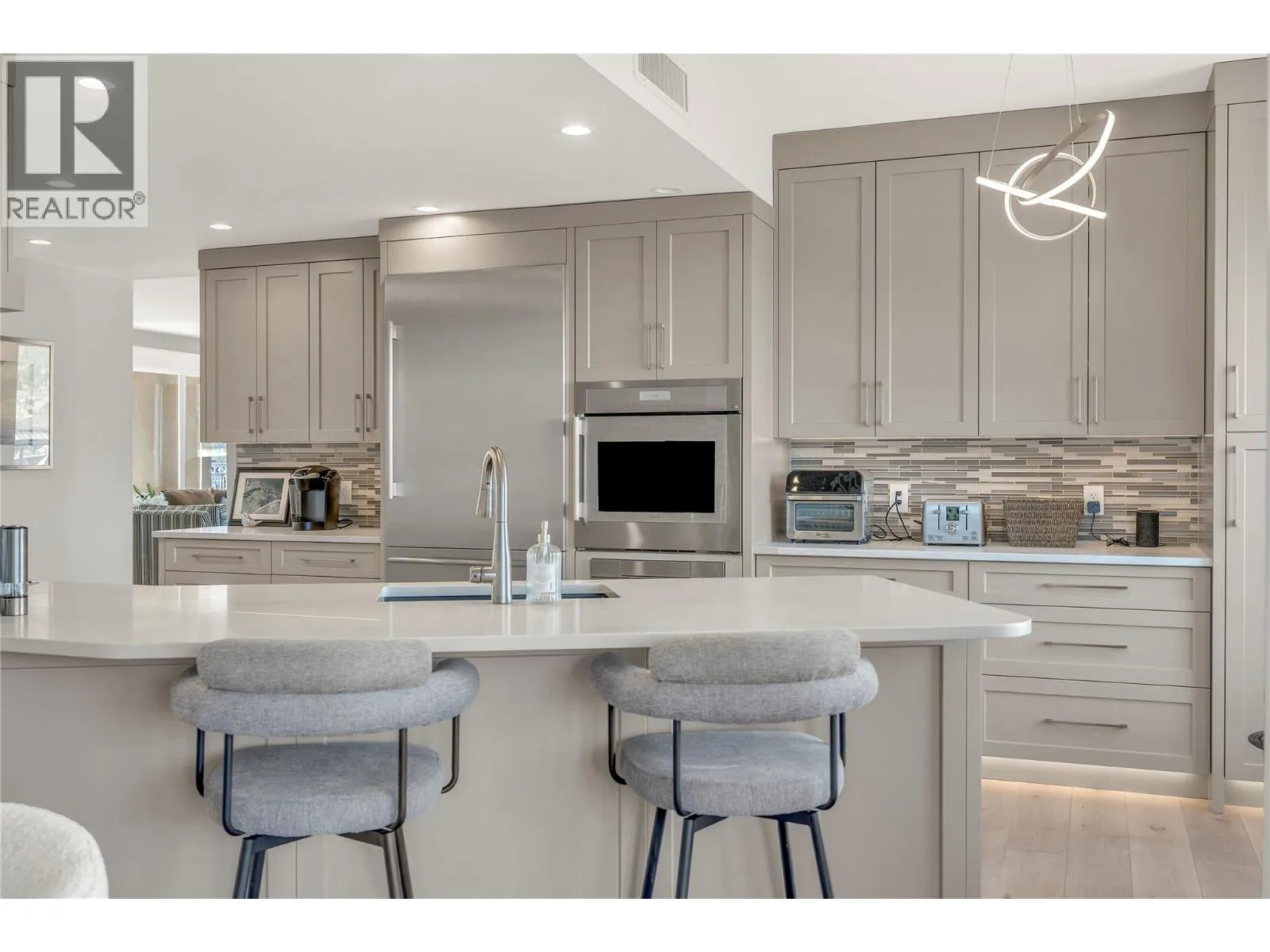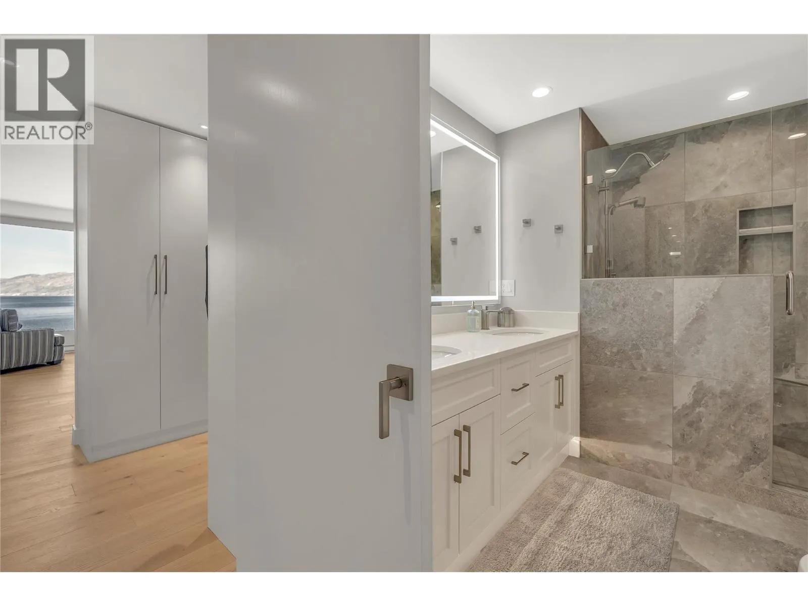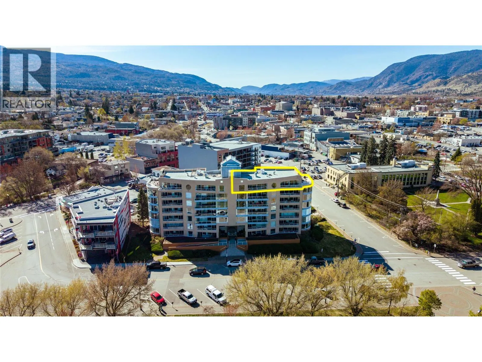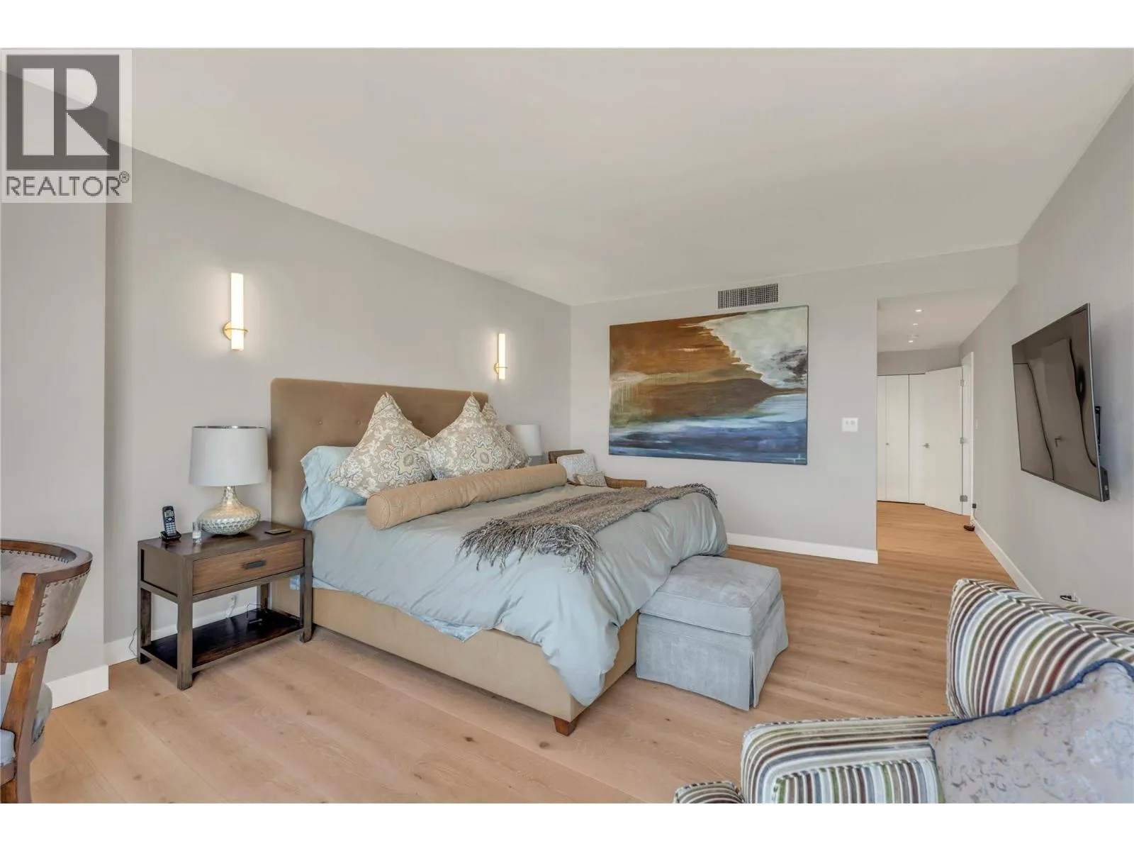 Perfectly positioned in one of Pentictonâs most sought after addresses, this gorgeous penthouse at 86 Lakeshore Drive delivers a truly rare offering, unobstructed, panoramic views spanning Okanagan Lake, the City of Penticton, and the surrounding mountains from every window. With over 1,200 sq.ft. of wraparound deck, this is a front row seat to the Okanagan lifestyle. Beautifully updated throughout, this home showcases a stunning custom kitchen with quartz countertops, premium stainless appliances, and seamless flow to a sunlit nook with direct access to the lakeview deck. New flooring carries throughout into an expansive living space anchored by a gas fireplace, bar with wine and beverage fridges, and walls of glass framing breathtaking views in every direction. The layout is both functional and refined, offering a den/office, sunroom, an impressive primary retreat with walk-in closet, full ensuite, and direct deck access, plus a spacious second bedroom with its own ensuite and equally stunning views. Set directly across from the beach, park, and Okanagan lake, this exclusive 55+ residence includes two secure underground parking stalls and storage. This is more than a home, itâs penthouse living at its finest. (id:27476)