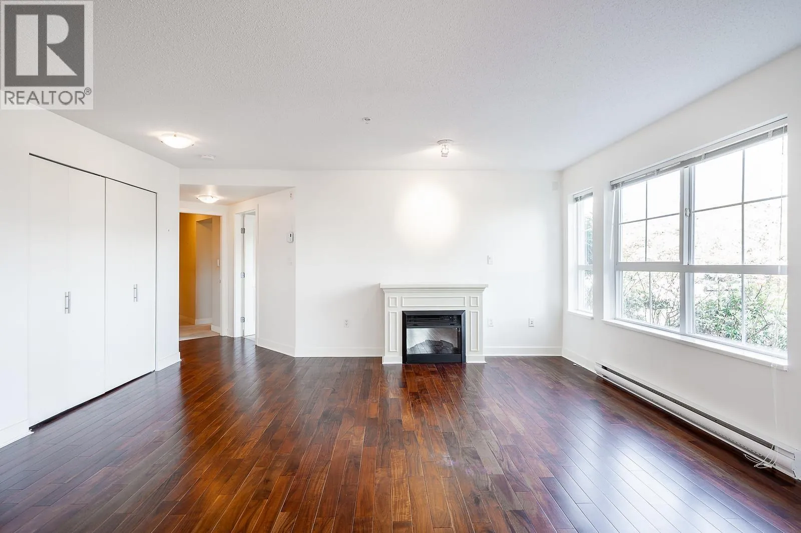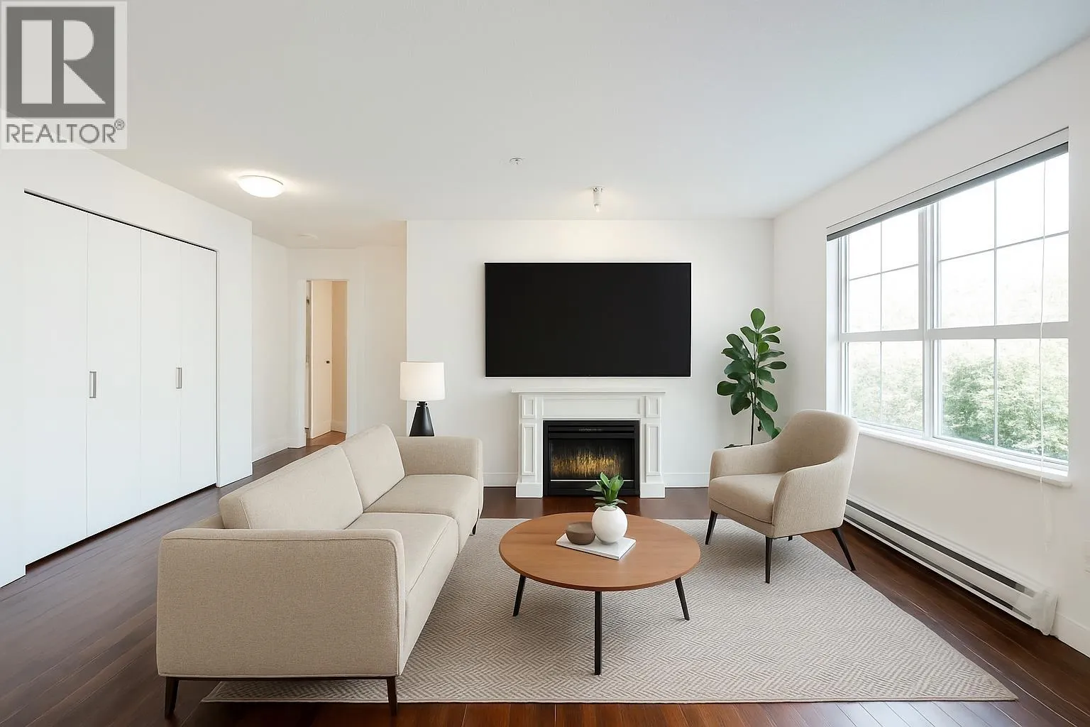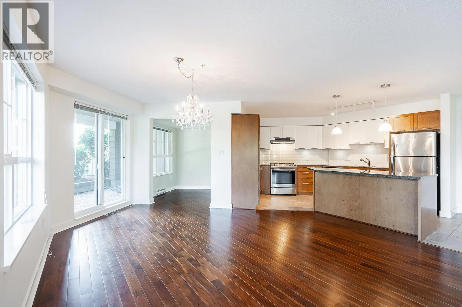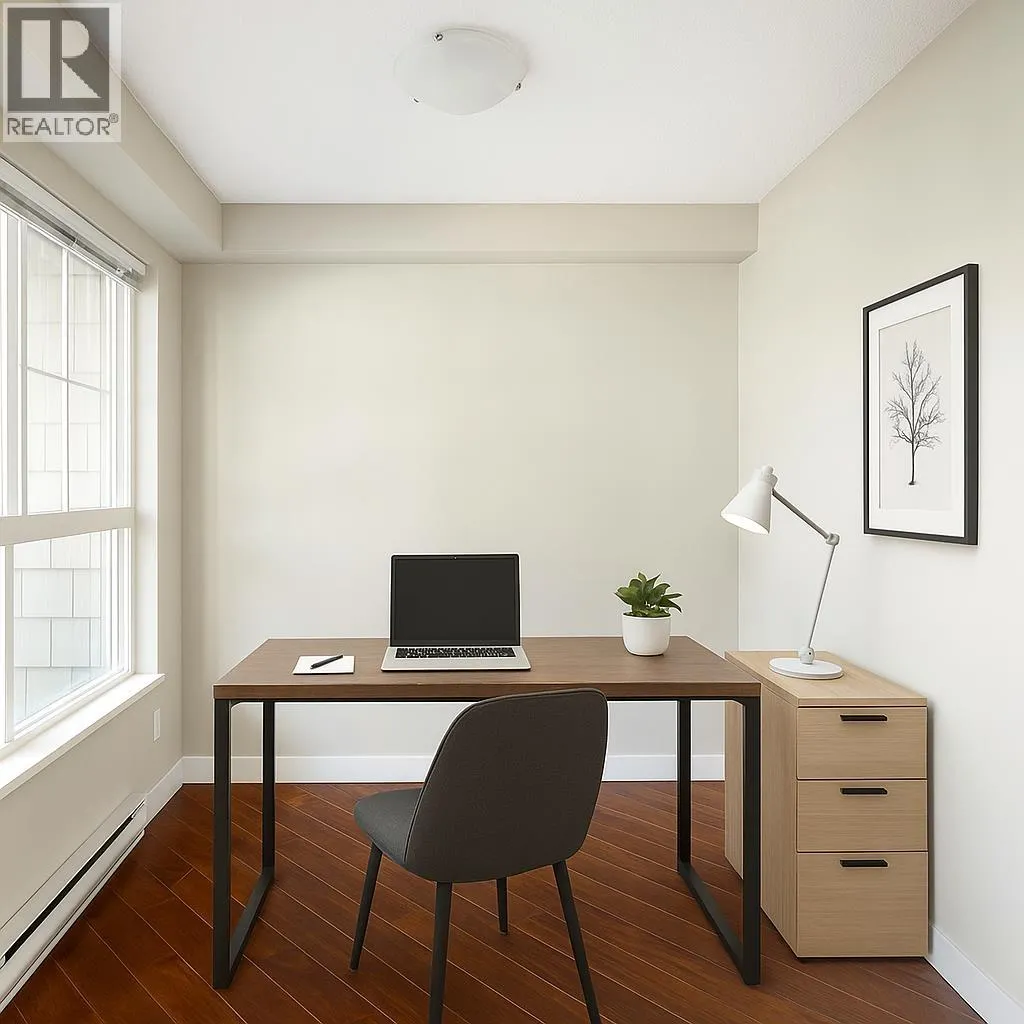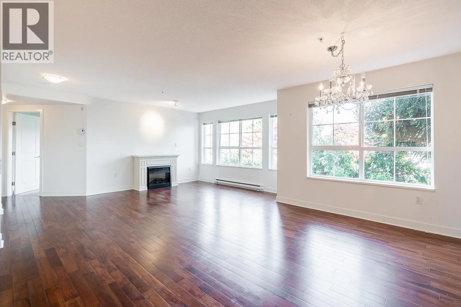 Welcome to this huge 1,344 square ft ground-floor corner unit featuring 2 bedrooms, a versatile den, 2 full bathrooms, and a large patio. Enjoy engineered hardwood flooring throughout the bright and open living and dining areas. The kitchen comes equipped with updated appliances, including a 2-year-old stove/oven, a 1.5-year-old washer and dryer, and a recently upgraded fridge-making this home truly move-in ready. Large windows fill the space with natural light and offer stunning views of surrounding mountains and lush greenery, creating a relaxing, resort-like vibe. Residents enjoy access to fantastic amenities, including a clubhouse, gym, and sauna. OPEN HOUSE SATURDAY NOVEMBER 15th 1-4pm. Bonus: Comes with 2 parking stalls and 1 storage locker. *Some photos are virtually staged. (id:27476)