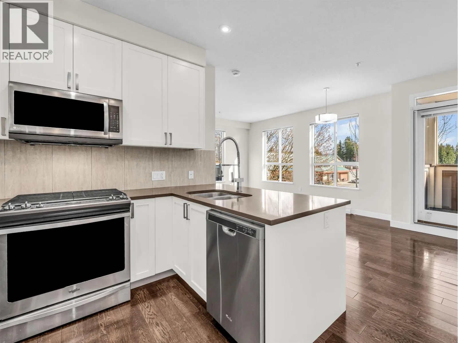 CORNER 2 bed / 2 bath home with TWO balconies and quick access to West Coast Express for an easy commute to downtown Vancouver! This bright and freshly painted 810 square ft home features oversized windows that fill the space with natural light and a functional layout with excellent bedroom separation. The gourmet kitchen offers quartz countertops, gas stove and stainless steel appliances. Enjoy two private outdoor spaces, including a massive 340 square ft patio with gas BBQ hookup and beautiful city and mountain views. Includes 2 underground tandem parking stalls and a storage locker. Steps to groceries, shops, parks, transit plus you are north of the rail tracks. Some photos are virtually staged. (id:27476)