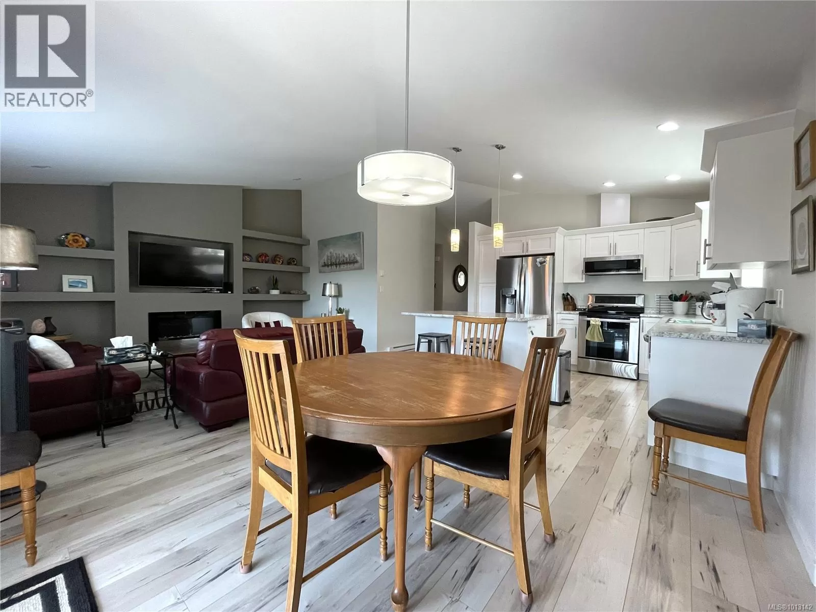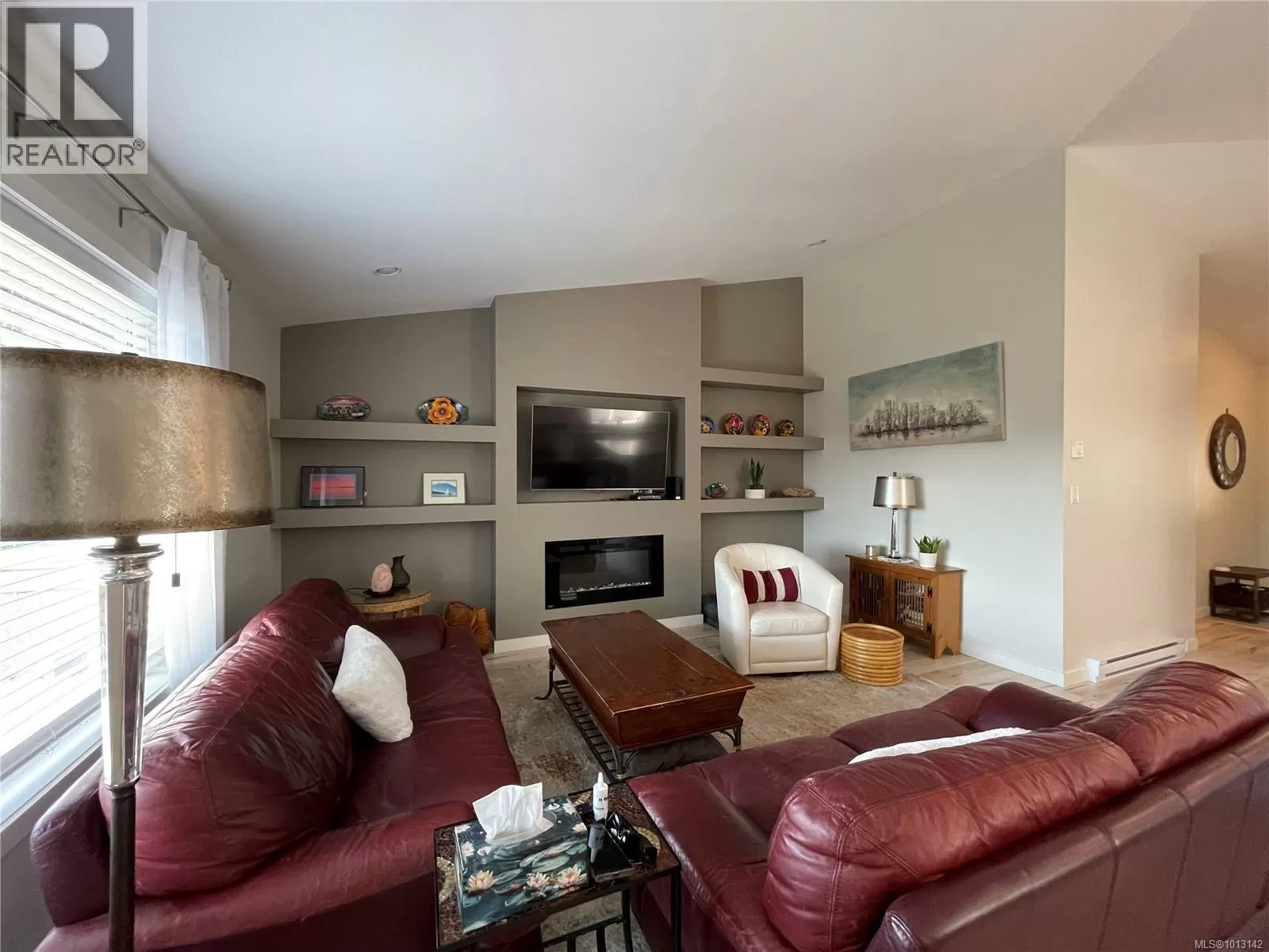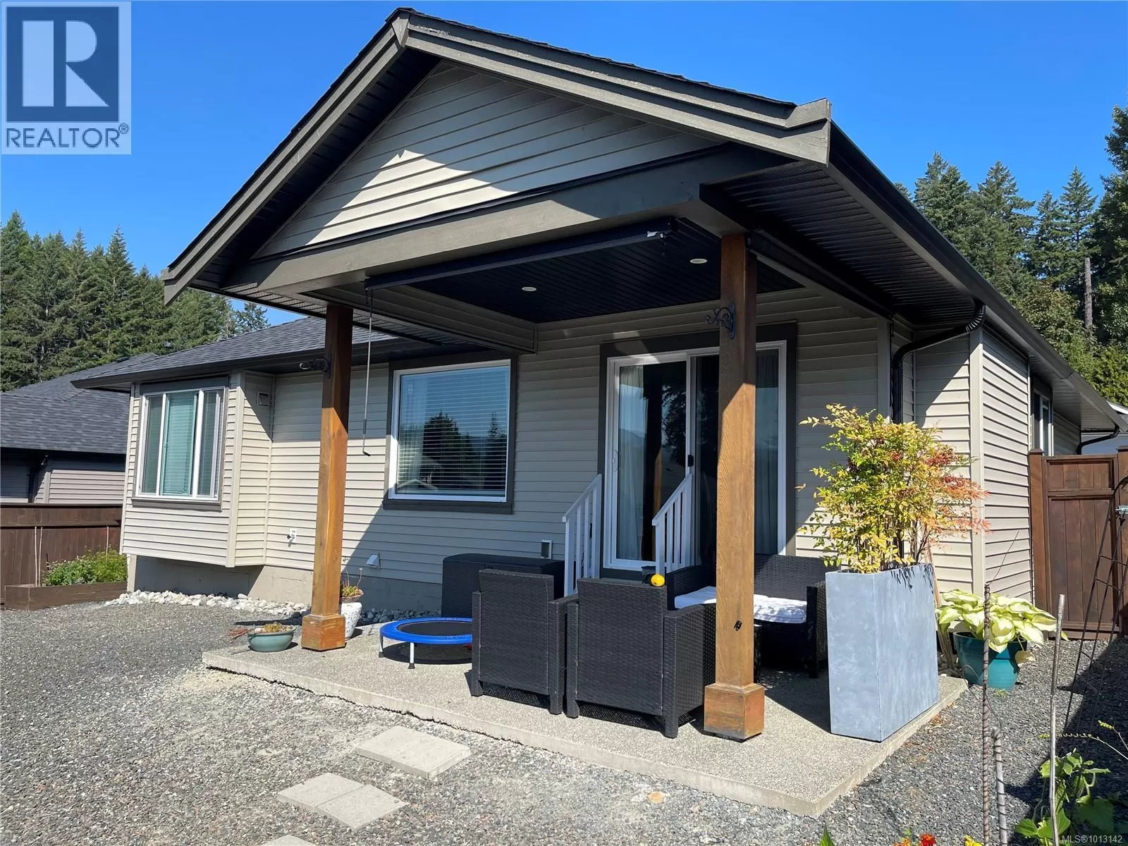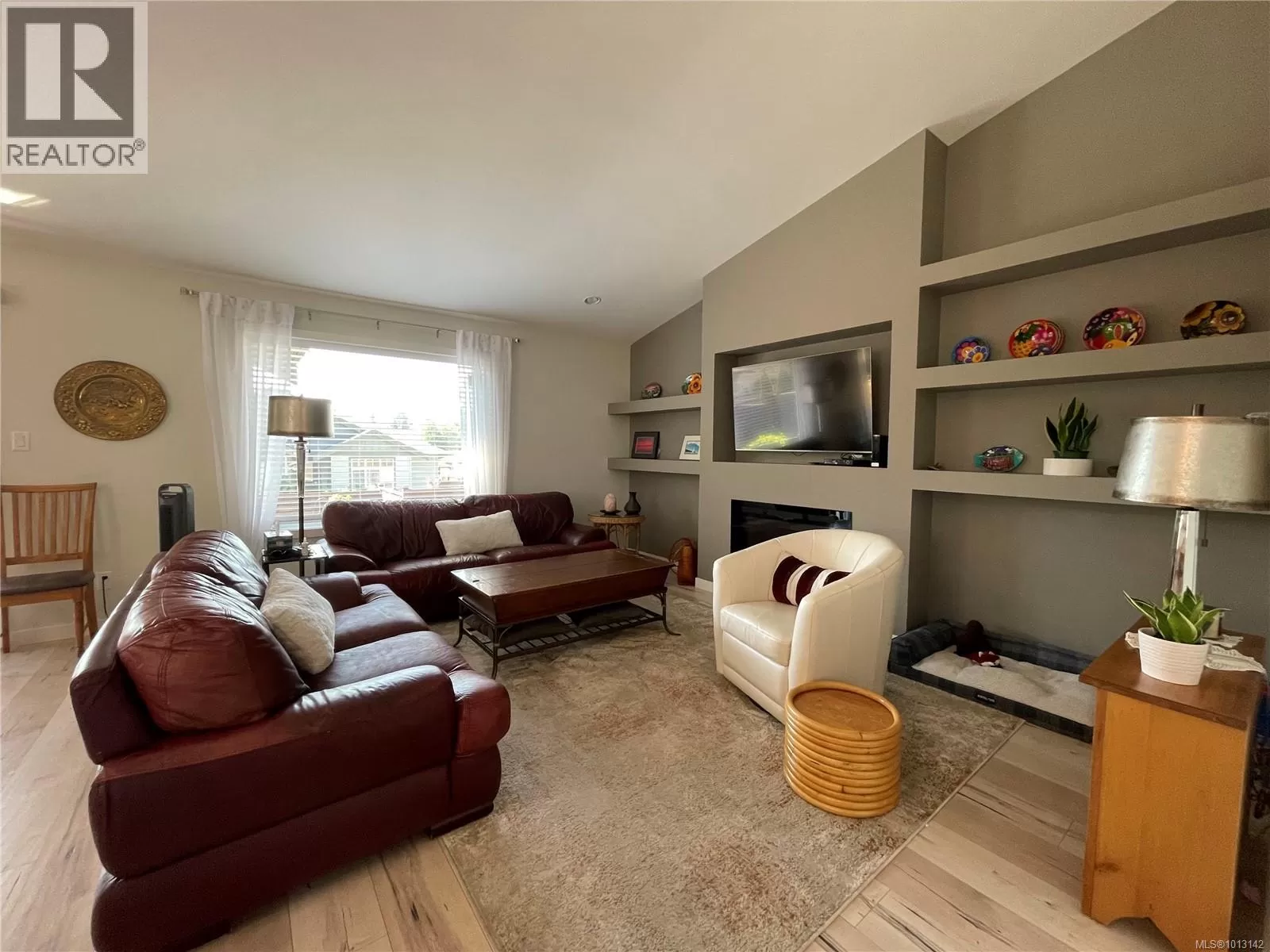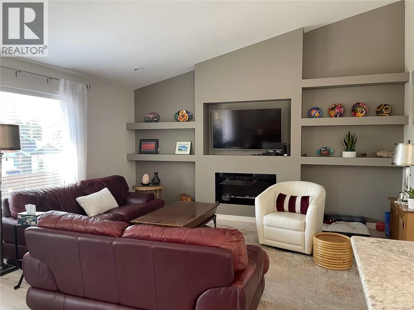 Welcome to this immaculate 3-bedroom, 2-bathroom rancher nestled in quiet, well-maintained Tomswood subdivision. The open-concept layout features a bright and airy living room with vaulted ceilings, an abundance of natural light, a cozy electric fireplace, and custom built-in shelvingâcreating a warm and inviting atmosphere. The spacious kitchen offers a central island and flows seamlessly into the dining area, which includes a recessed nook perfect for a hutch or sideboard, along with direct access to a covered patio for year-round outdoor enjoyment. The primary bedroom includes a private 3-piece ensuite, while the additional bedrooms share a full 4-piece main bathroom. Outside, the fenced yard features low-maintenance landscaping, ideal for easy living and entertaining friends and family. Tucked behind Tsuma-as Elementary and a short walk to Kitsuksis Walkway, this lovely home is waiting for you. All measurements approximate; verify if important. (id:27476)