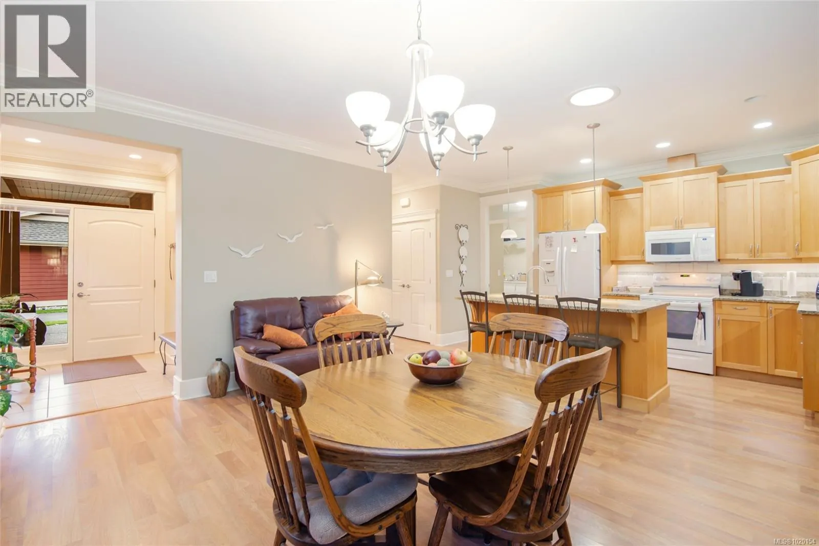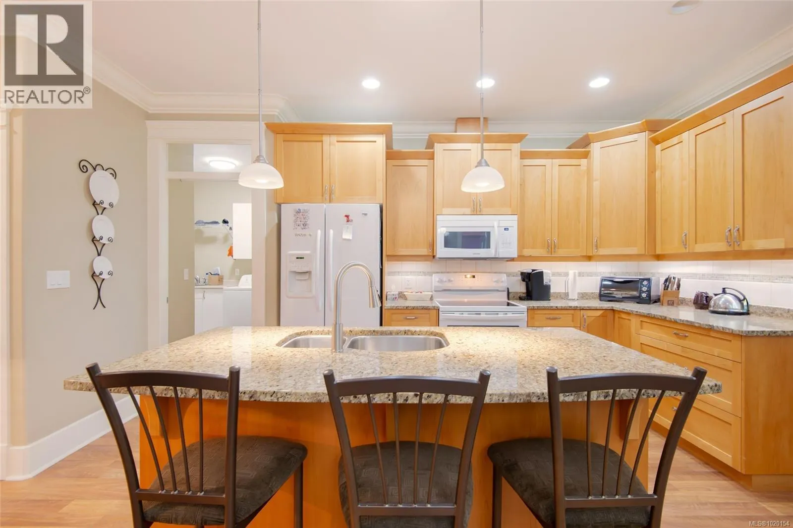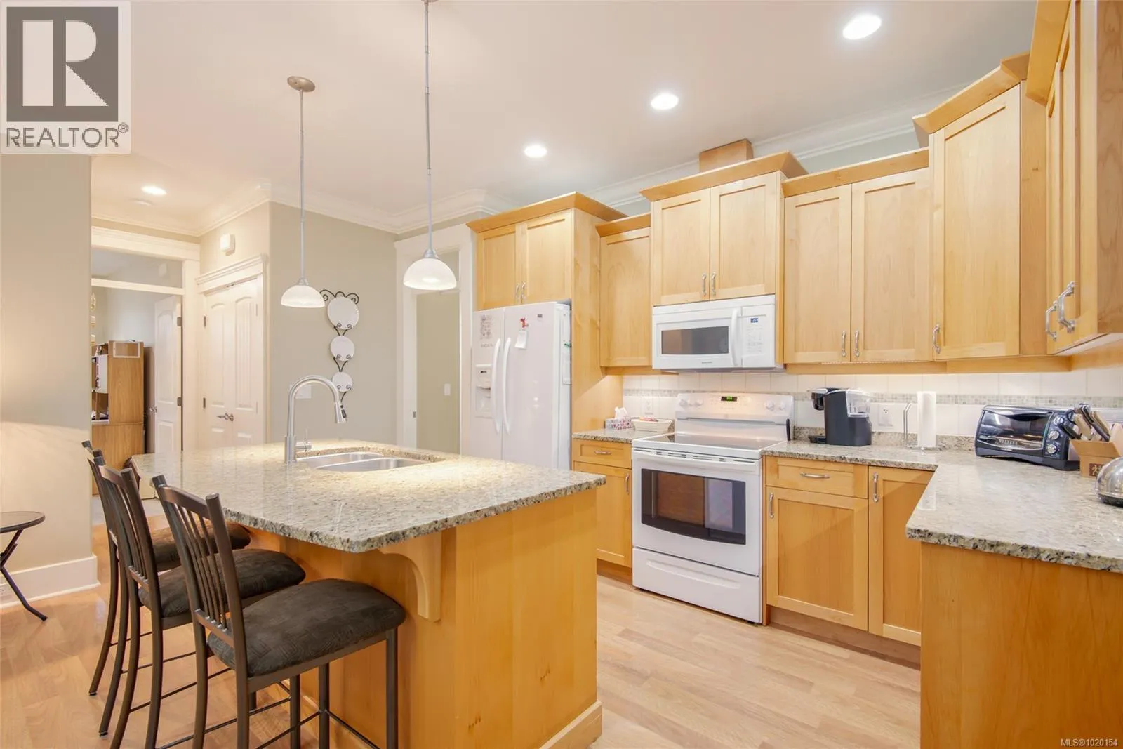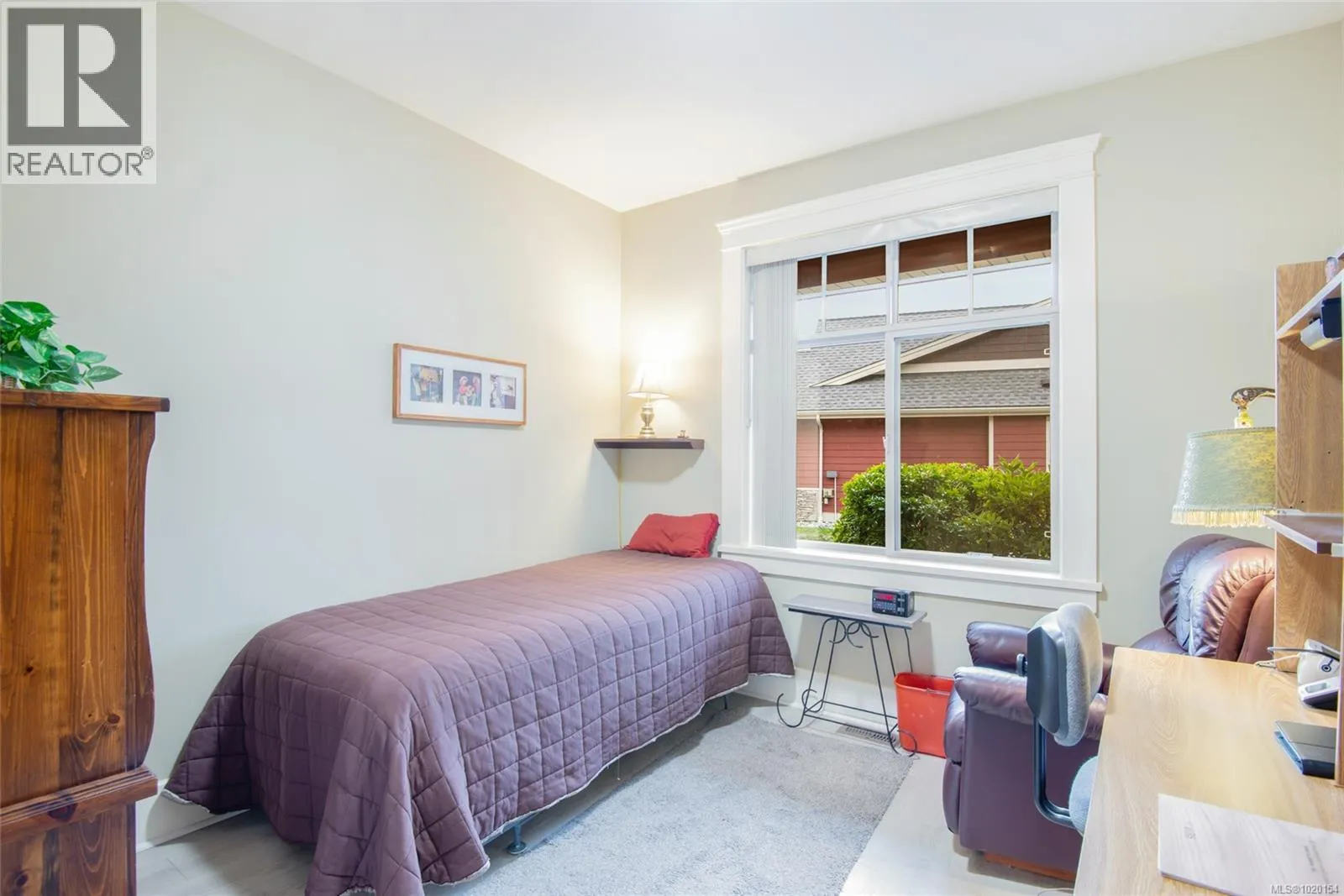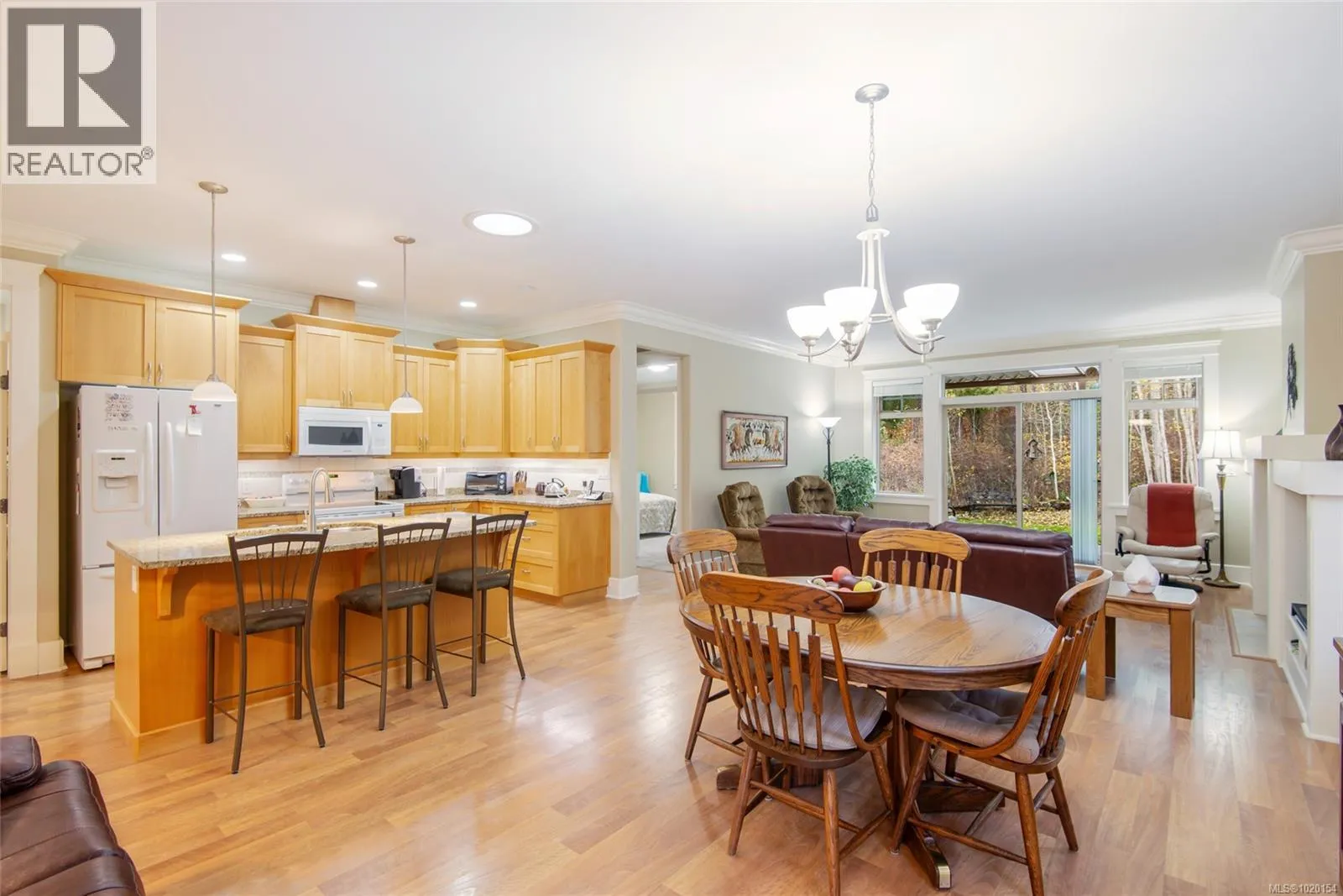 Tucked into a quiet cul-de-sac in College View Estates, this patio home offers calm, connection, and convenience in equal measure. Itâs the kind of place where neighbours wave hello and nature feels like part of the backyard - yet you're only minutes from the cityâs best amenities. Step inside and youâll feel it right away: the airy ease of 9-foot ceilings, and an open-concept layout that invites both relaxation and easy hosting. Expansive windows frame a forested backdrop, offering a daily view of birds and wildlife. Crown moulding and a natural gas fireplace add a touch of refinement, while the kitchen shines with custom shaker-style cabinets, granite countertops, and a generous island thatâs made for morning coffee or evening conversation. The main level is thoughtfully designed - the primary suite includes a walk-through closet and a 4-piece ensuite. A second bedroom and 3-piece bath offer space for guests or a home office. Thereâs also a full laundry room and a flexible dining area that feels ready for everything from quick bites to full dinner parties. Step outside to a covered patio and a tree-lined backyard - peaceful, private, and low-maintenance. The attached garage features a new automatic opener, and the home includes practical updates like a newer roof (2024), and a new hot water tank. This well-cared-for home is part of a friendly, well-maintained complex close to North Island College, Echo Pool, the MultiPlex, Bob Dailey Stadium, schools, shops, restaurants, and walking trails. Itâs been a place of comfort and connection - and now, itâs ready for whatâs next. Reach out to arrange a private viewing whenever youâre ready. (id:27476)