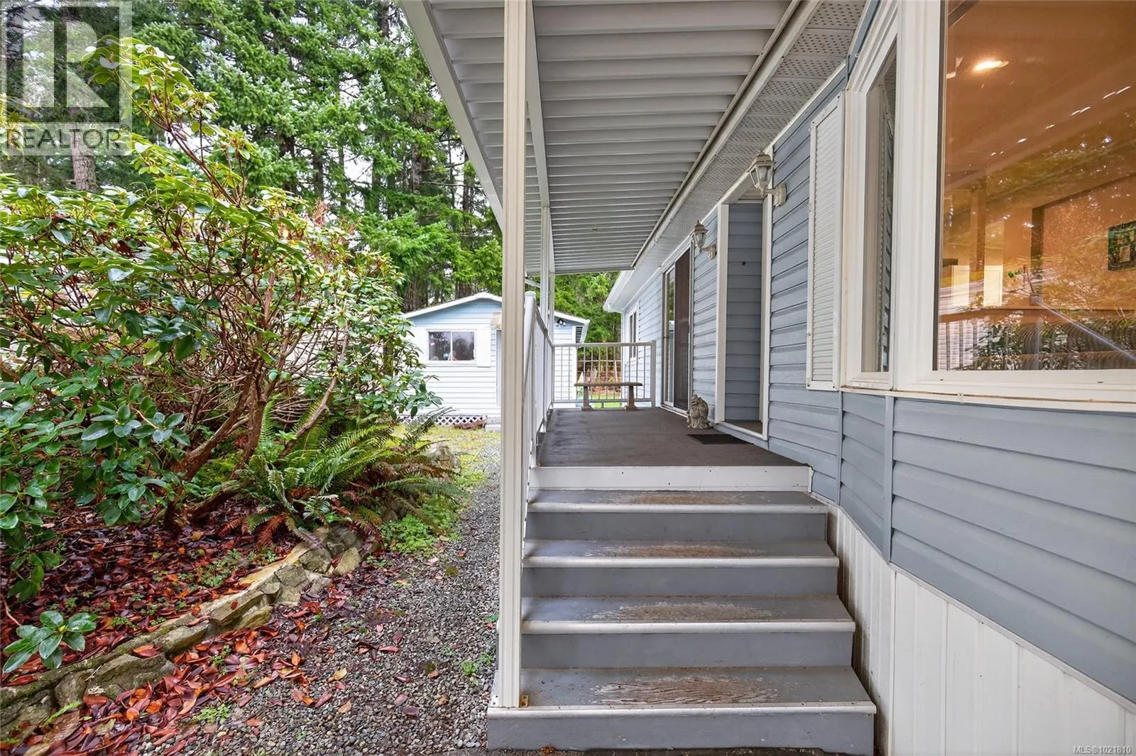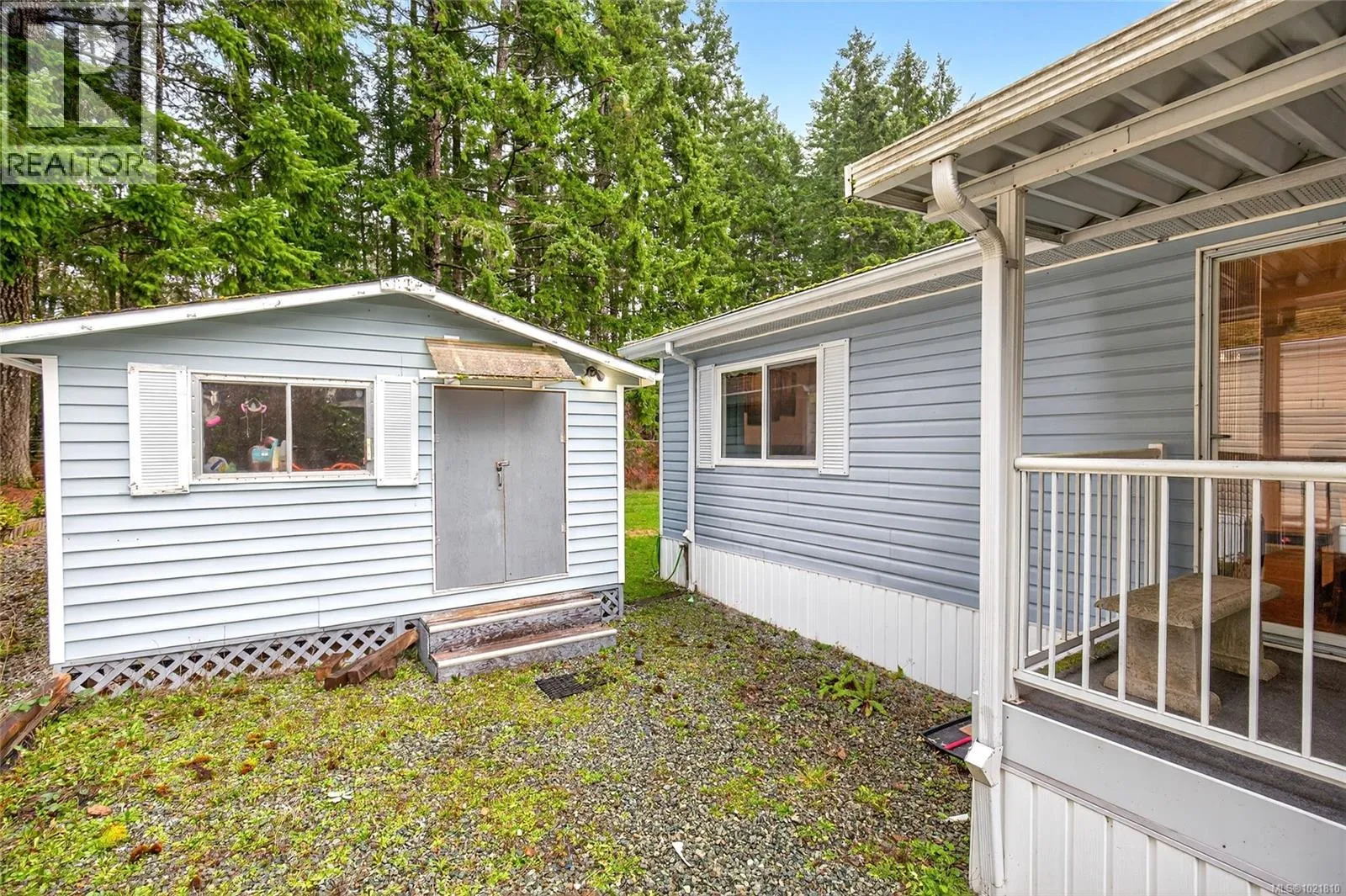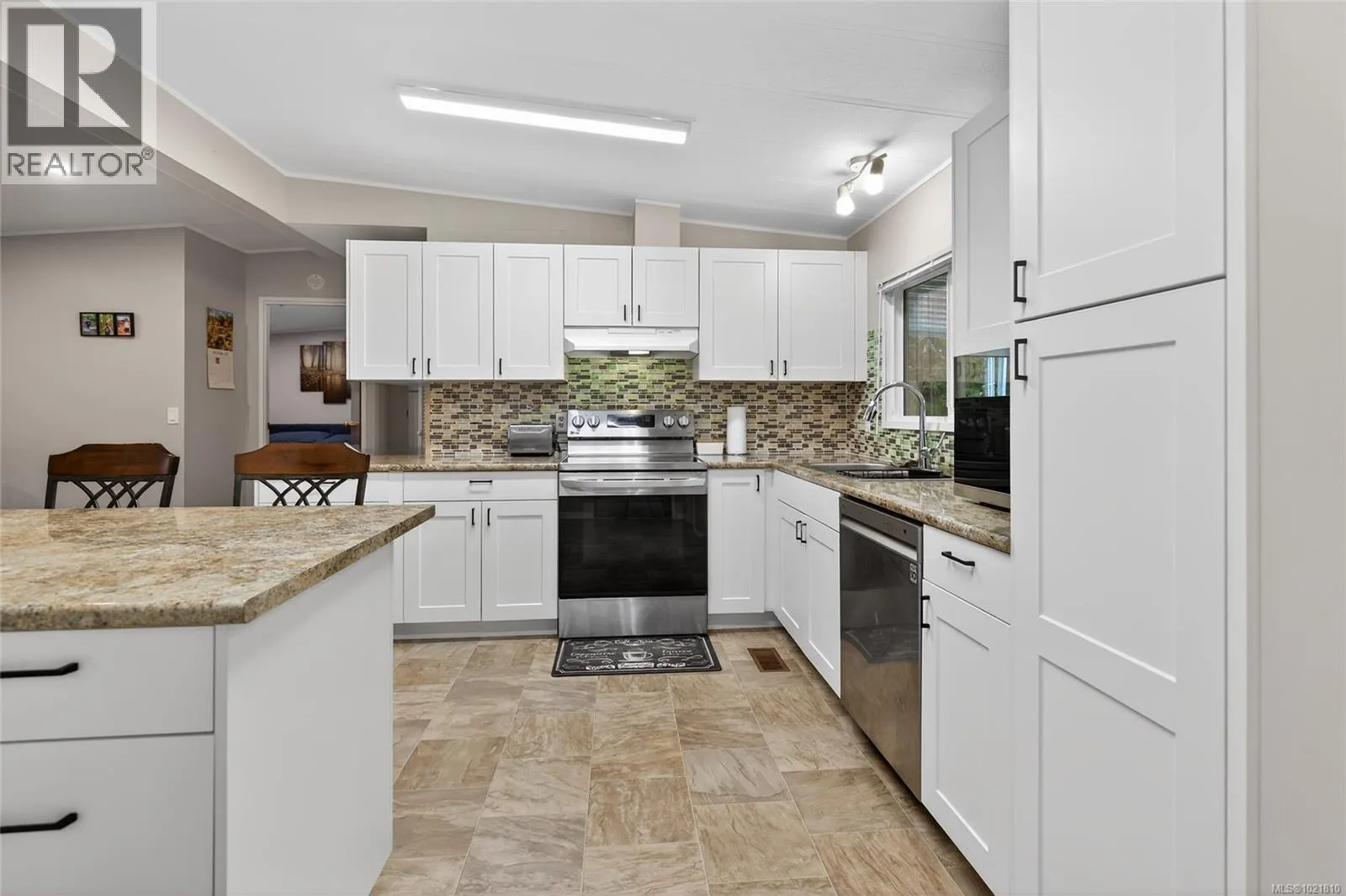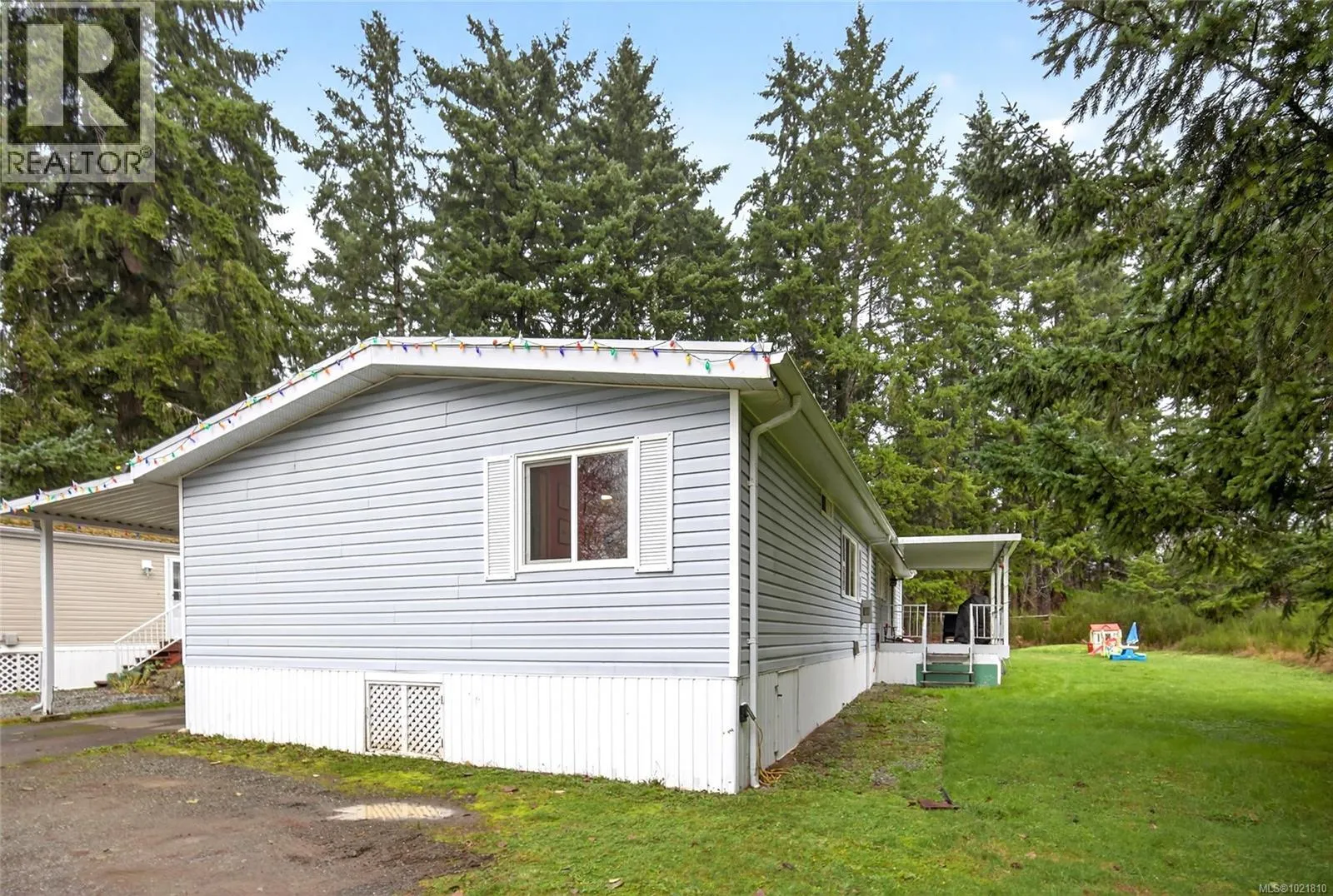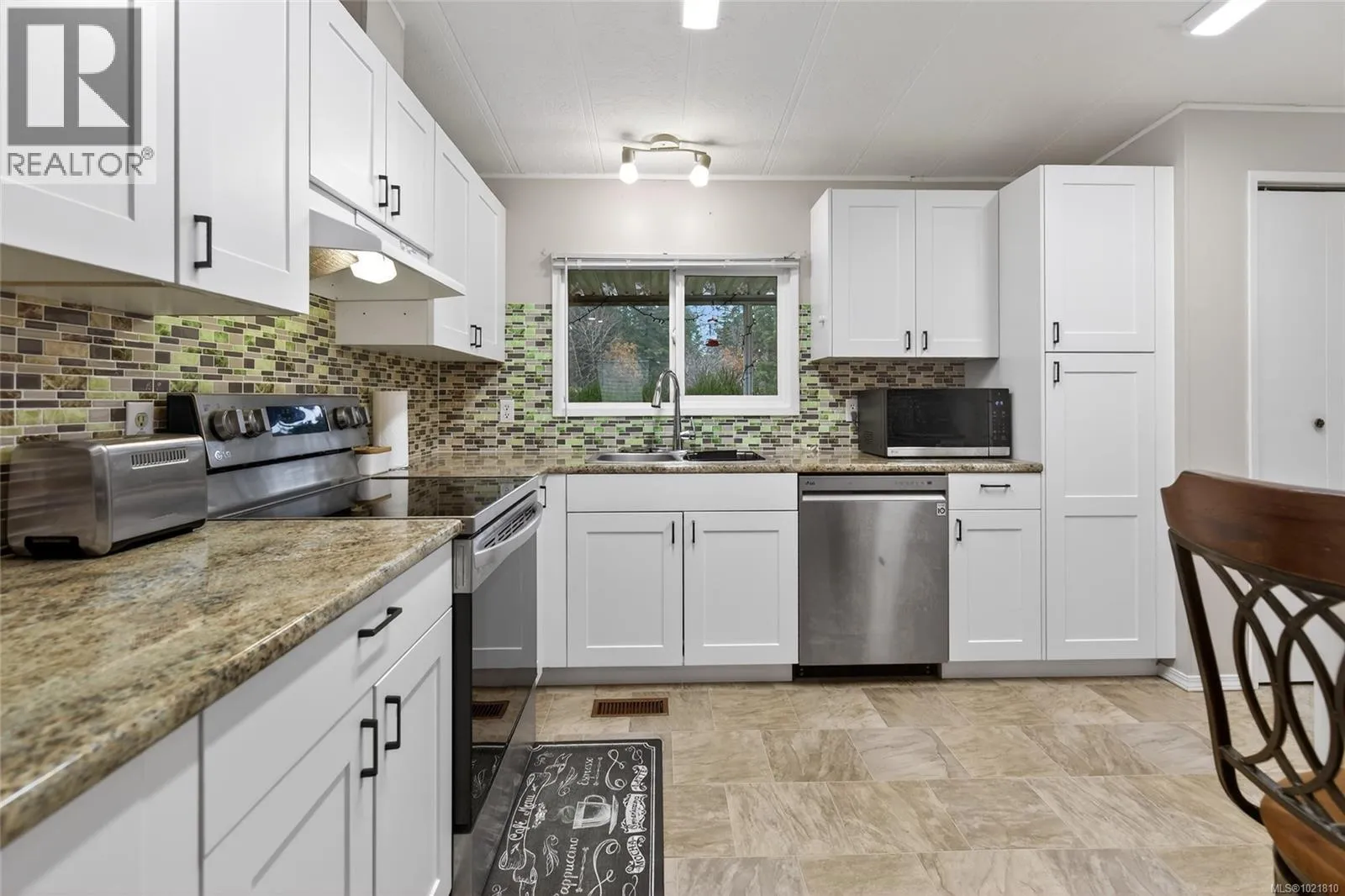 Great location! This double-wide manufactured home sits at the end of a quiet no-thru road in one of the Alberni Valleyâs most sought-after family friendly parks. Inside, the home offers a bright and inviting layout featuring a modern kitchen with a breakfast bar, a spacious living room with vaulted ceilings, a dedicated dining area with sliding glass doors to one of the two covered decks, a primary bedroom with a 5-piece ensuite, accompanied by two additional bedrooms, an updated modern bathroom, and a laundry room with access to the large covered back deck. A 14' x 18' detached workshop adds excellent space for projects, storage, or hobbies. Year-round comfort is provided by the updated heat pump(2024). This is a well-kept home in an excellent location, an opportunity you wonât want to miss. (id:27476)